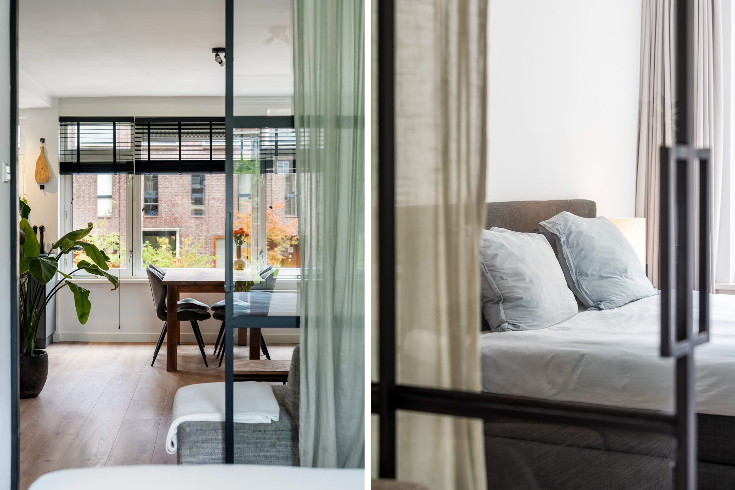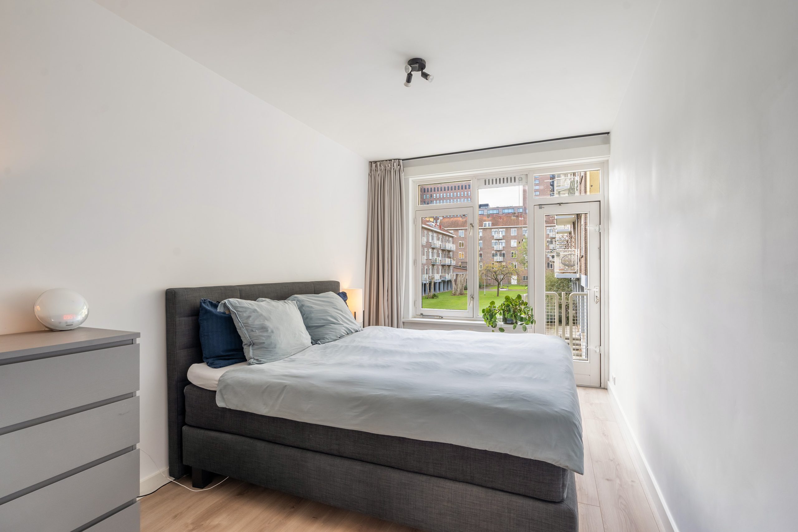 Via de stijlvolle glas-in-staaldeuren bereik je de eerste slaapkamer. Een rustige, prettige ruimte met directe toegang tot het balkon op het zuidwesten. Een fijne plek om even buiten te zitten met een kopje koffie of een goed glas wijn.