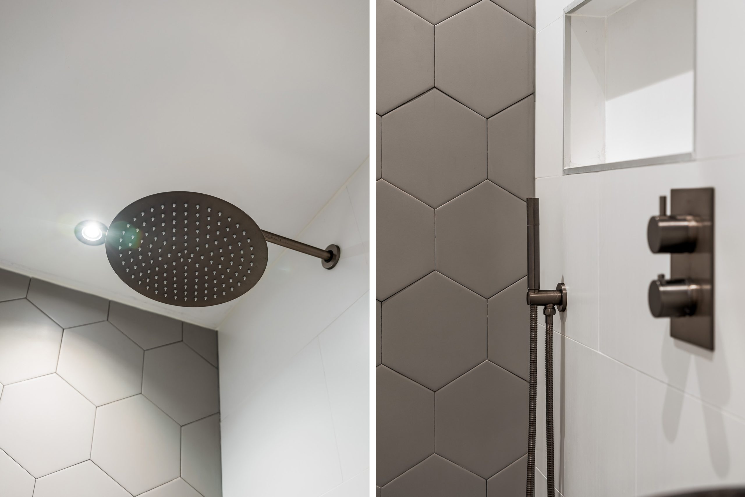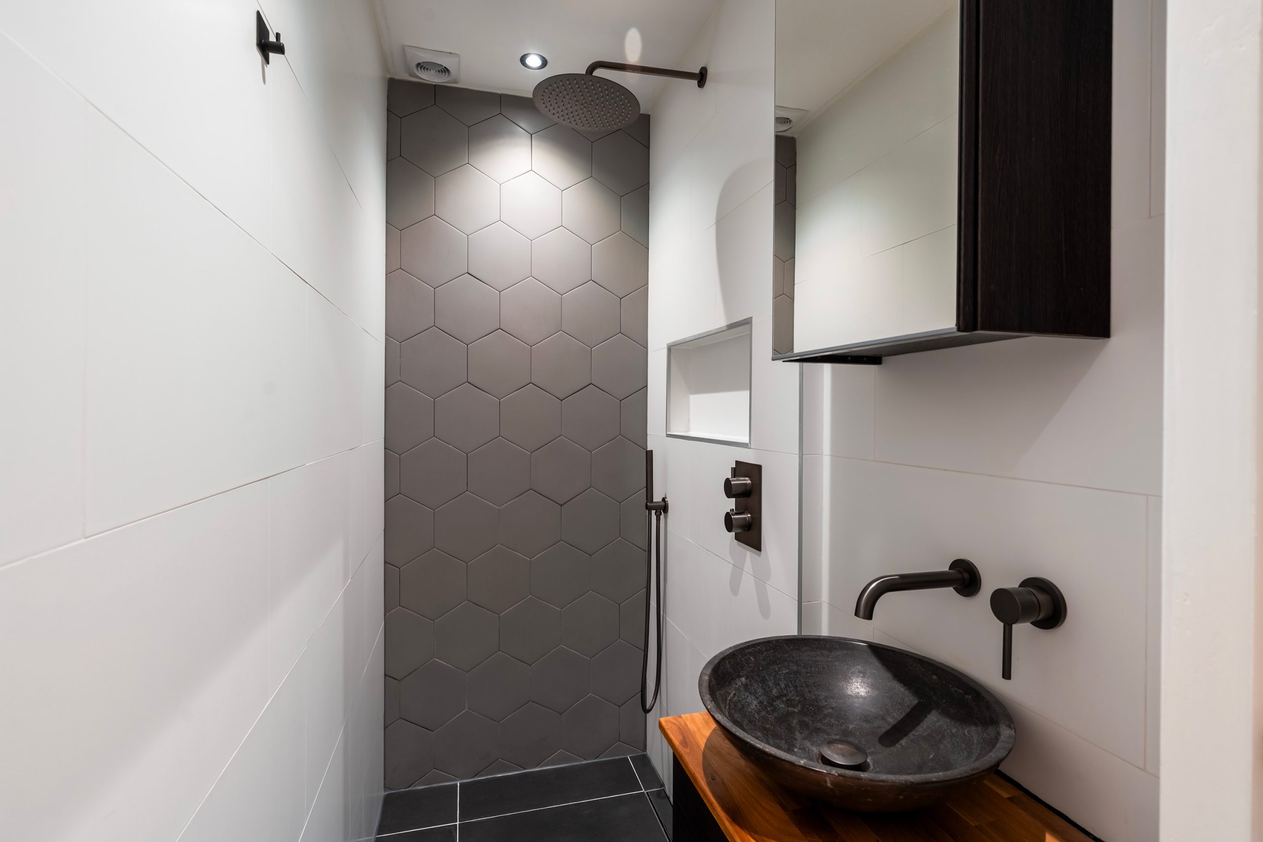 De badkamer is keurig en volledig betegeld, voorzien van een inloopdouche en een modern wastafelmeubel. Vanuit de hal zijn tevens het separate toilet en de bergruimte met wasmachineaansluiting bereikbaar. Alles is praktisch ingedeeld en netjes afgewerkt.