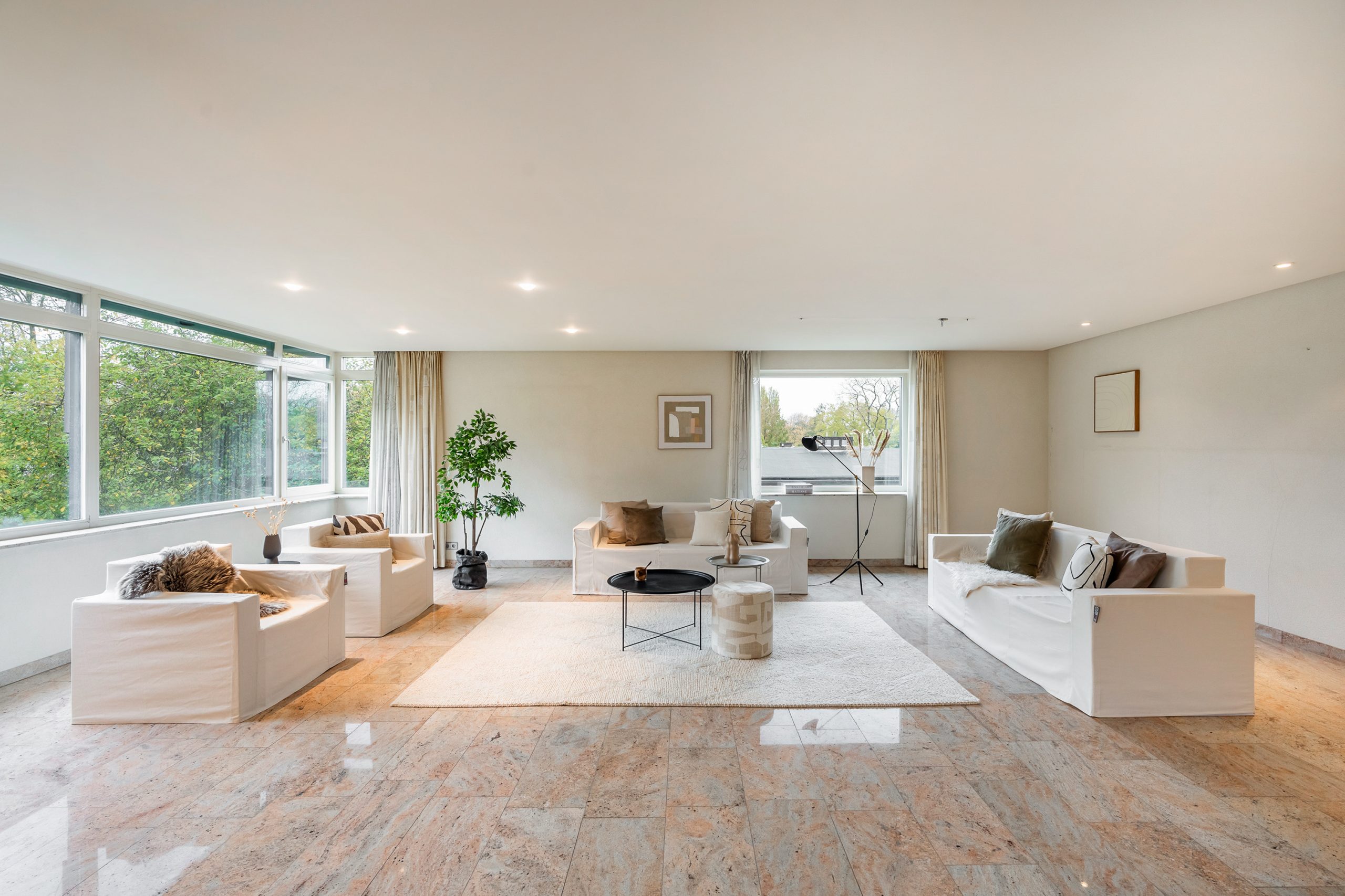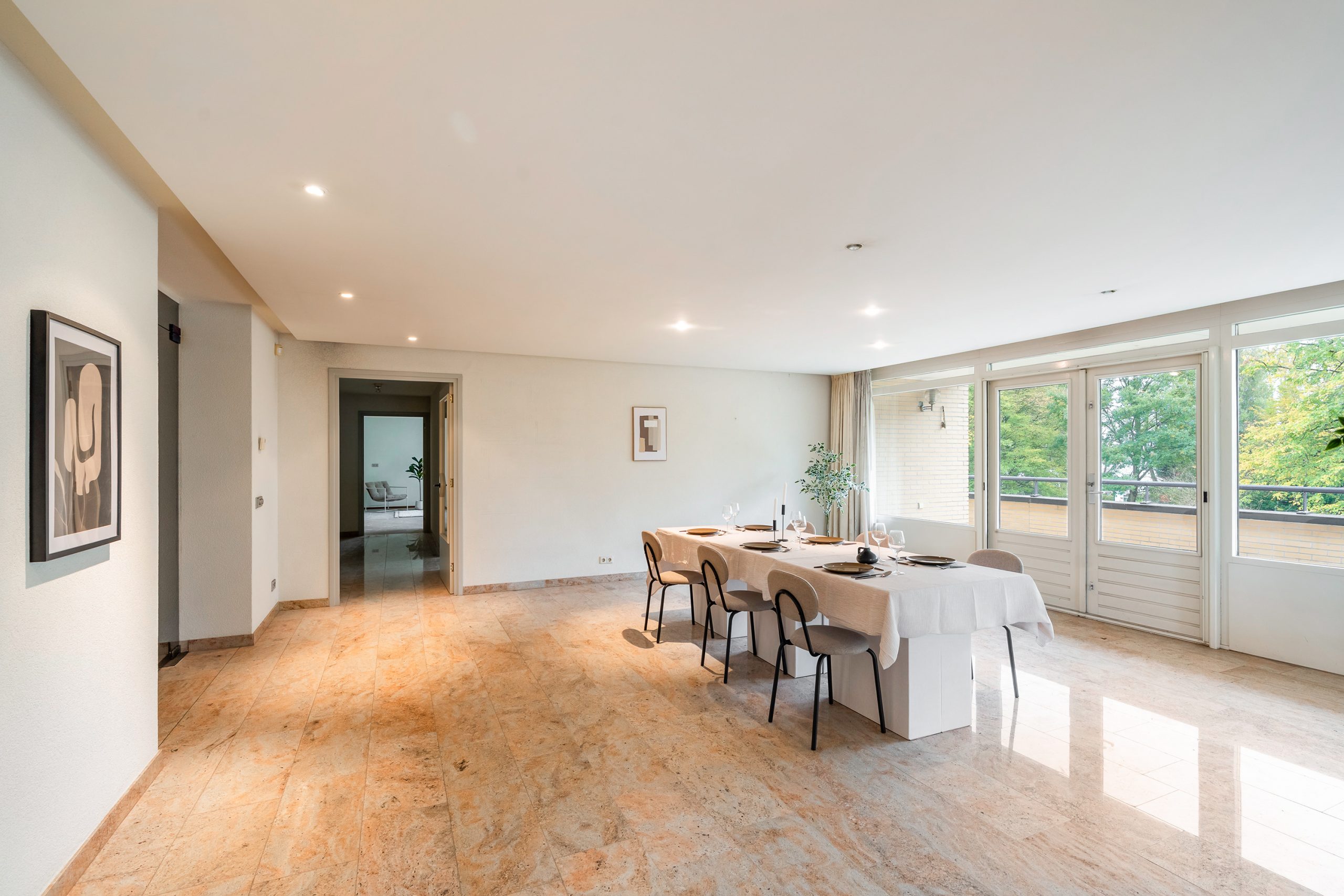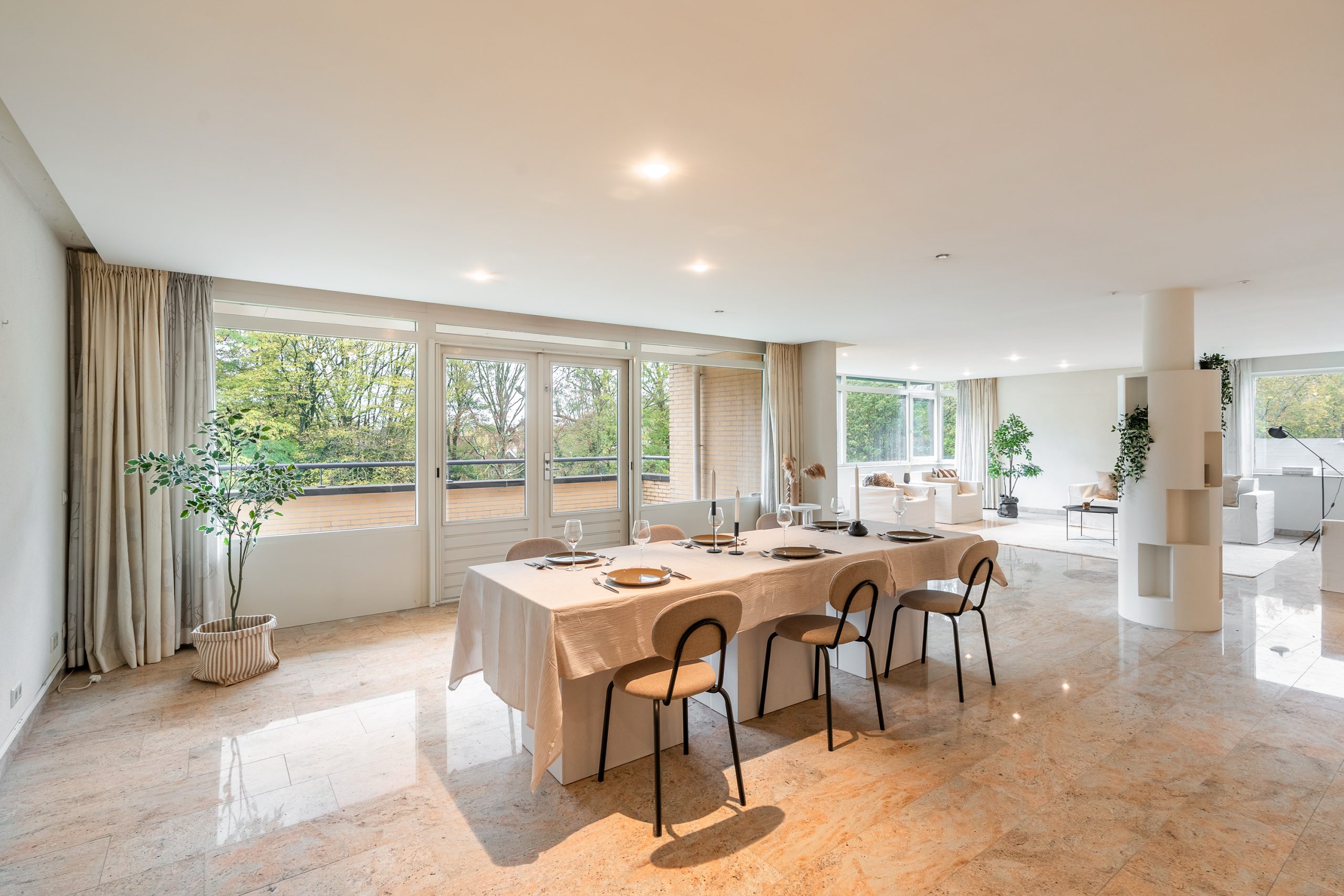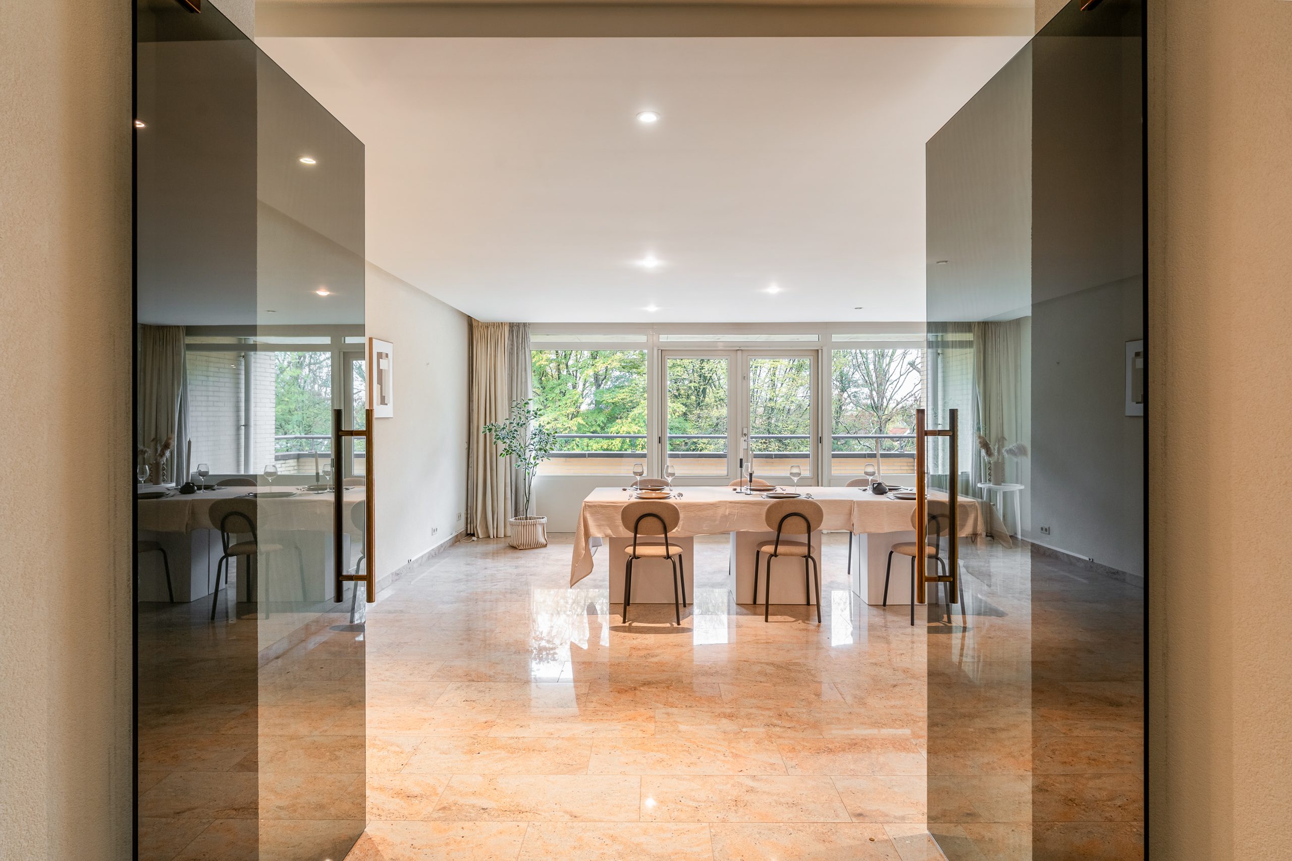De woonkamer is ronduit indrukwekkend: een zee van licht, dankzij de vele ramen rondom en de dubbele openslaande deuren naar het terras. De ruimte ademt rust en elegantie, met zicht op het groen van het plantsoen. De natuurlijke marmeren vloer en het royale formaat zorgen voor een luxe uitstraling, terwijl de indeling uitnodigt tot meerdere zithoeken of een lange eettafel waar u en uw gasten zich direct thuis voelen.