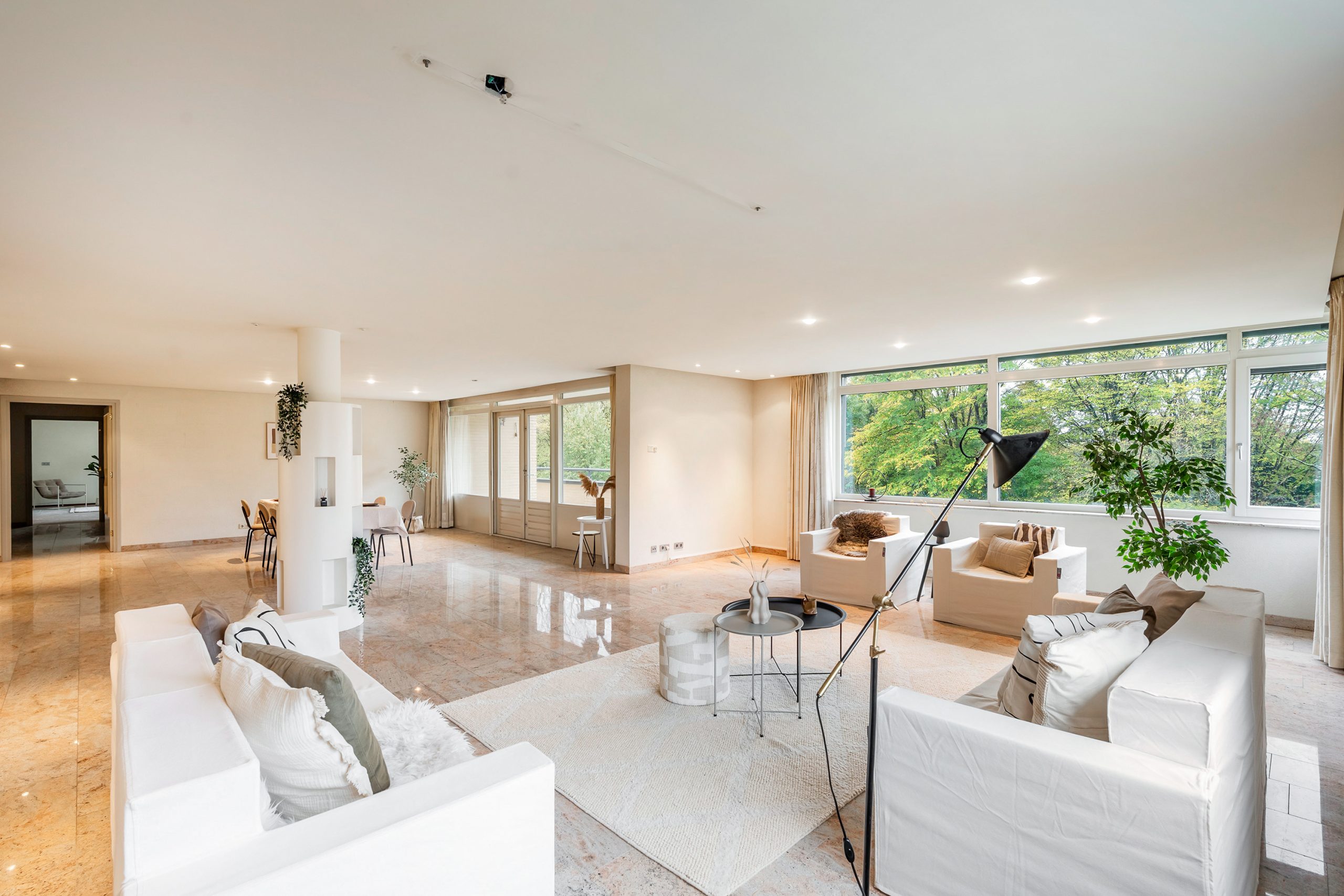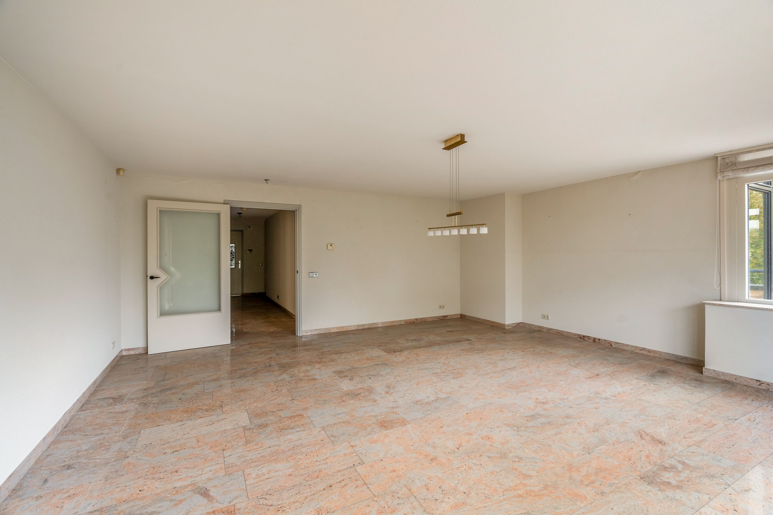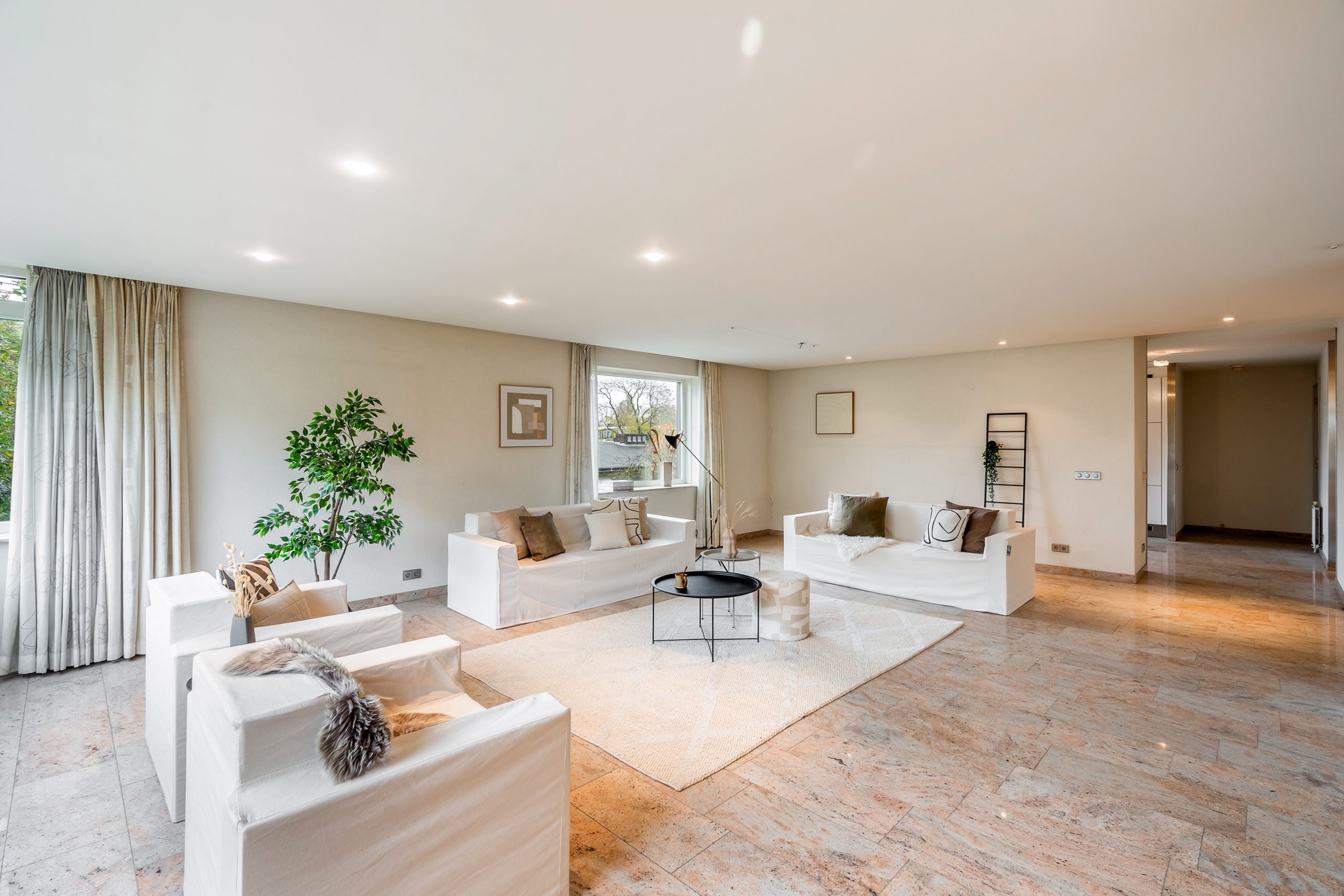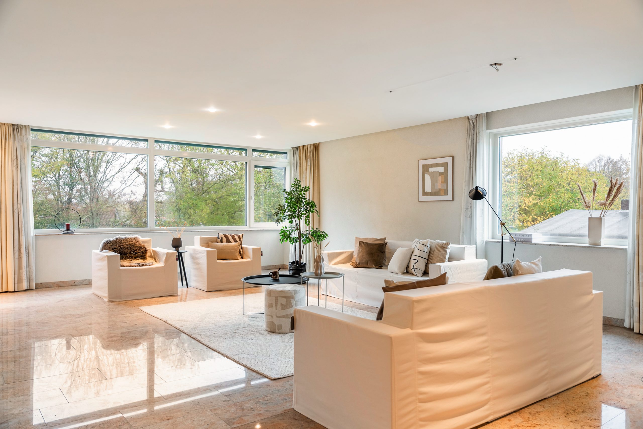 De woonkamer is ronduit indrukwekkend: een zee van licht, dankzij de vele ramen rondom en de dubbele openslaande deuren naar het terras. De ruimte ademt rust en elegantie, met zicht op het groen van het plantsoen. De natuurlijke marmeren vloer en het royale formaat zorgen voor een luxe uitstraling, terwijl de indeling uitnodigt tot meerdere zithoeken of een lange eettafel waar u en uw gasten zich direct thuis voelen.