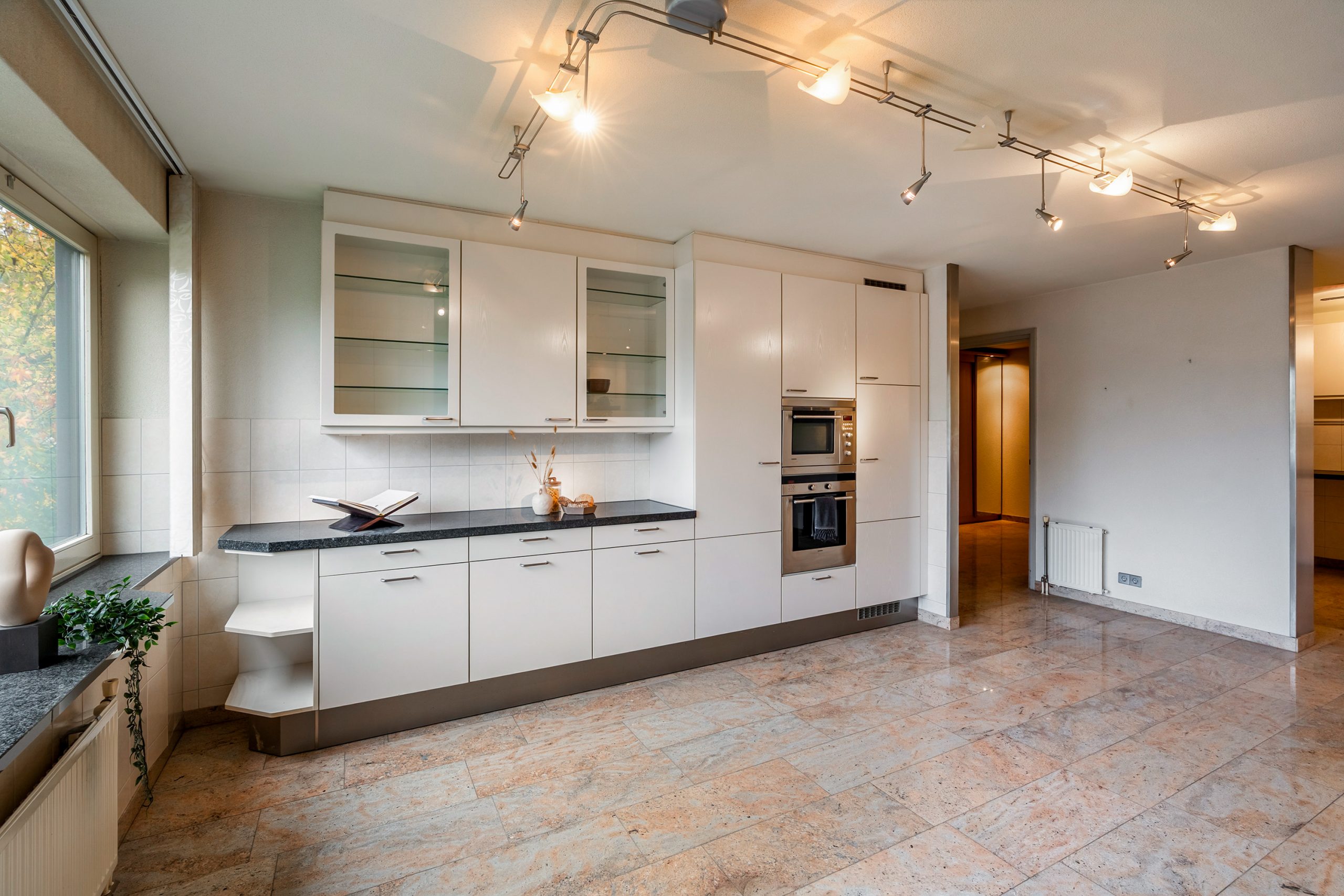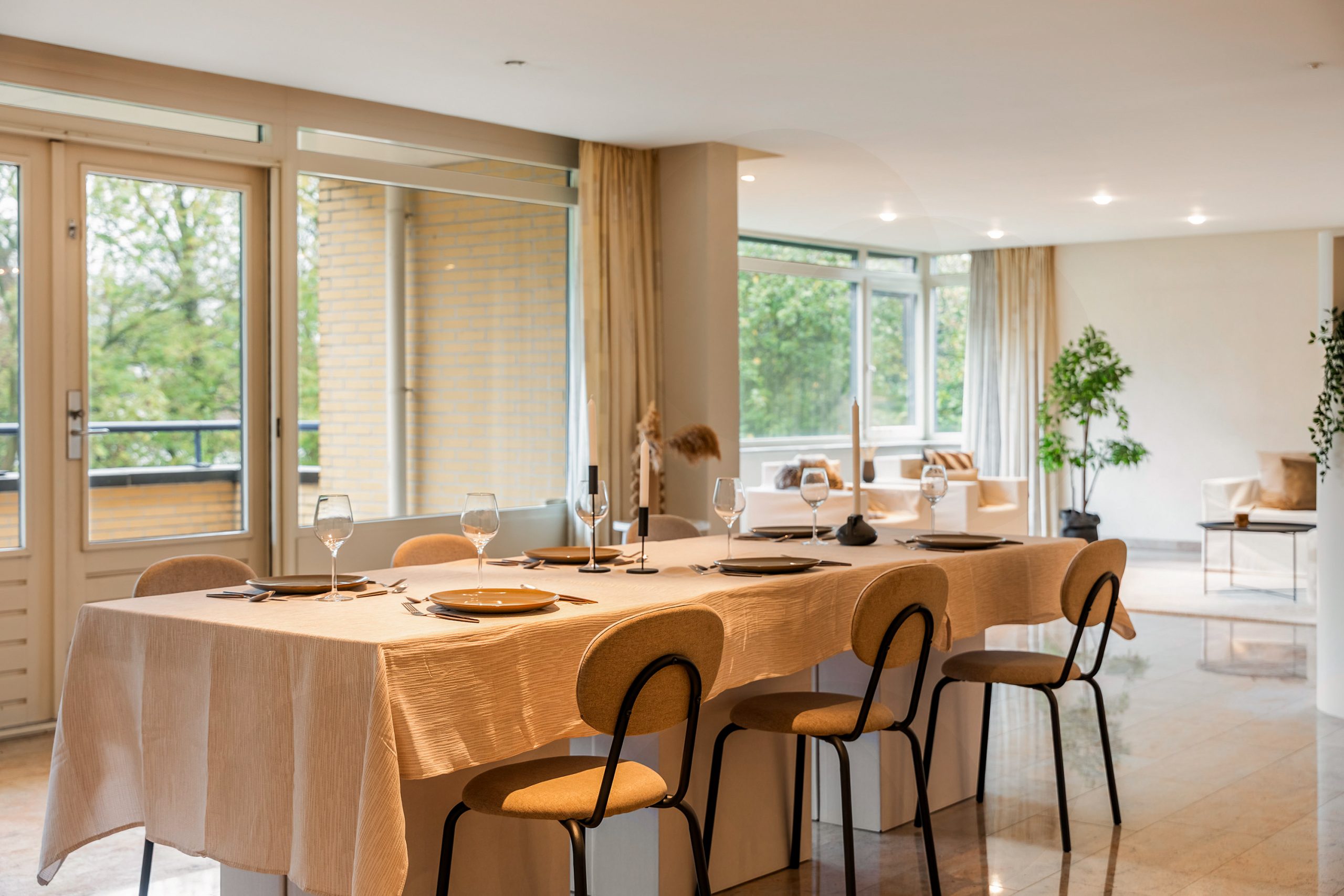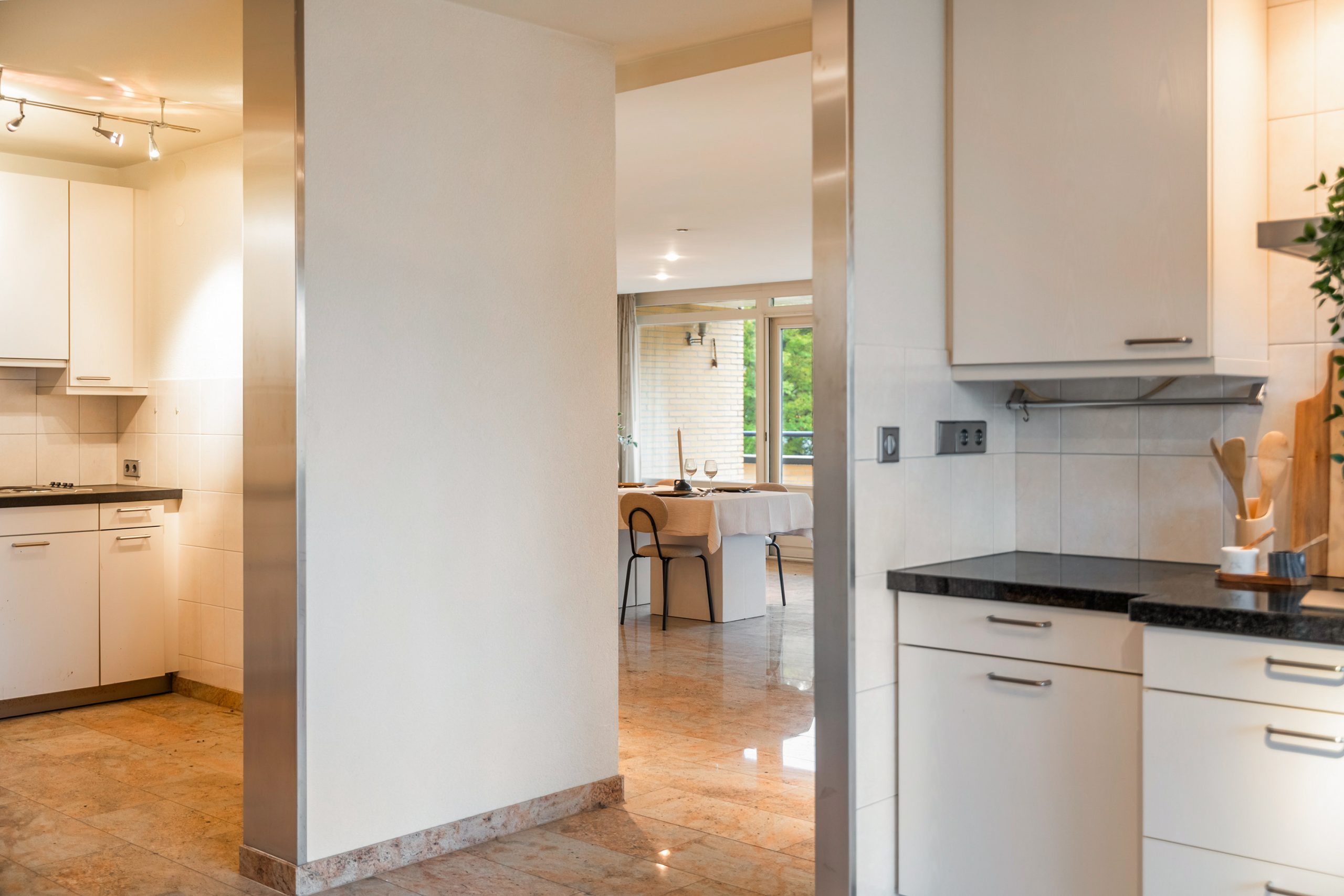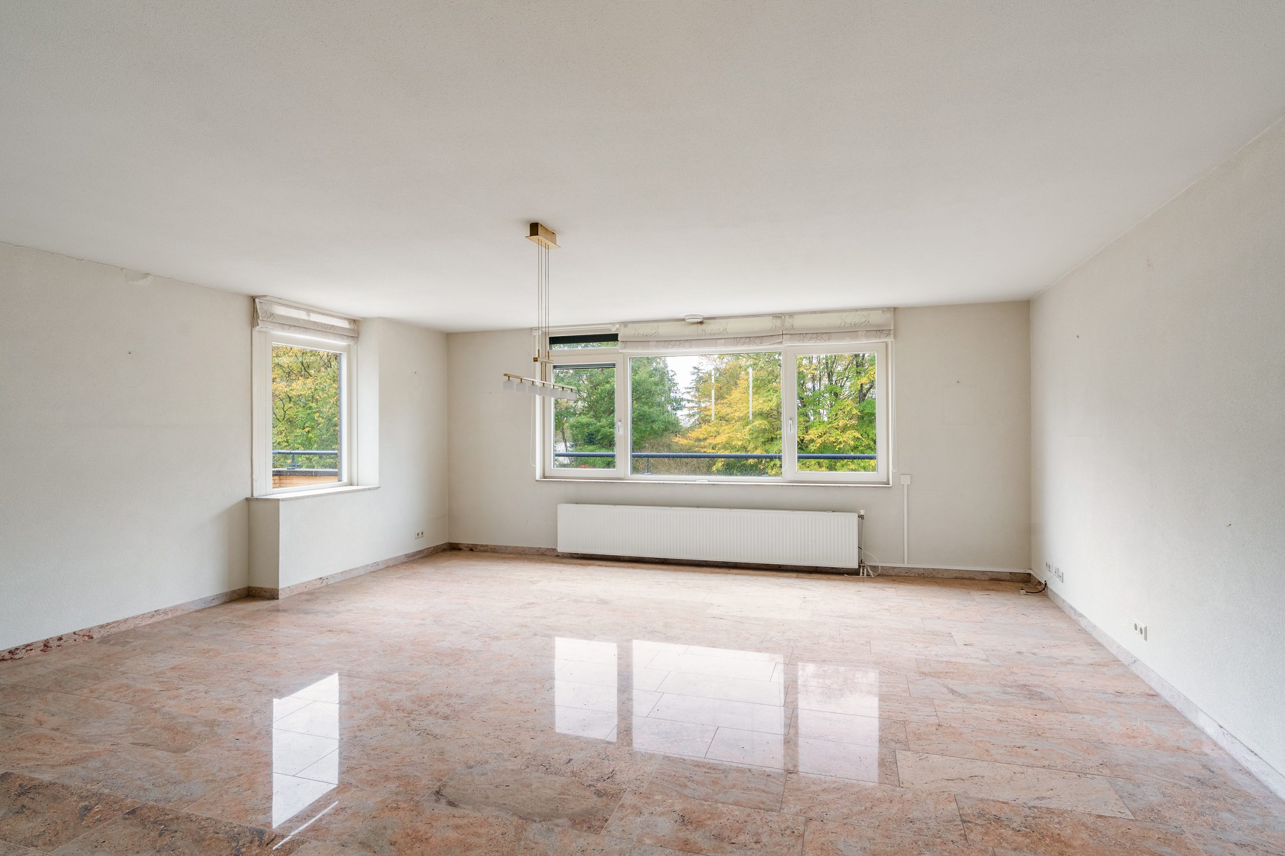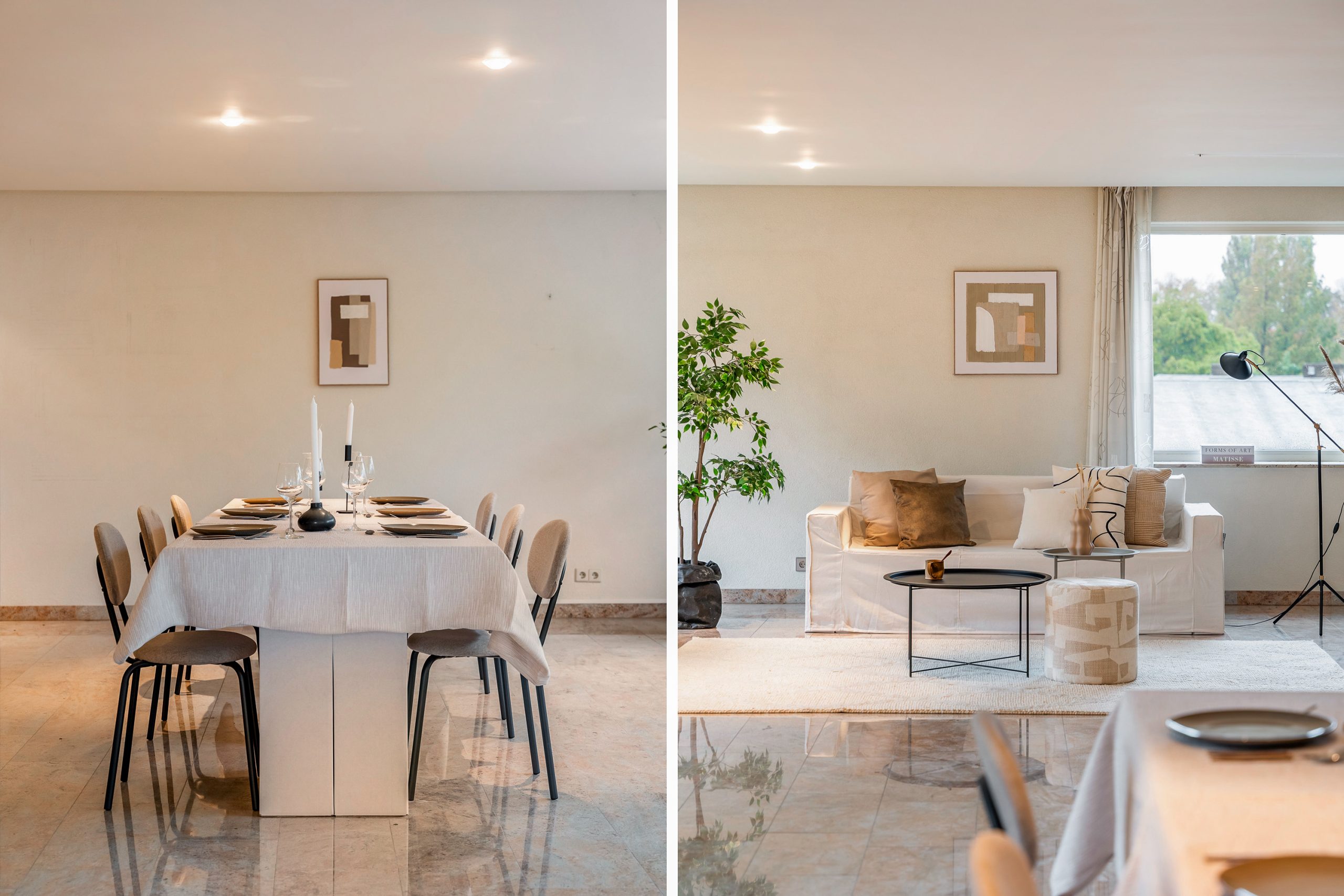 De woonkamer is ronduit indrukwekkend: een zee van licht, dankzij de vele ramen rondom en de dubbele openslaande deuren naar het terras. De ruimte ademt rust en elegantie, met zicht op het groen van het plantsoen. De natuurlijke marmeren vloer en het royale formaat zorgen voor een luxe uitstraling, terwijl de indeling uitnodigt tot meerdere zithoeken of een lange eettafel waar u en uw gasten zich direct thuis voelen.