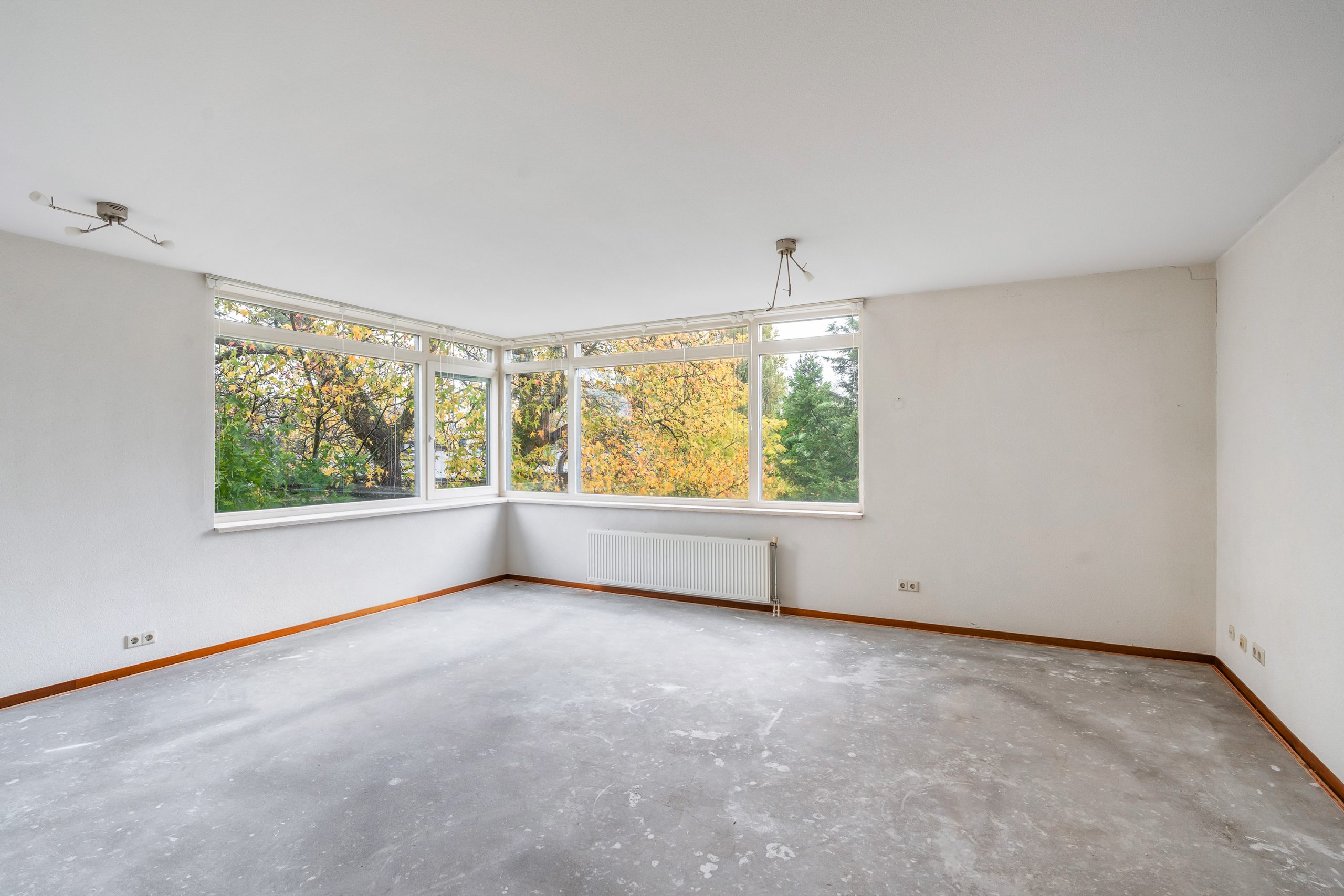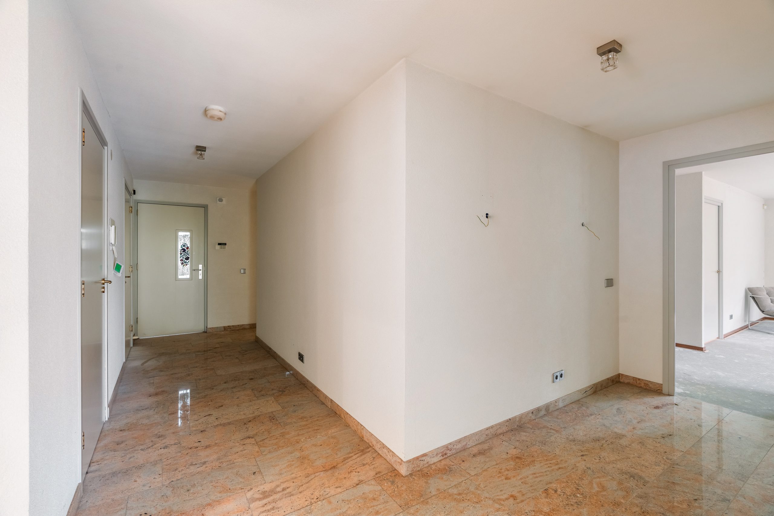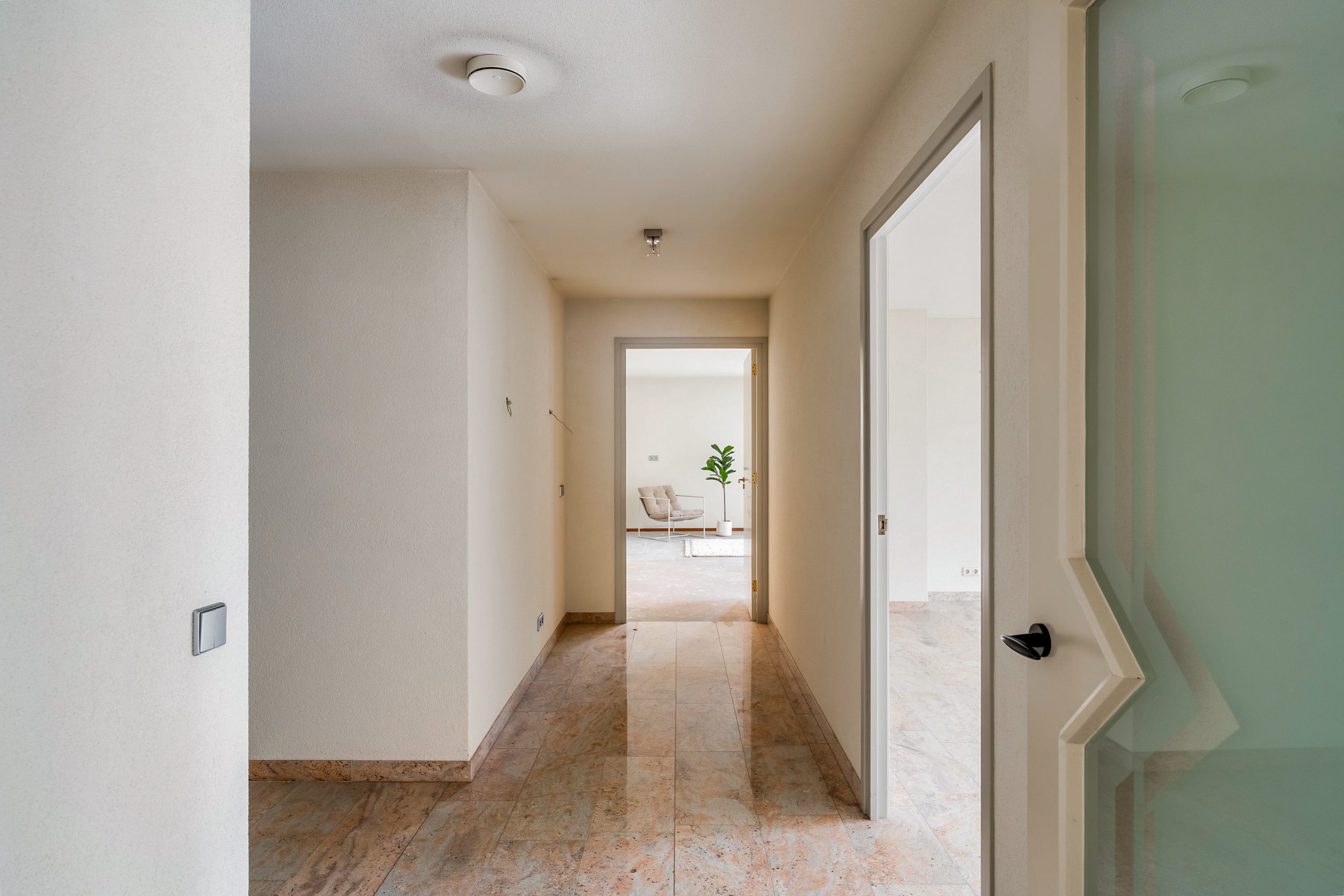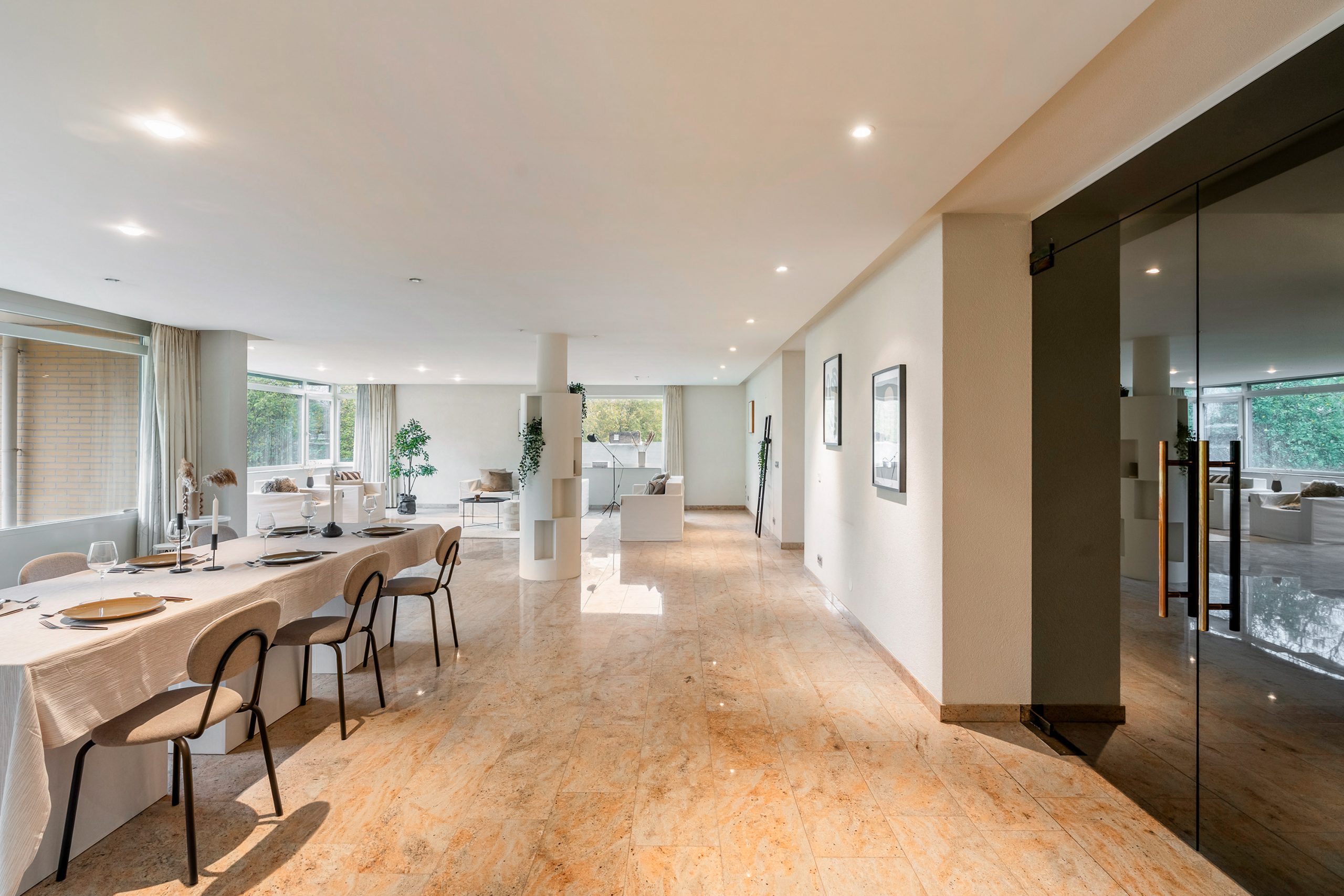 De woonkamer is ronduit indrukwekkend: een zee van licht, dankzij de vele ramen rondom en de dubbele openslaande deuren naar het terras. De ruimte ademt rust en elegantie, met zicht op het groen van het plantsoen. De natuurlijke marmeren vloer en het royale formaat zorgen voor een luxe uitstraling, terwijl de indeling uitnodigt tot meerdere zithoeken of een lange eettafel waar u en uw gasten zich direct thuis voelen.