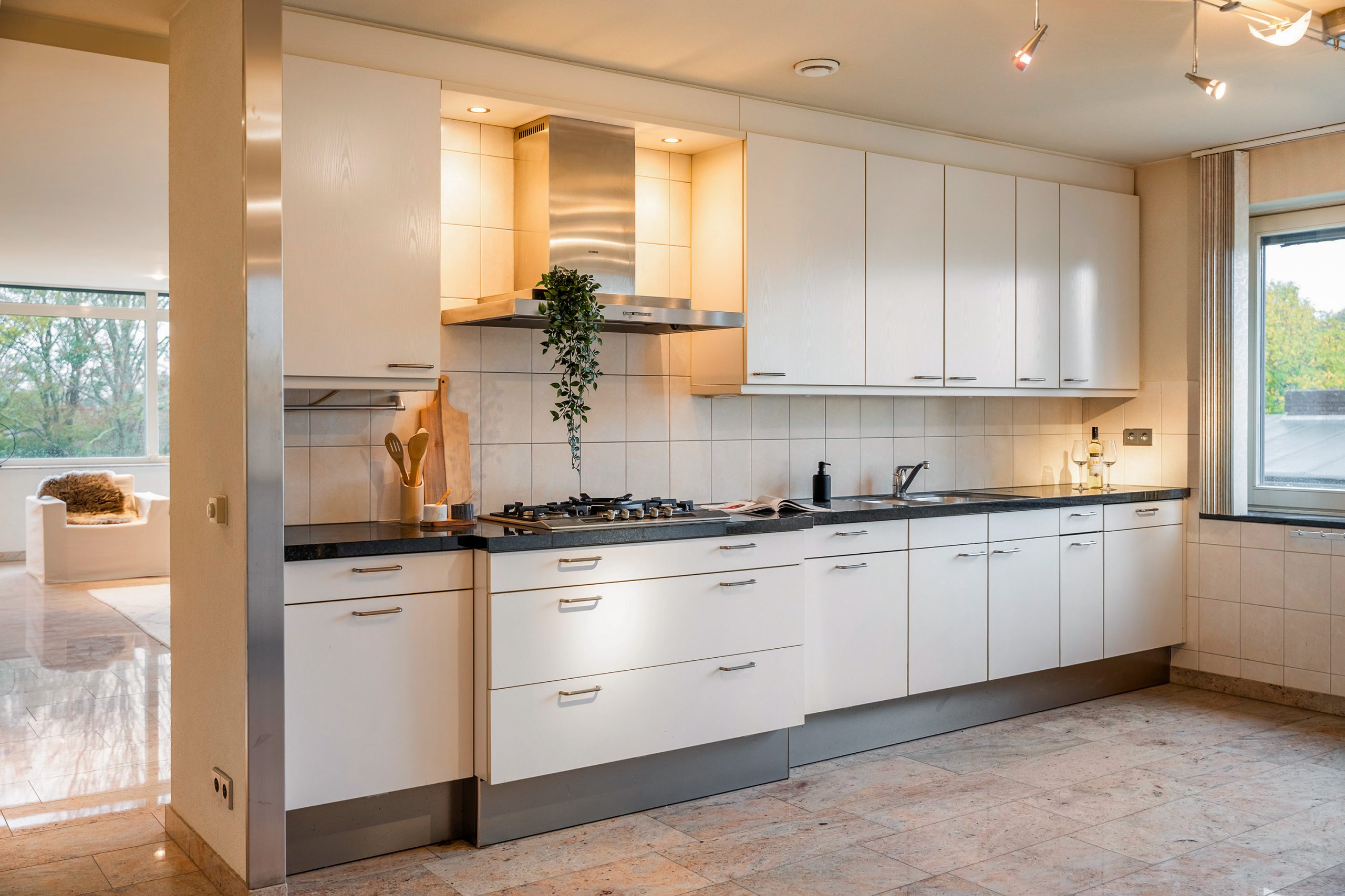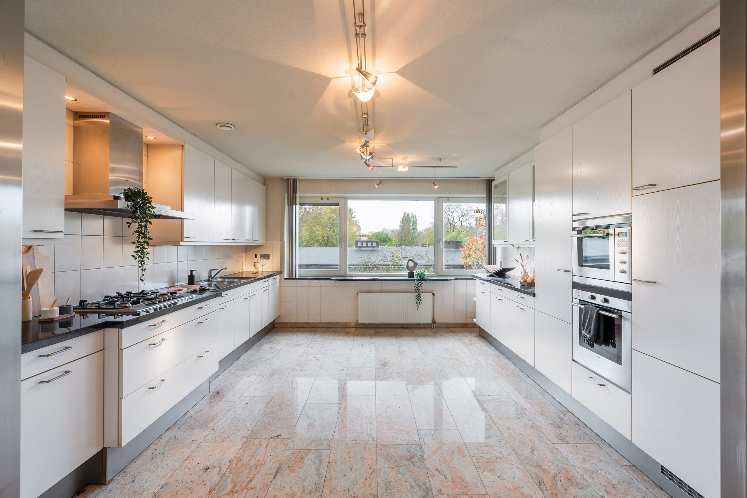 De ruime keuken bevindt zich direct naast de woonkamer en biedt volop mogelijkheden om uw culinaire dromen waar te maken. In de huidige opstelling is de keuken al praktisch ingedeeld, met veel werkruimte, lichtinval en een aangrenzende volledig geoutilleerde bijkeuken. Wie groots wil koken kan hier bovendien een open woonkeuken realiseren; door de keuken te betrekken bij de woonkamer ontstaat één royale leefruimte met ruimte voor een groot kookeiland waar u tijdens het koken contact houdt met uw gasten of familie. Zo ontstaat een plek waar koken, tafelen en samenzijn volledig samenkomen, een eigentijdse invulling van wonen op niveau
