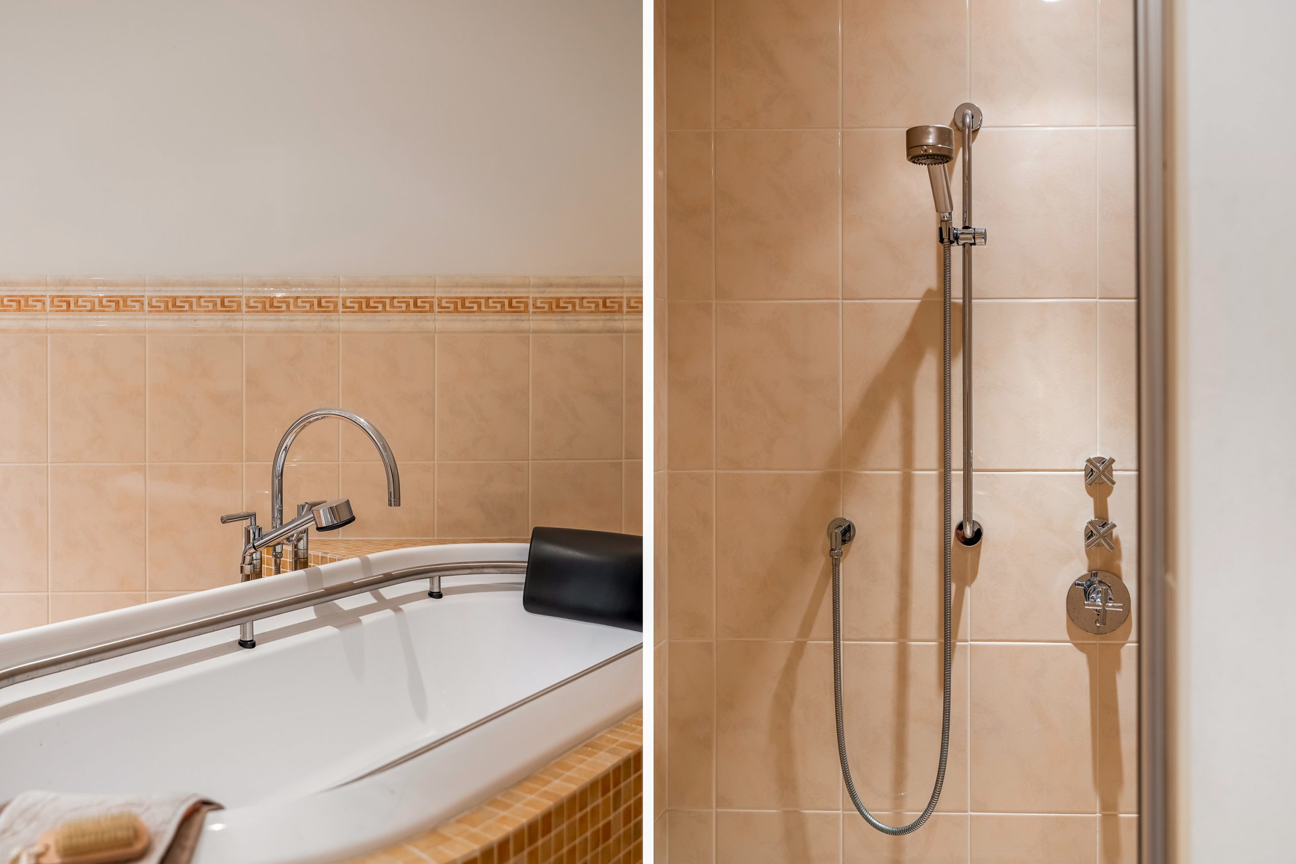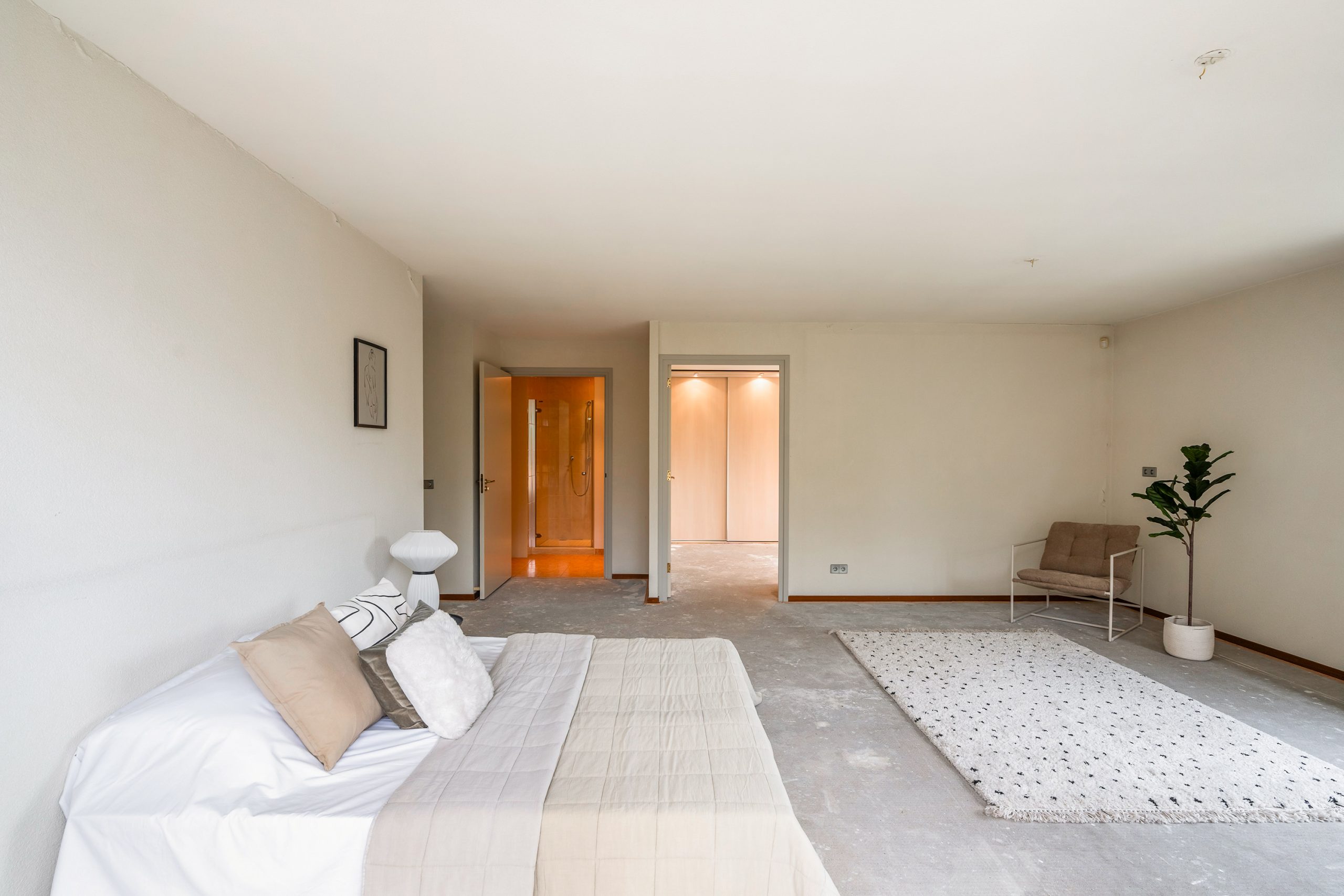De woning beschikt over maar liefst vier slaapkamers, elk met een eigen sfeer en karakter. De hoofdslaapkamer is van indrukwekkend formaat en vormt een waar privéverblijf: licht, rustig en met openslaande deuren naar het terras. Het uitzicht op het groen maakt het gevoel van ruimte compleet. Aangrenzend bevindt zich een royale walk-in closet met ingebouwde verlichting en volop kastruimte, de perfecte plek om alles overzichtelijk op te bergen. Vanuit deze suite bereikt u bovendien direct de en-suite badkamer, wat zorgt voor optimaal comfort en privacy.