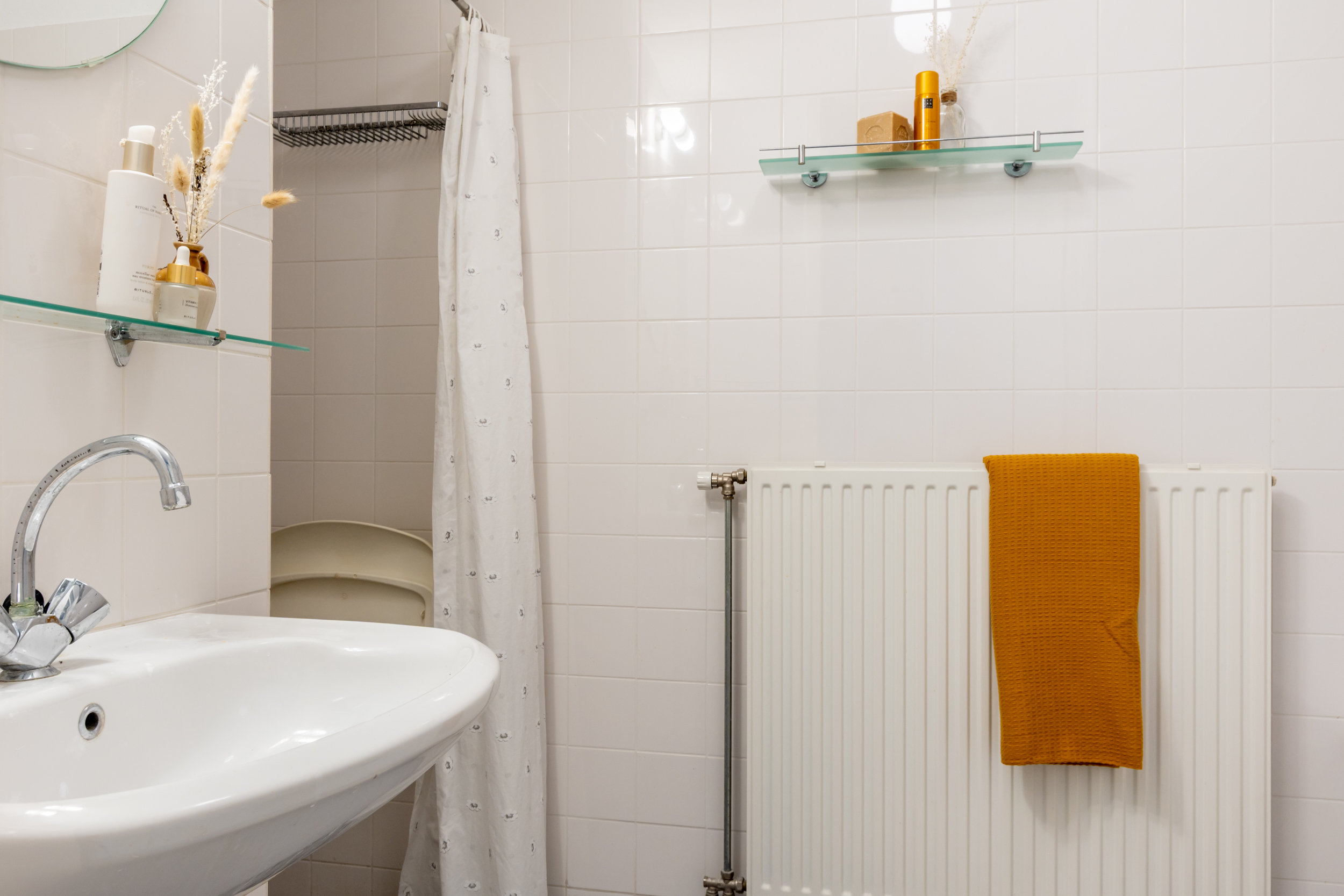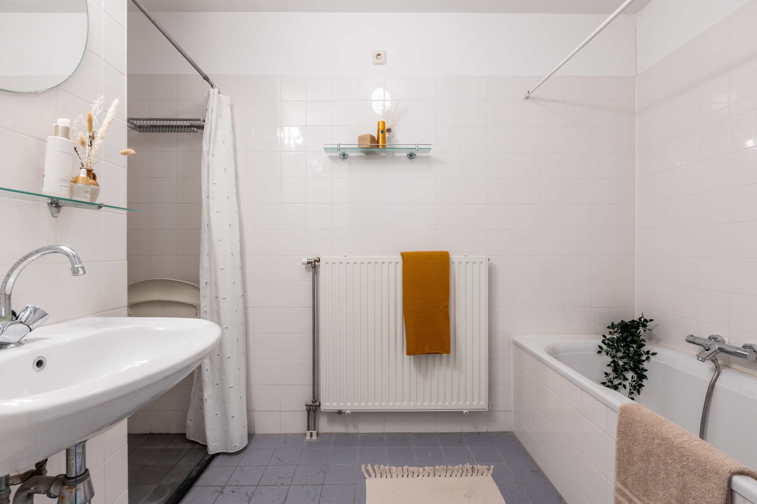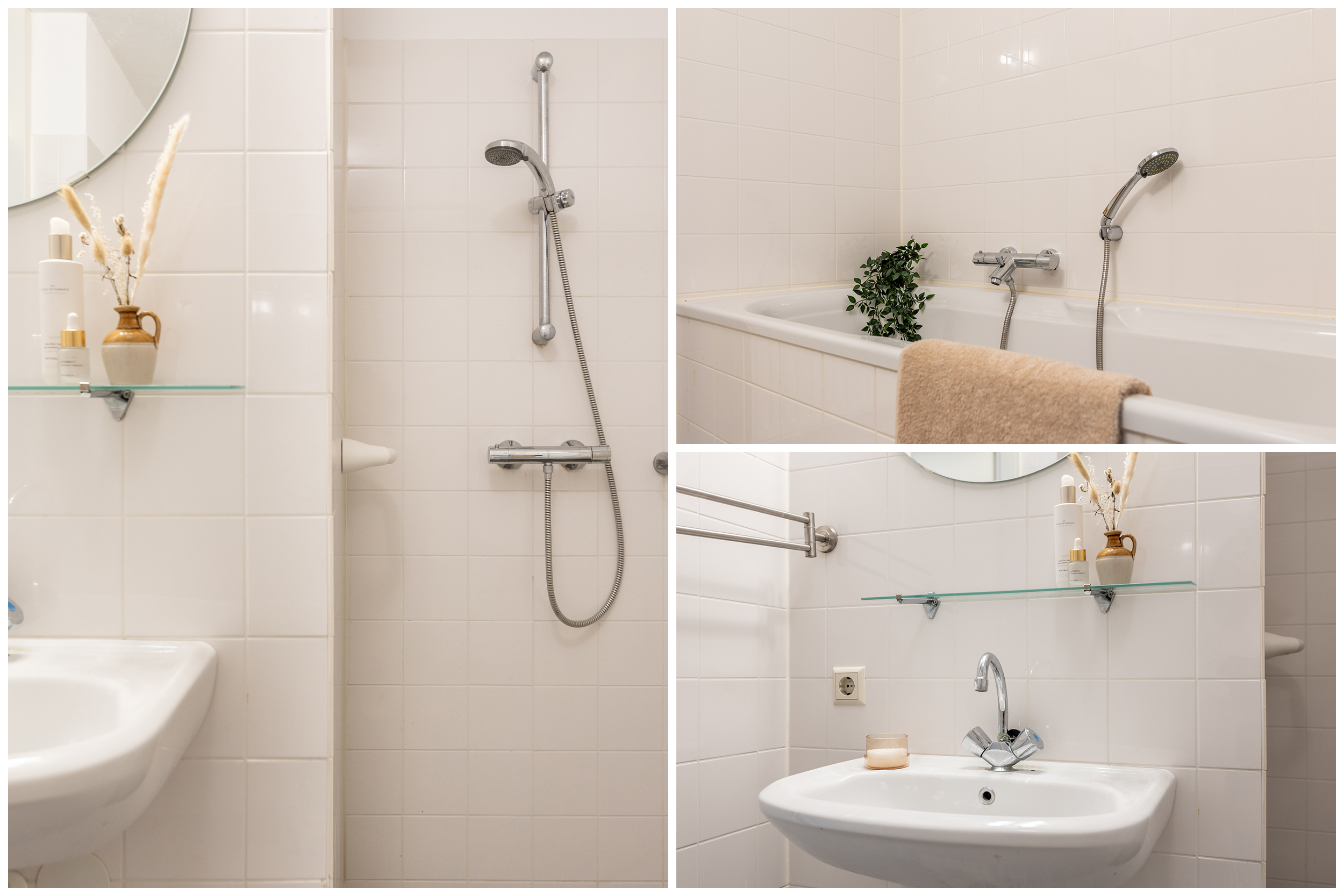 De tweede slaapkamer is ideaal als logeer- of werkkamer — de perfecte thuiswerkplek met veel daglicht. De badkamer is praktisch ingedeeld en verrassend ruim van opzet. Hier vind je alles wat je nodig hebt voor een comfortabel begin en einde van de dag: een ligbad, een aparte douche, een wastafel en een design radiator
