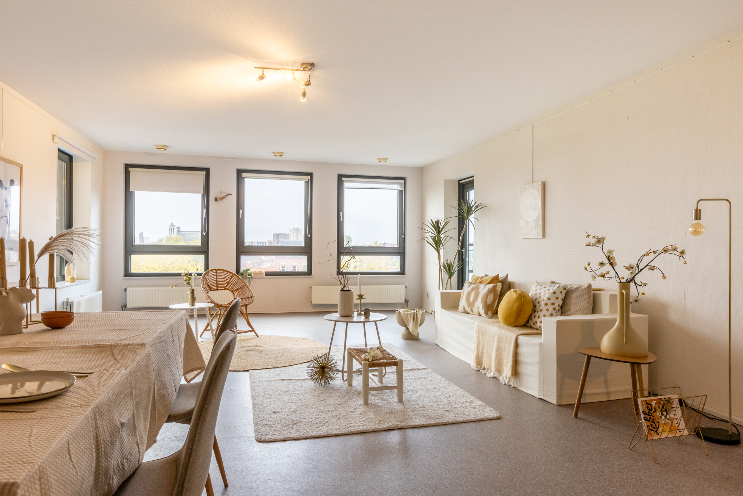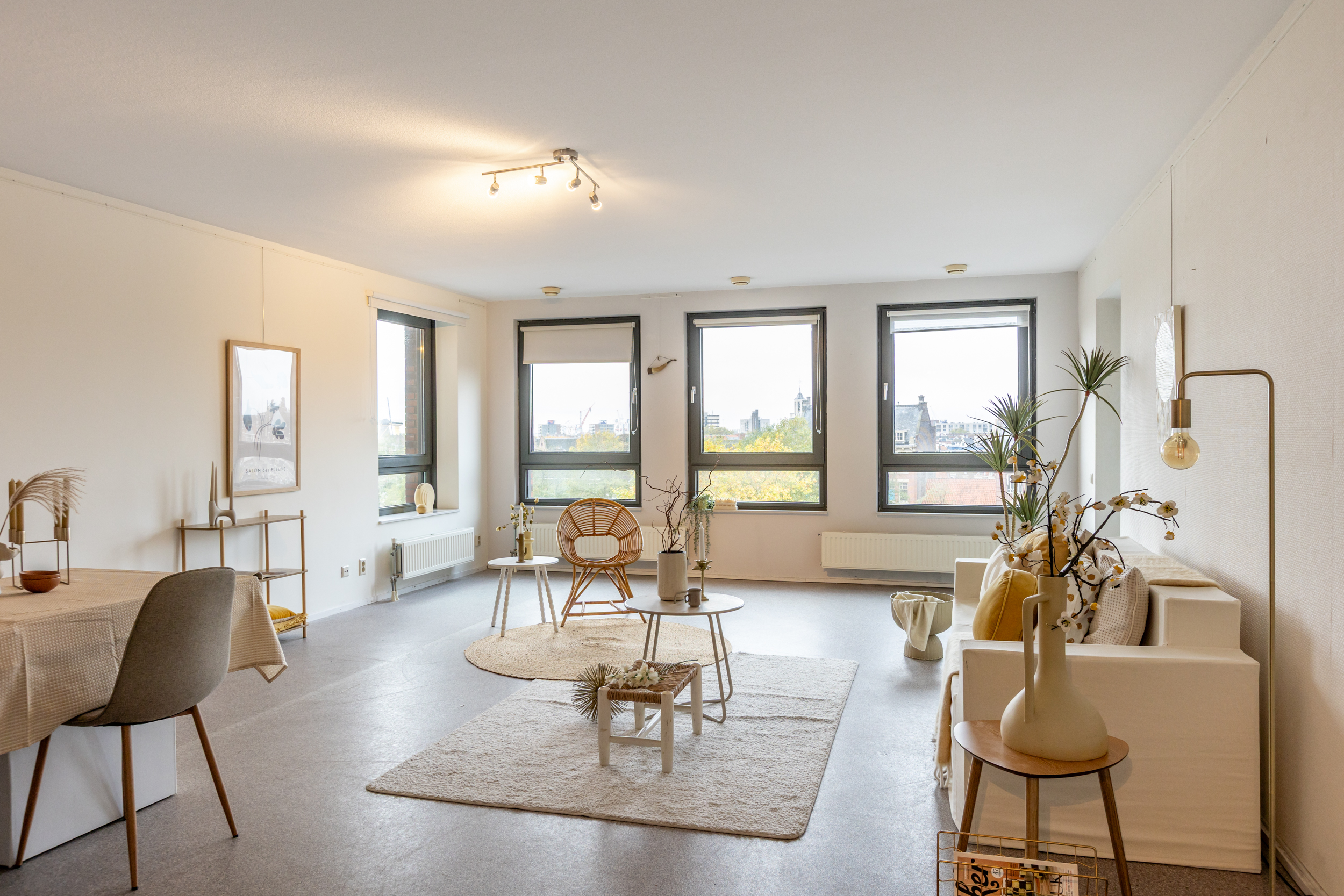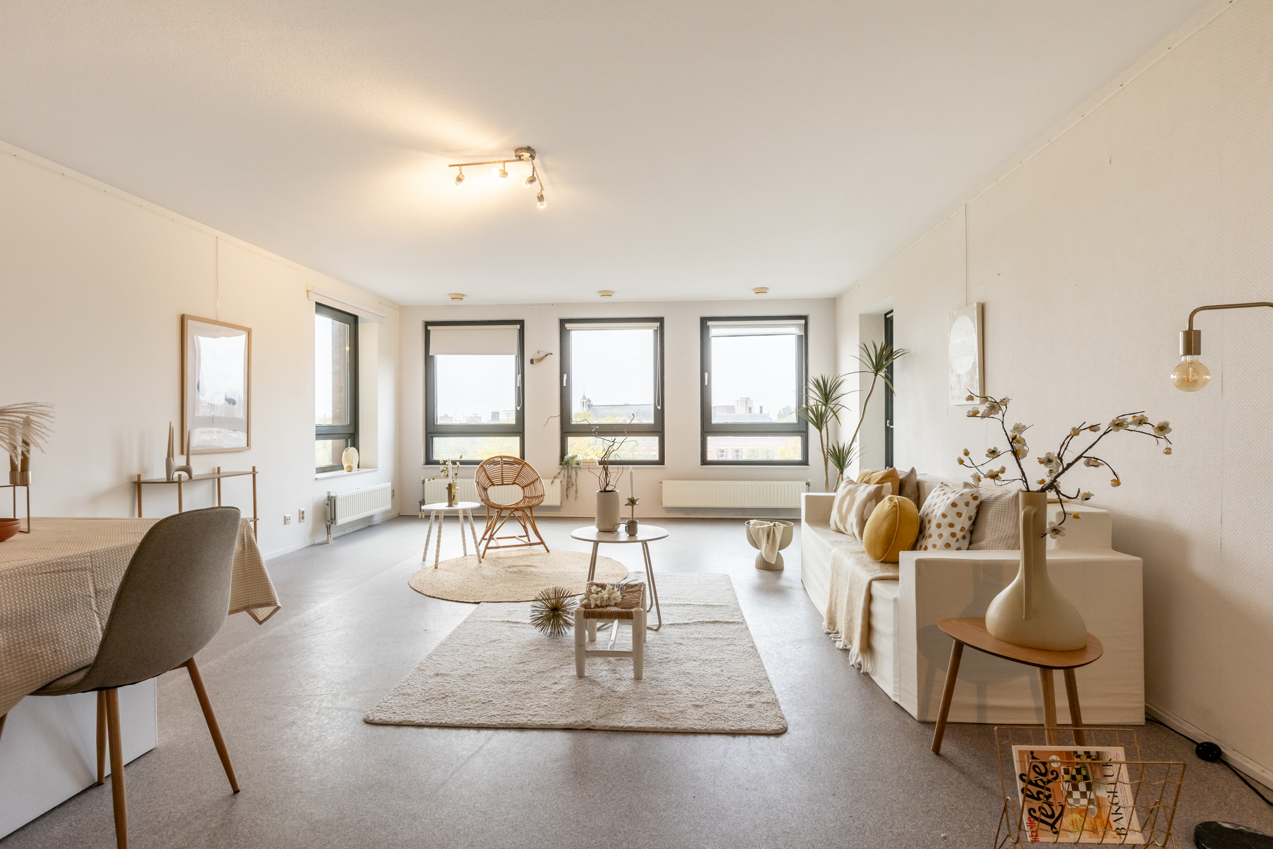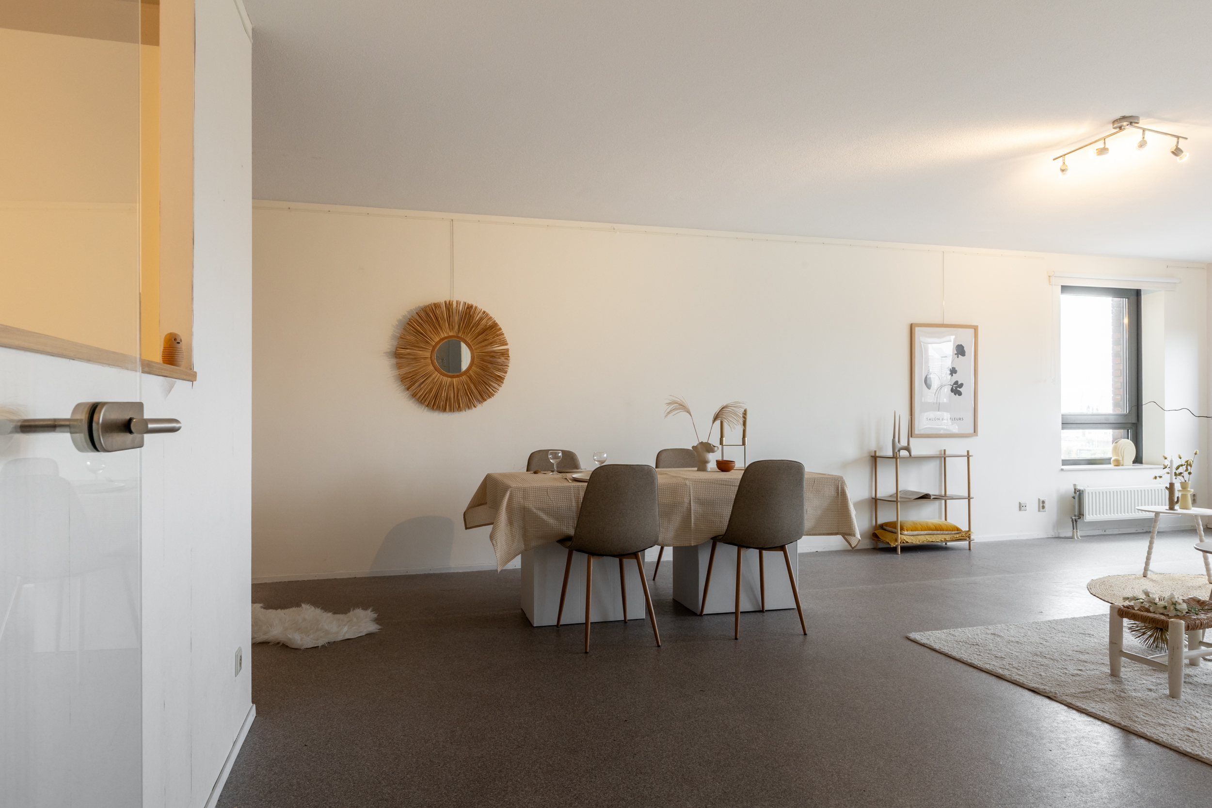Zodra je binnenkomt, voel je het: dit appartement ademt ruimte. De royale woonkamer strekt zich uit over de volle breedte van de woning en heeft grote raampartijen die zorgen voor een zee van licht en een wijds uitzicht over de skyline van Rotterdam. Er is meer dan genoeg plek voor een comfortabele zithoek én een royale eettafel, perfect voor gezellige etentjes met vrienden.