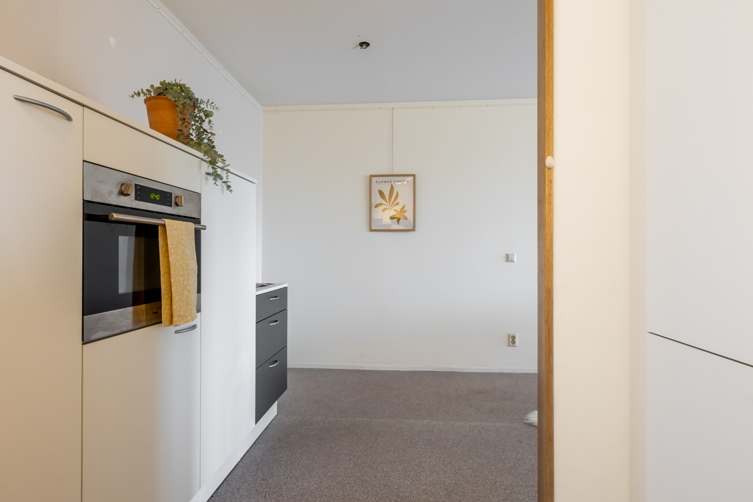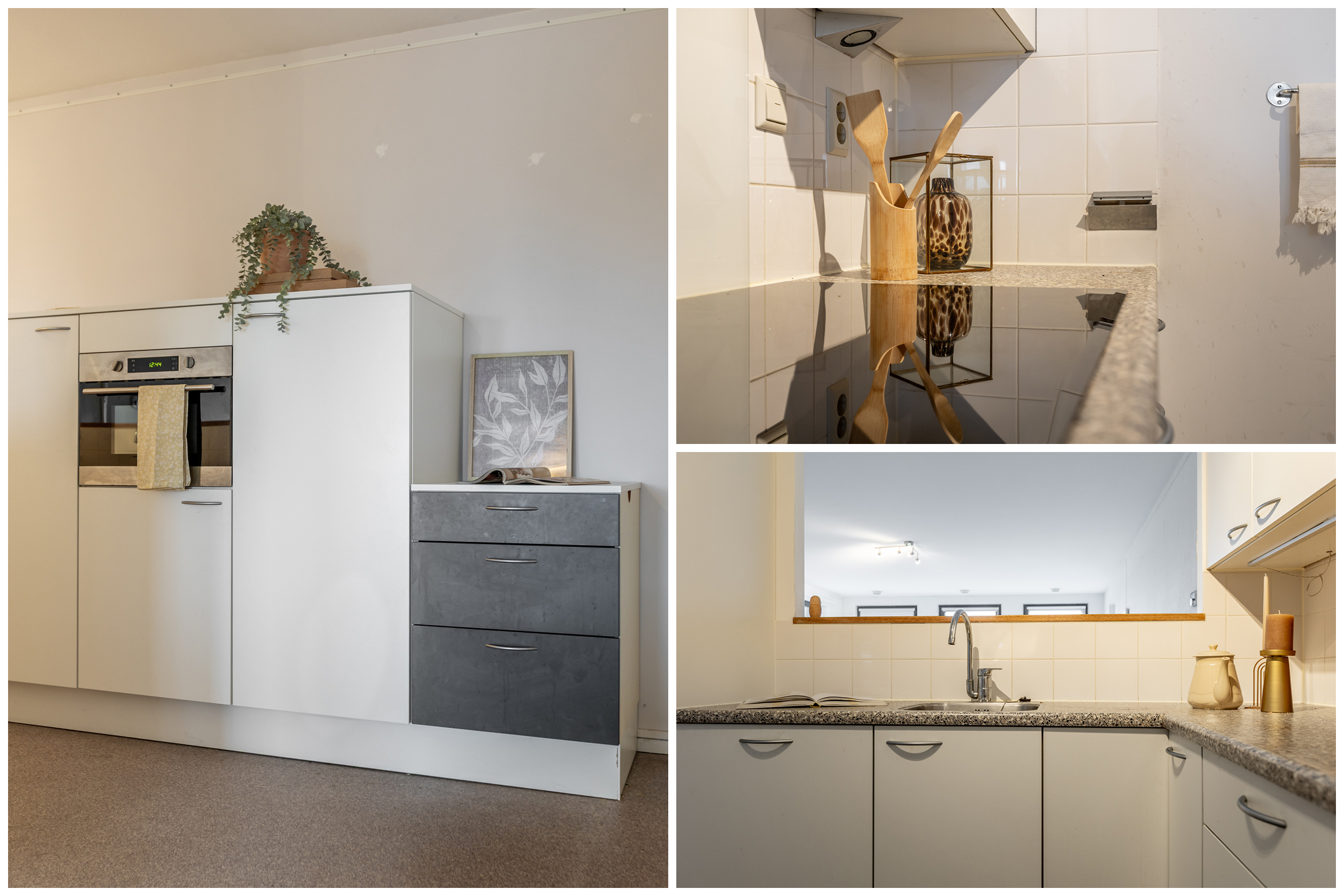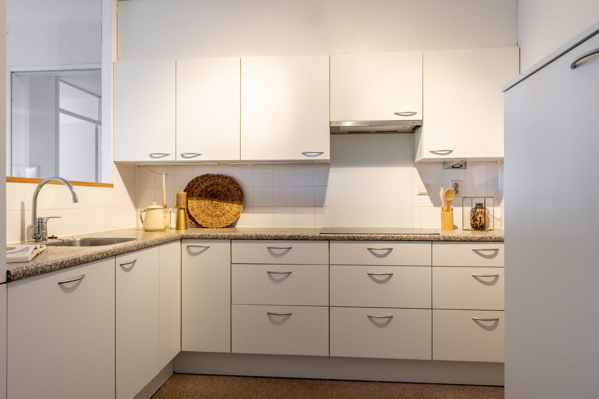 De woonkamer staat in verbinding met de halfopen keuken waardoor koken en samenzijn hier moeiteloos samengaan. De keuken is praktisch ingedeeld met veel kastruimte en een prettig zicht richting de woonkamer. Er is plaats voor alle moderne apparatuur, waaronder een inbouwoven, kookplaat, afzuigkap en vaatwasser.