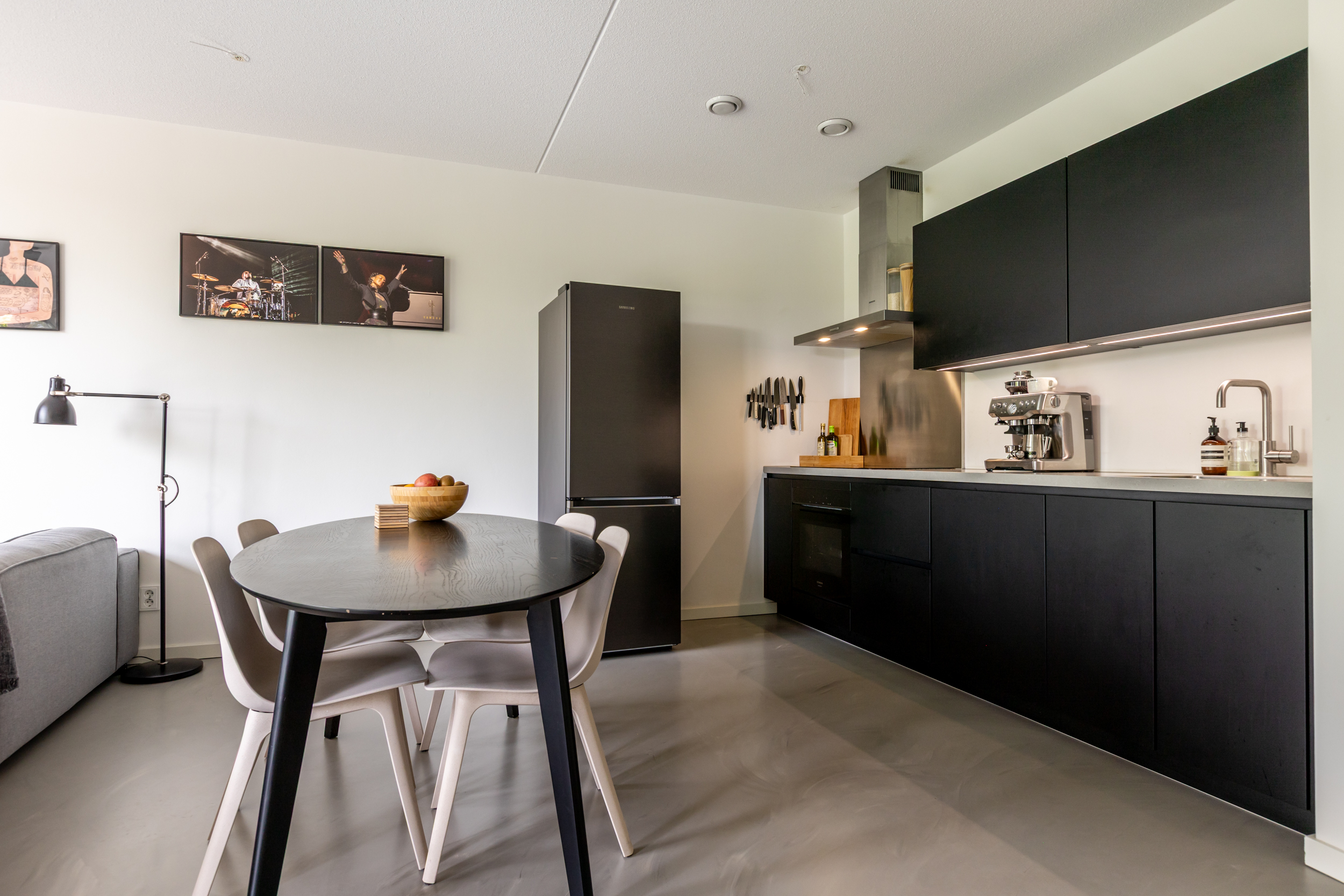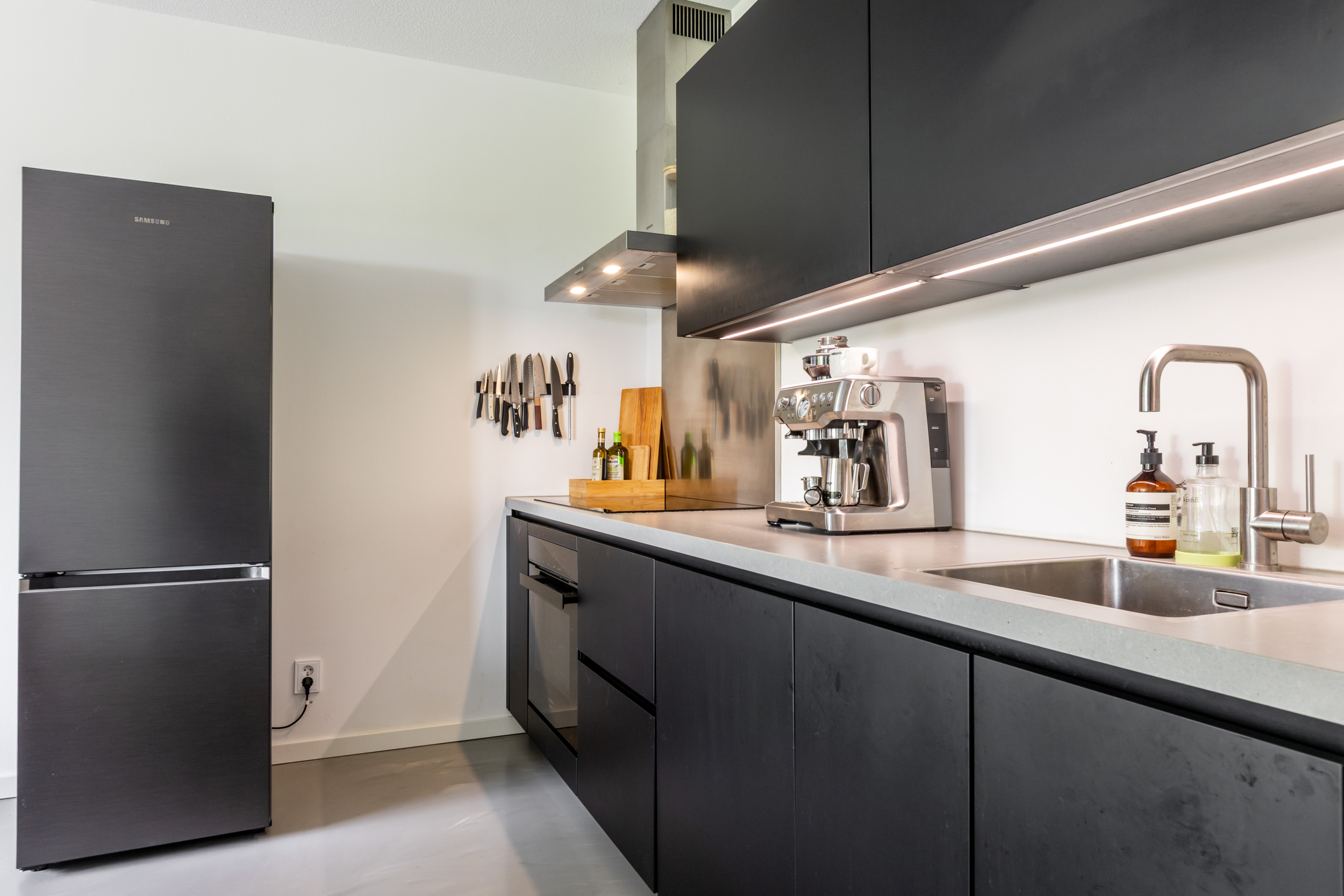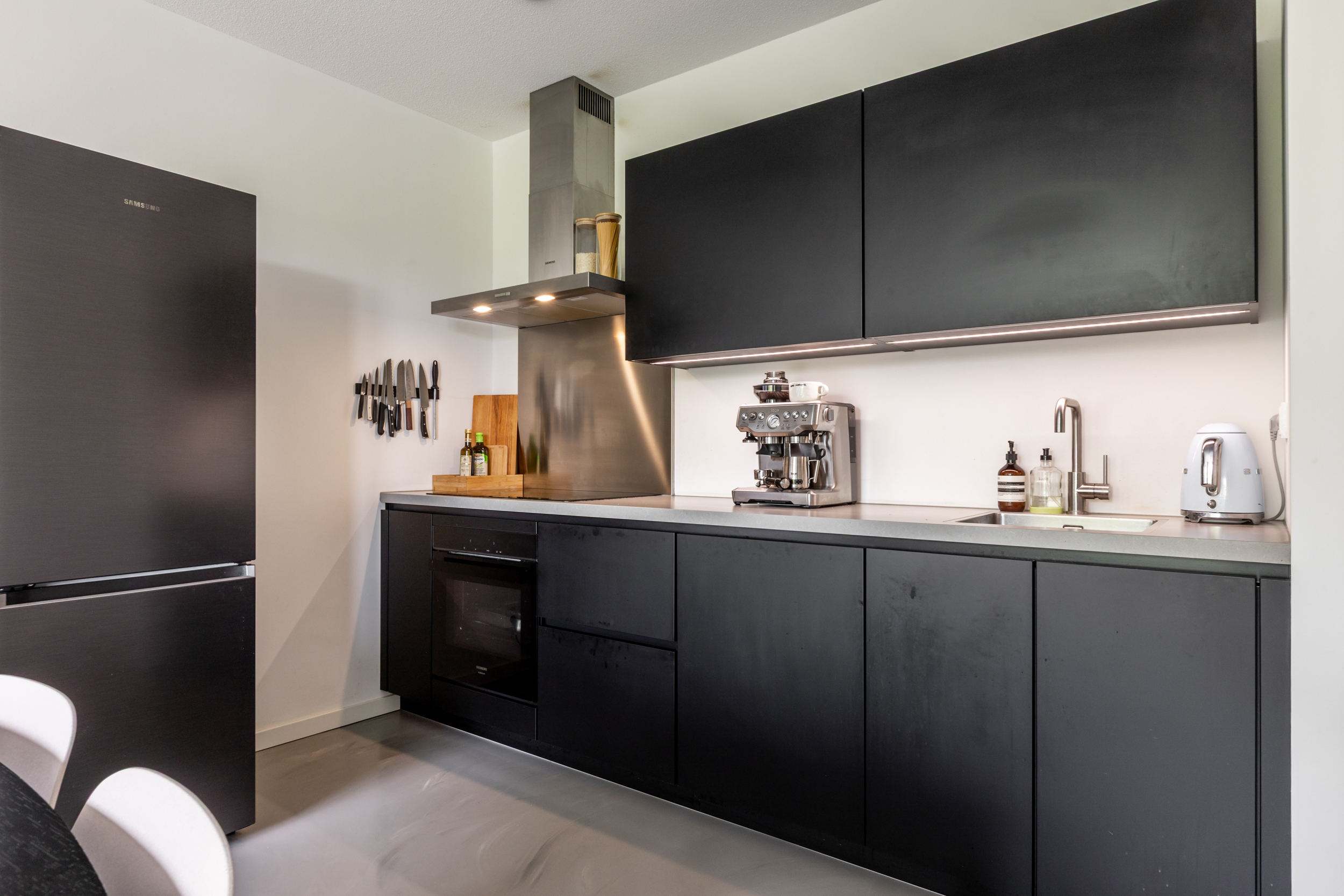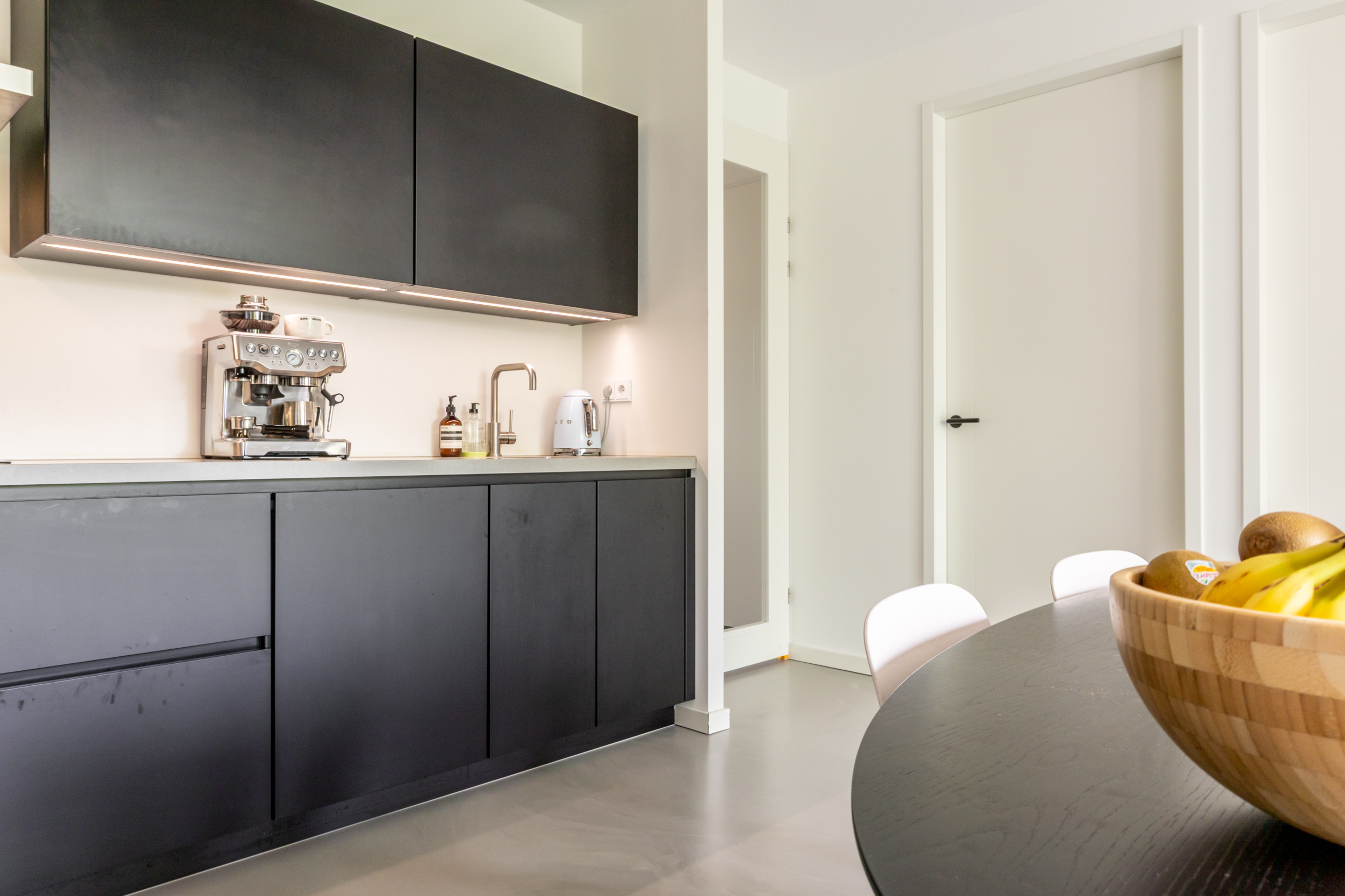 De woonkamer is licht en strak afgewerkt met een moderne gietvloer en grote raampartijen. De luxe open keuken in stijlvol matzwart is voorzien van diverse inbouwapparatuur zoals een inductiekookplaat, afzuigkap, oven en vaatwasser. Tevens biedt de keuken volop werk- en opbergruimte. Perfect om uitgebreid te koken of gezellig te tafelen met vrienden.