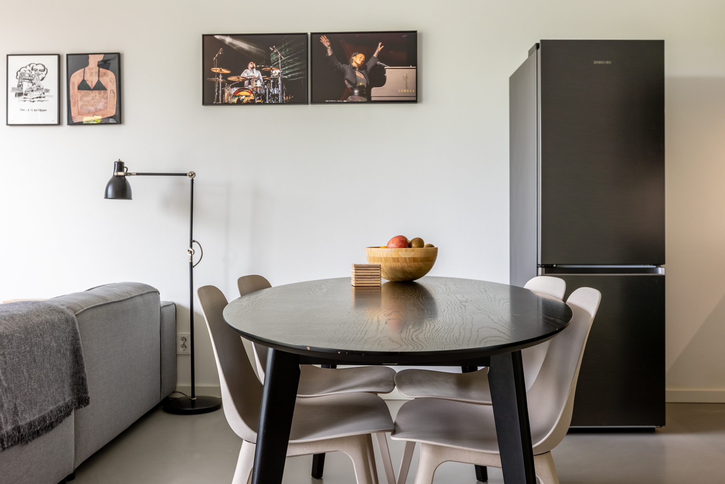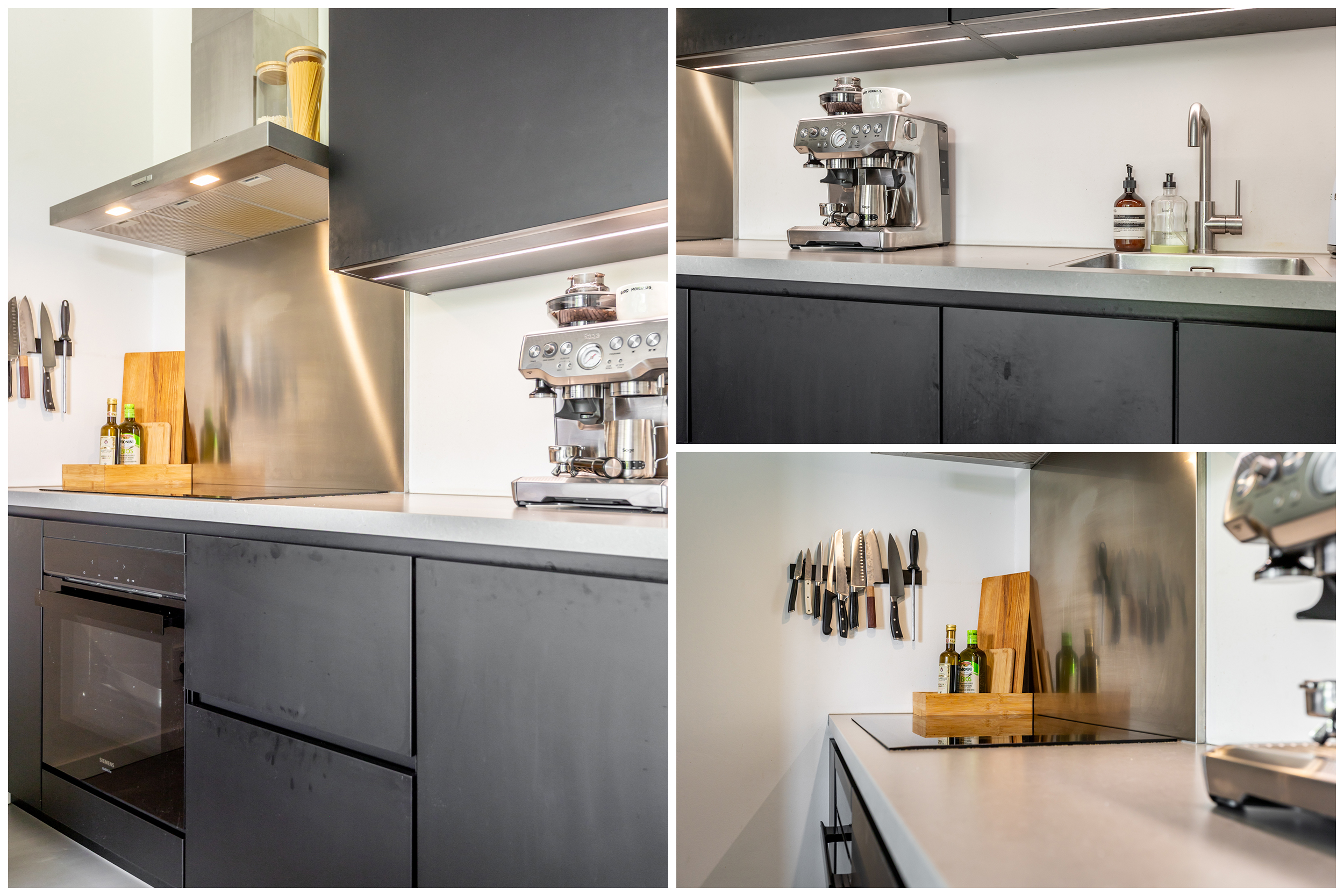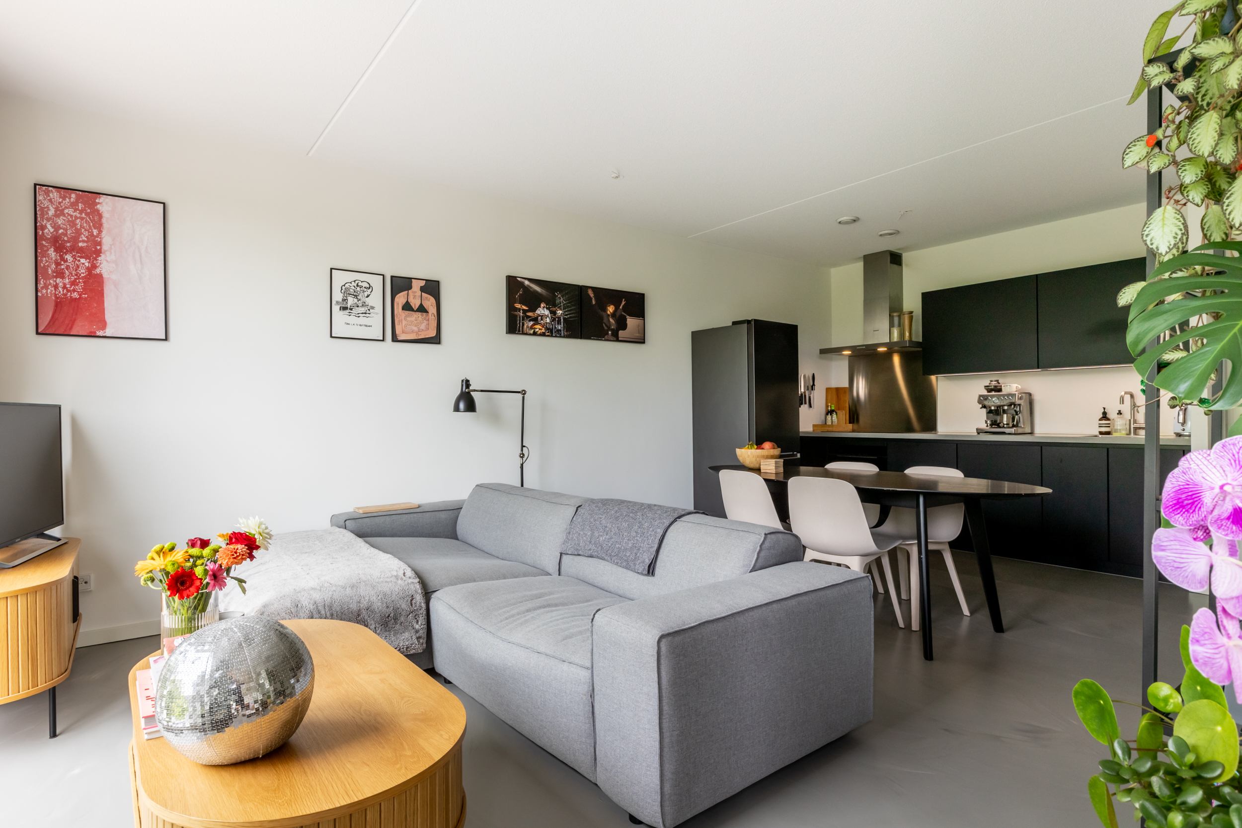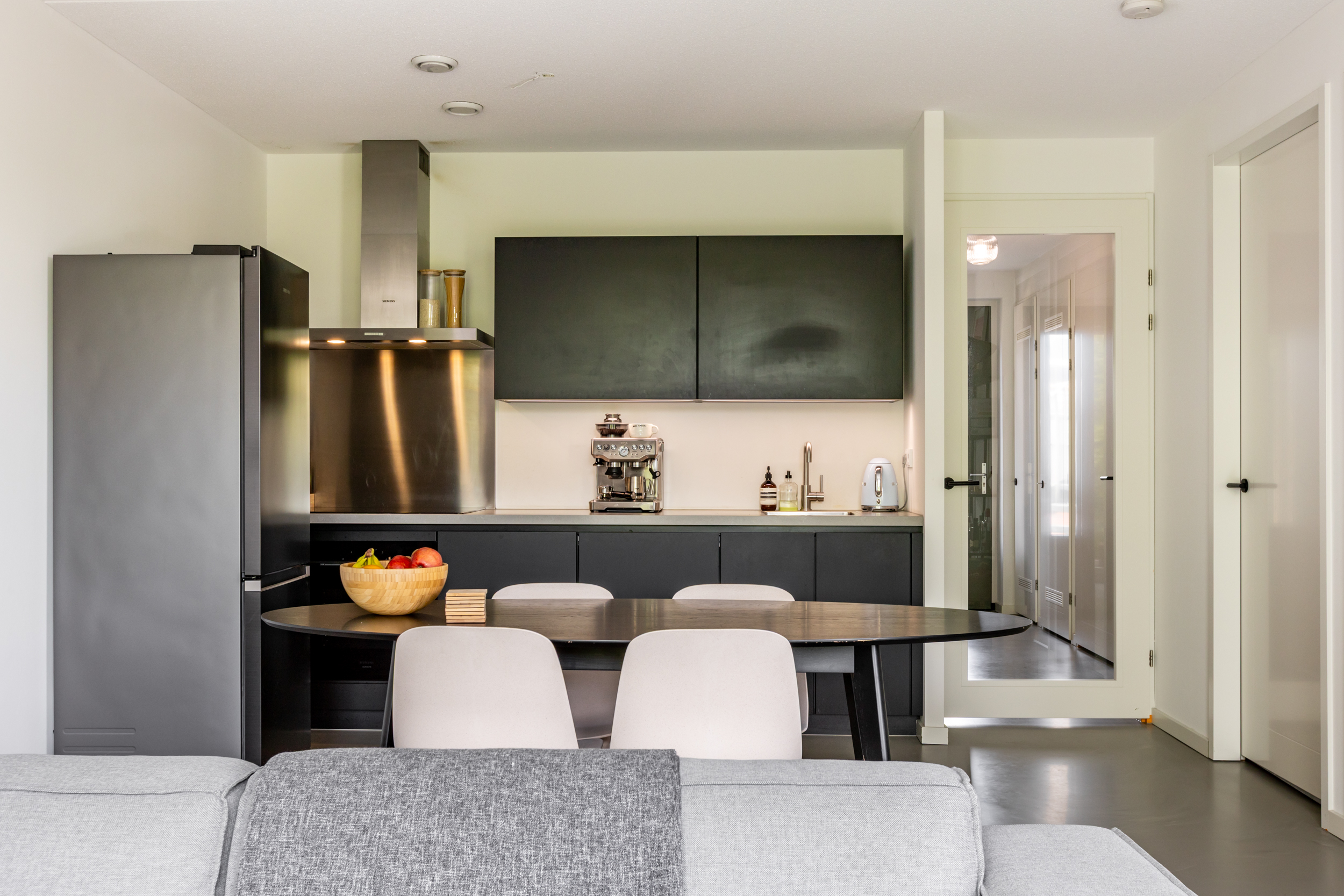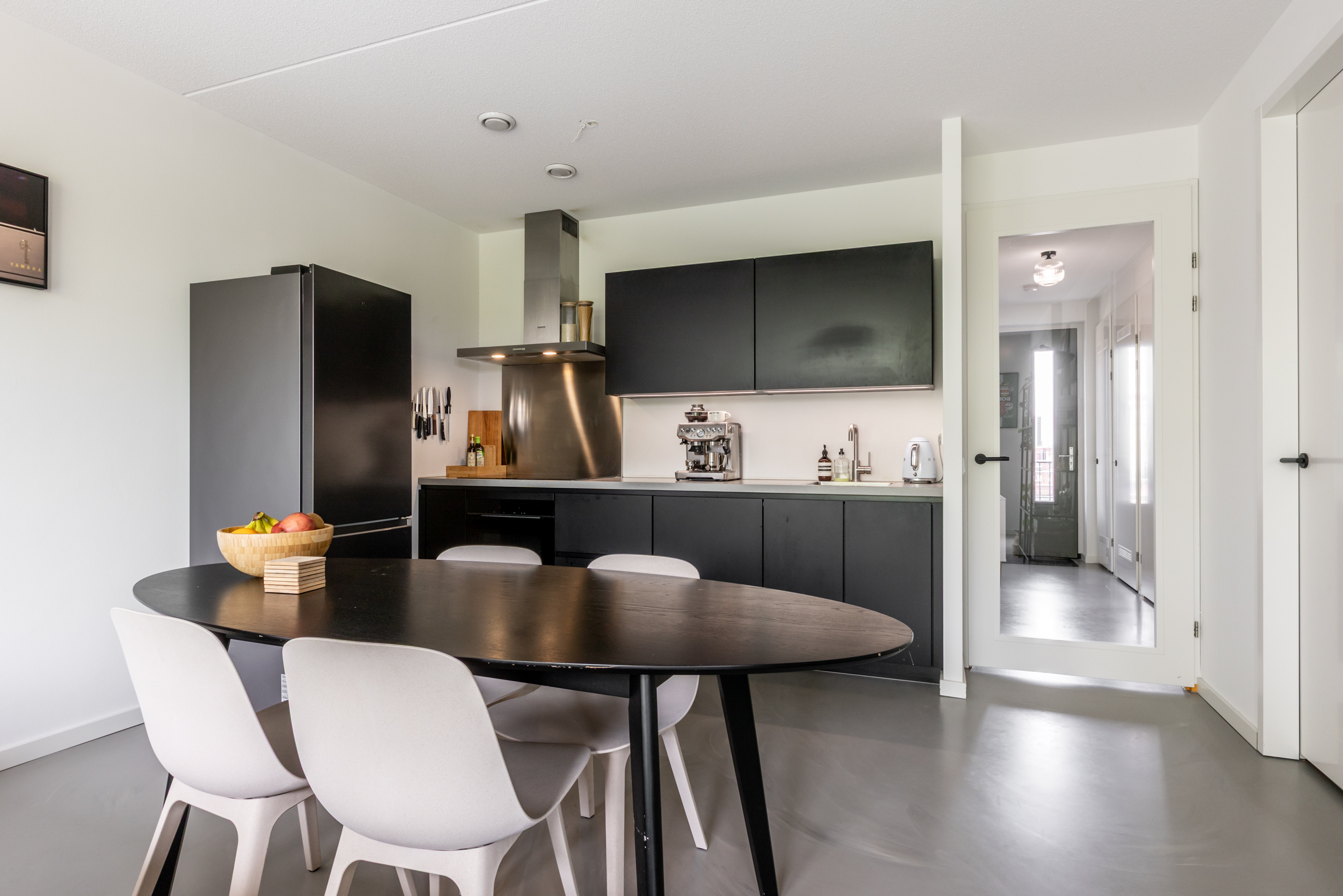 De woonkamer is licht en strak afgewerkt met een moderne gietvloer en grote raampartijen. De luxe open keuken in stijlvol matzwart is voorzien van diverse inbouwapparatuur zoals een inductiekookplaat, afzuigkap, oven en vaatwasser. Tevens biedt de keuken volop werk- en opbergruimte. Perfect om uitgebreid te koken of gezellig te tafelen met vrienden.