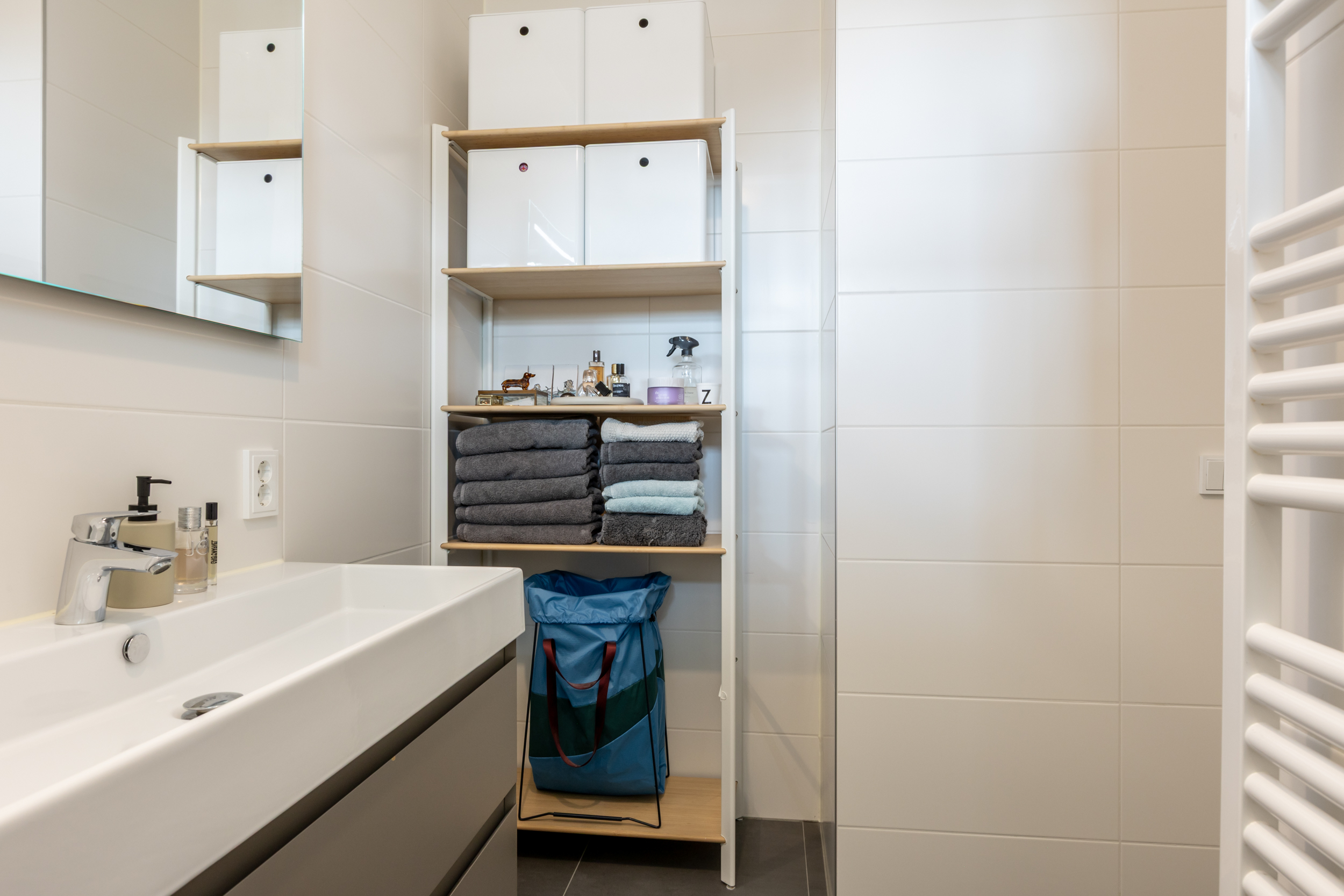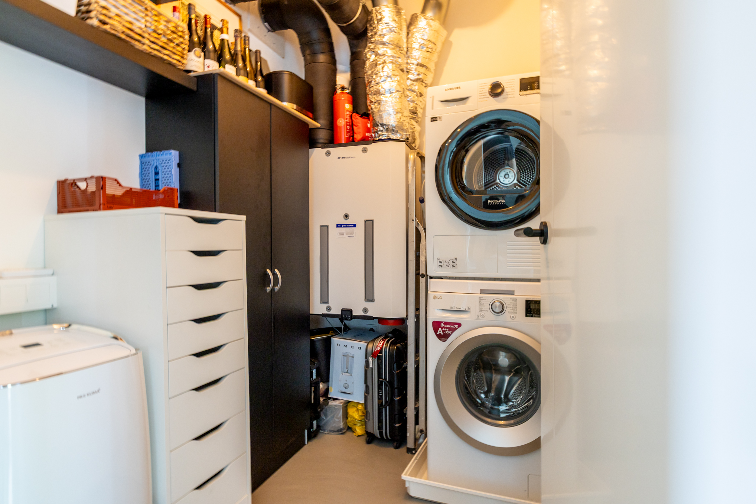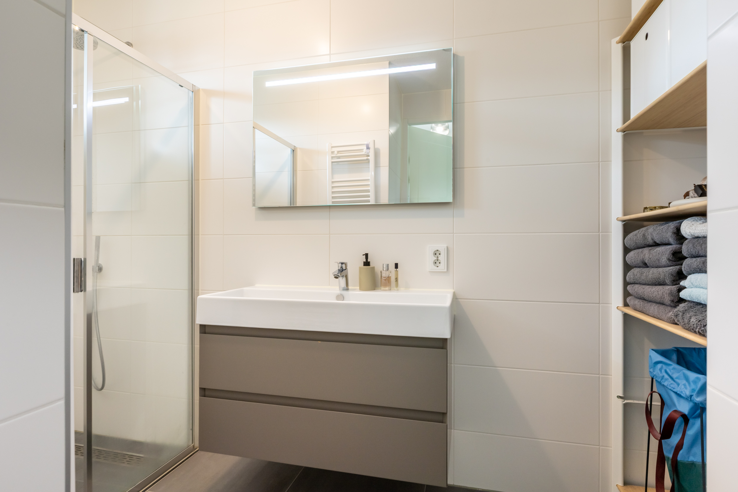 De badkamer is stijlvol en praktisch ingericht met een moderne inloopdouche, wastafelmeubel en verlichte spiegel. Daarnaast is er een separaat toilet met fonteintje. Een aparte wasruimte maakt het geheel compleet en biedt plek voor wasmachine, droger en extra opslag.