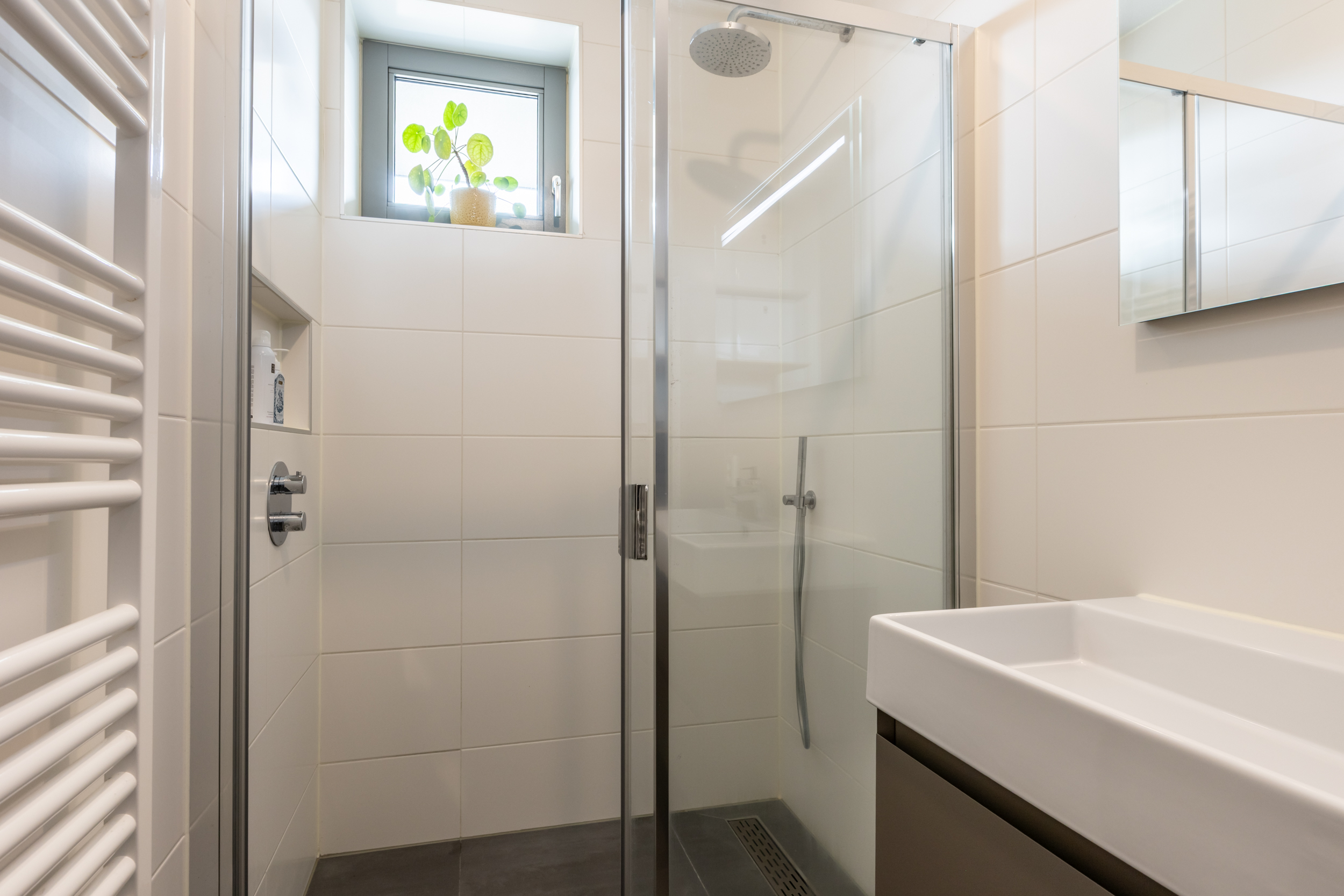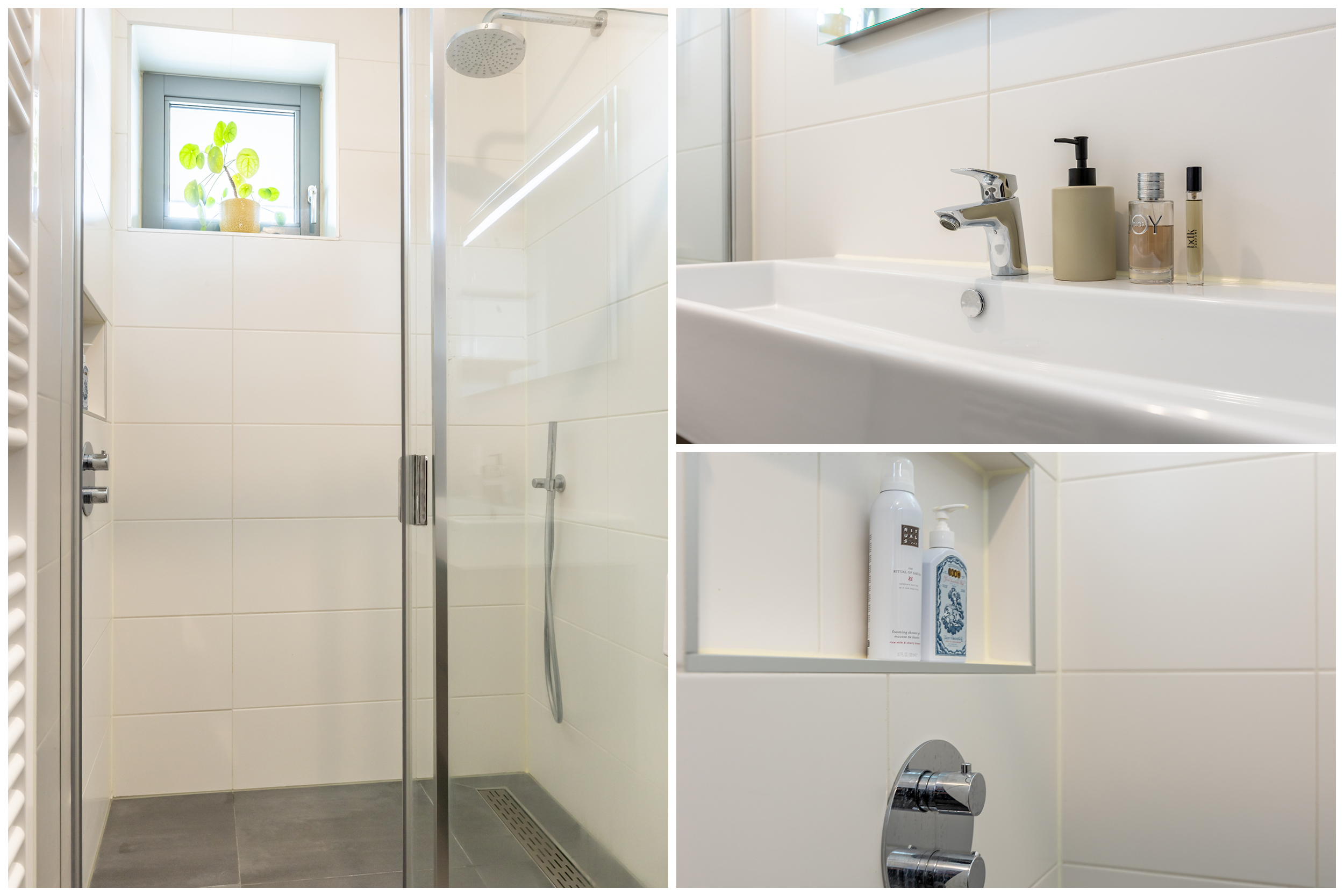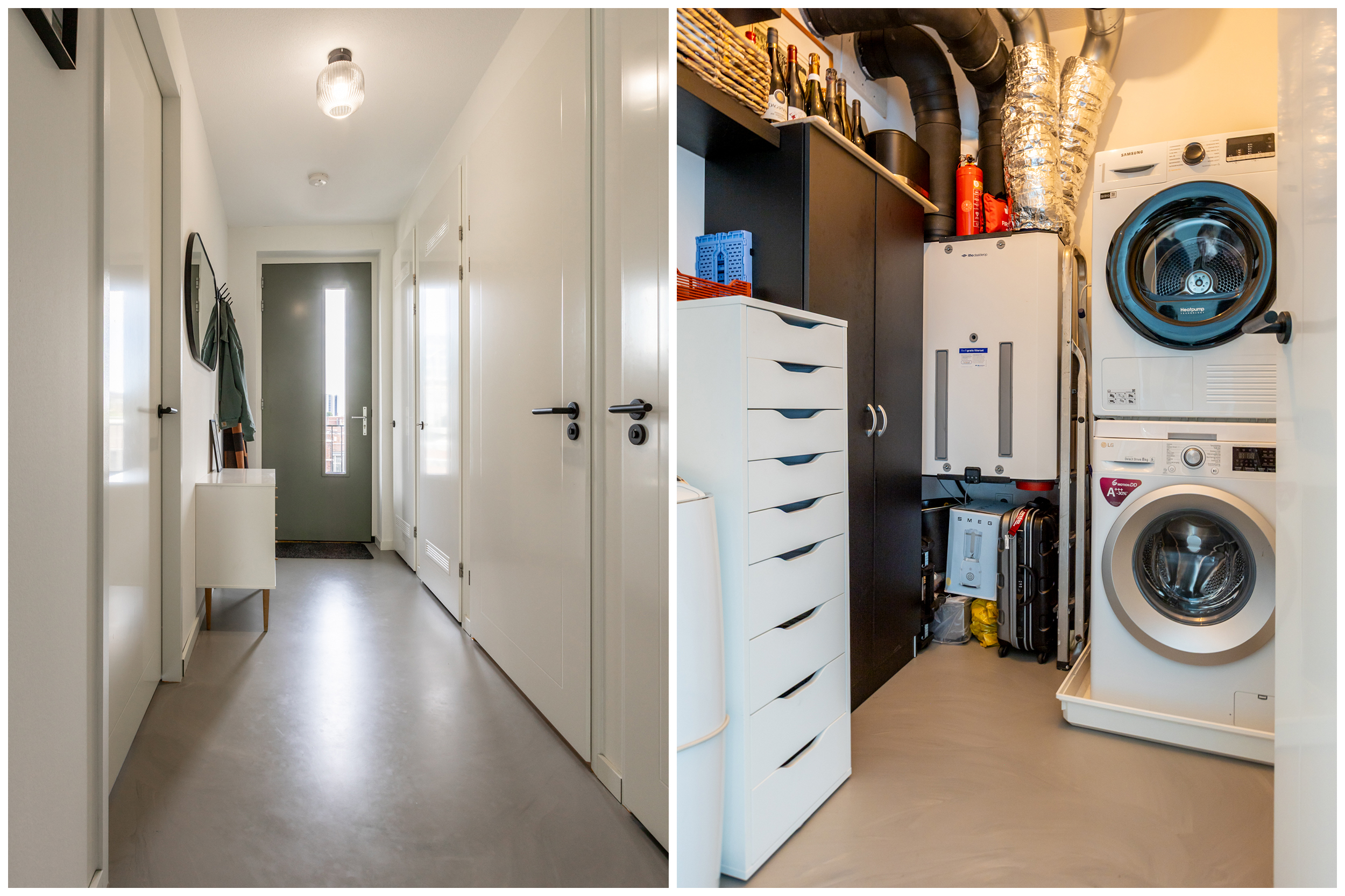 De badkamer is stijlvol en praktisch ingericht met een moderne inloopdouche, wastafelmeubel en verlichte spiegel. Daarnaast is er een separaat toilet met fonteintje. Een aparte wasruimte maakt het geheel compleet en biedt plek voor wasmachine, droger en extra opslag.