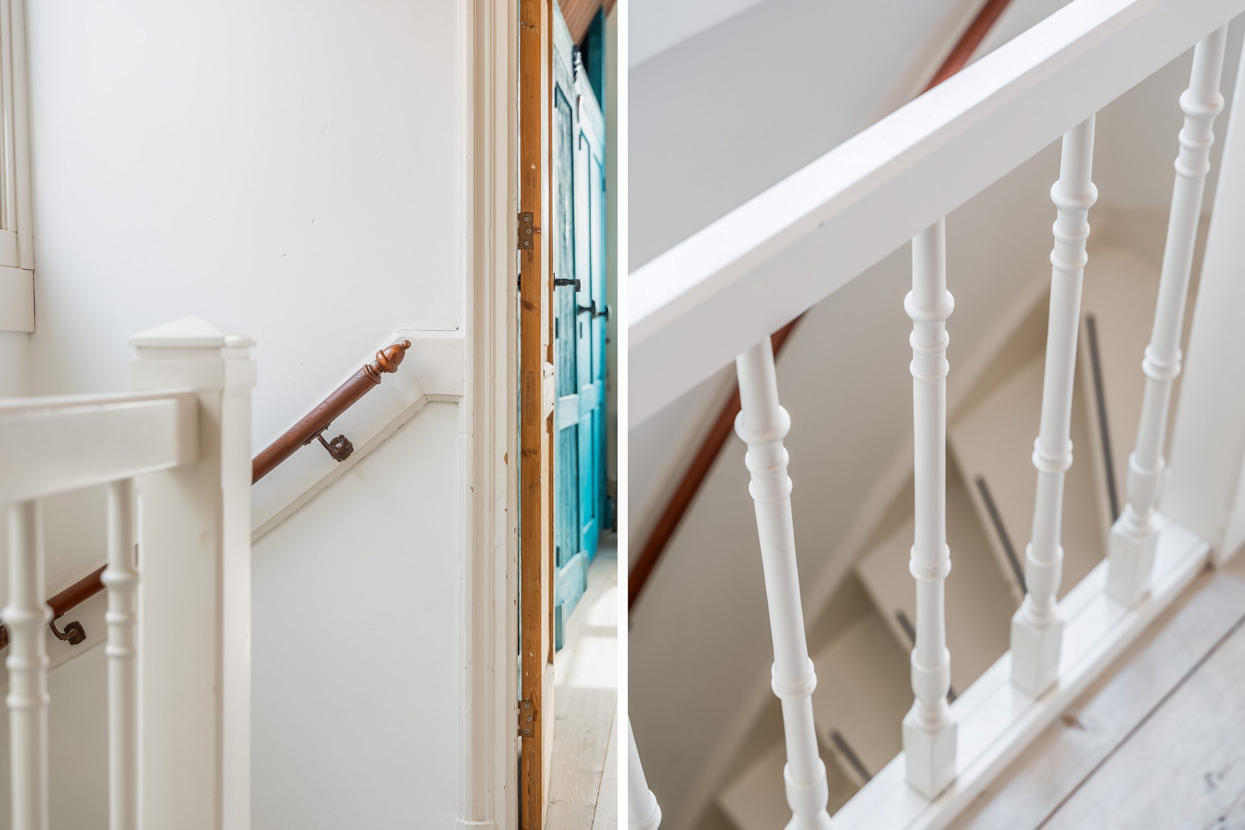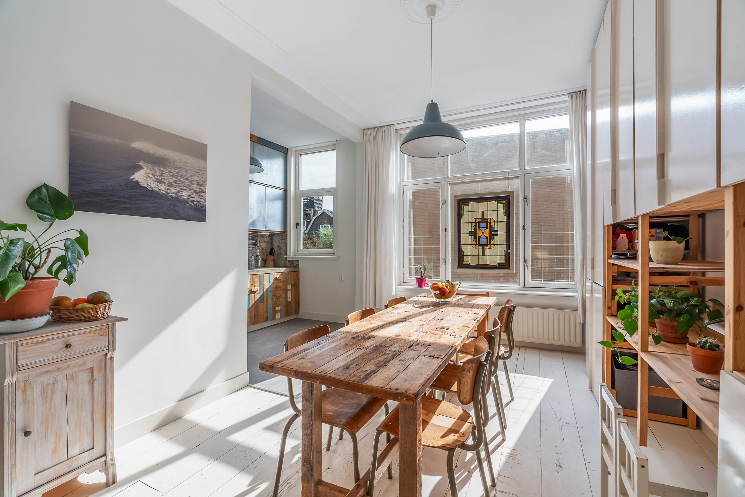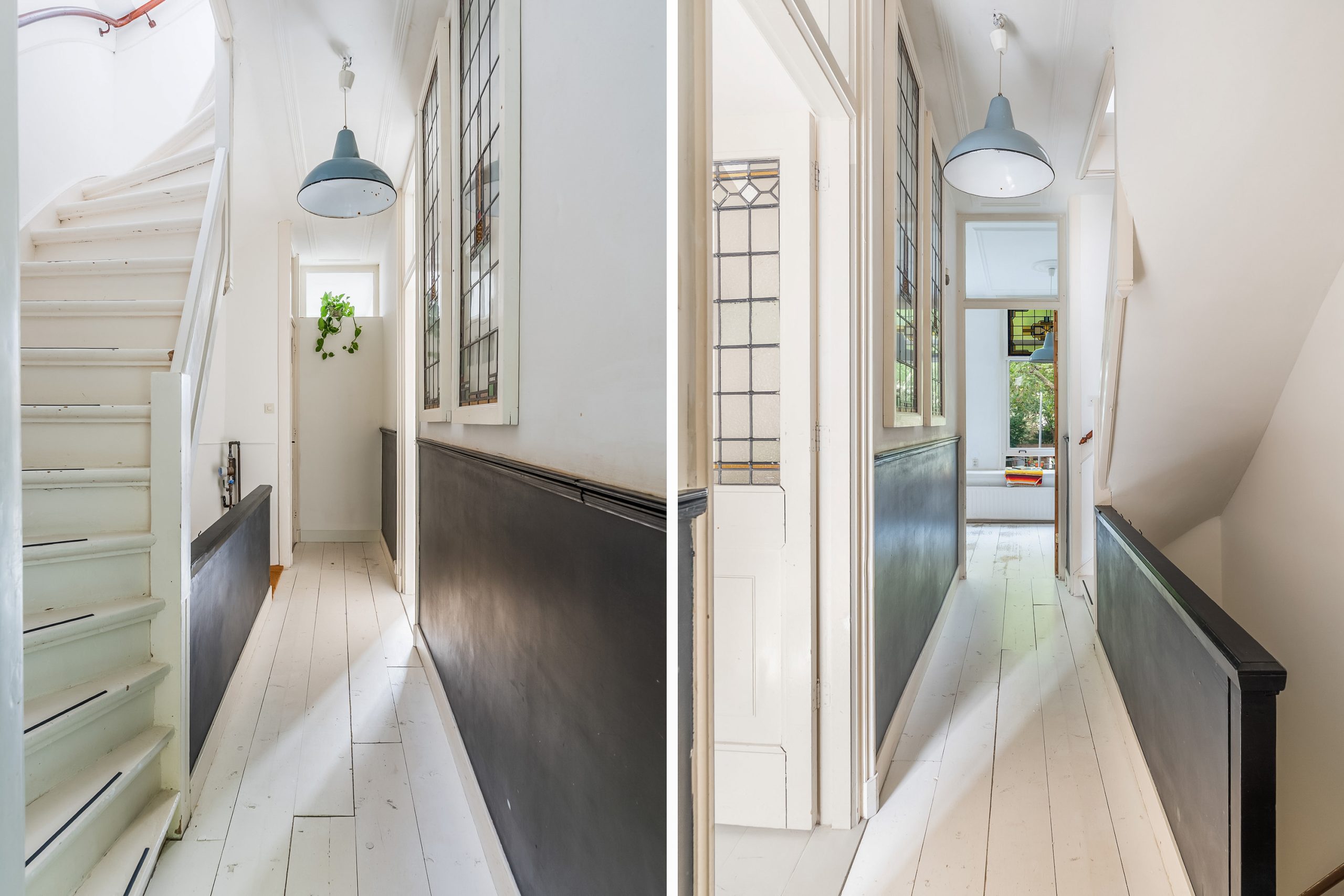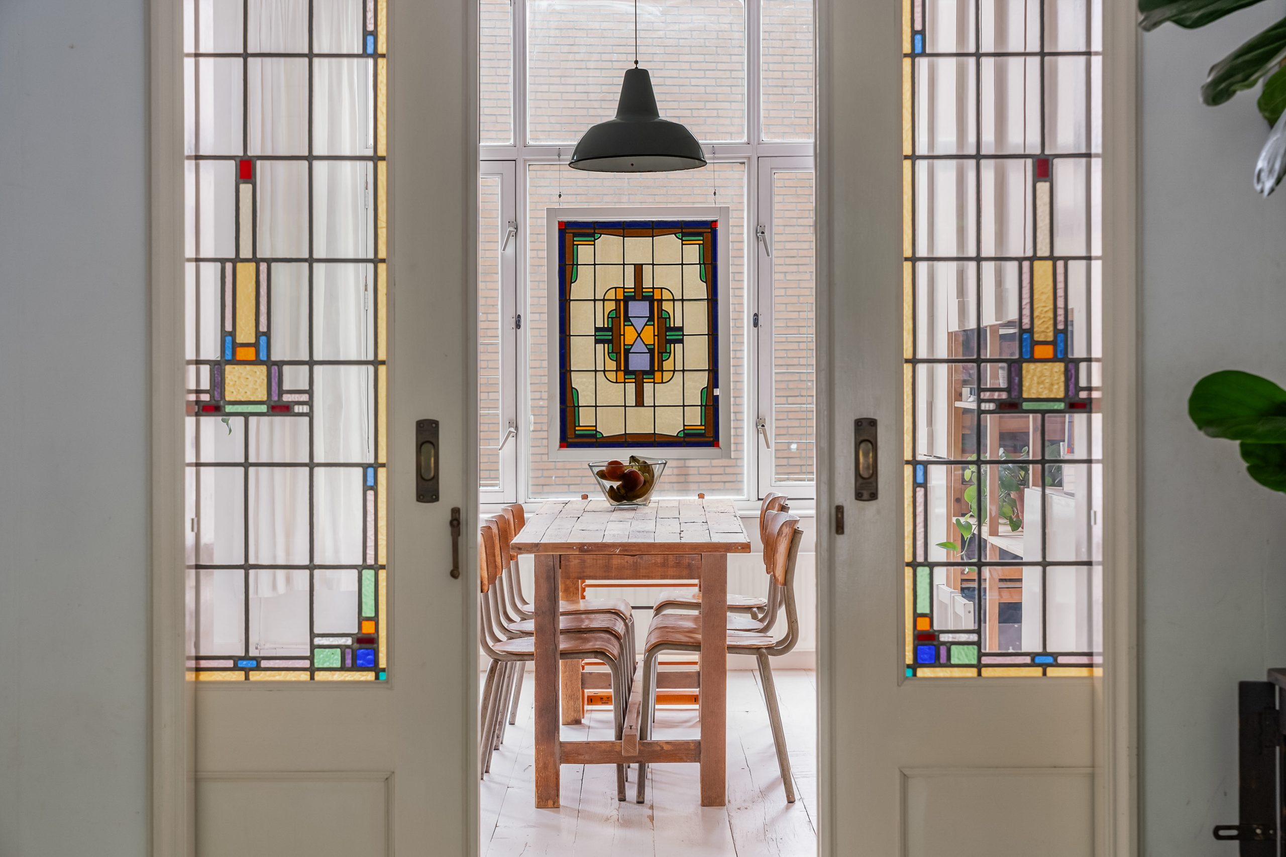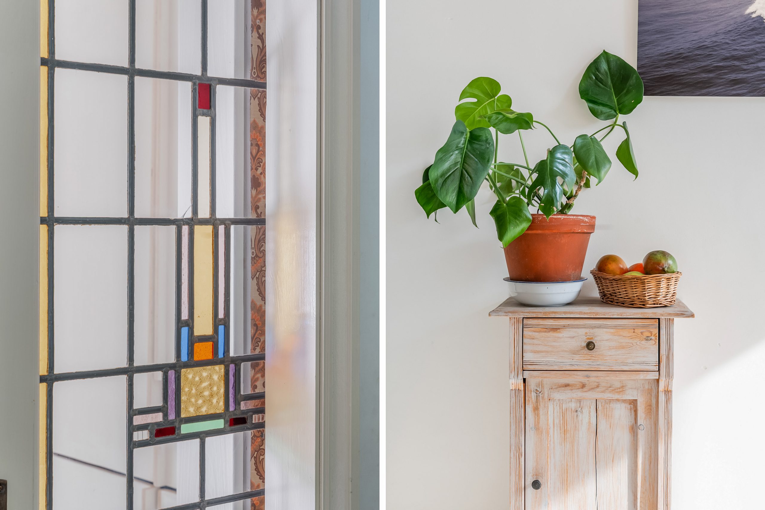 Hier stap je binnen in een ruime en lichte woonkamer en suite met eetkamer. Dankzij de hoge plafonds, glas-in-lood ramen en grote raampartijen valt het daglicht volop naar binnen en straalt de ruimte een authentieke, warme sfeer uit. De open keuken is een echte eyecatcher: landelijk afgewerkt met een stoere bakstenen wand en voorzien van inbouwapparatuur zoals een 4-pits kookplaat en vaatwasser. Daarnaast is er nog genoeg kastruimte en heeft de keuken een mooi beton-look aanrechtblad. Op de overloop bevindt zich een separaat toilet. Via de trap bereik je de tweede verdieping.