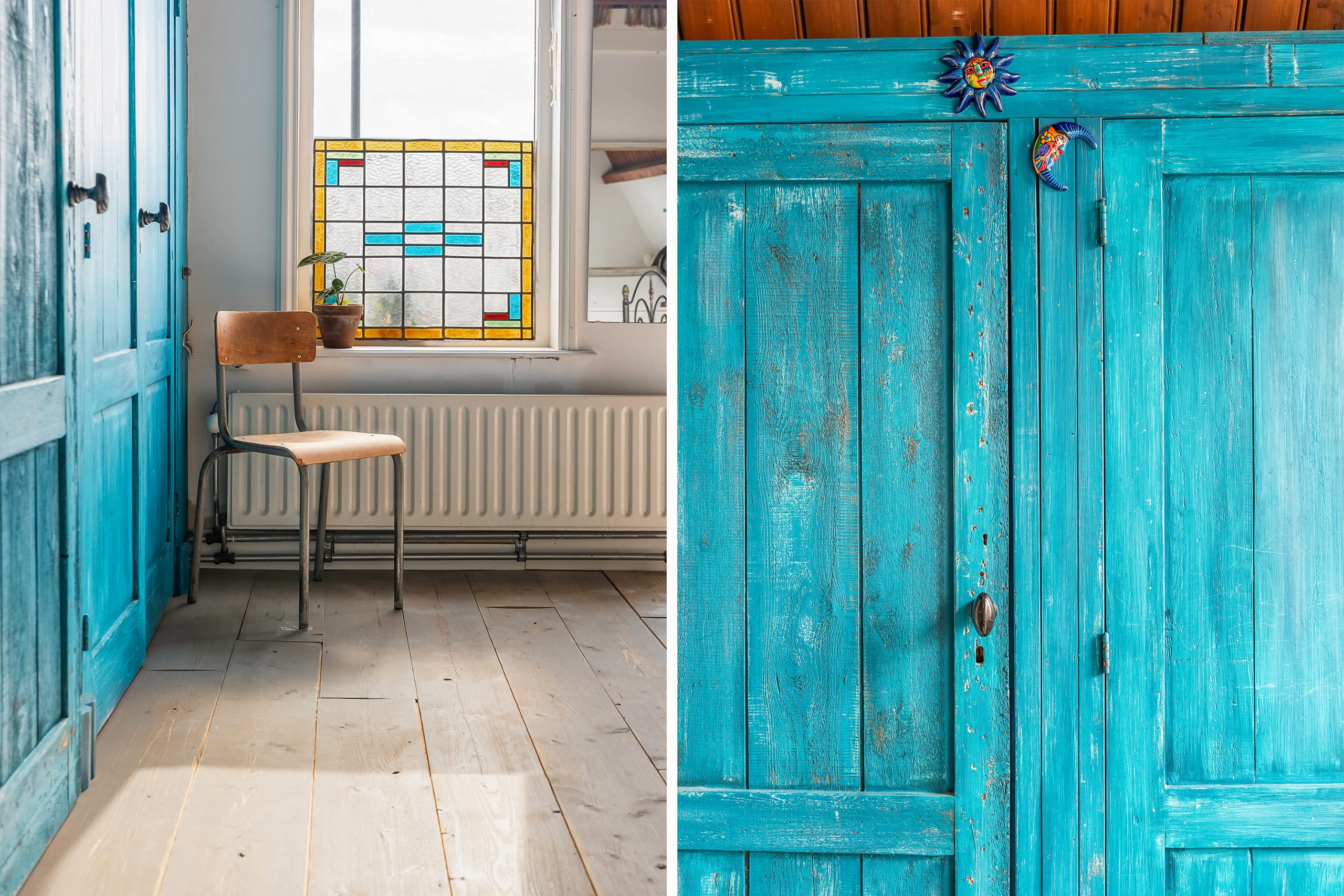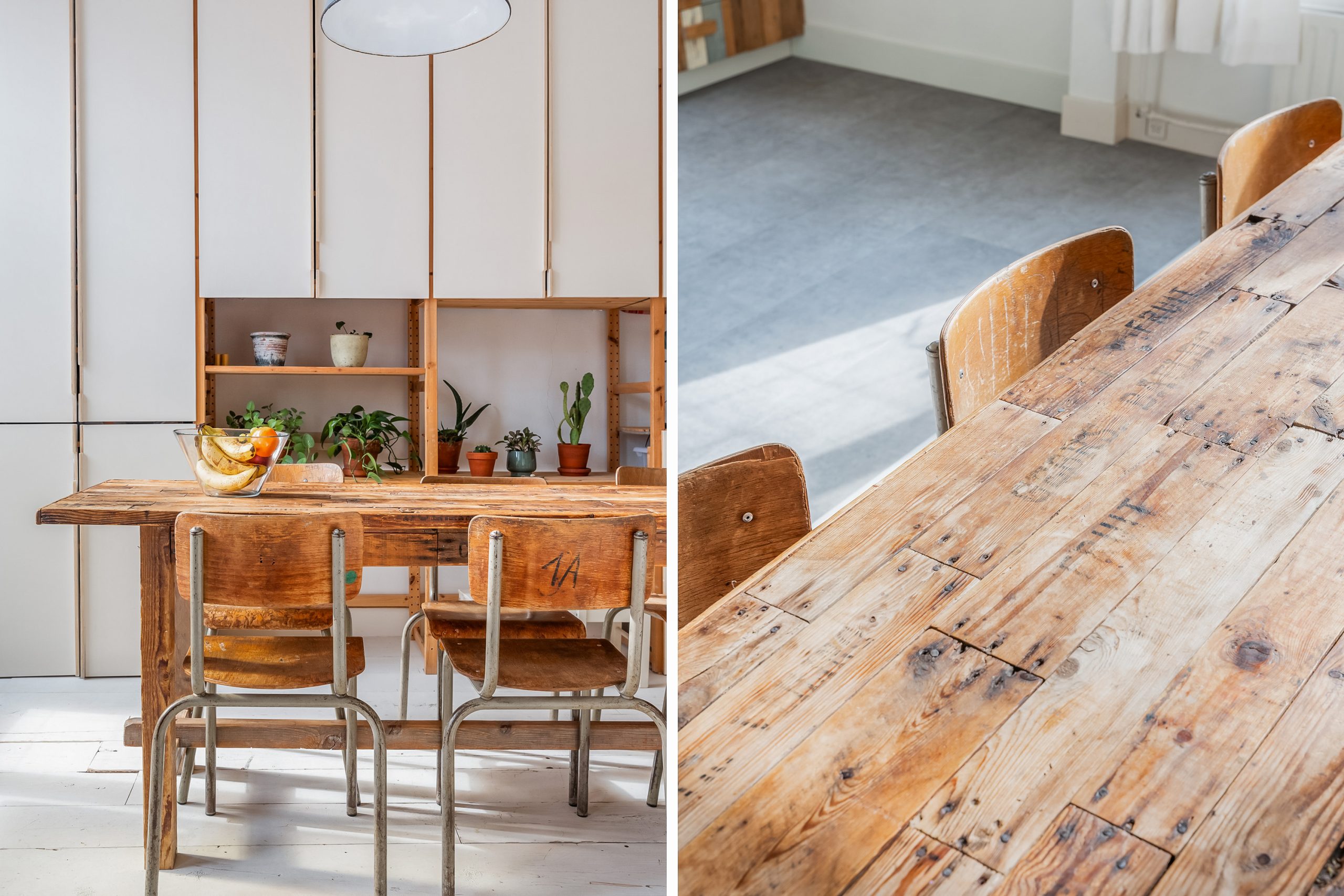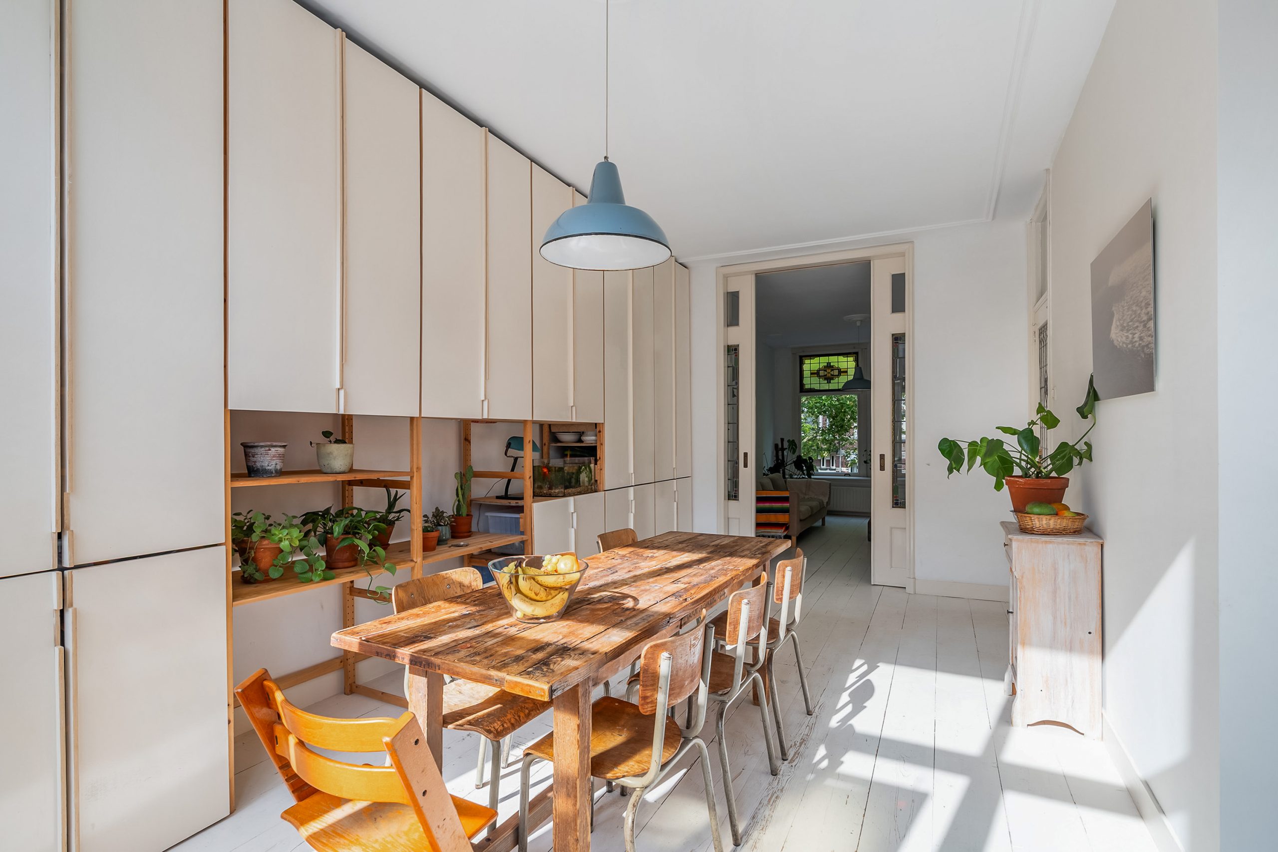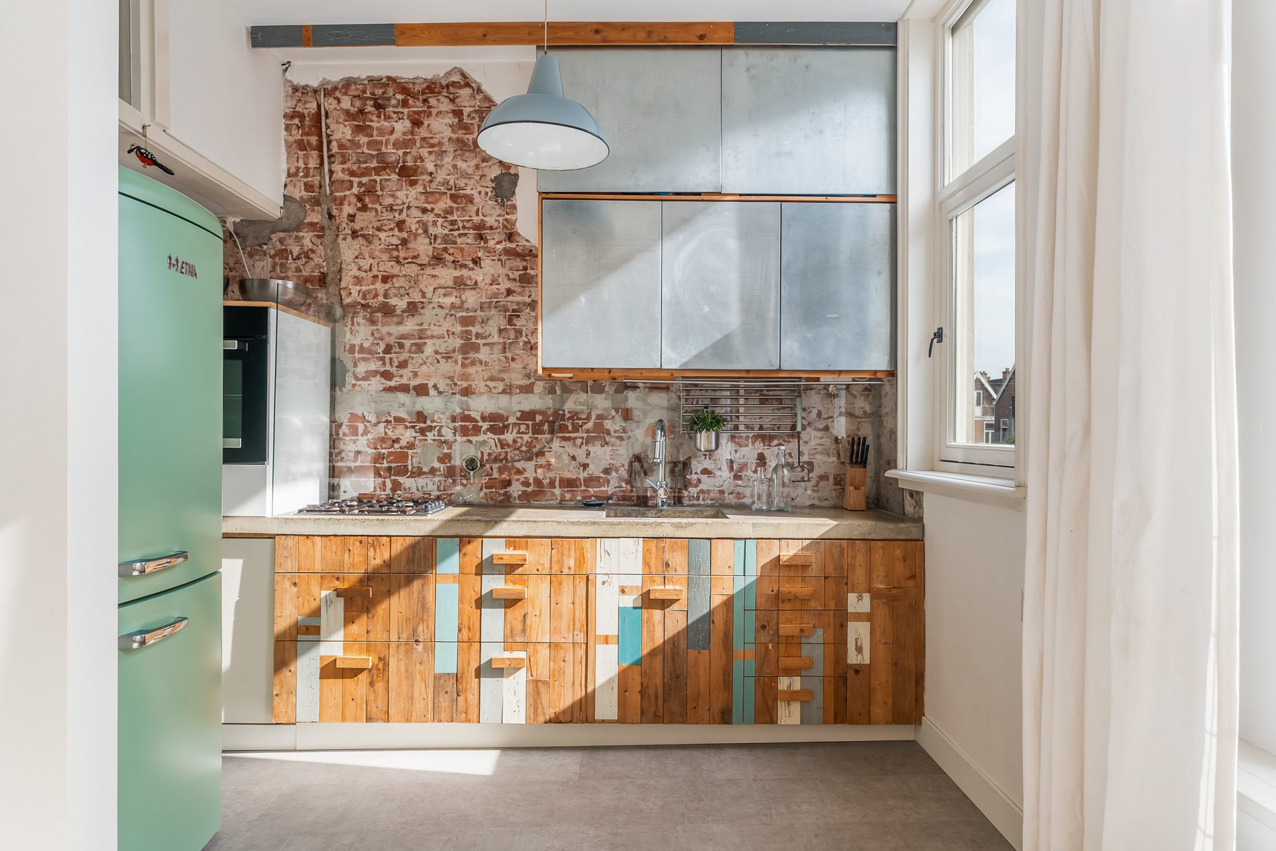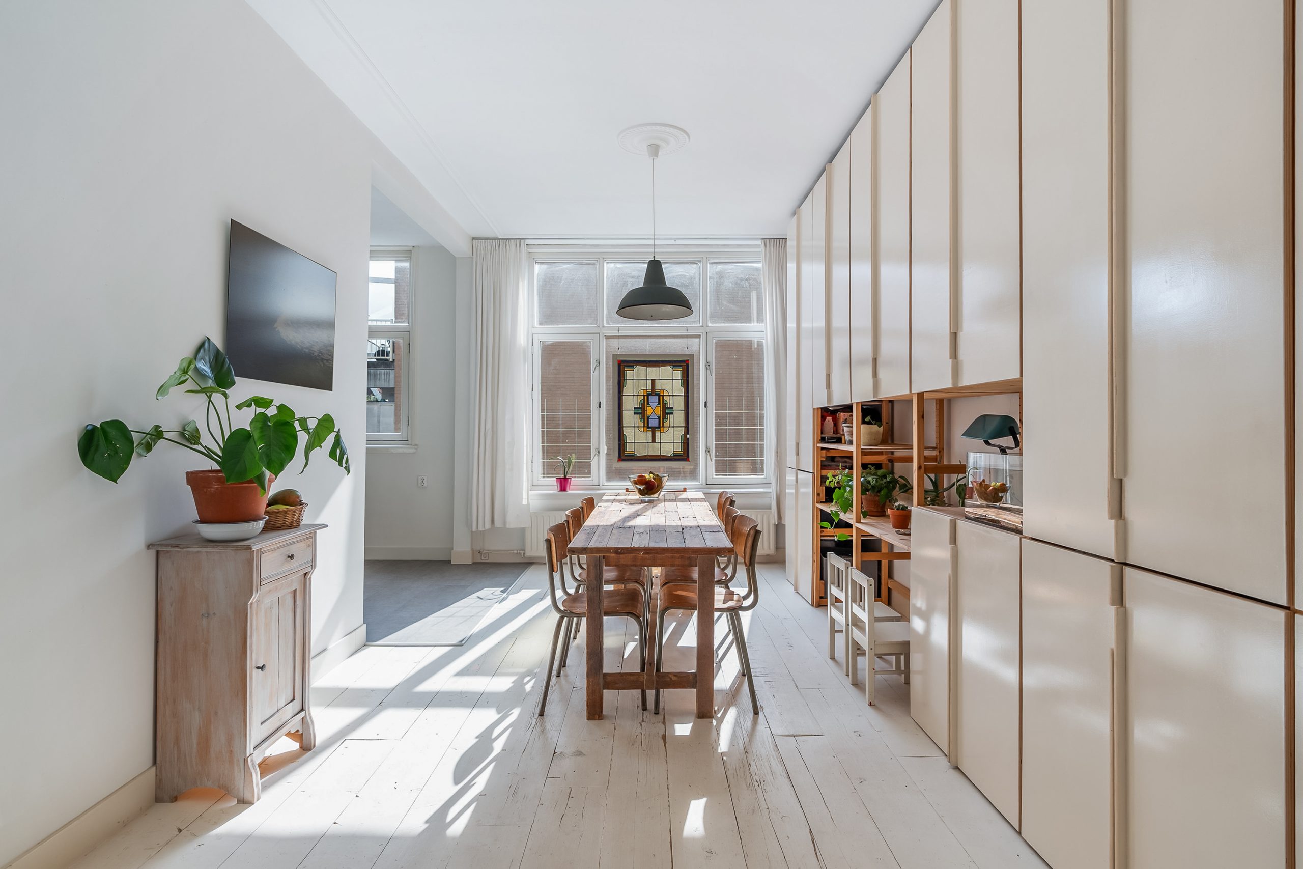 Hier stap je binnen in een ruime en lichte woonkamer en suite met eetkamer. Dankzij de hoge plafonds, glas-in-lood ramen en grote raampartijen valt het daglicht volop naar binnen en straalt de ruimte een authentieke, warme sfeer uit. De open keuken is een echte eyecatcher: landelijk afgewerkt met een stoere bakstenen wand en voorzien van inbouwapparatuur zoals een 4-pits kookplaat en vaatwasser. Daarnaast is er nog genoeg kastruimte en heeft de keuken een mooi beton-look aanrechtblad. Op de overloop bevindt zich een separaat toilet. Via de trap bereik je de tweede verdieping.