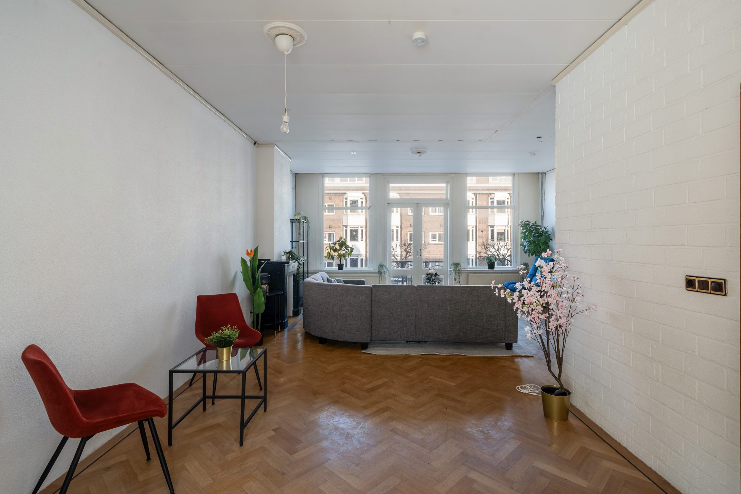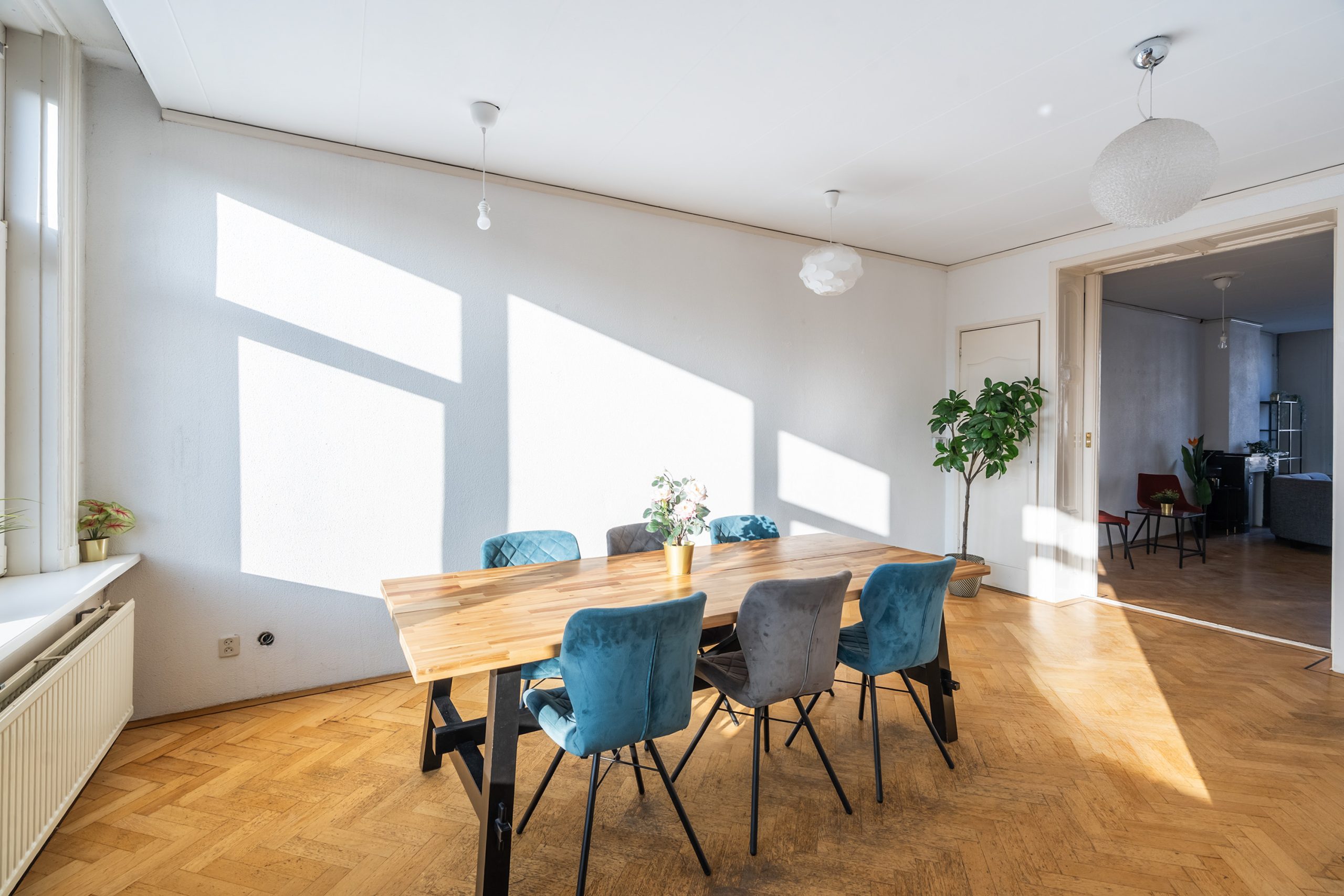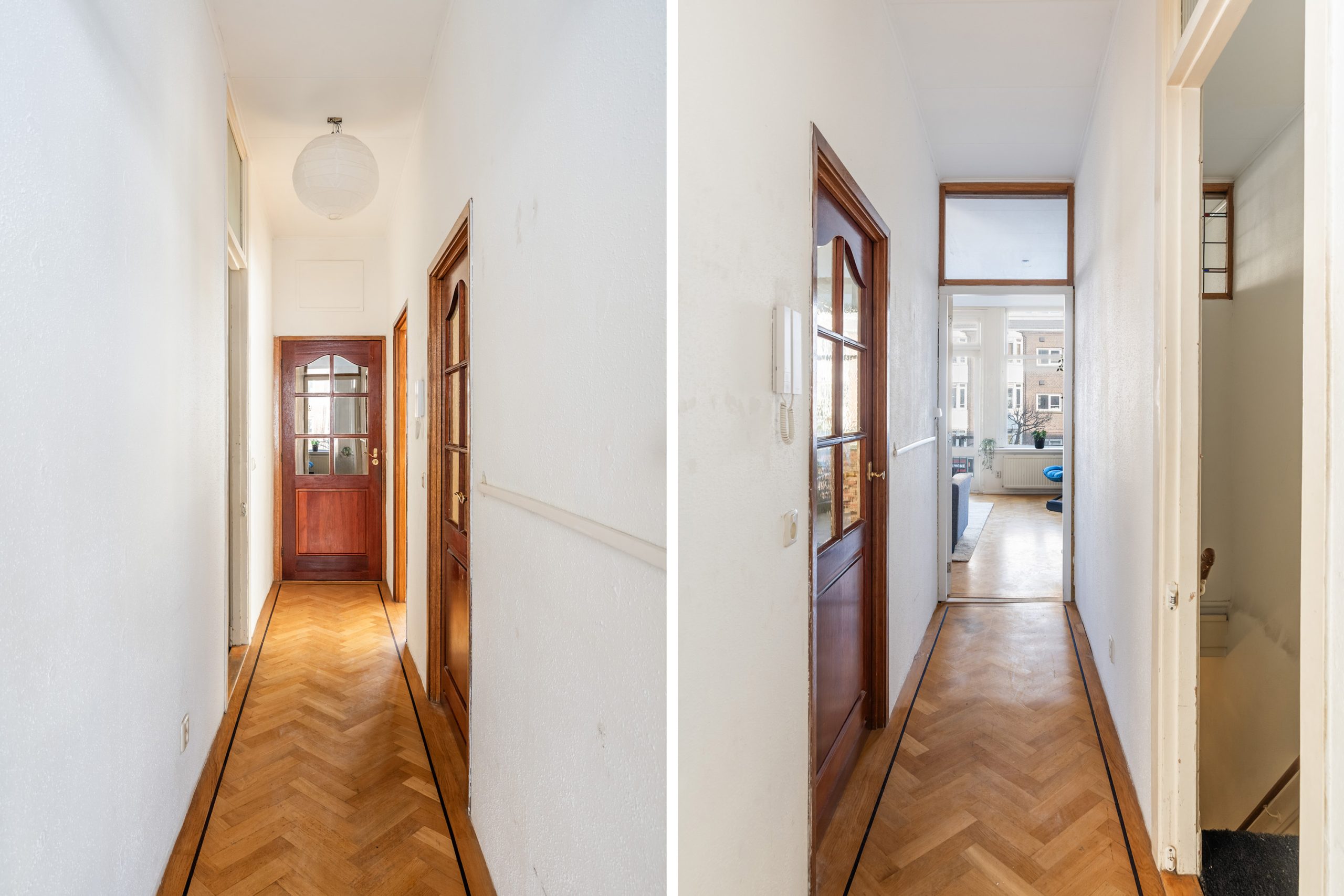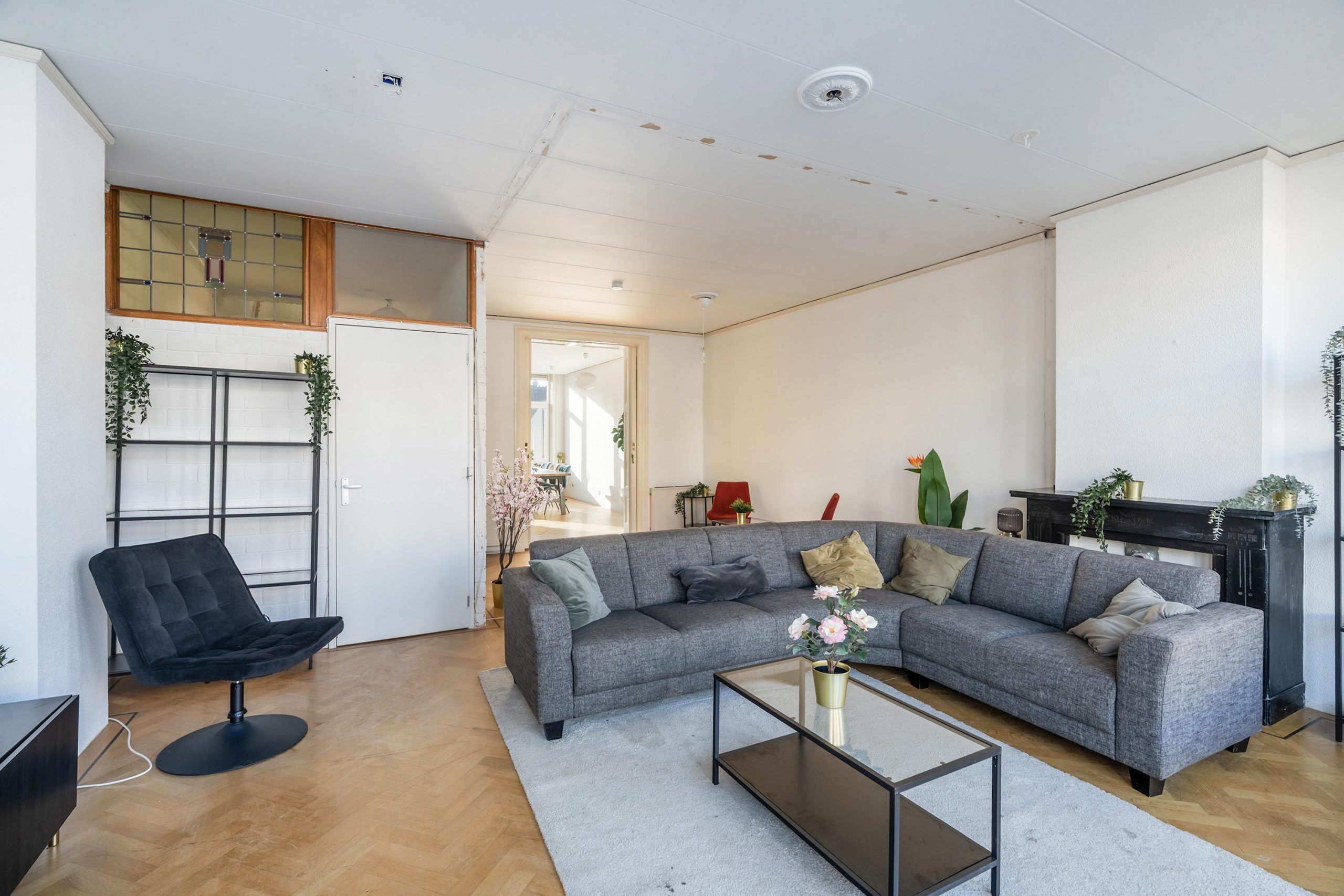 Bij binnenkomst op de eerste verdieping valt direct de enorme hoeveelheid ruimte op. De riante woonkamer strekt zich uit over de volledige breedte van de woning en wordt prachtig verlicht door de hoge ramen en het dubbele openslaande deurstel naar het balkon. De houten vloer in visgraatpatroon geeft de ruimte een warme en klassieke uitstraling.