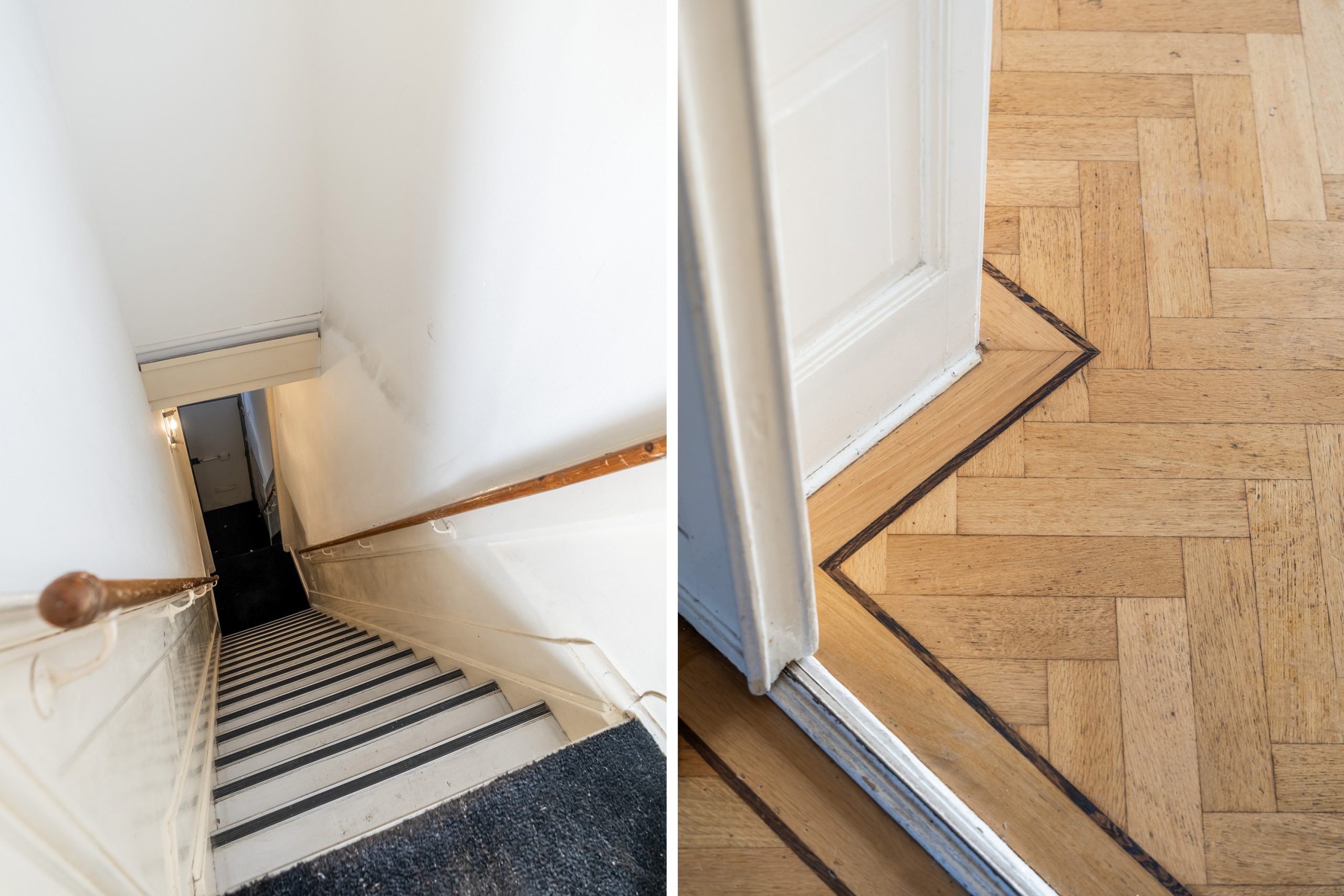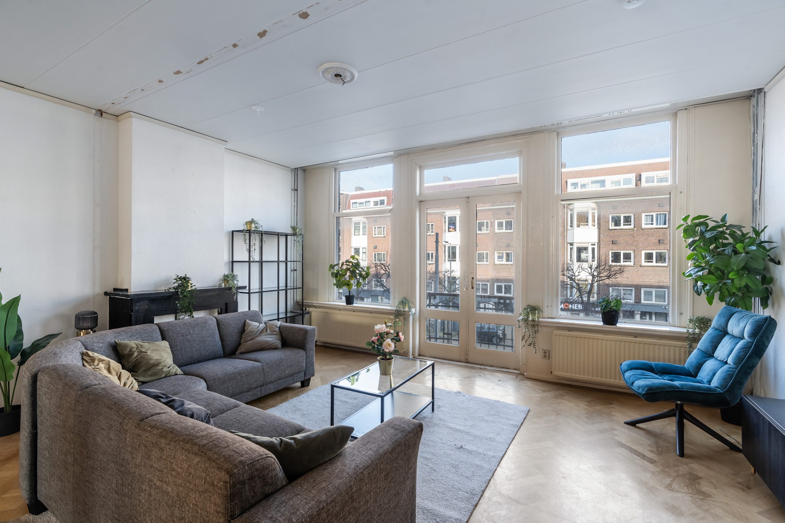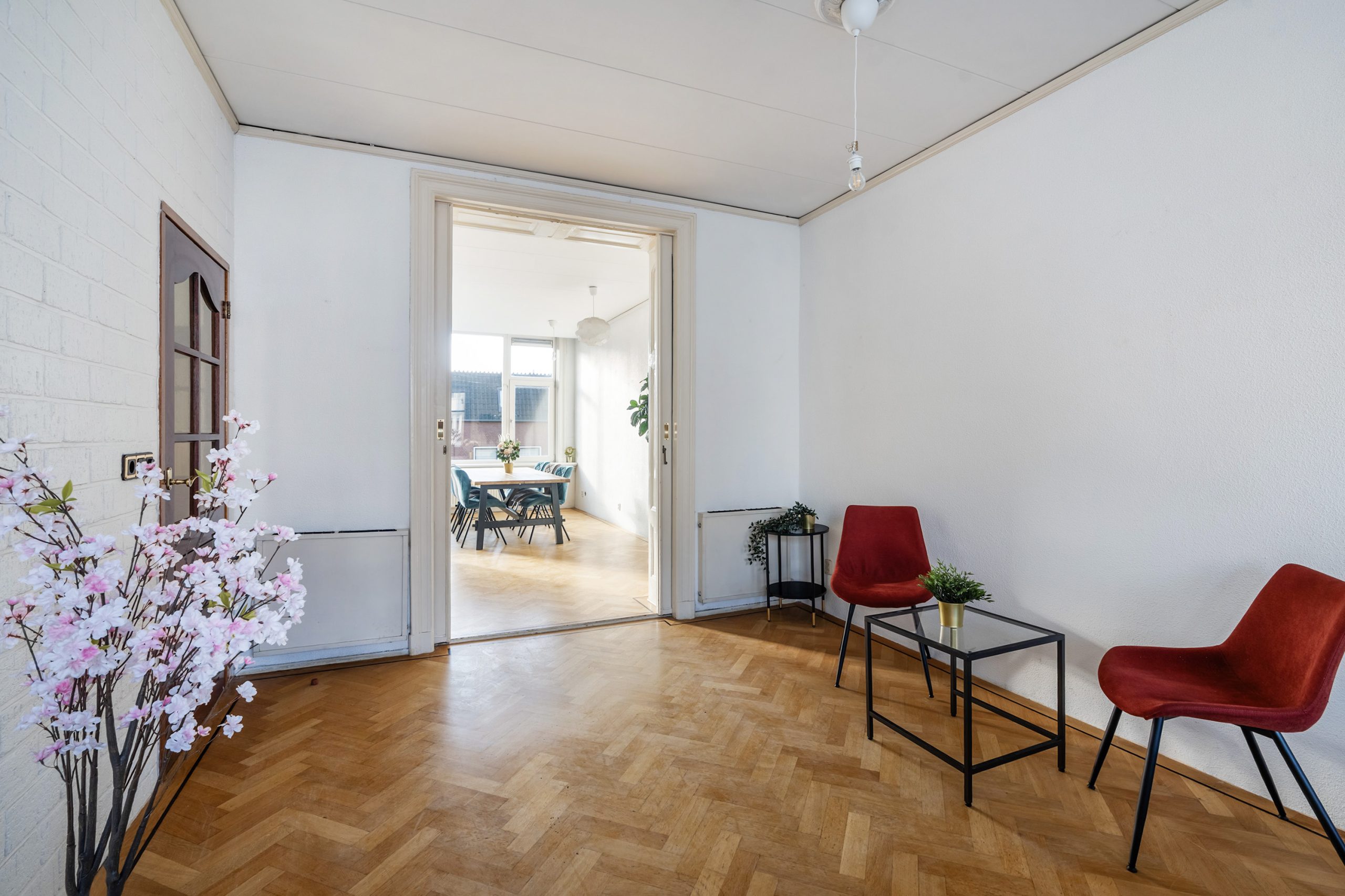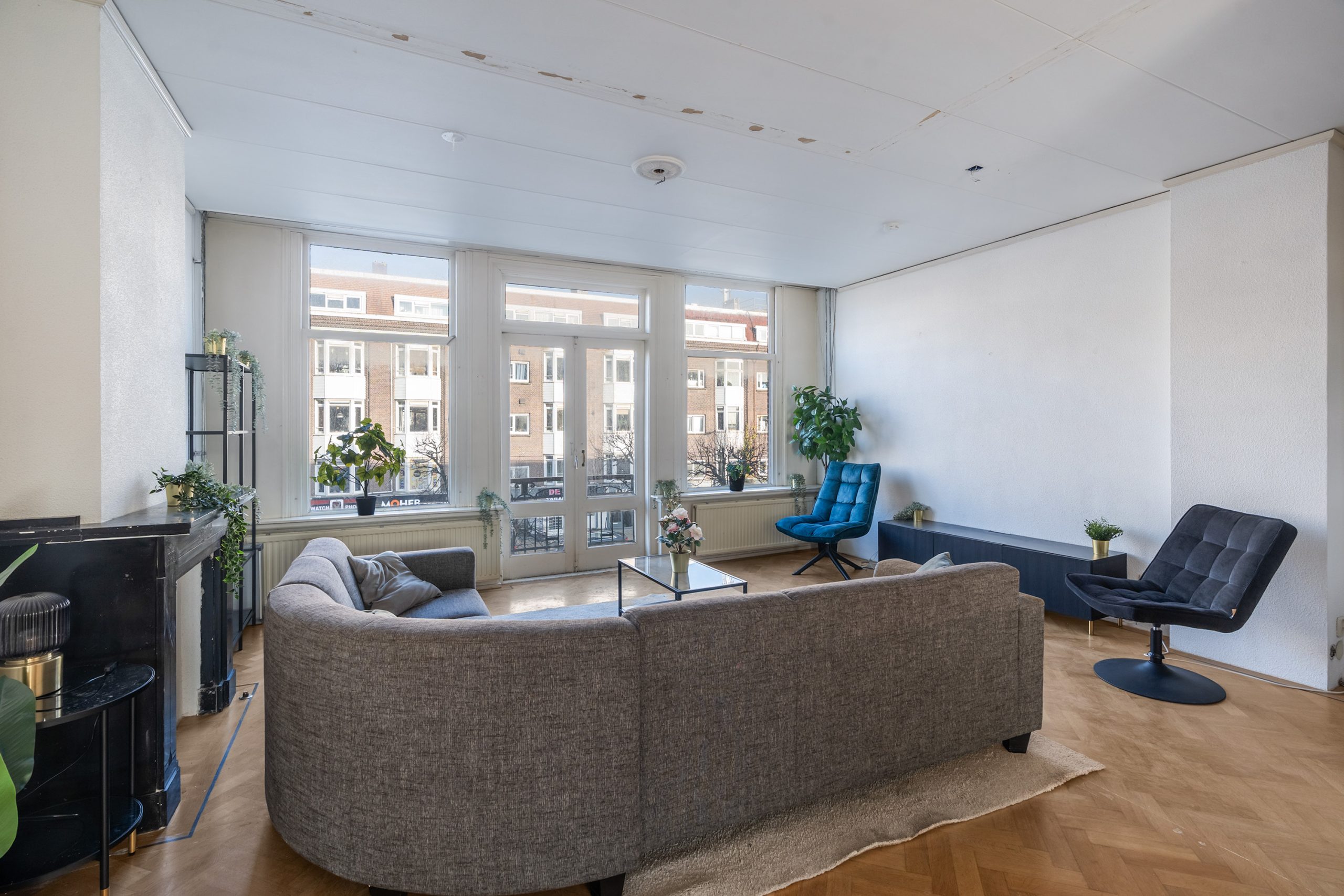 Bij binnenkomst op de eerste verdieping valt direct de enorme hoeveelheid ruimte op. De riante woonkamer strekt zich uit over de volledige breedte van de woning en wordt prachtig verlicht door de hoge ramen en het dubbele openslaande deurstel naar het balkon. De houten vloer in visgraatpatroon geeft de ruimte een warme en klassieke uitstraling.