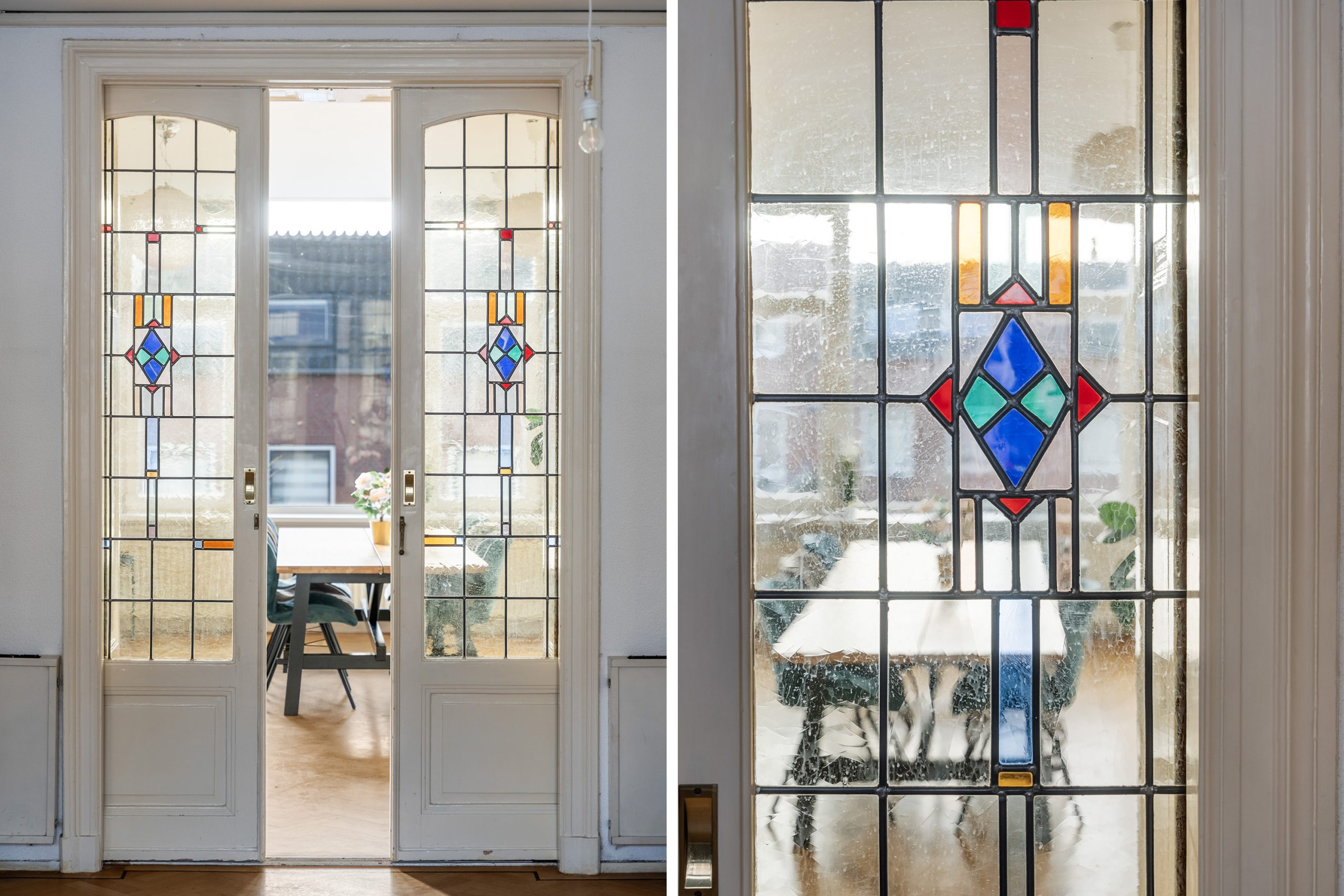 Aan de achterzijde ligt de eetkamer, die via karaktervolle en suite deuren met glas in lood is verbonden met de woonkamer. Deze authentieke details brengen direct de charme van het bouwjaar tot leven. De half open keuken is voorzien van diverse inbouwapparatuur.
