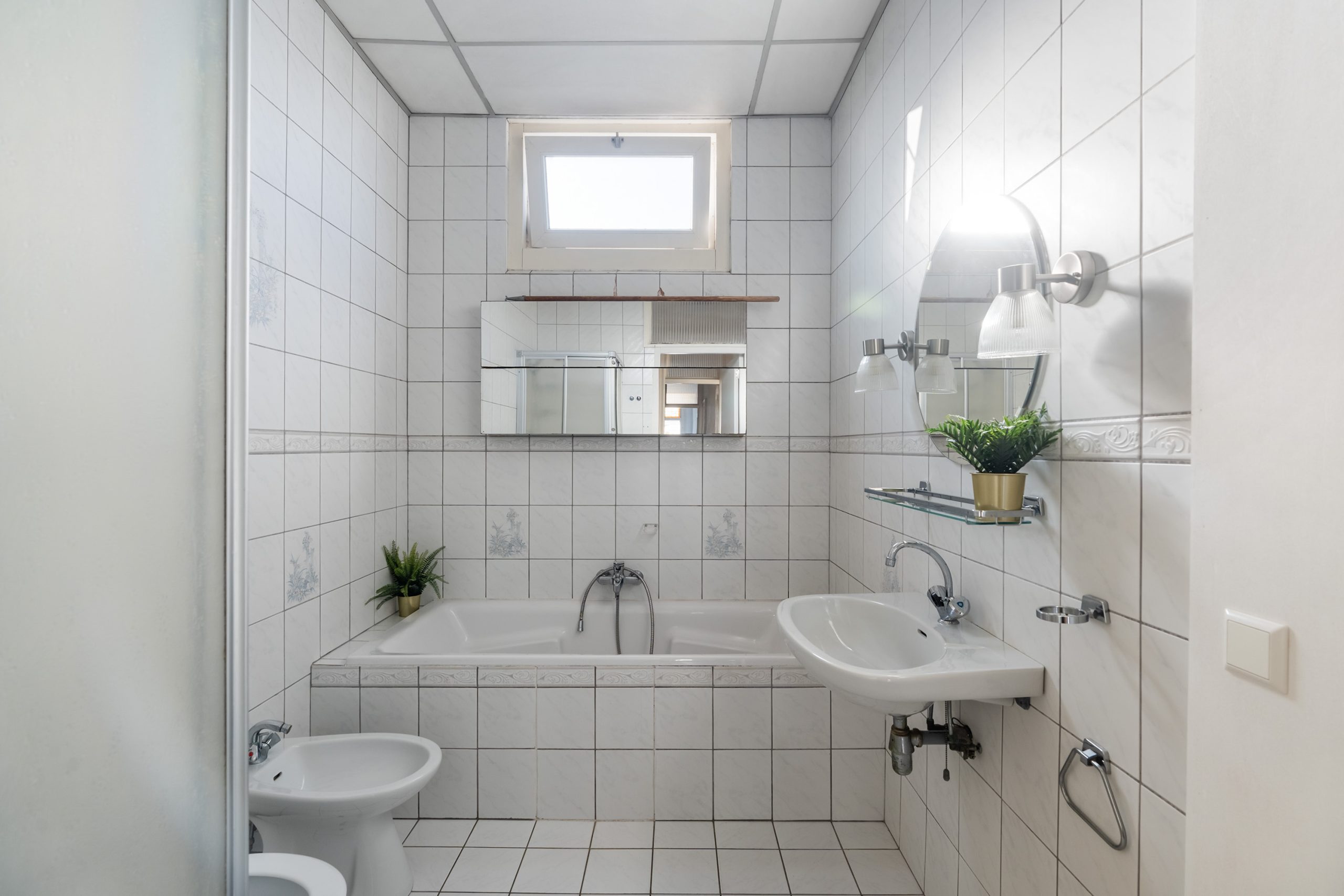 De badkamer is voorzien van een ligbad, douche, wastafel en toilet en bidet.