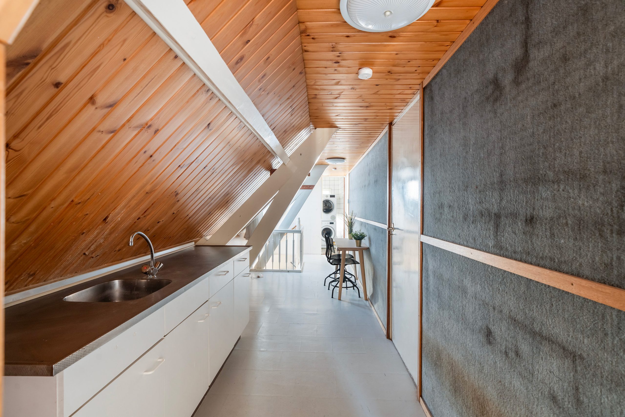 De overloop verbindt alle ruimtes en geeft toegang tot een compacte maar functionele wasruimte en het toilet. Het keukenblok kan je inrichten als pantry waardoor je niet iedere keer naar beneden hoeft voor een hapje en een drankje als je lekker op je balkon zit.