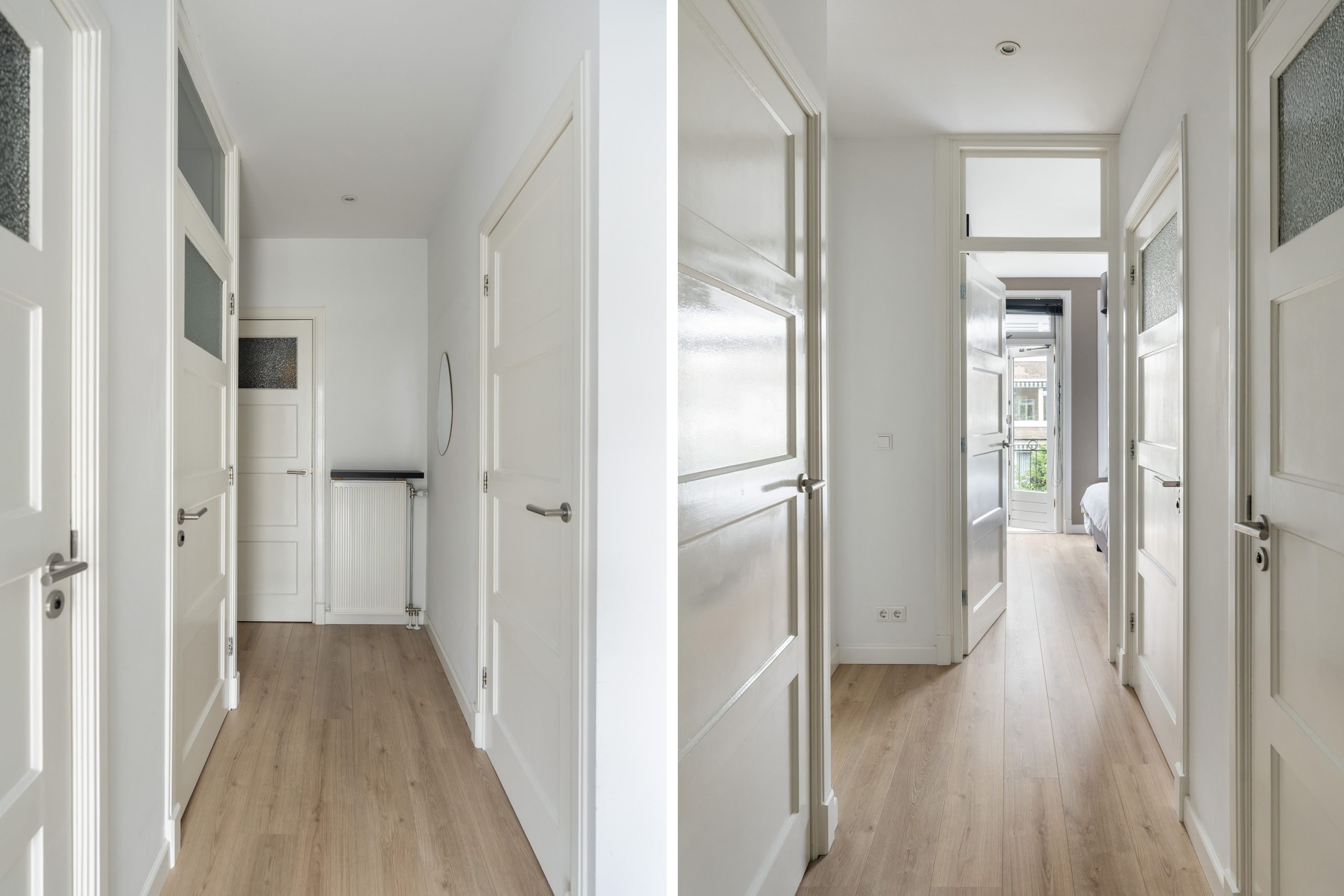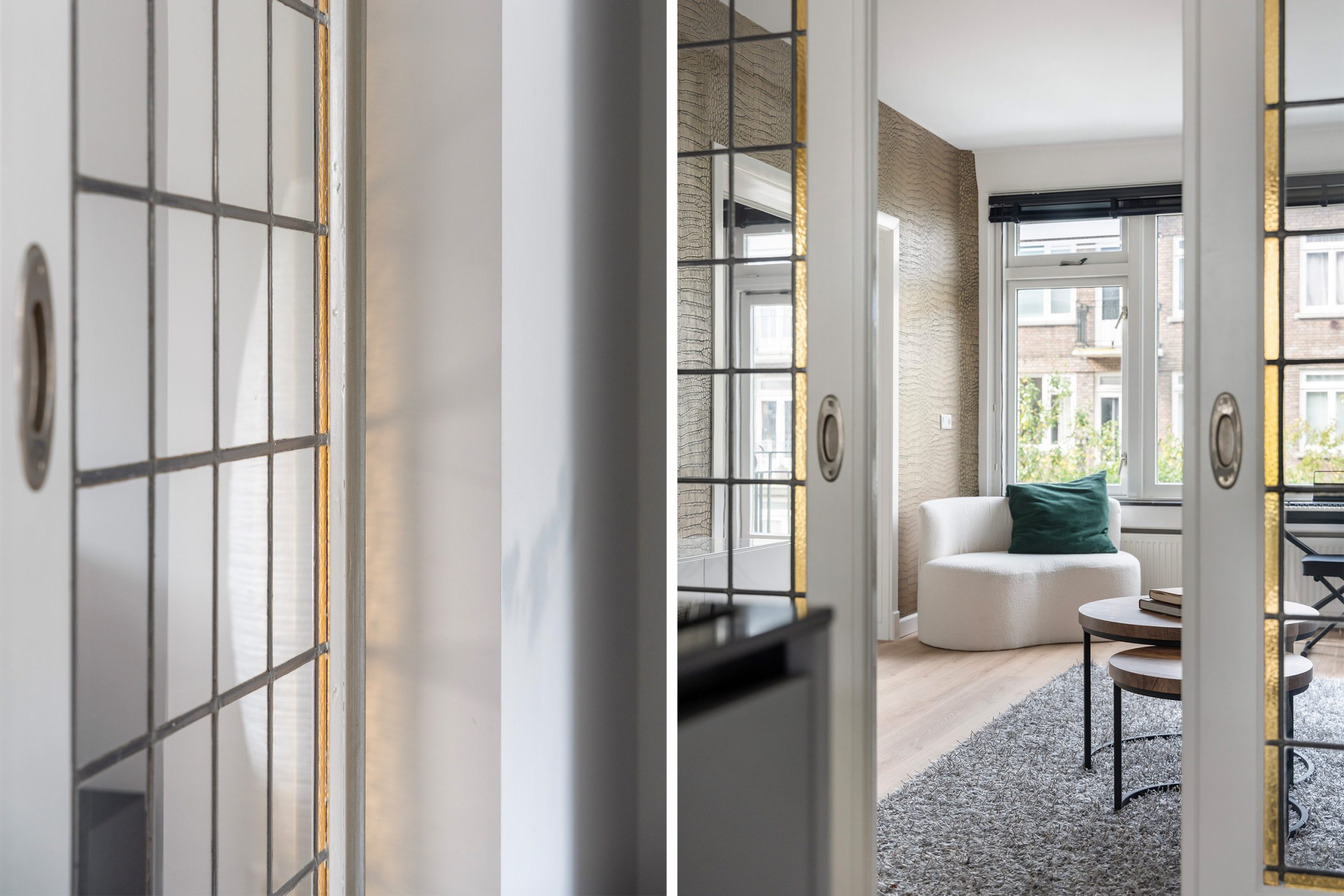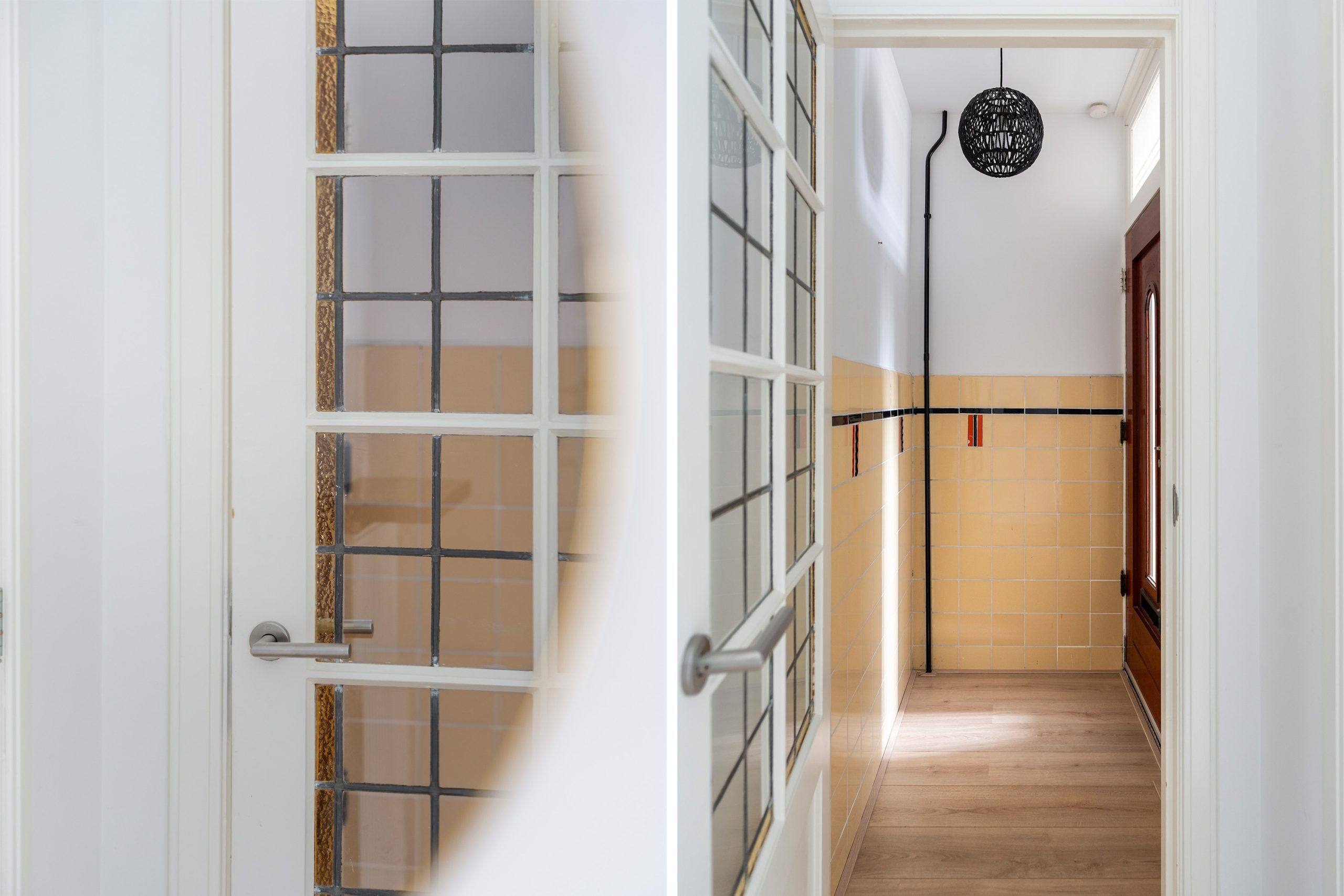 Je stapt binnen in een lichte hal met toegang tot alle vertrekken. De ruime woonkamer strekt zich uit over de voorzijde en straalt direct sfeer uit dankzij de originele en suite deuren met glas-in-lood, die leiden naar de werkkamer. Een ideale plek voor een thuiskantoor of kinderkamer. Vanuit de deze kamer stap je het balkon op, waar je heerlijk van de middagzon kunt genieten.