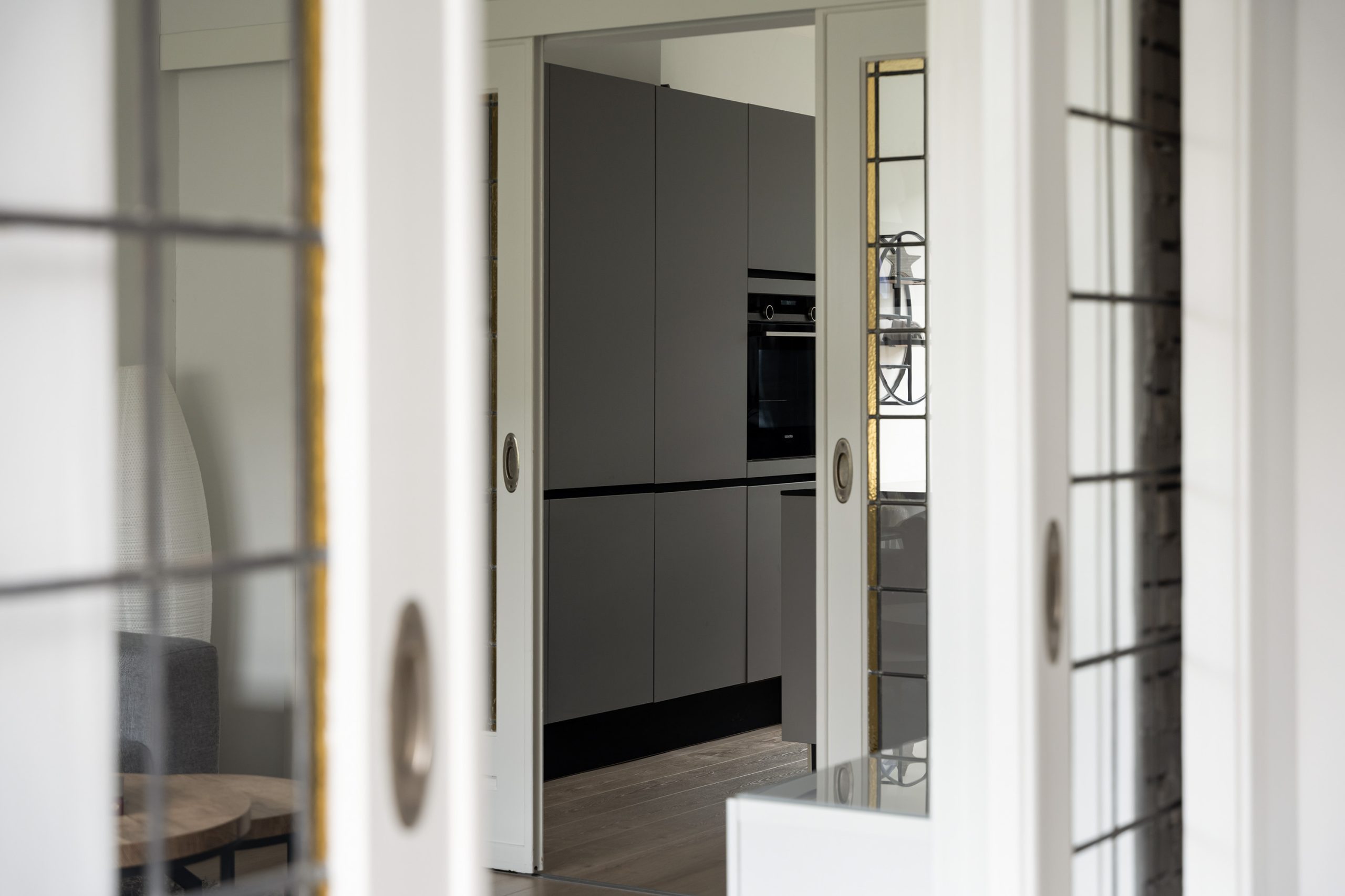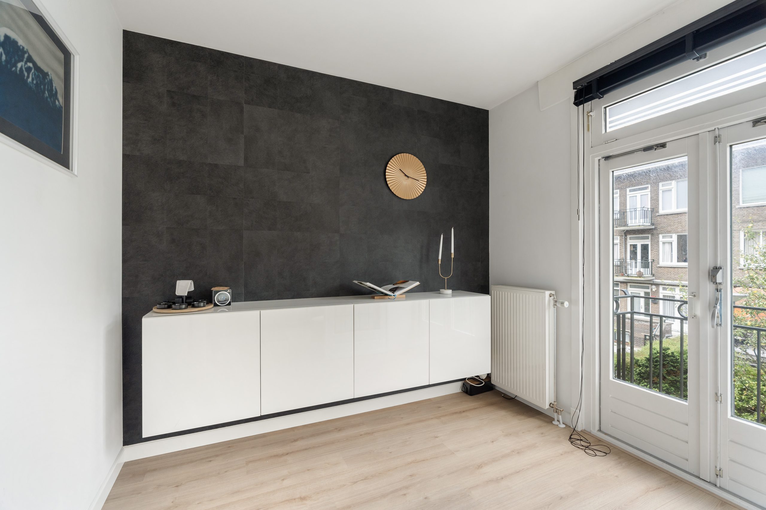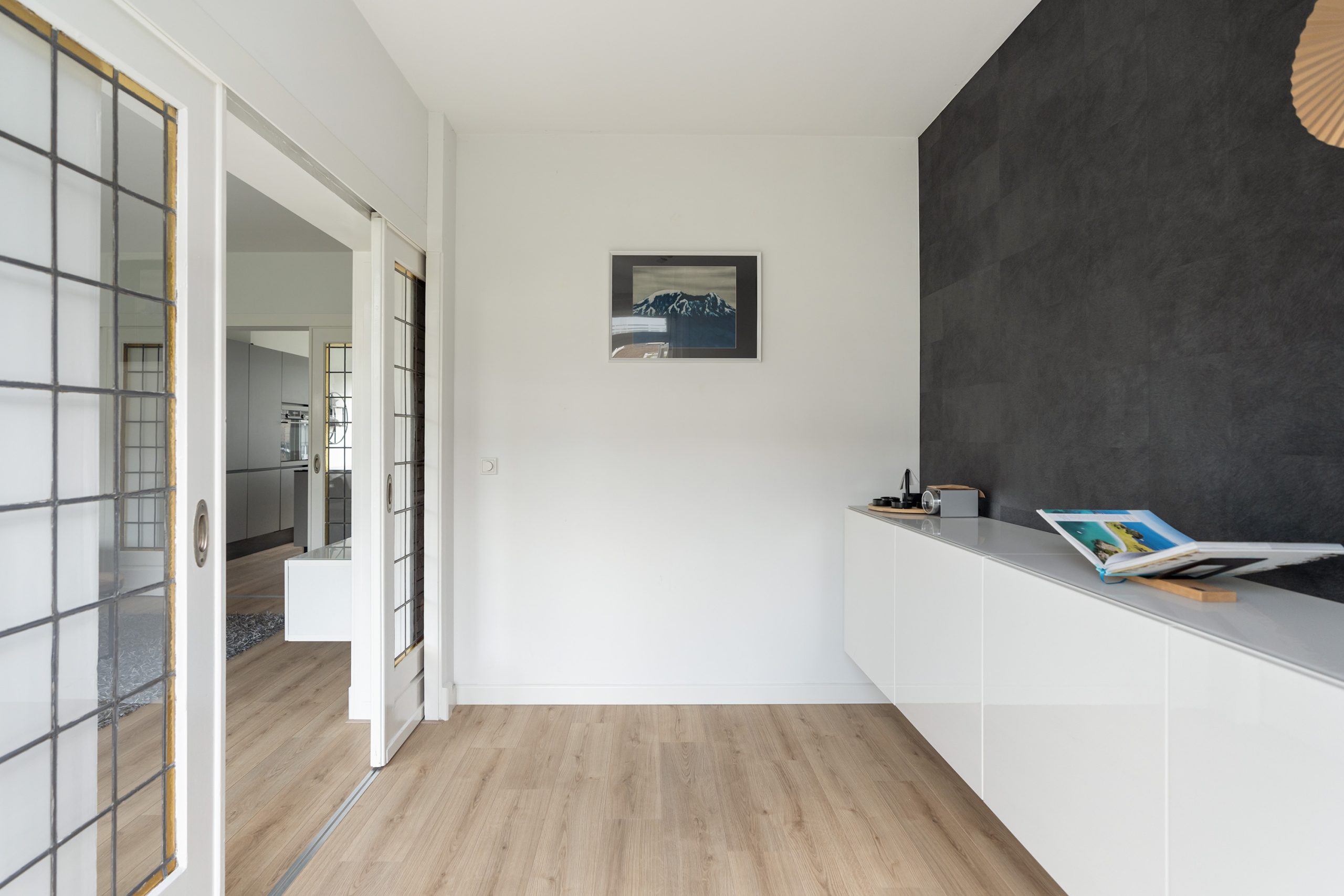Je stapt binnen in een lichte hal met toegang tot alle vertrekken. De ruime woonkamer strekt zich uit over de voorzijde en straalt direct sfeer uit dankzij de originele en suite deuren met glas-in-lood, die leiden naar de werkkamer. Een ideale plek voor een thuiskantoor of kinderkamer. Vanuit de deze kamer stap je het balkon op, waar je heerlijk van de middagzon kunt genieten.
