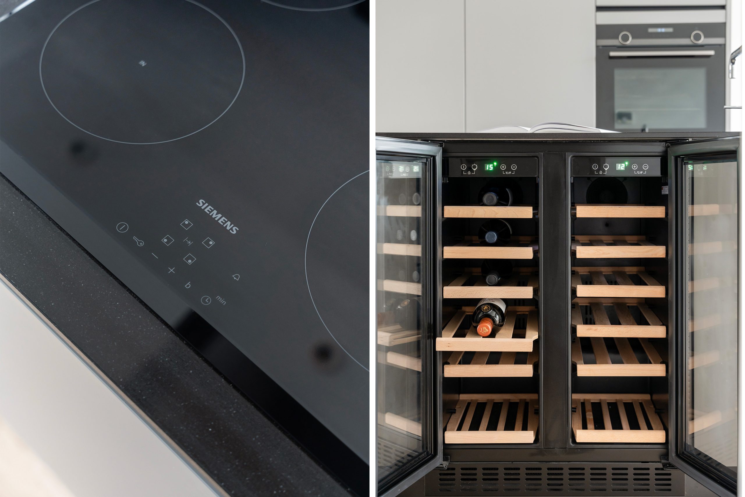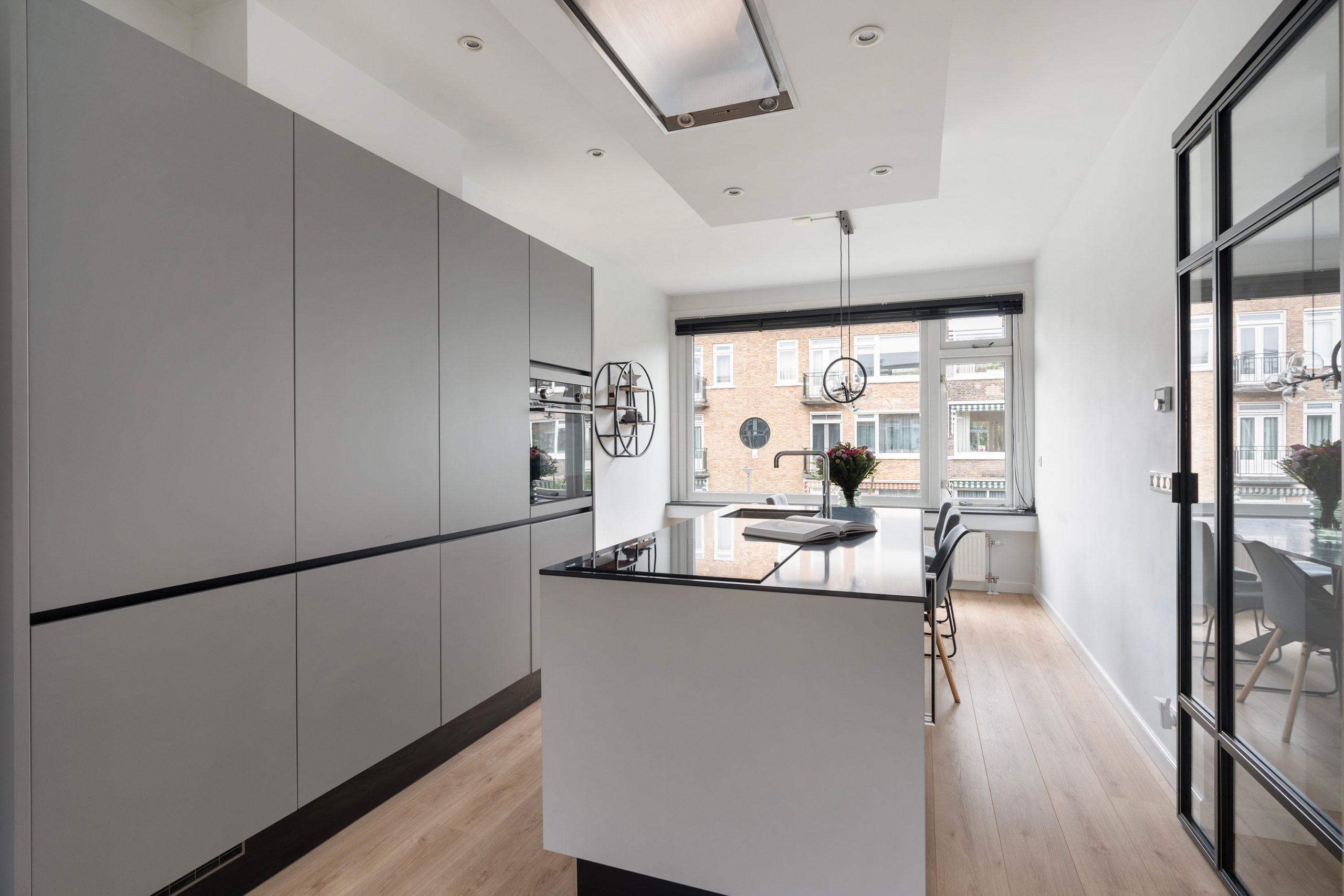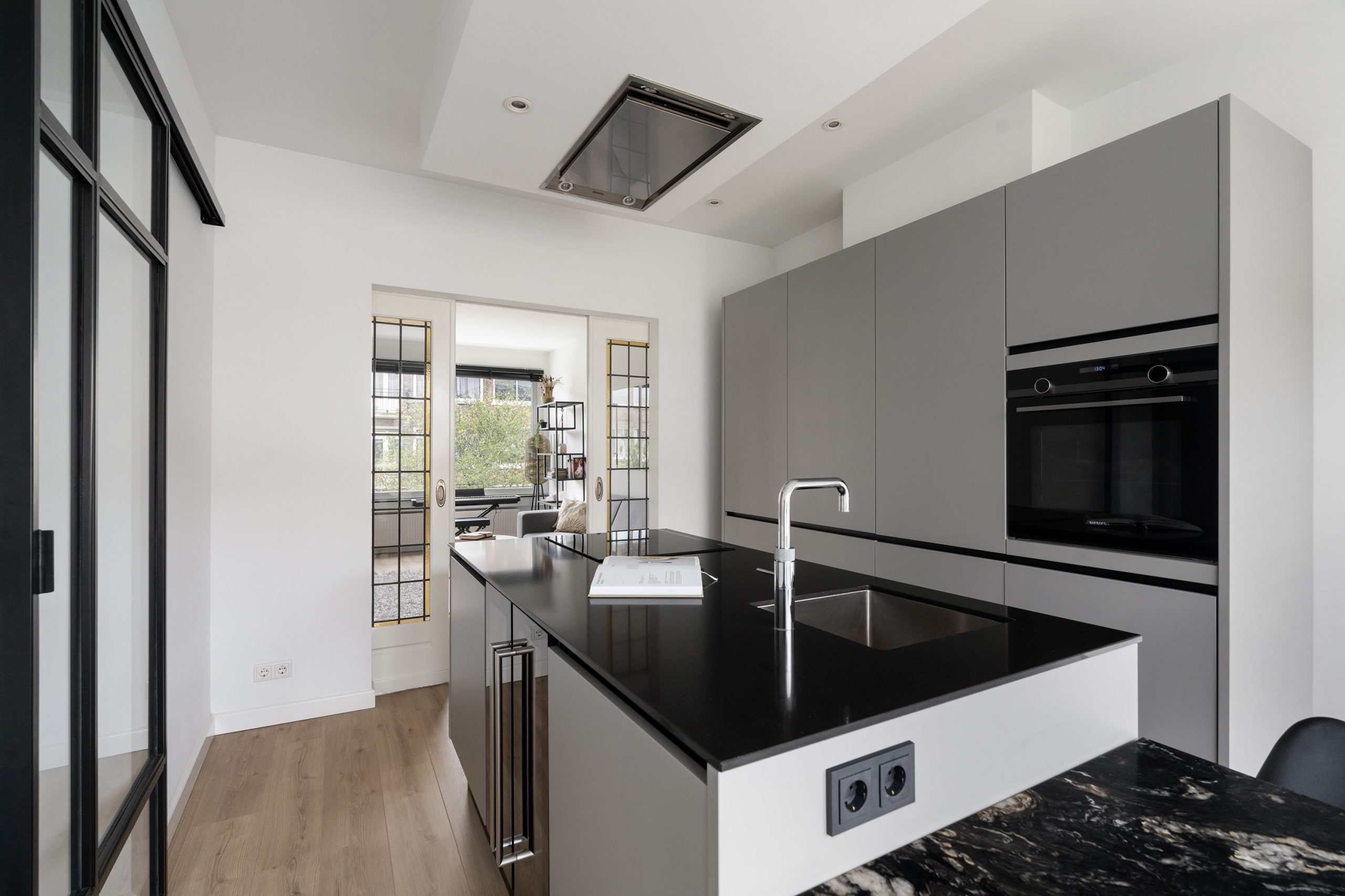 Aan de achterzijde bevindt zich de moderne open keuken, een echte eyecatcher, voorzien van een kookeiland, strakke zwarte fronten, inductiekookplaat, diverse inbouwapparatuur en zelfs een wijnklimaatkast.