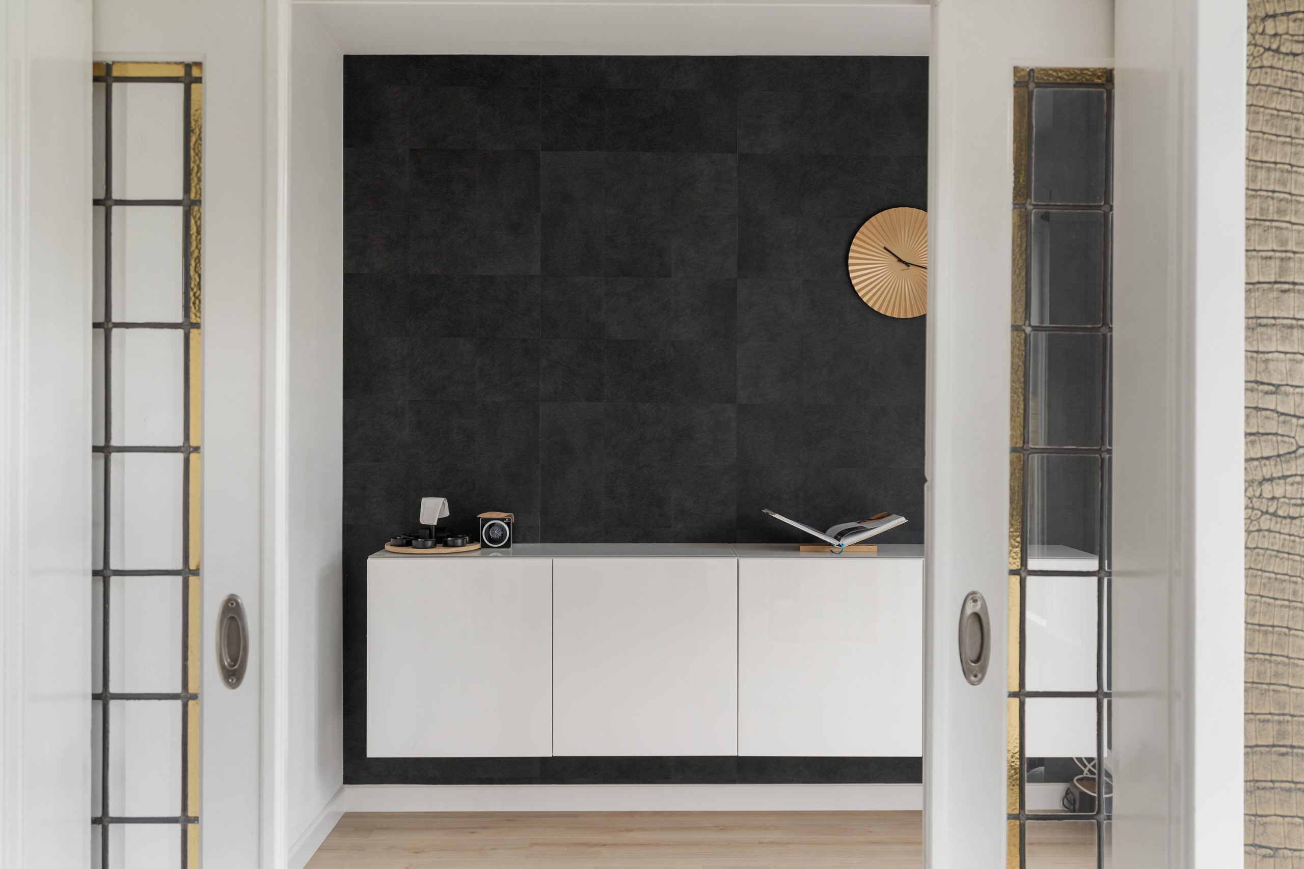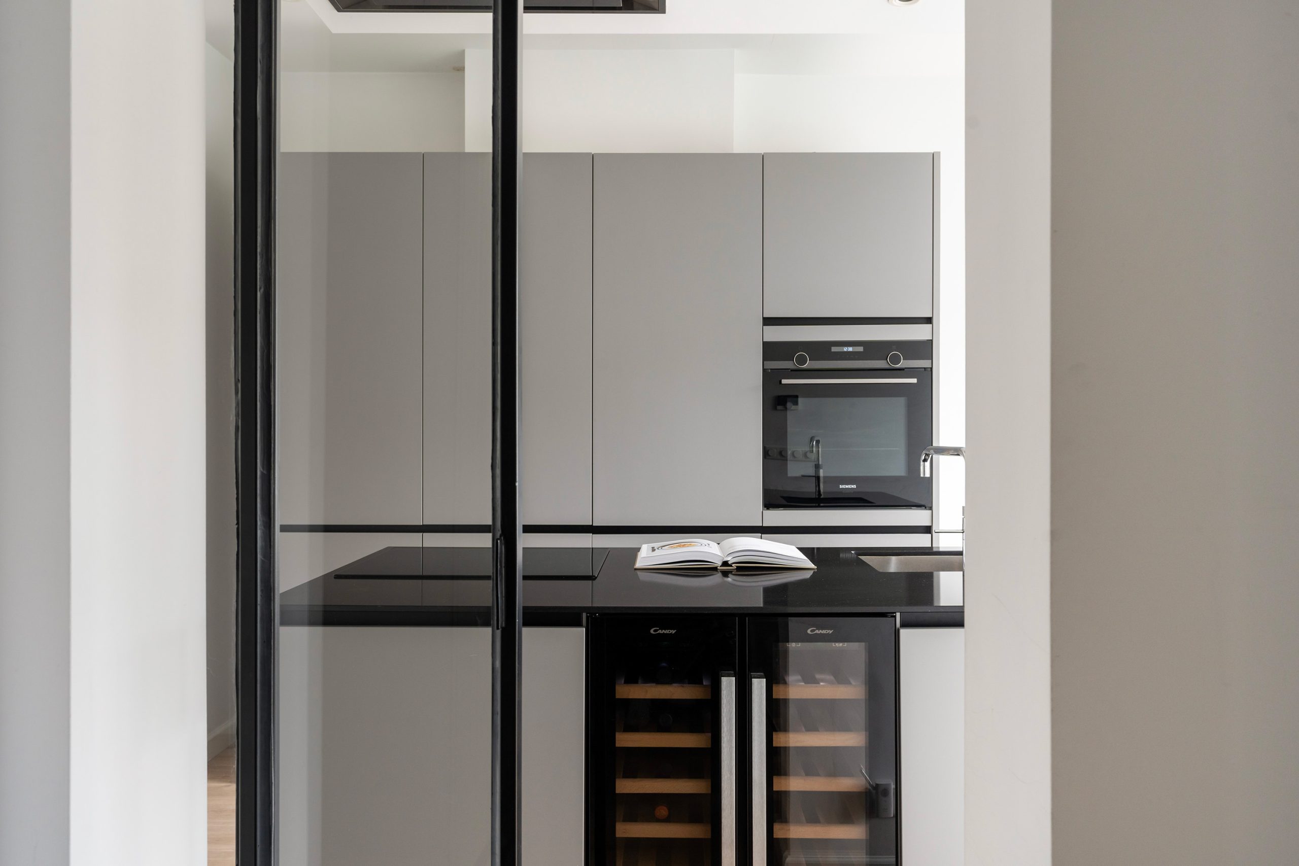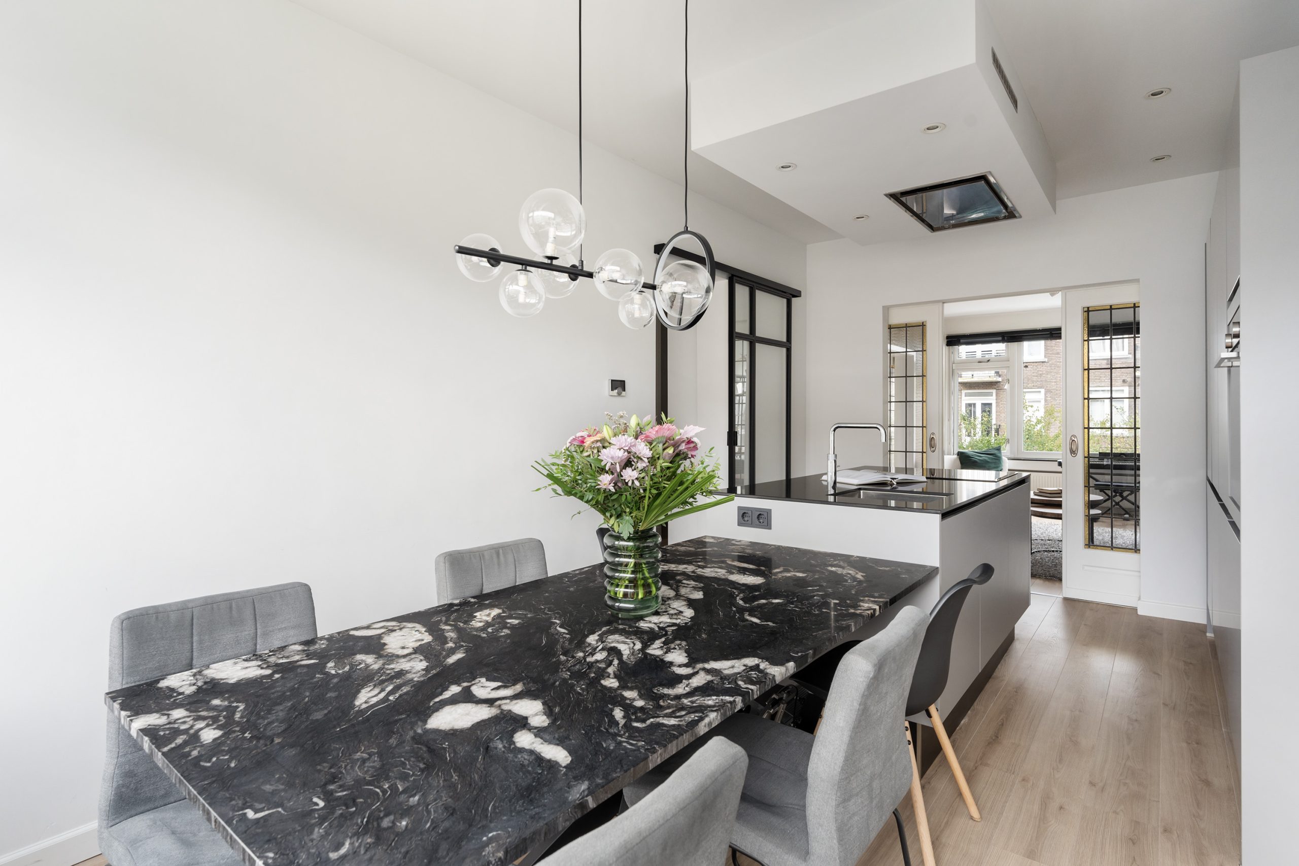 Aan de achterzijde bevindt zich de moderne open keuken, een echte eyecatcher, voorzien van een kookeiland, strakke zwarte fronten, inductiekookplaat, diverse inbouwapparatuur en zelfs een wijnklimaatkast.