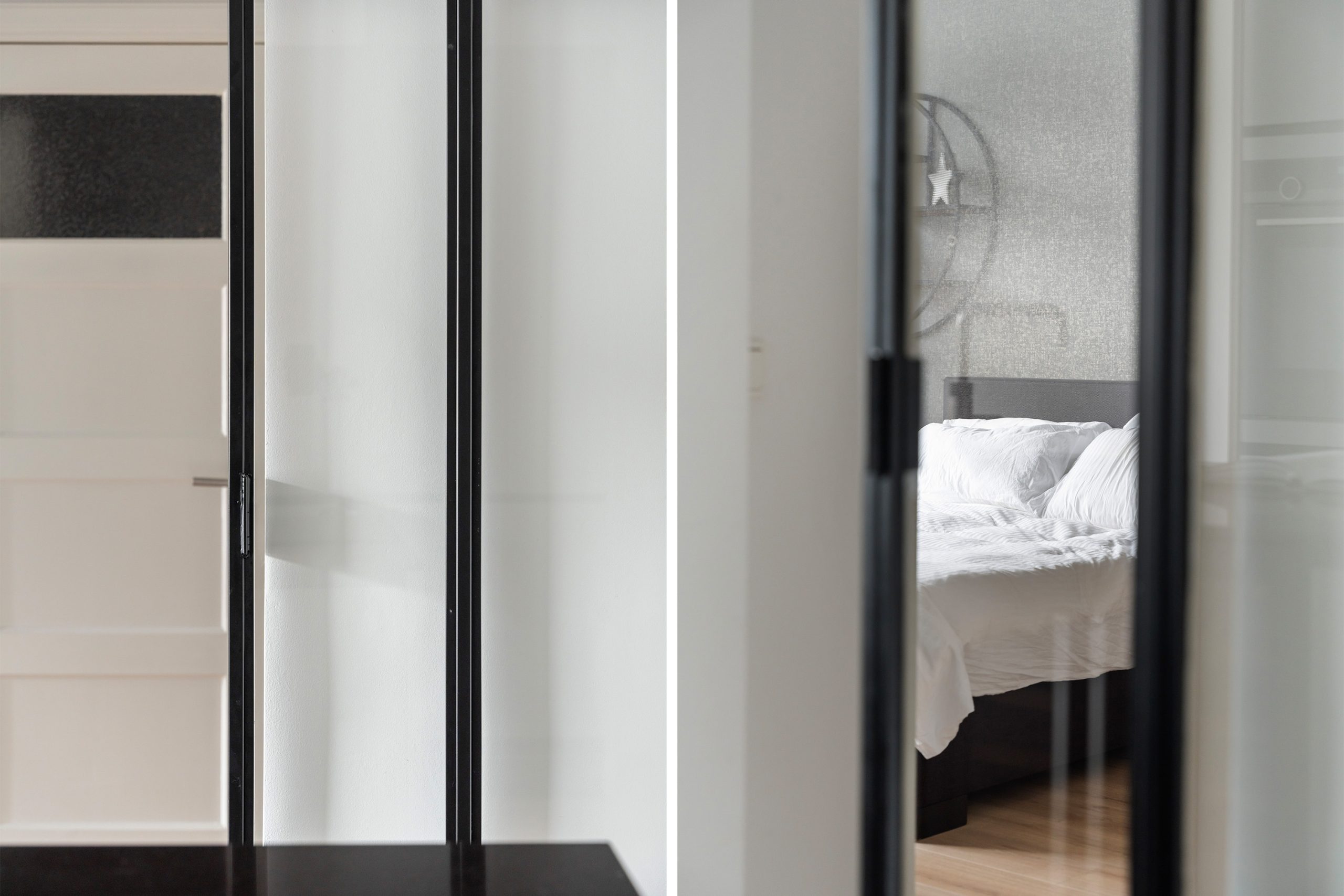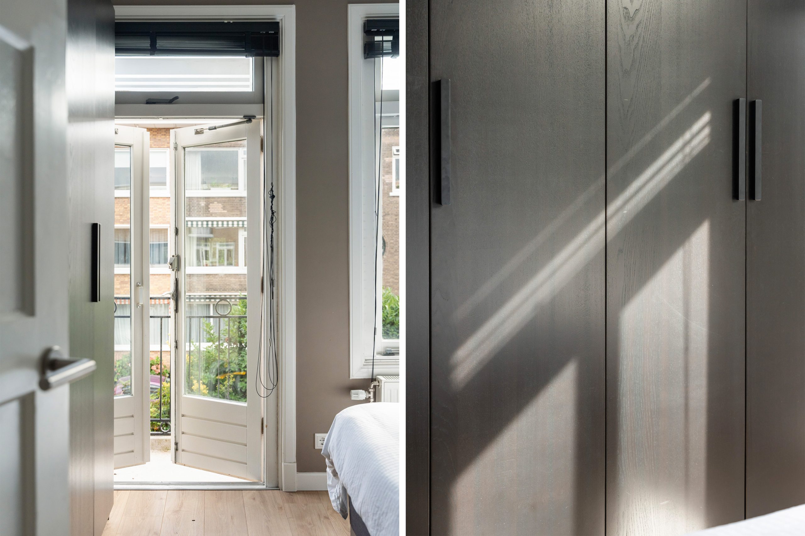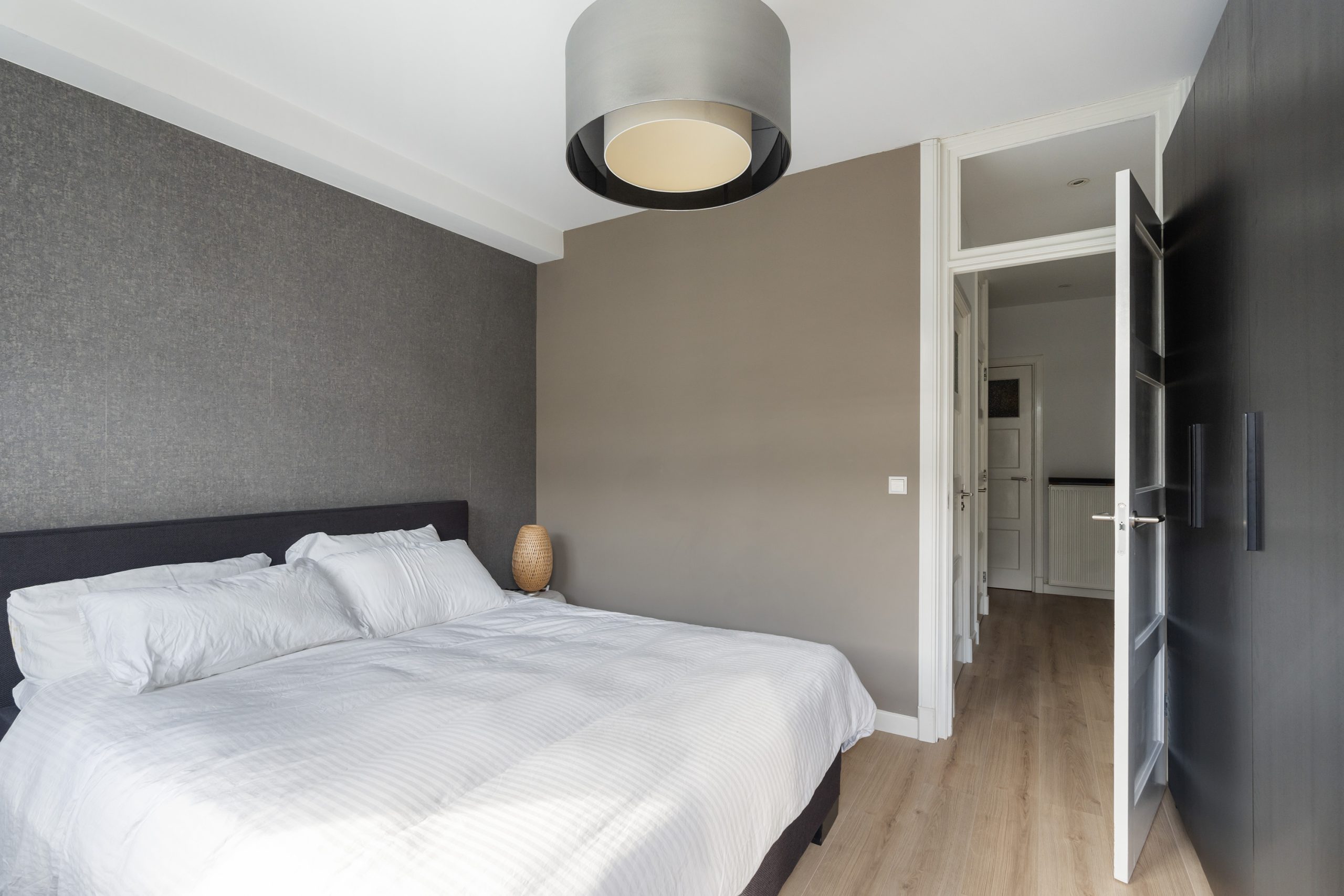De slaapkamer ligt aan de rustige achterzijde en biedt eveneens toegang tot het balkon. De badkamer is stijlvol uitgevoerd met moderne tegels, een ruime inloopdouche, wastafelmeubel en designradiator. Daarnaast bevindt zich in de hal een separaat toilet met fonteintje.