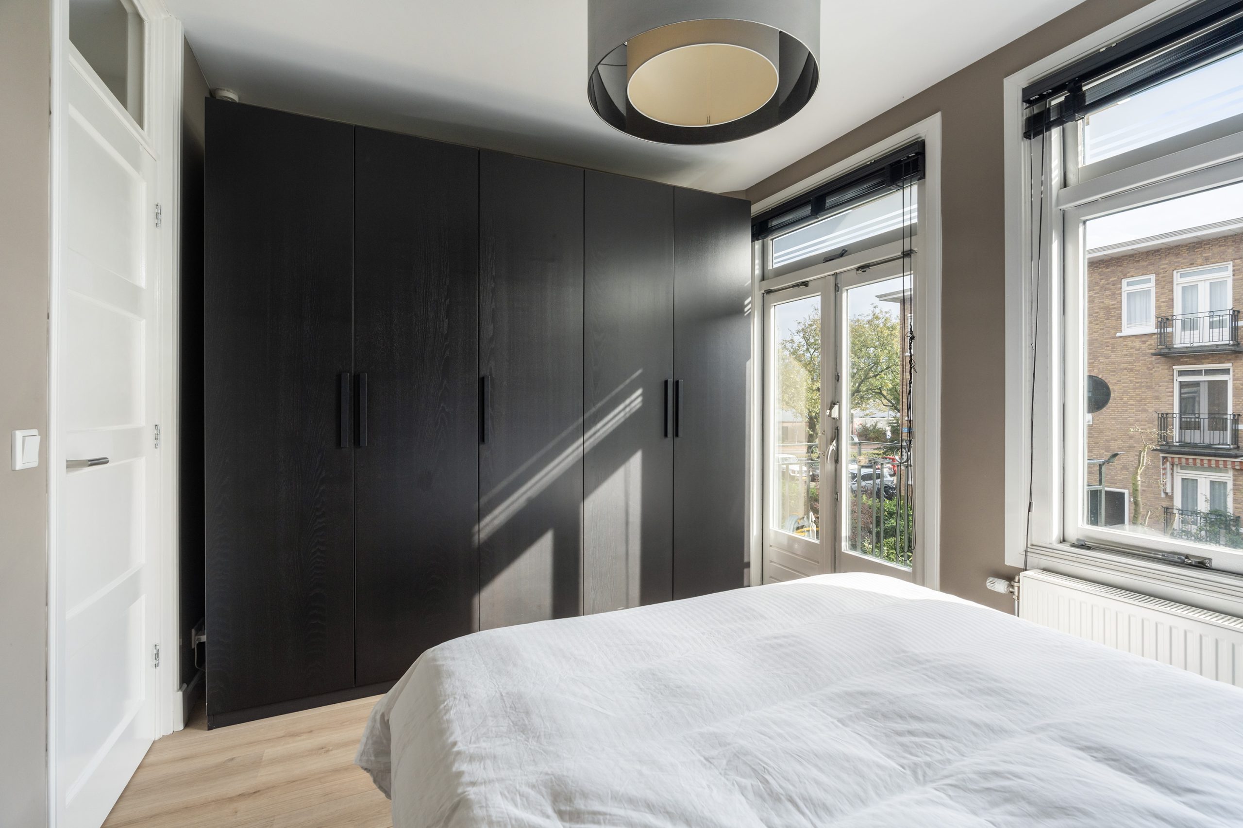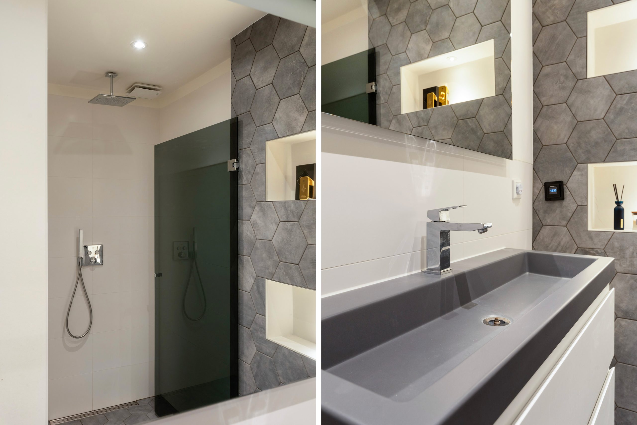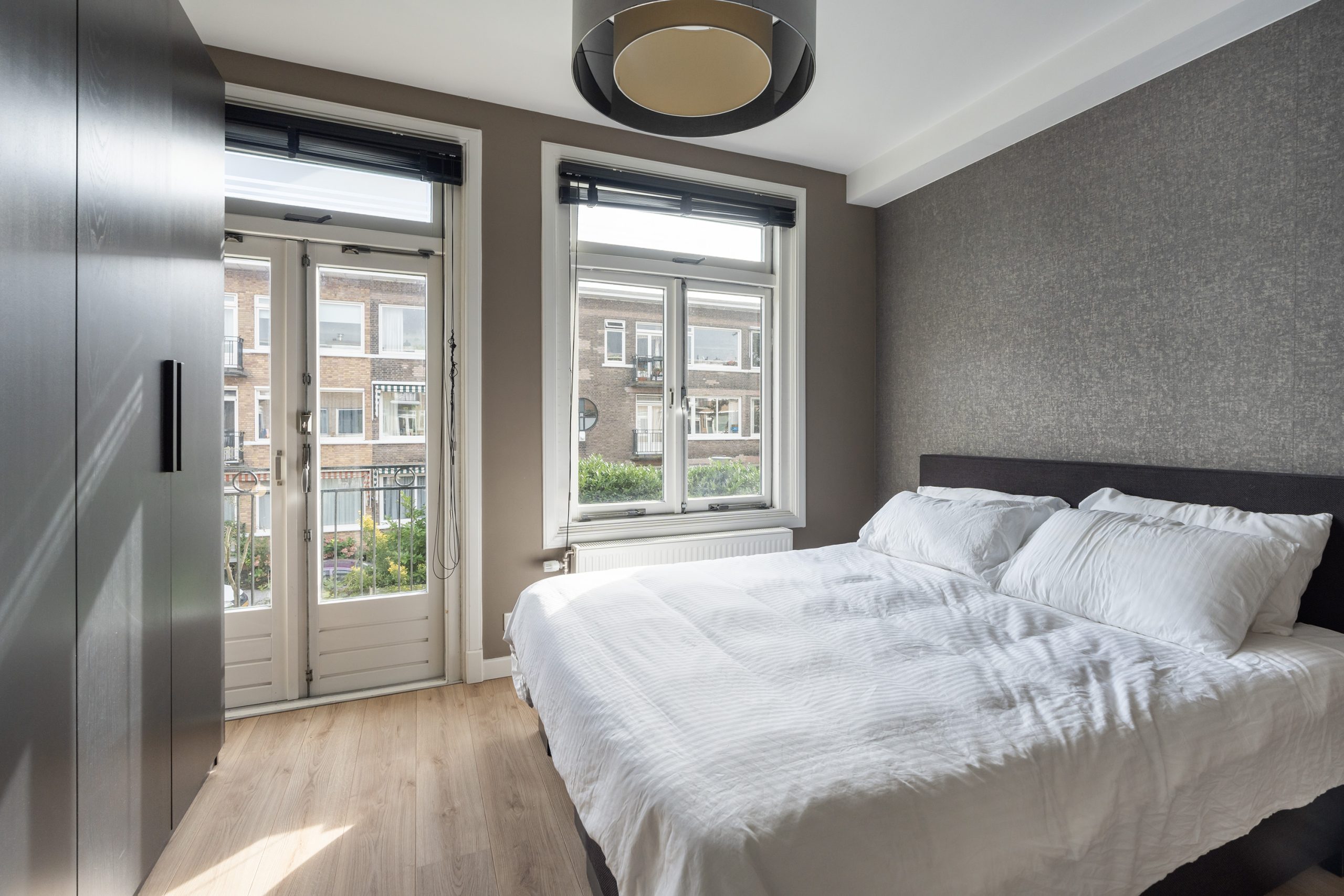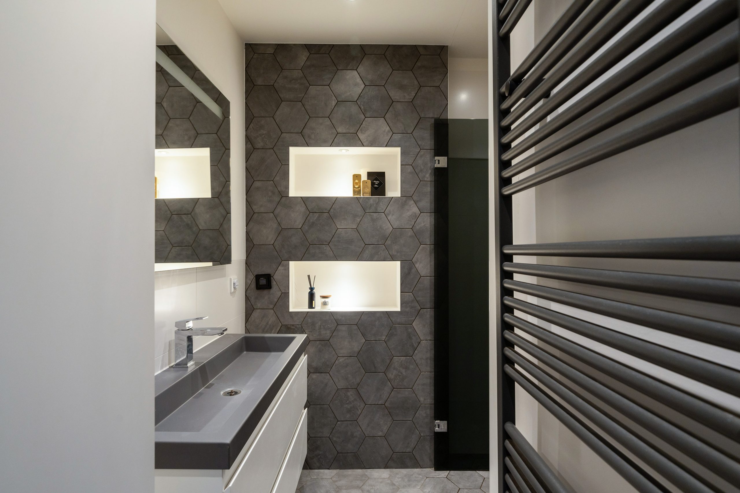 De slaapkamer ligt aan de rustige achterzijde en biedt eveneens toegang tot het balkon. De badkamer is stijlvol uitgevoerd met moderne tegels, een ruime inloopdouche, wastafelmeubel en designradiator. Daarnaast bevindt zich in de hal een separaat toilet met fonteintje.