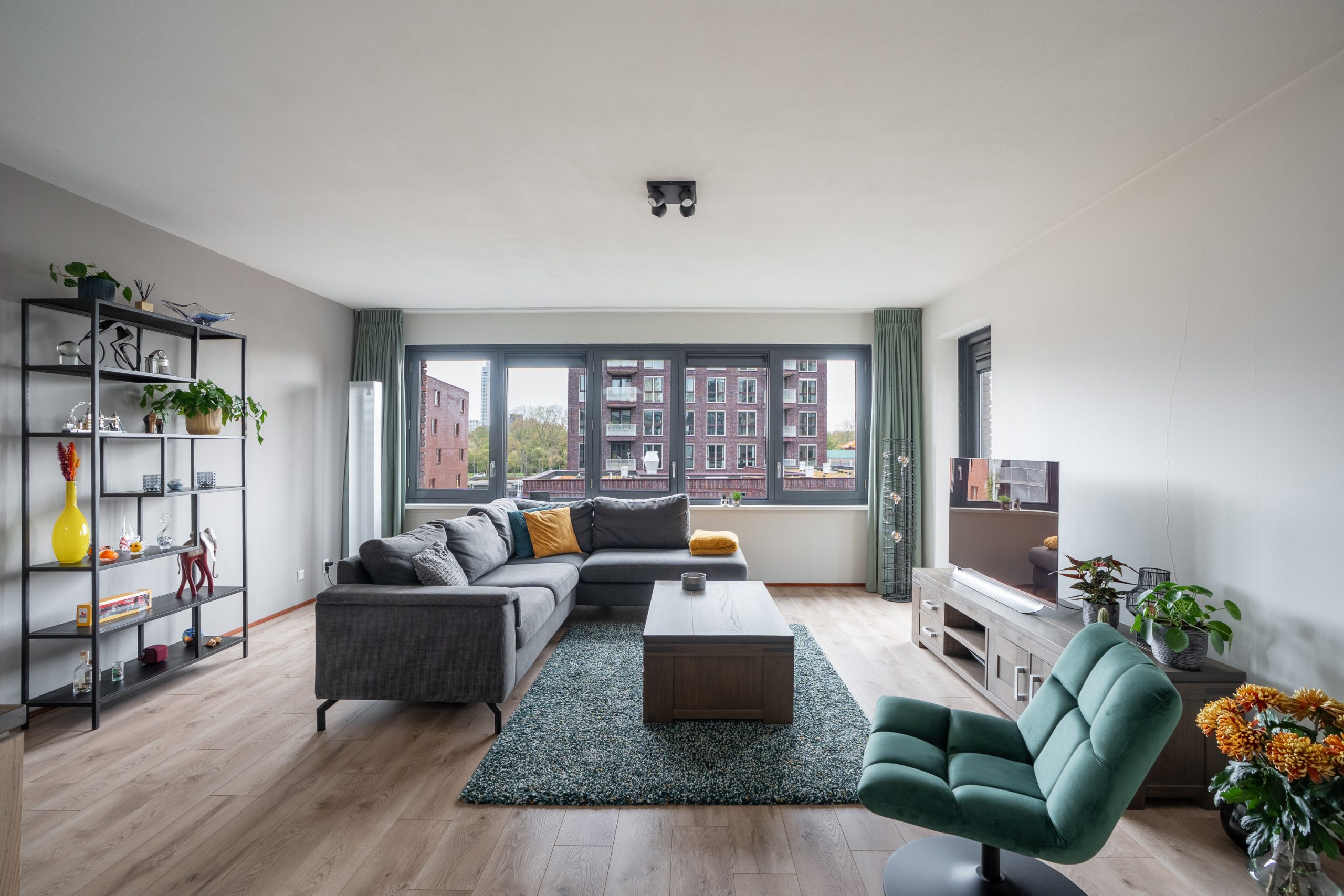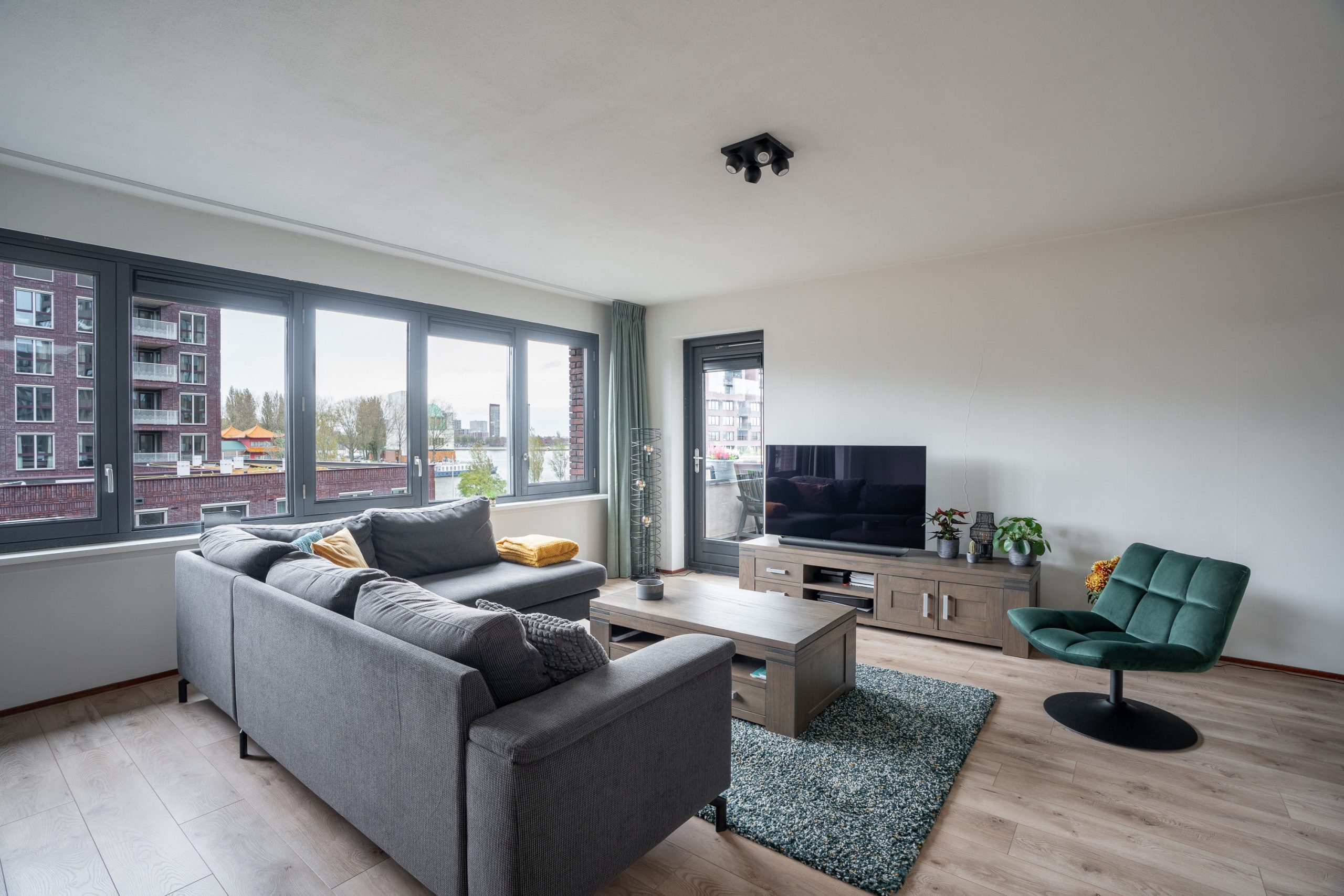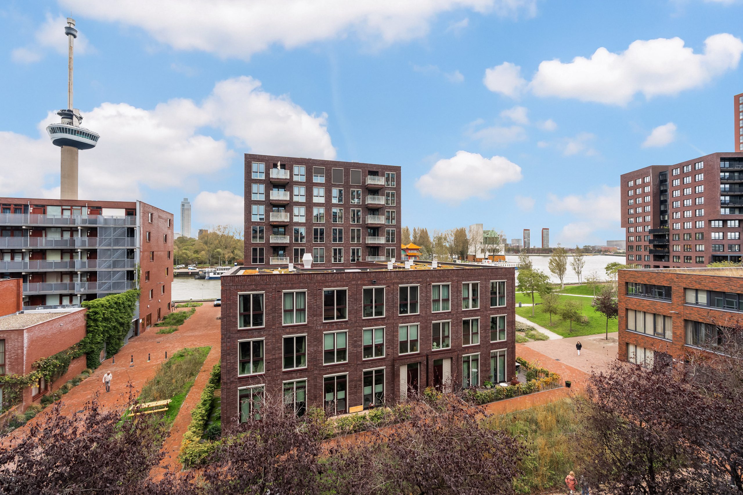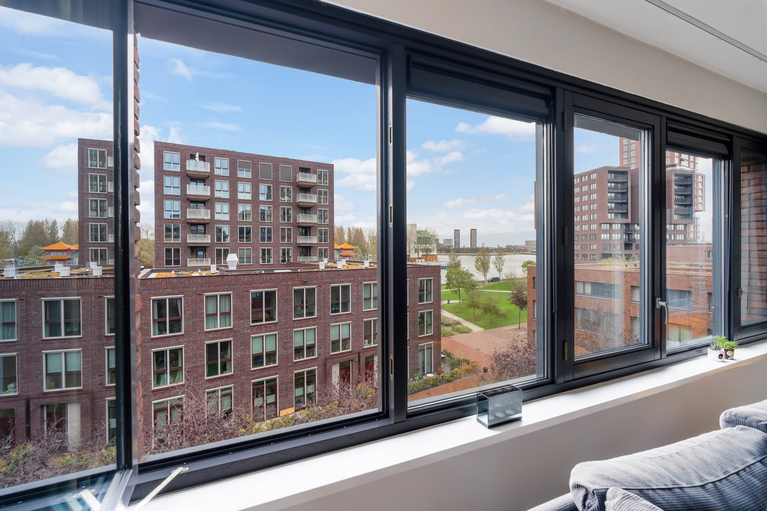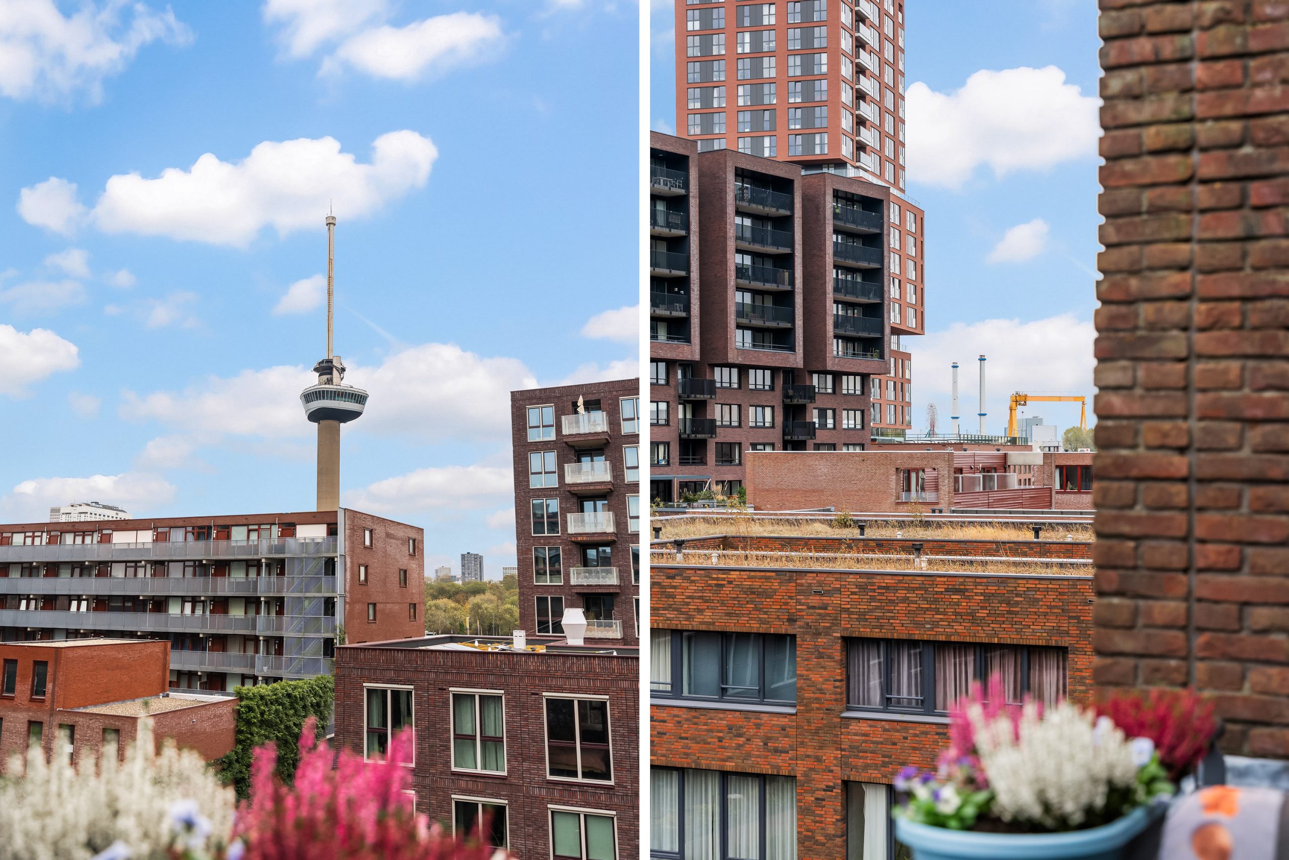 De living is ruim opgezet, wat betekent dat er voldoende ruimte is voor een gezellige zithoek én een lange eettafel. Vanuit hier heb je bovendien toegang tot het royale balkon op het oosten: de uitgelezen plek voor een kop koffie of een heerlijke lunch in de zon. Je geniet hier aan de ene kant van uitzicht op de iconische Euromast en aan de andere kant van de Nieuwe Maas, terwijl je later in de middag profiteert van een prettige plek in de schaduw op warme zomerdagen.