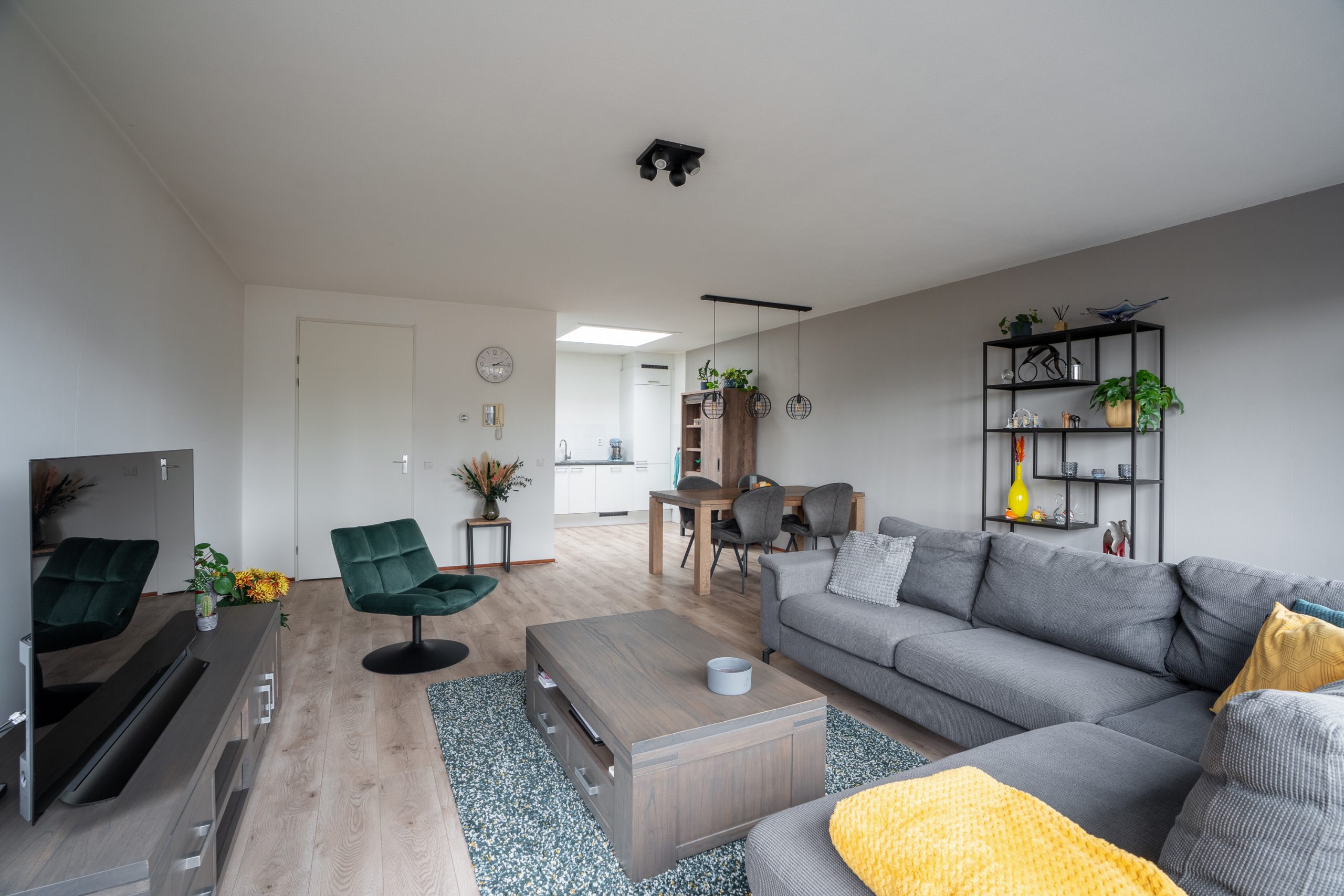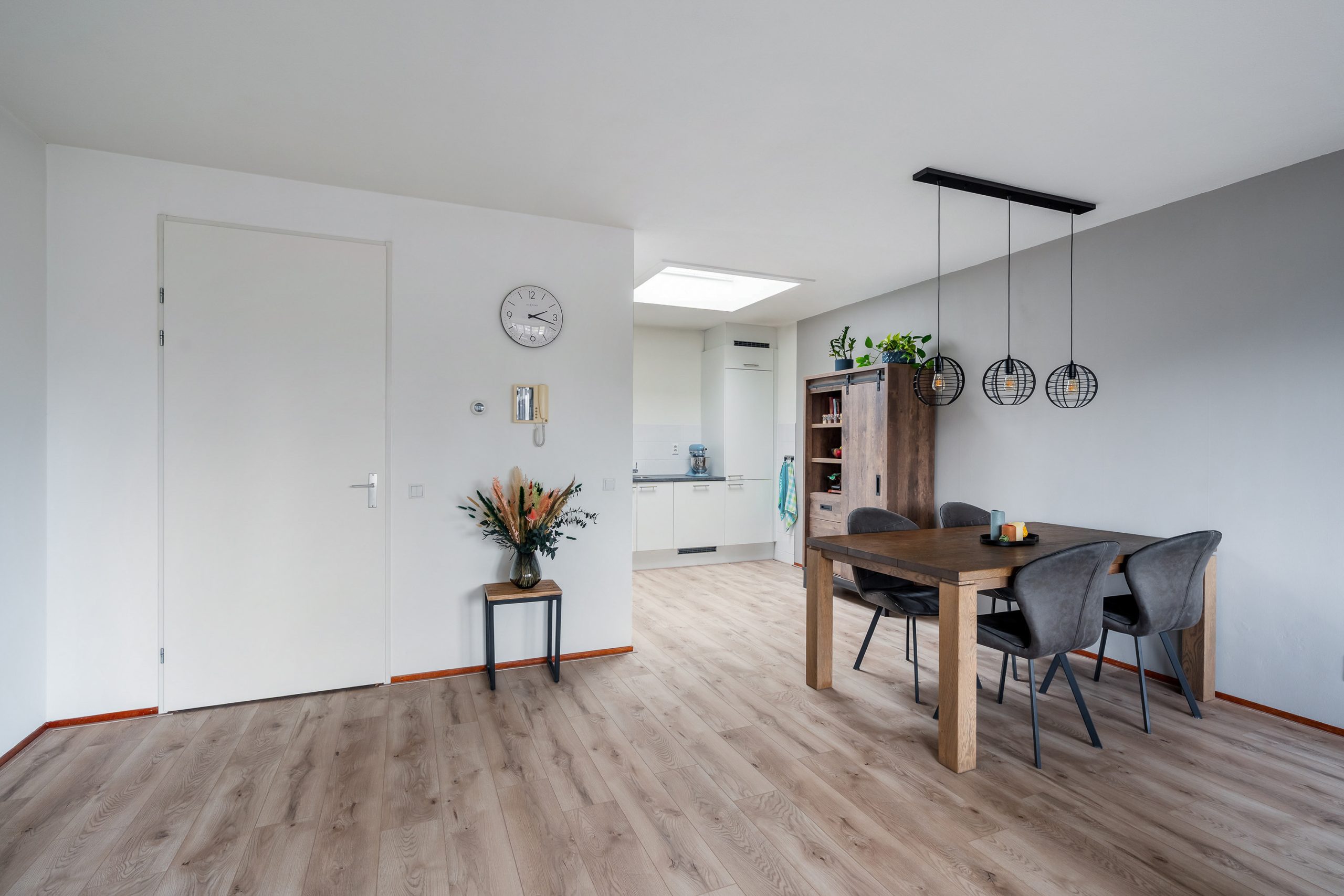 Vanuit de ruime hal zijn alle vertrekken te bereiken, waaronder de woonkamer. Hier valt een heerlijke hoeveelheid licht naar binnen door de ramen over de volledige breedte van de woning. De lichte laminaatvloer, die door de gehele woning is doorgelegd, zorgt voor een modern en rustig geheel.