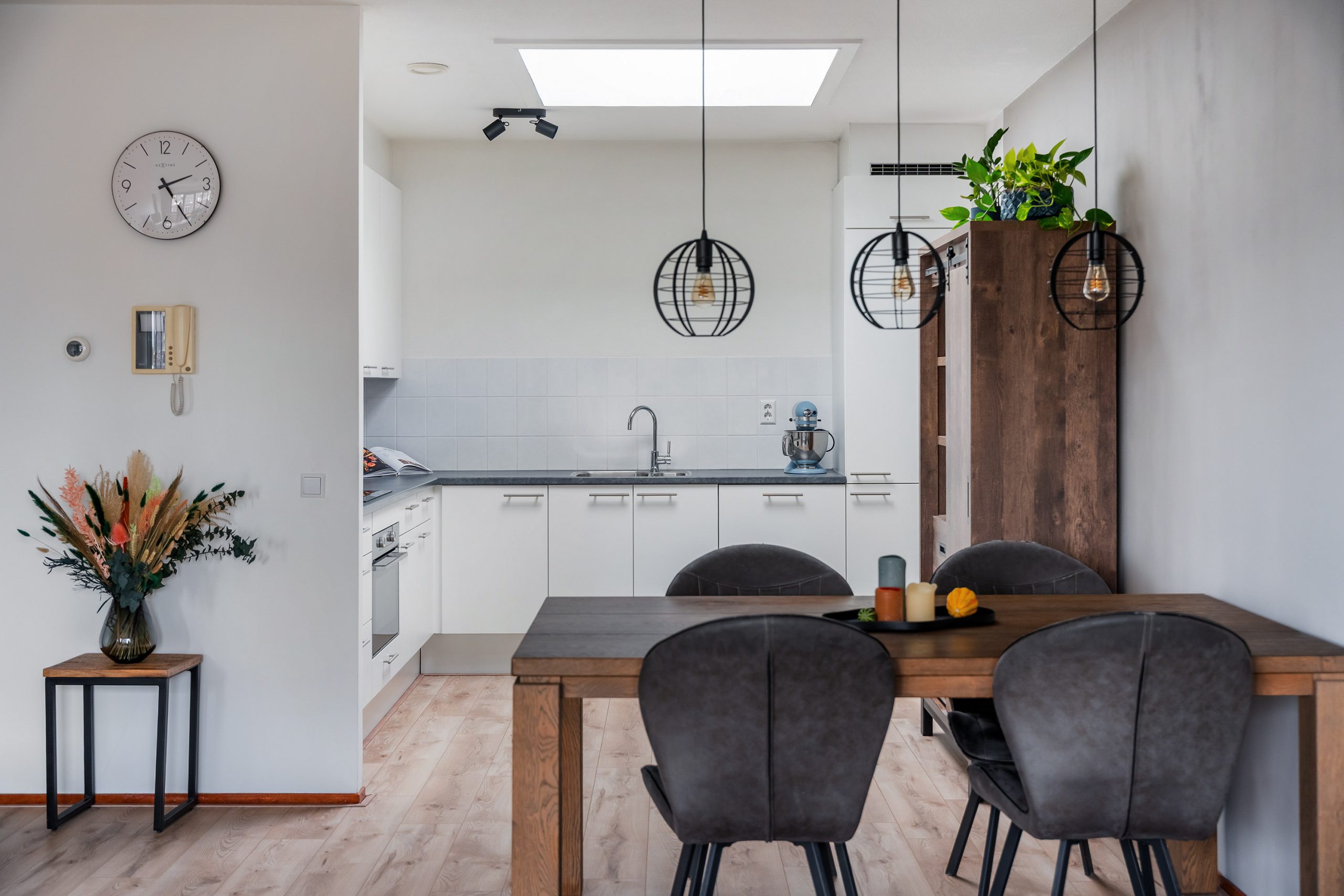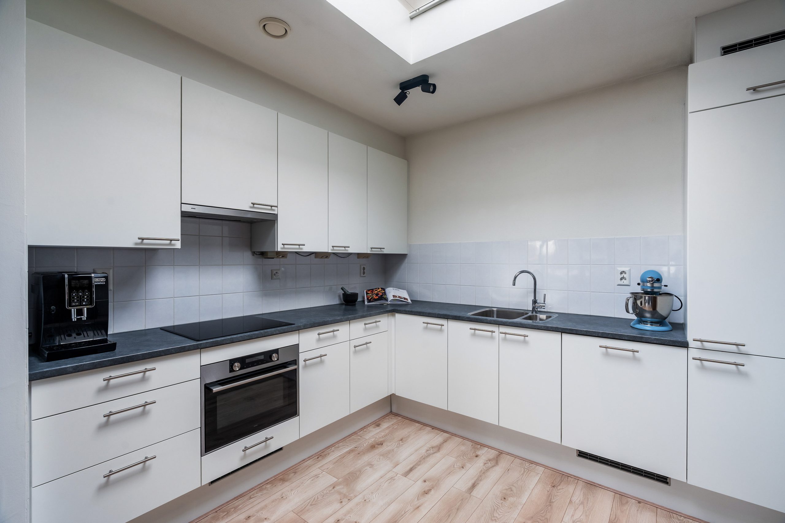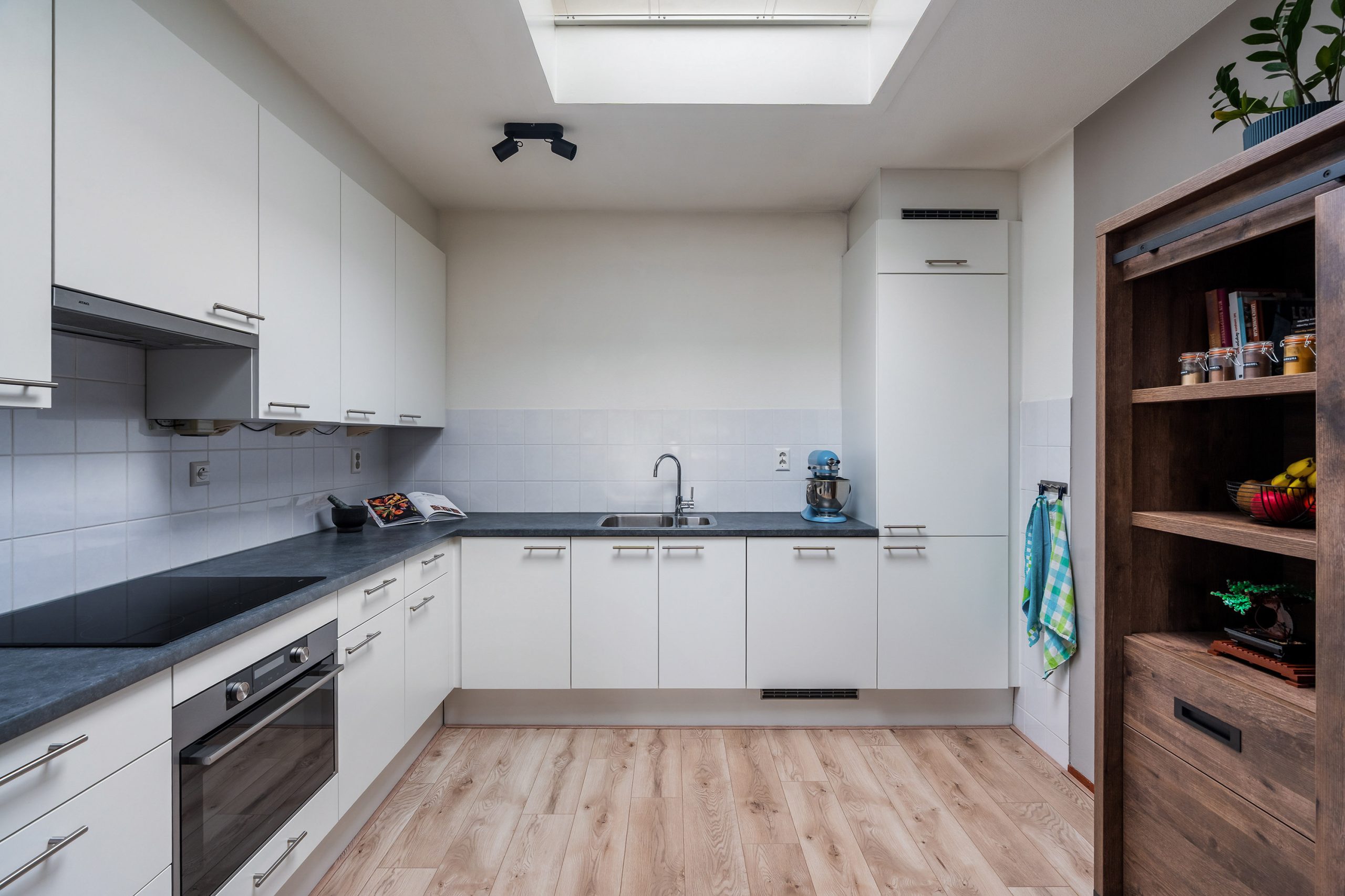Terug in de woonkamer bereik je de keuken. Ook hier is aan licht geen gebrek dankzij de dakkoepel. De ruime keuken is van alle gemakken voorzien en beschikt over inbouwapparatuur zoals een inductiekookplaat, afzuigkap, combi-oven, koelkast, vriezer, vaatwasser en voldoende opbergruimte. Hier zet je in een handomdraai een heerlijke maaltijd op tafel!