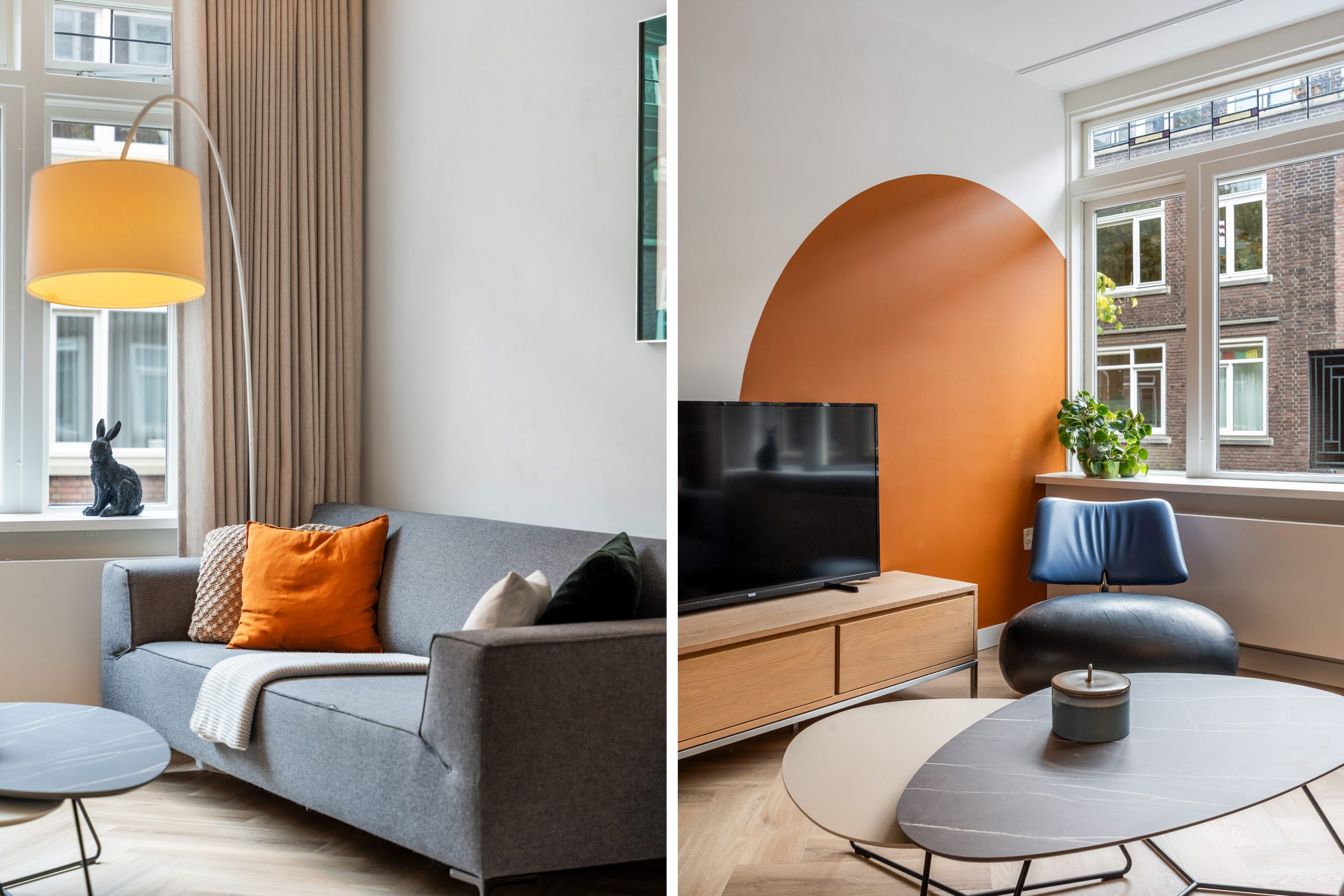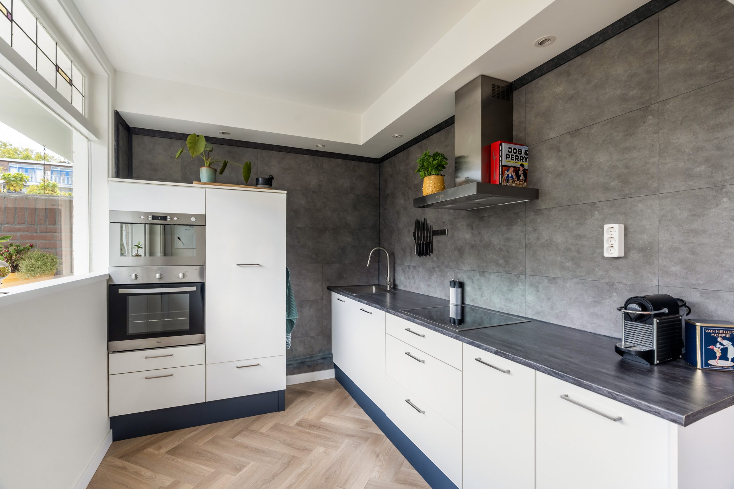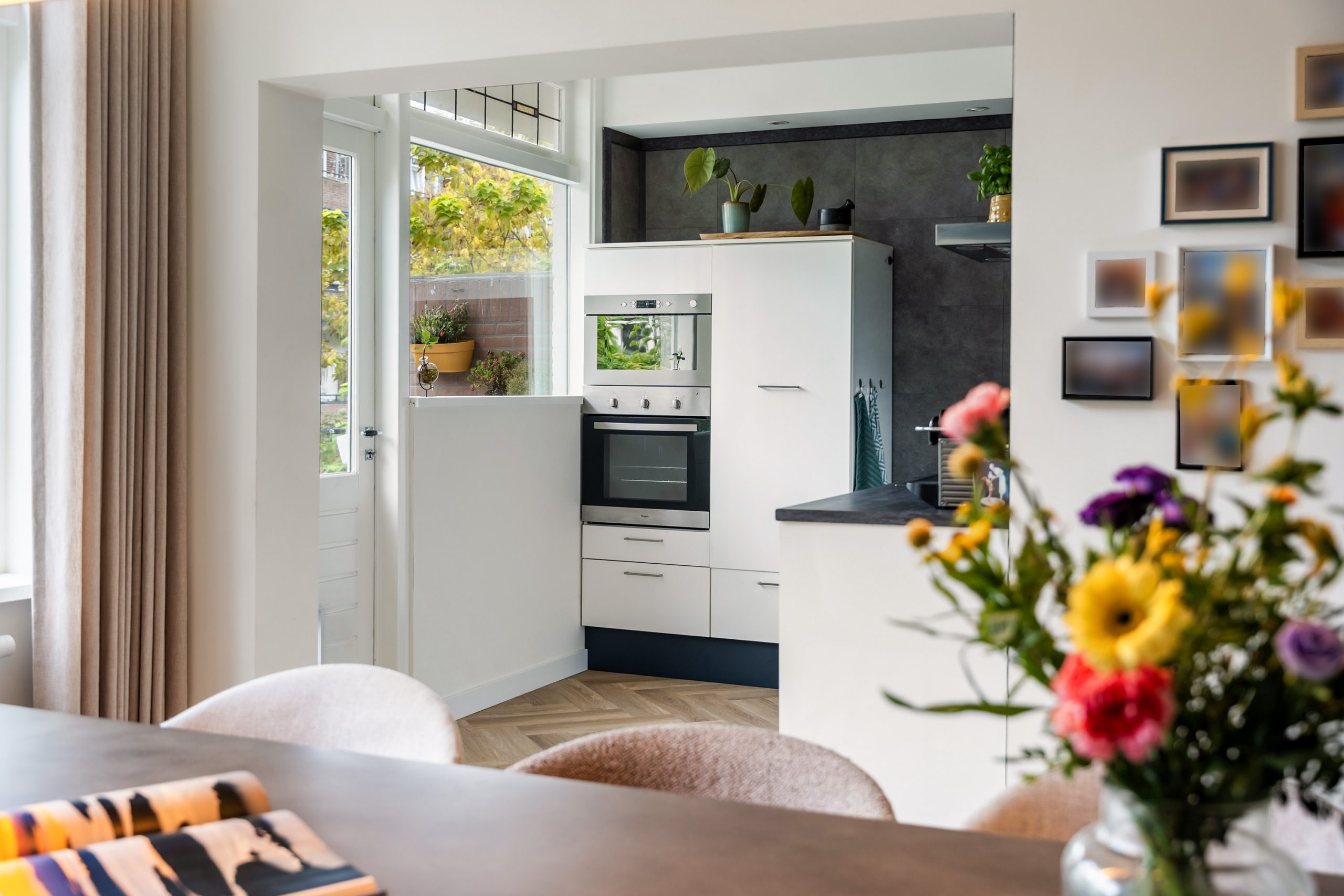De ruime entree biedt toegang tot alle vertrekken, waaronder het royale leefgedeelte. Wat een afwerking! De woning is in 2022 gemoderniseerd en dit is duidelijk terug te zien. De prachtige PVC-vloer met visgraatmotief en strak gestuukte wanden en plafonds zorgen niet alleen voor modern wooncomfort, maar geven het geheel ook een stijlvolle en tijdloze uitstraling. Dit is thuiskomen in een luxe sfeer! Doordat het leefgedeelte zich over de volle lengte van de woning uitstrekt, ervaar je hier een heerlijk gevoel van ruimte. De grote raampartijen aan beide zijden, deels voorzien van glas-in-lood, voegen extra karakter en charme toe. De halfopen moderne keuken is ruim opgezet met een keukenblok en vaste kastenwand. De keuken beschikt over een keramische kookplaat, afzuigkap, magnetron, oven, koelkast en een vaatwasser. Vanuit hier is er toegang tot het eerste balkon, dat is gelegen op het zuidoosten. Perfect om de dag te beginnen met een kopje koffie!