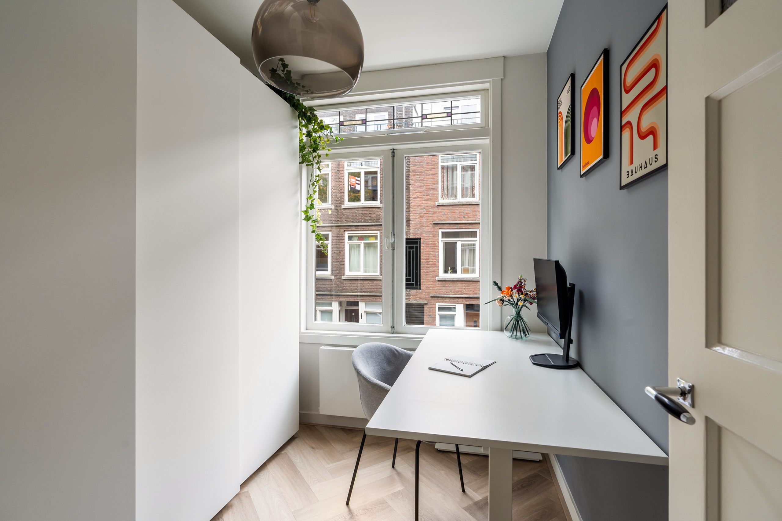 Aan de voorzijde is een extra kamer te vinden, die goed te gebruiken is als werkkamer of hobbykamer. In de entree is het separate toilet met fonteintje, twee vaste kasten en de trap naar de derde verdieping gevestigd.