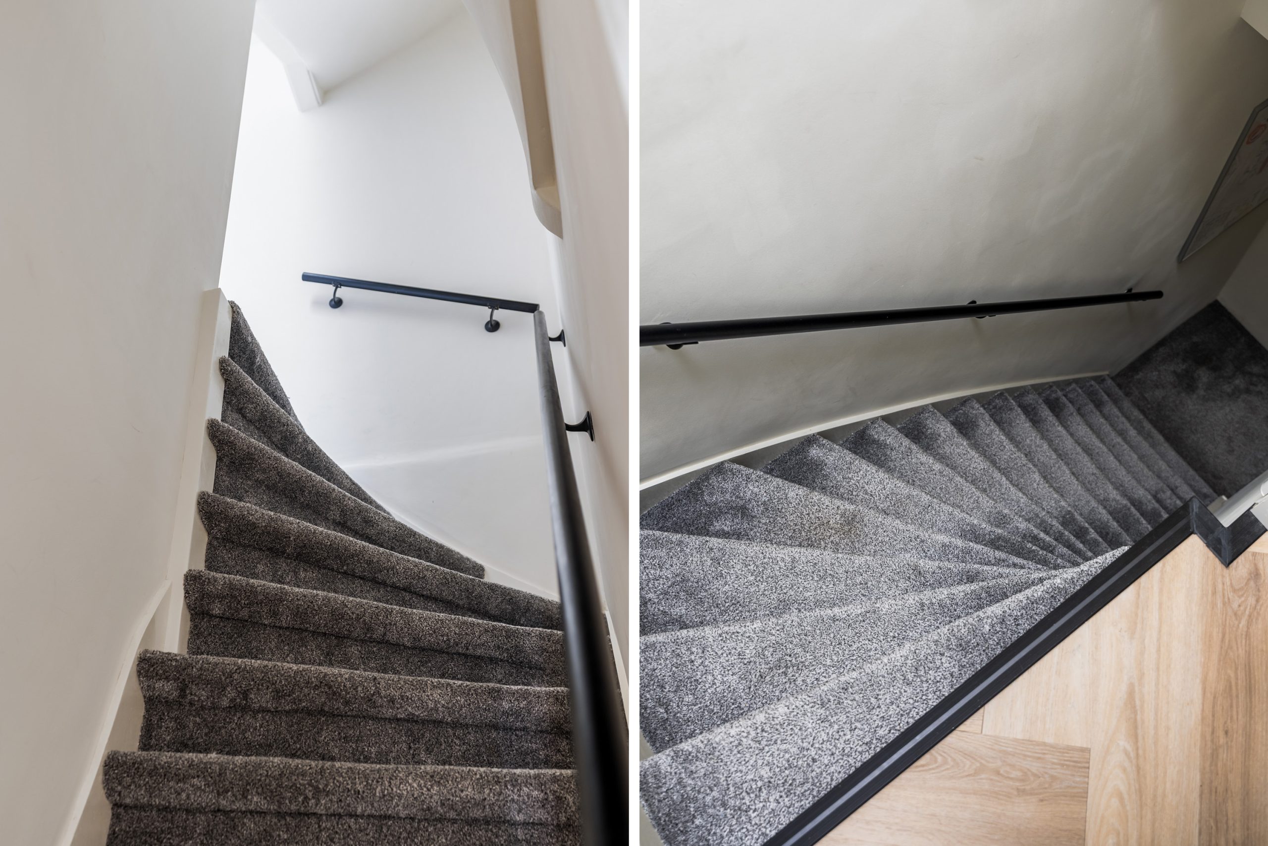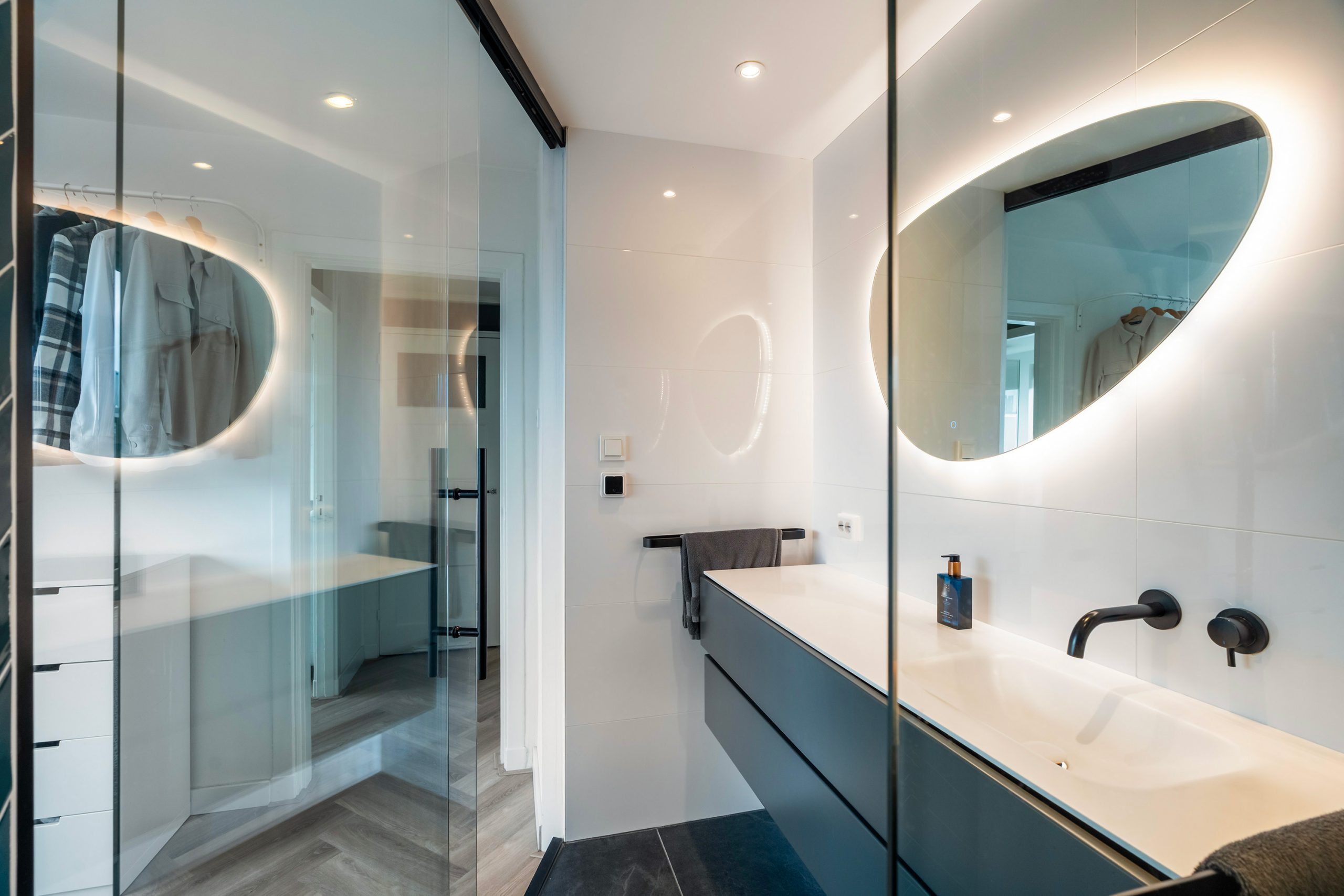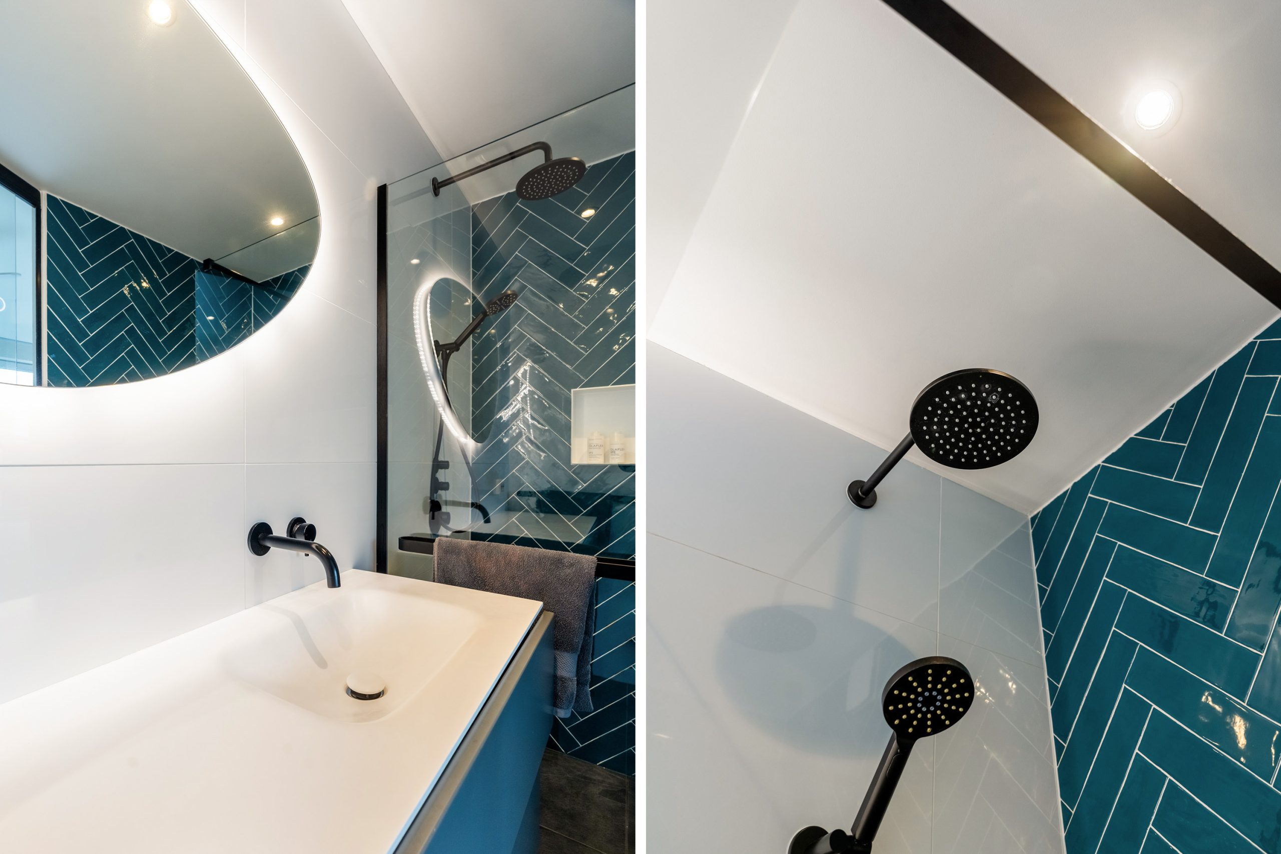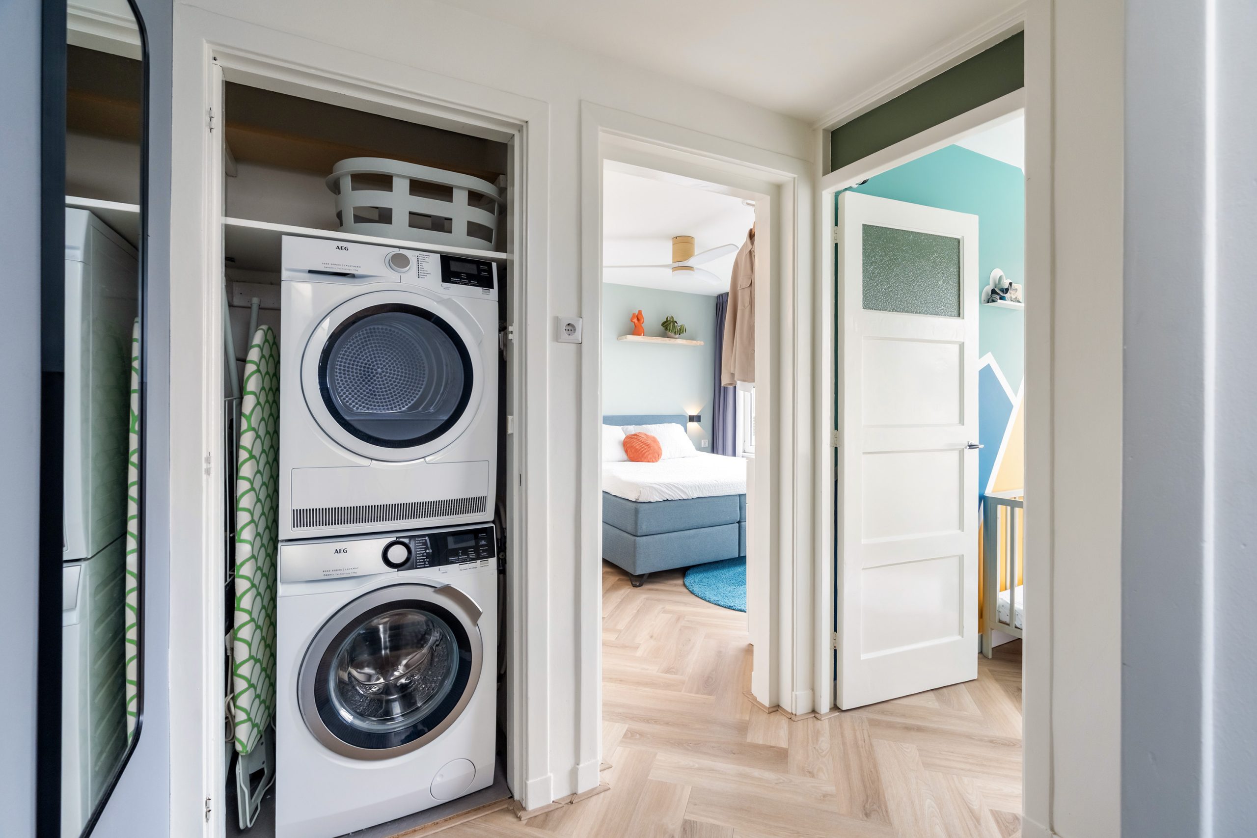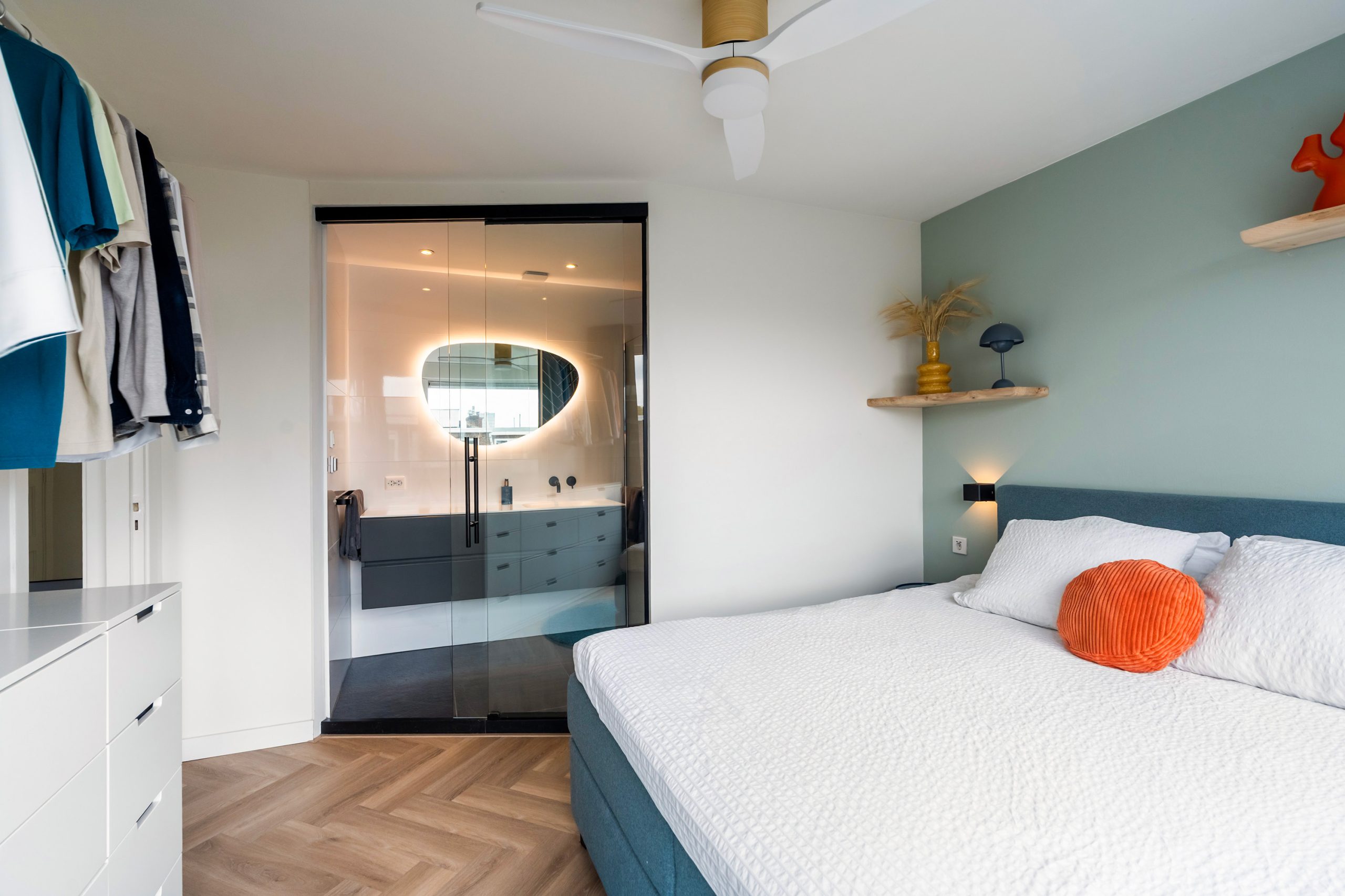 Op deze verdieping bevinden zich twee slaapkamers. De hoofdslaapkamer beschikt over een en suite badkamer, gescheiden door een glazen schuifwand. Hier komt het luxe gevoel van de woning helemaal terug, alsof je verblijft in een boutiquehotel. De badkamer is smaakvol afgewerkt met trendy blauwe wandtegels en zwarte accenten. De ruimte is uitgerust met een ruime wastafel met groot meubel en een organisch gevormde spiegel, een inloopdouche en elektrische vloerverwarming. De tweede slaapkamer heeft toegang tot het balkon, dat eveneens is gelegen op het zuidoosten. Een extra pluspunt is dat deze verdieping beschikt over een separaat toilet. Op de overloop is er een vaste kast met de aansluiting voor een wasmachine en droger, en bovenaan de trap is de cv-ketel te vinden.