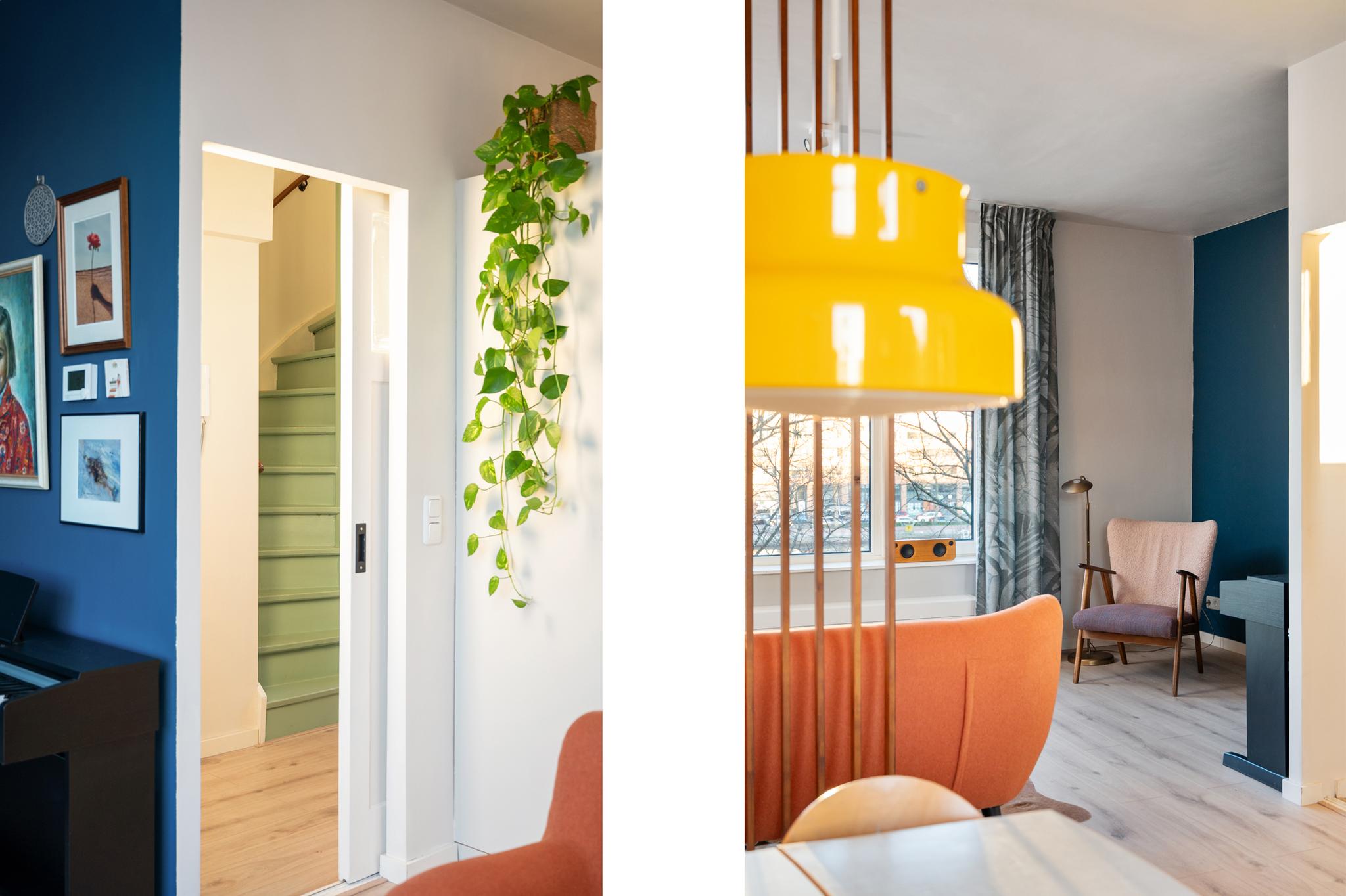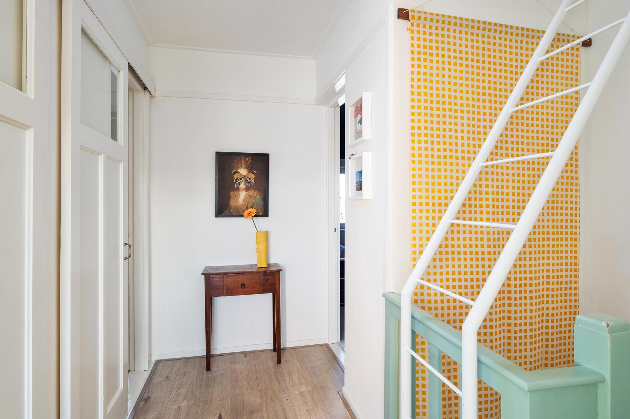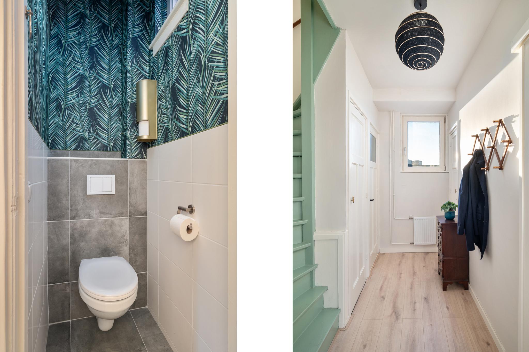 Terug in de hal is het separate toilet, de meterkast, een trapkast en de trap naar de vierde verdieping te vinden.