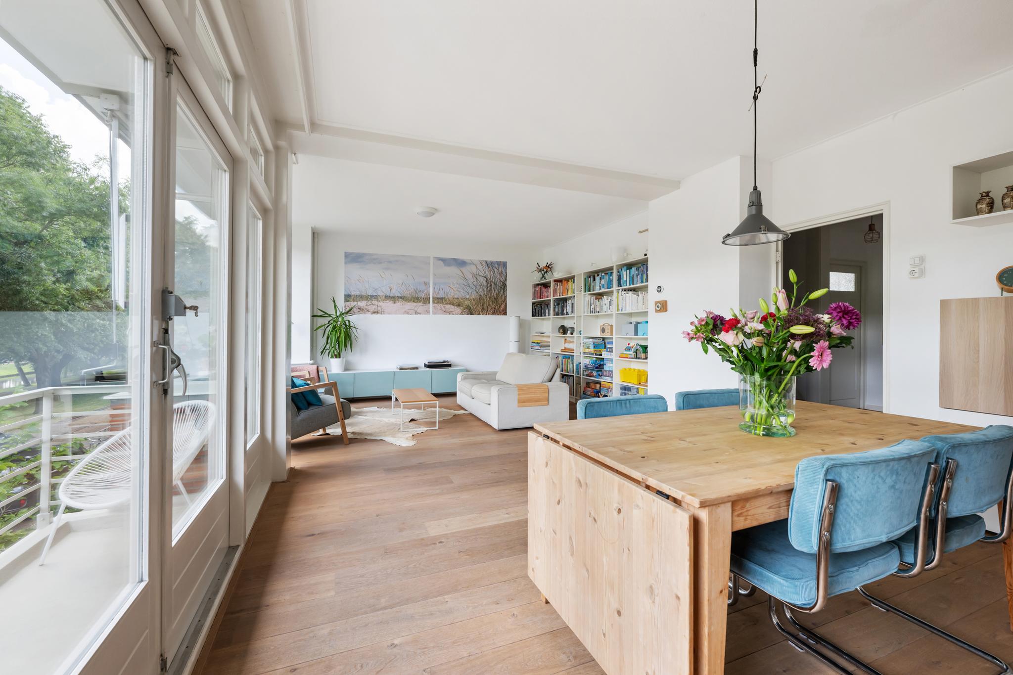De woonkamer is afgewerkt met een fraaie houten vloer, die naadloos doorloopt naar zowel de hal als de keuken en daarmee een mooi geheel vormt.