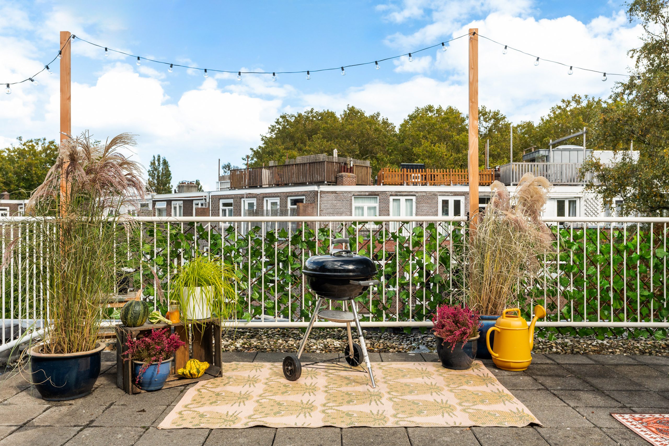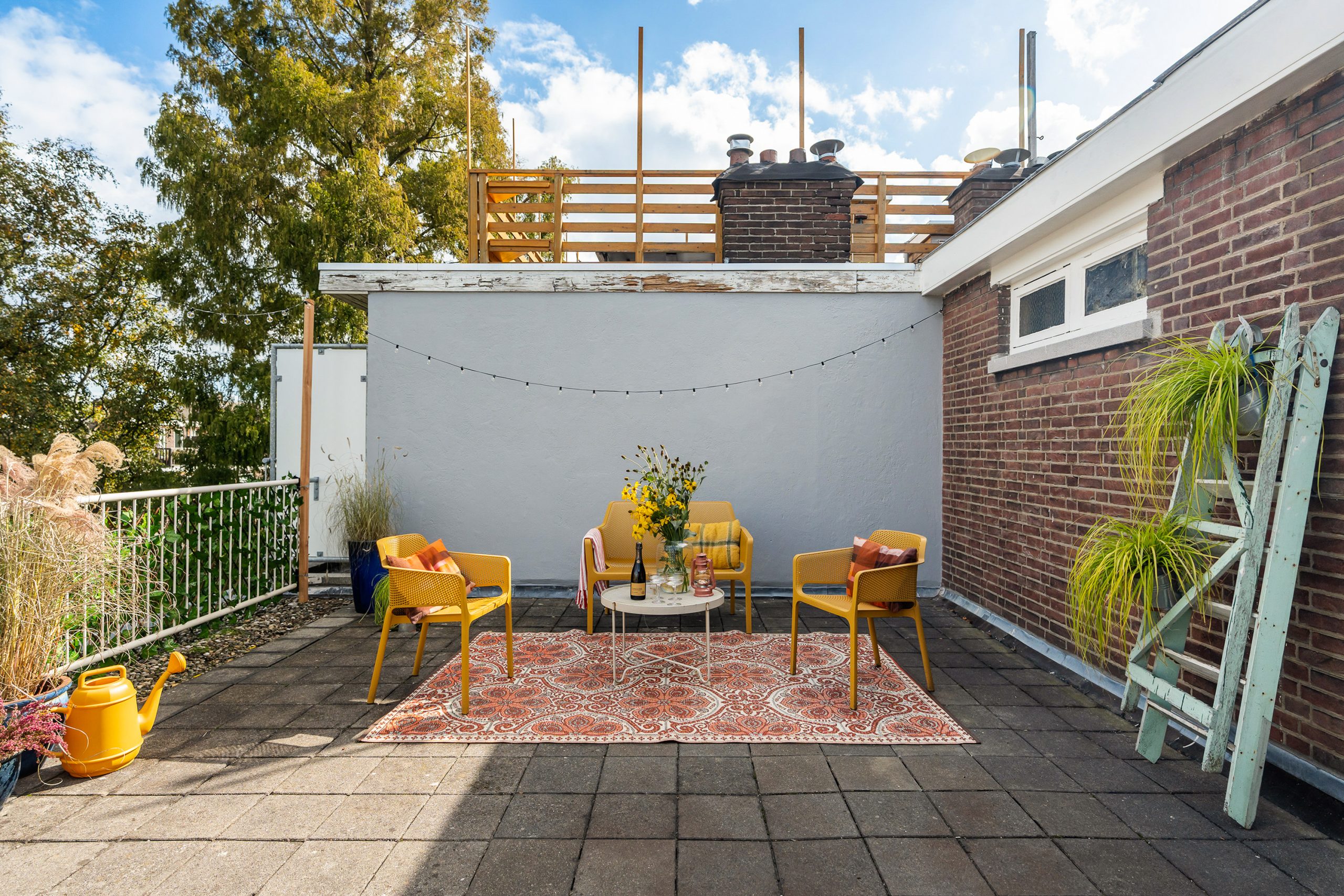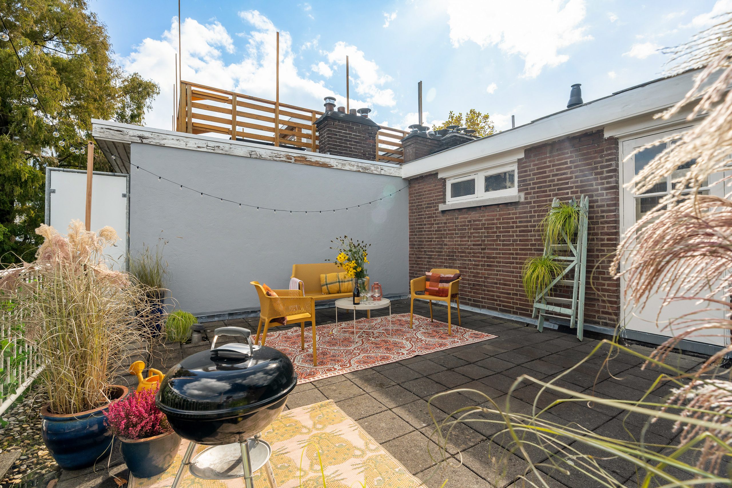 Via een vaste trap bereik je het royale dakterras van circa 31 m². Dit zonnige terras is een absolute eyecatcher van de woning en biedt volop ruimte voor een loungeset, eettafel, barbecue en groenvoorziening. Een heerlijke plek om te genieten van de zomerse avonden met uitzicht over de wijk en de skyline van Rotterdam.