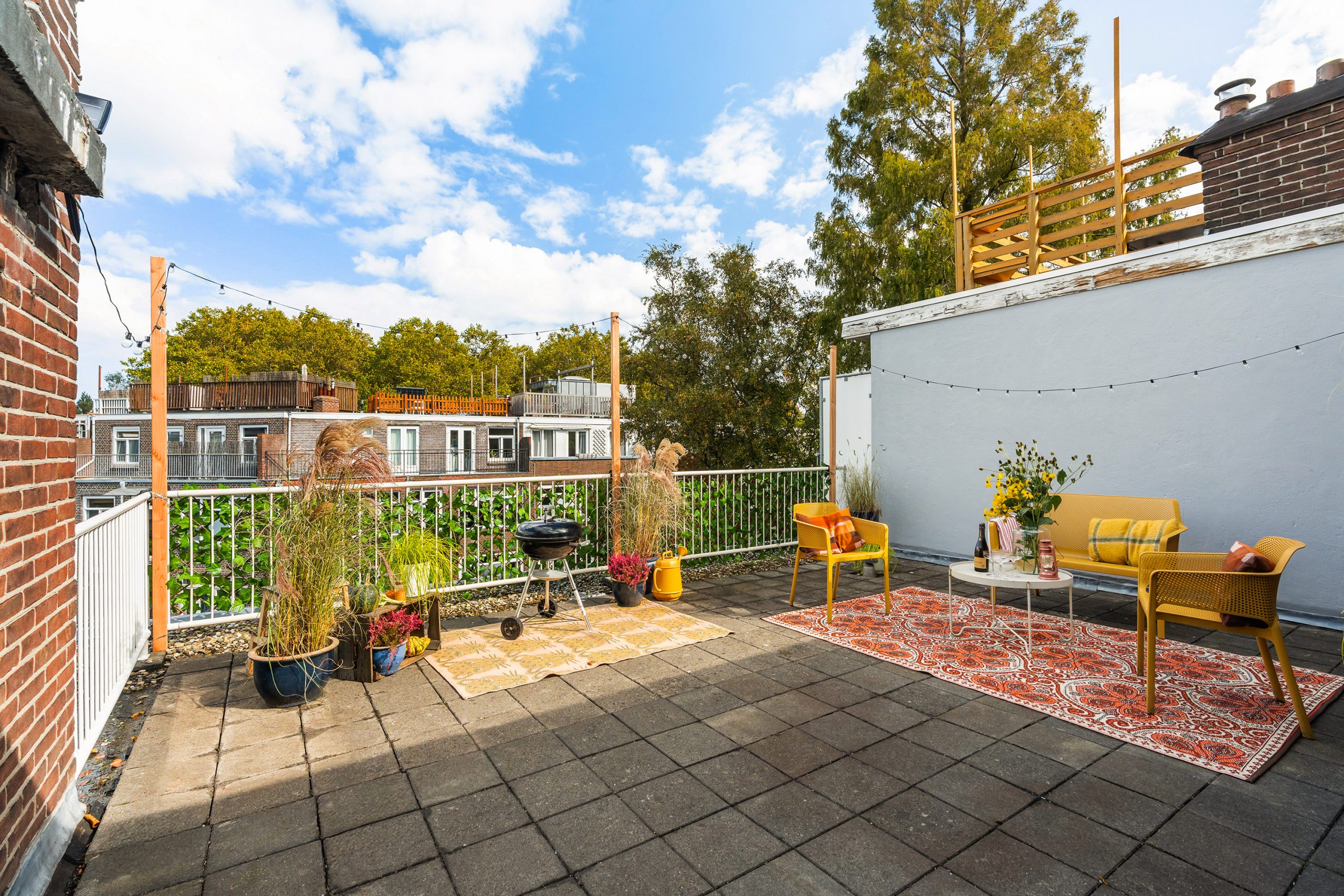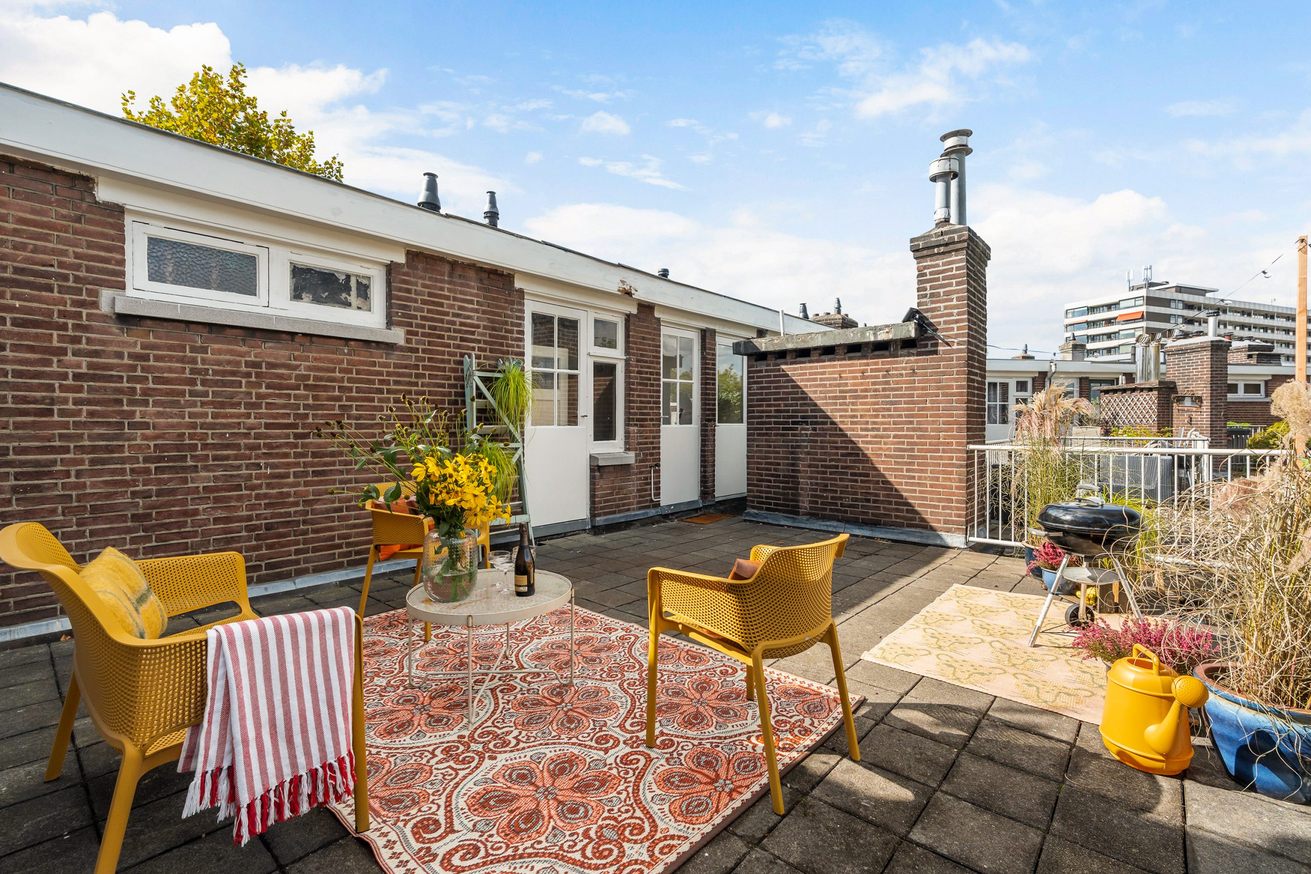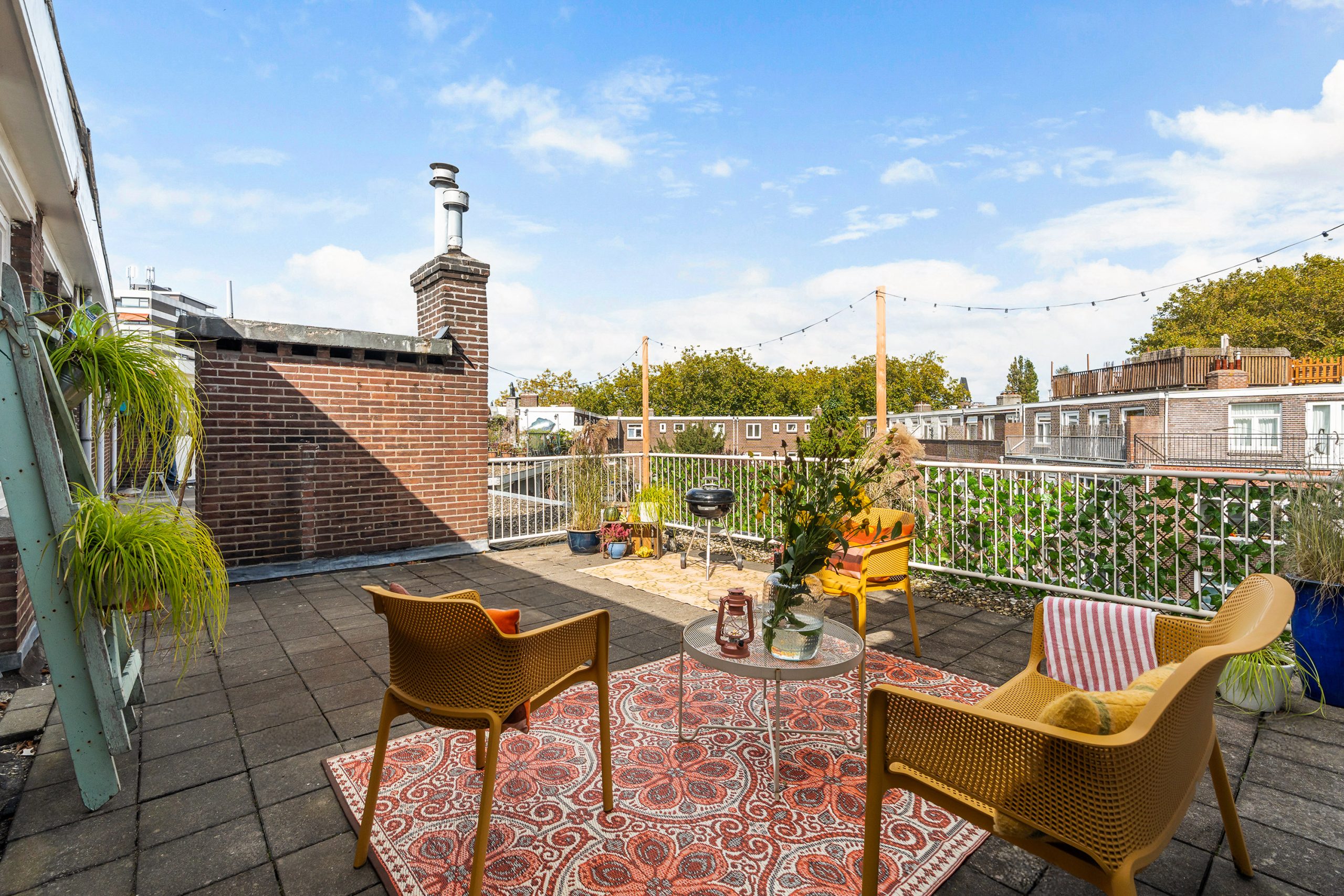 Via een vaste trap bereik je het royale dakterras van circa 31 m². Dit zonnige terras is een absolute eyecatcher van de woning en biedt volop ruimte voor een loungeset, eettafel, barbecue en groenvoorziening. Een heerlijke plek om te genieten van de zomerse avonden met uitzicht over de wijk en de skyline van Rotterdam.