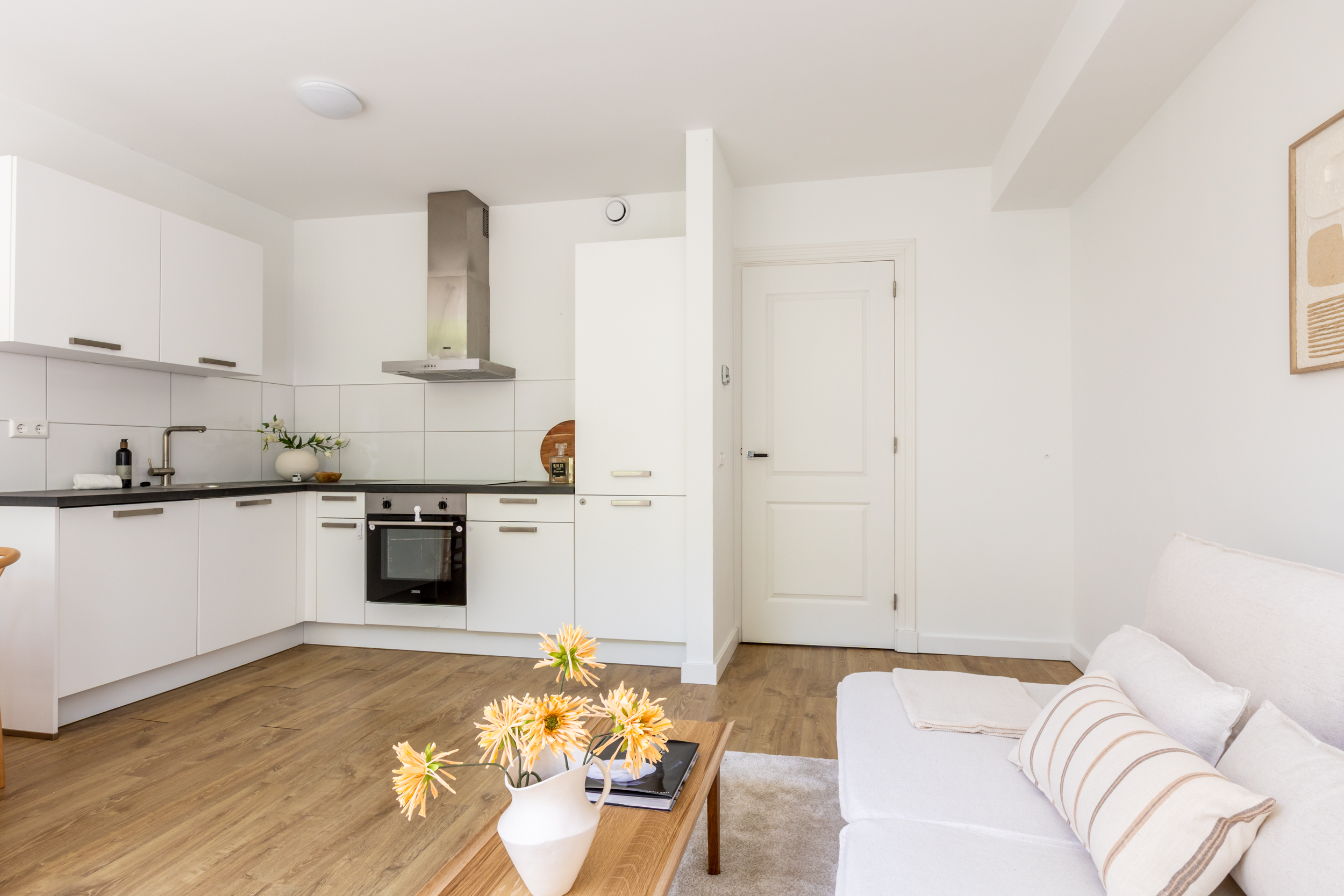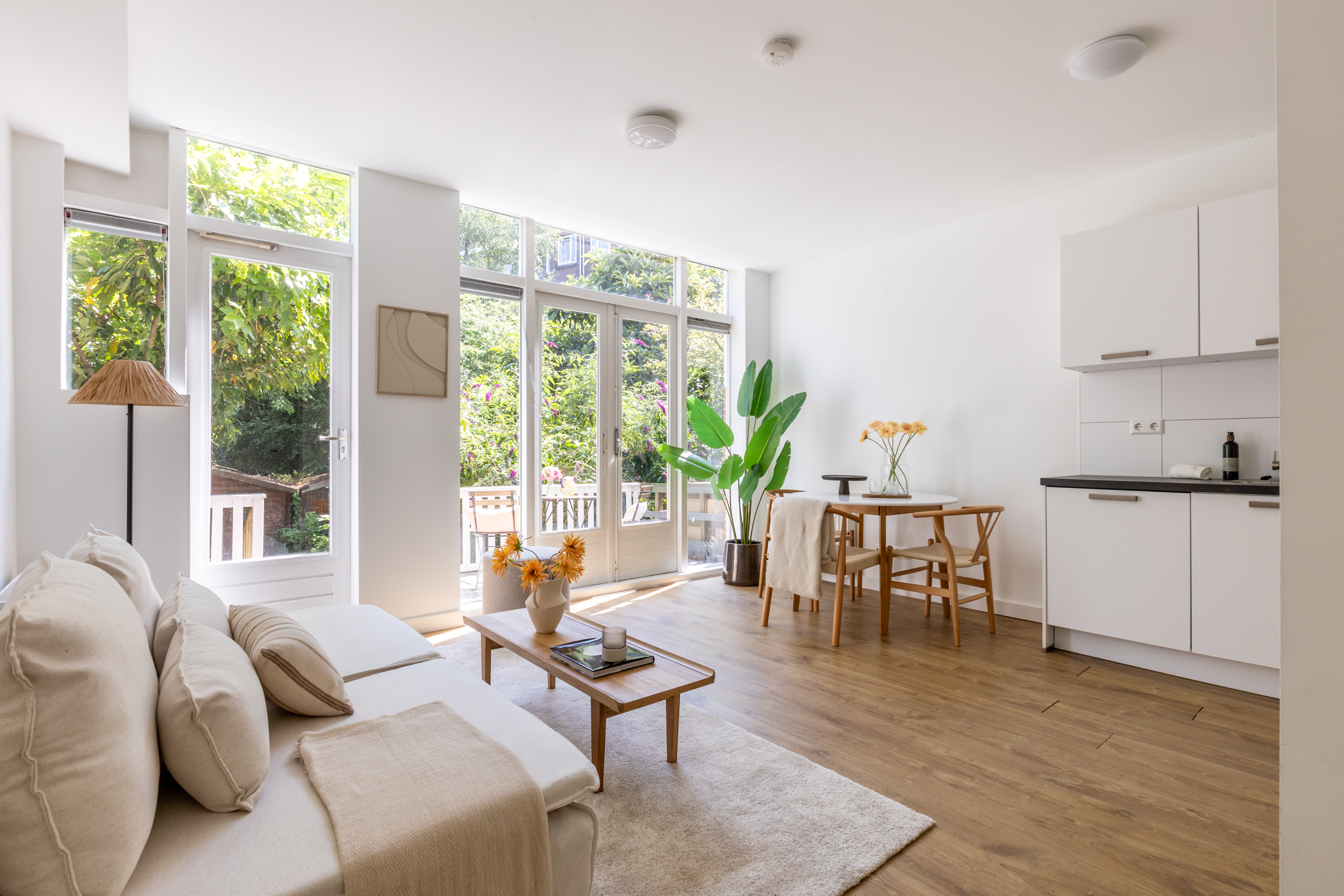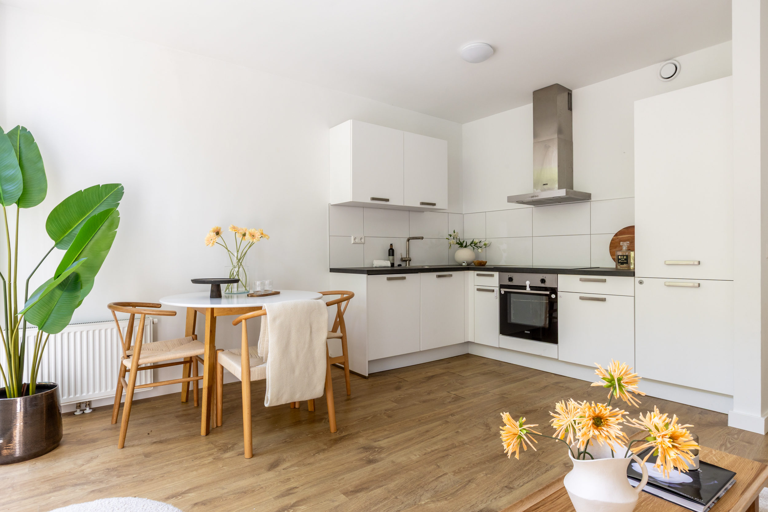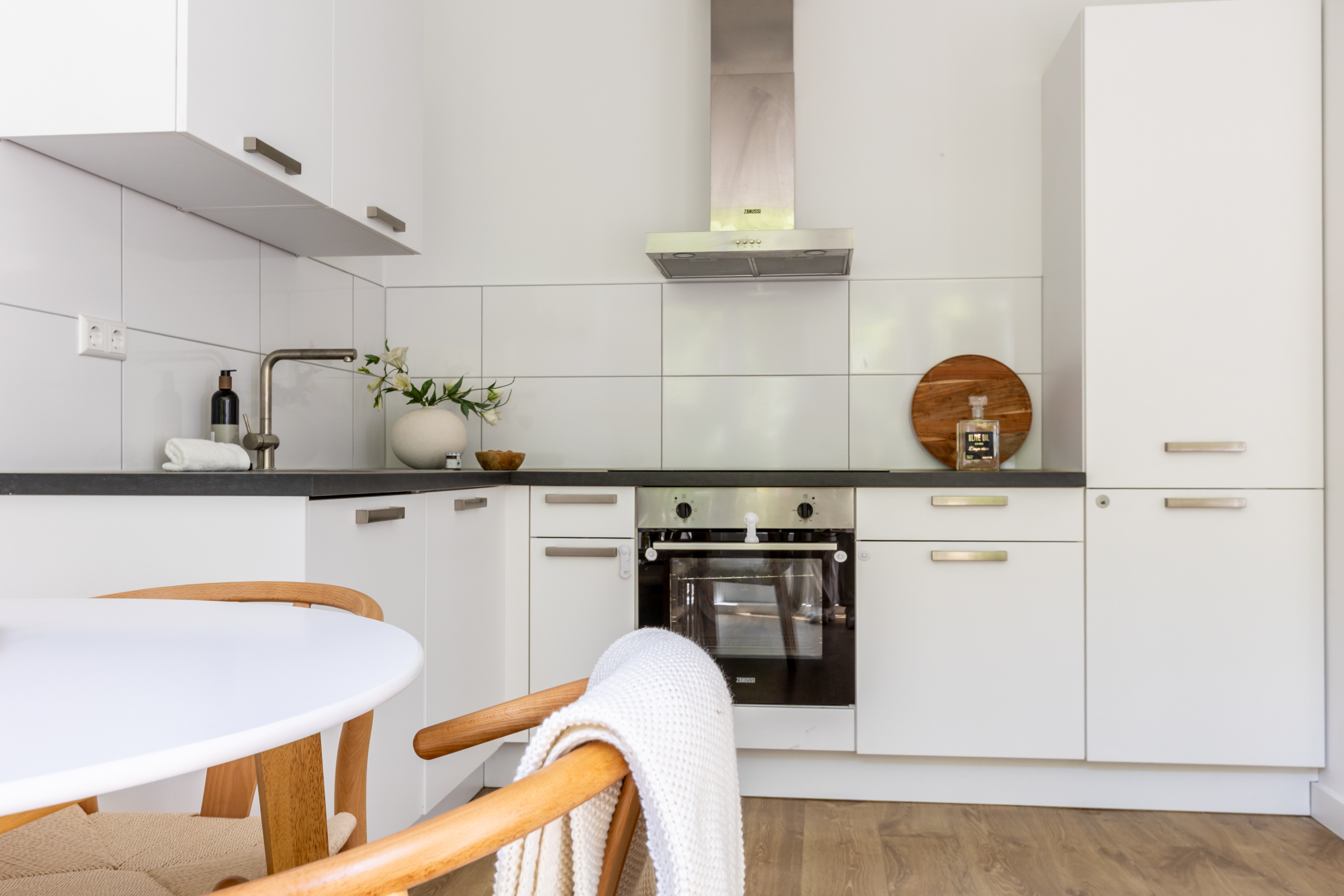 Je komt binnen via je eigen voordeur. De hal vormt het centrale punt in de woning en geeft toegang tot alle vertrekken. Aan de achterzijde vind je de lichte woonkamer met openslaande deuren naar de tuin. De open keuken is strak en modern uitgevoerd en voorzien van diverse inbouwapparatuur, waaronder een inductiekookplaat, afzuigkap, oven, koelkast, vriezer en vaatwasser. Vanuit de woonkamer kijk je uit op het ruime terras en het groen van de tuin—een heerlijk verlengstuk van je leefruimte.