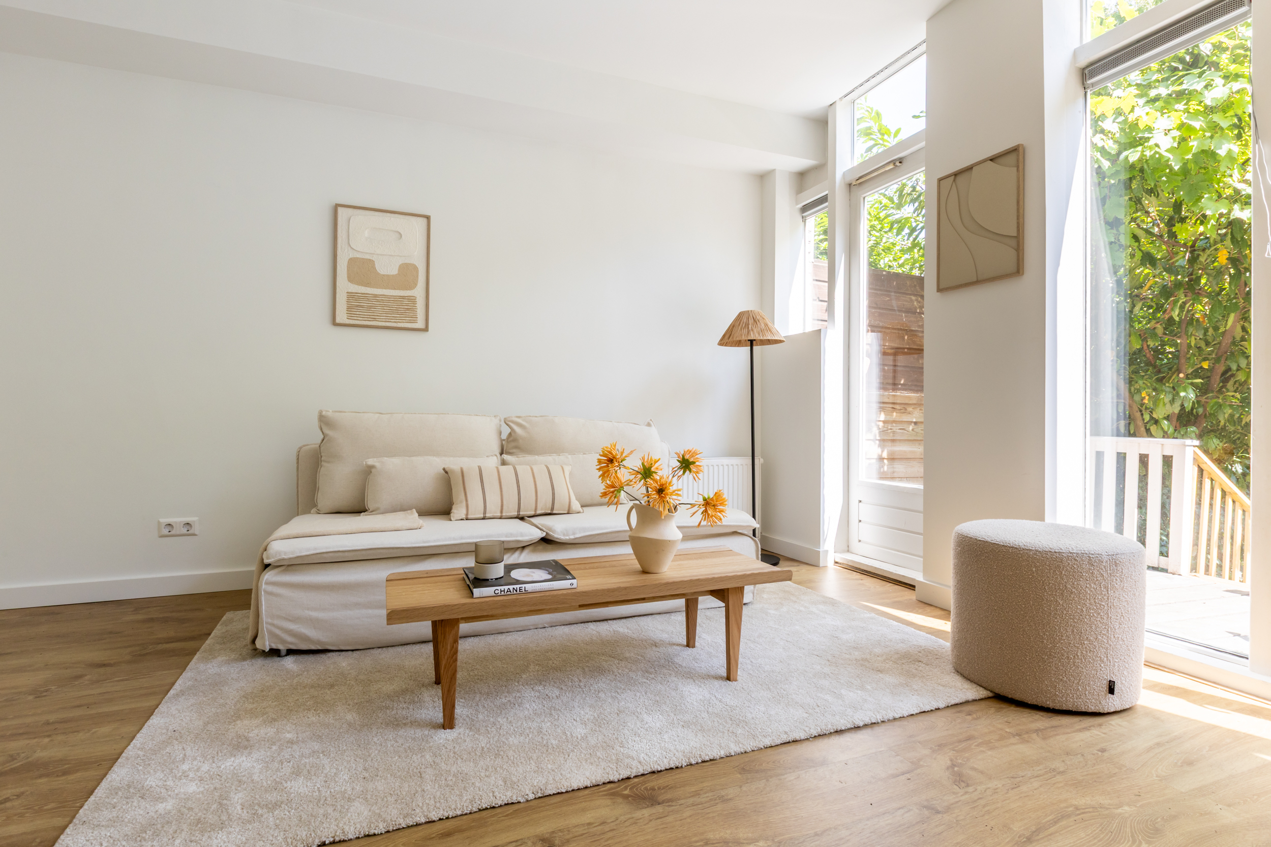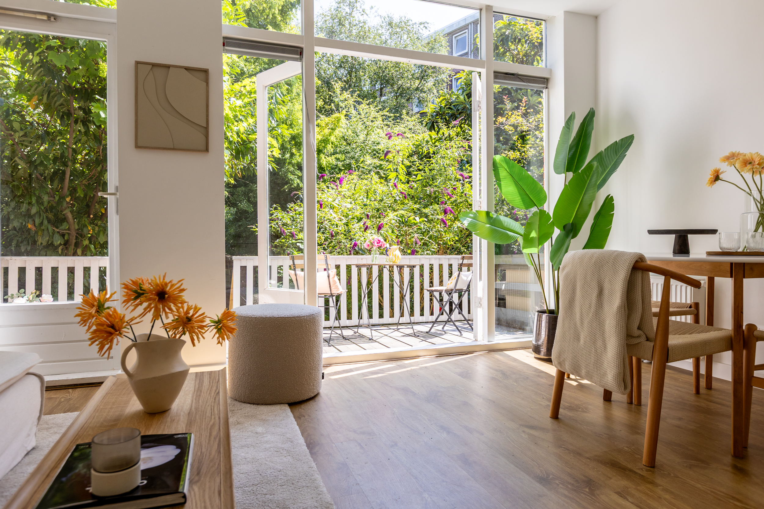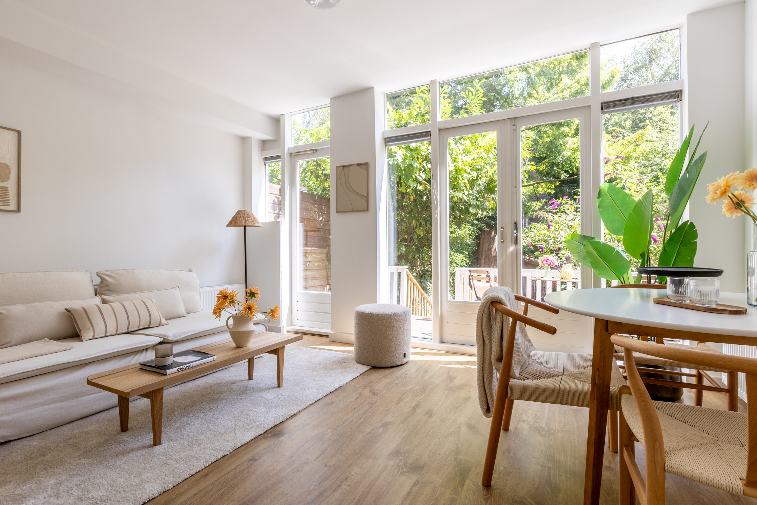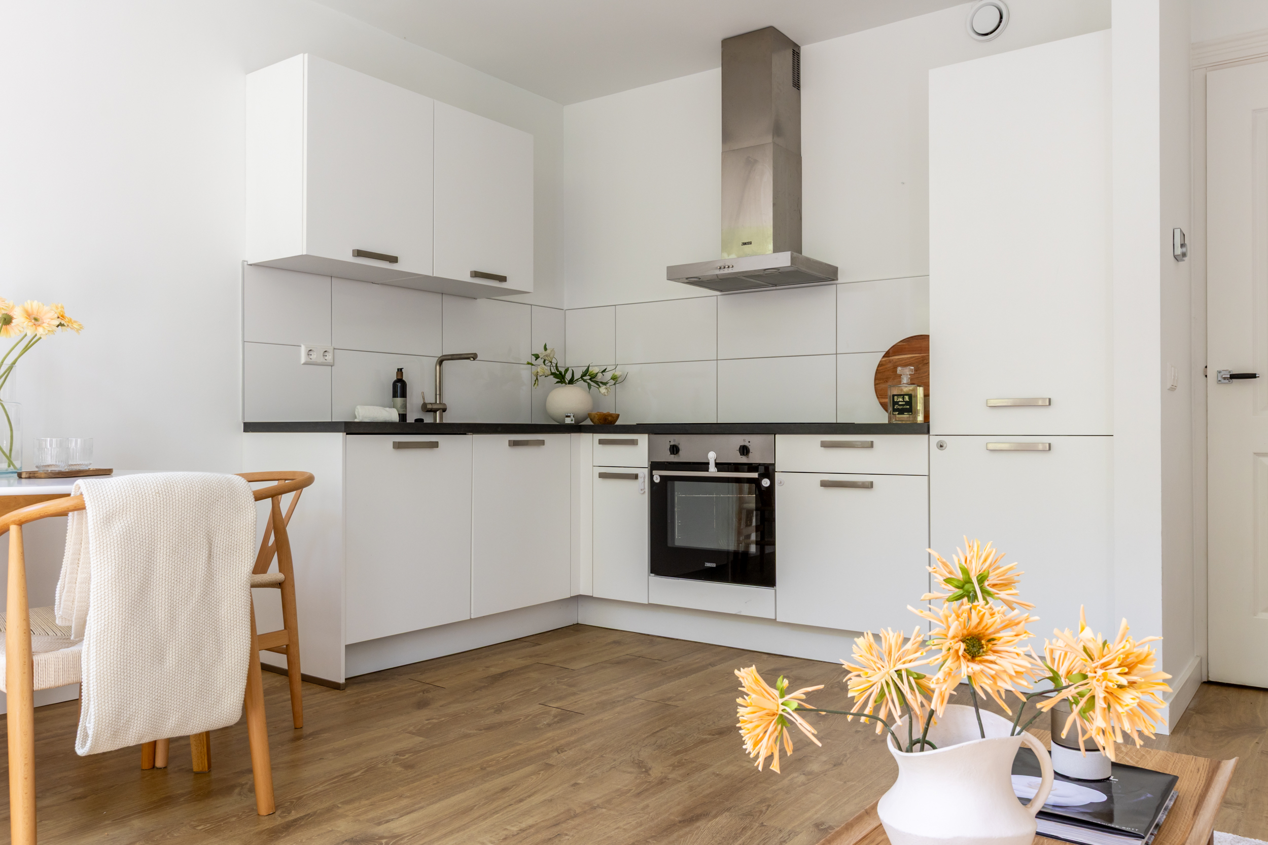 Je komt binnen via je eigen voordeur. De hal vormt het centrale punt in de woning en geeft toegang tot alle vertrekken. Aan de achterzijde vind je de lichte woonkamer met openslaande deuren naar de tuin. De open keuken is strak en modern uitgevoerd en voorzien van diverse inbouwapparatuur, waaronder een inductiekookplaat, afzuigkap, oven, koelkast, vriezer en vaatwasser. Vanuit de woonkamer kijk je uit op het ruime terras en het groen van de tuin—een heerlijk verlengstuk van je leefruimte.