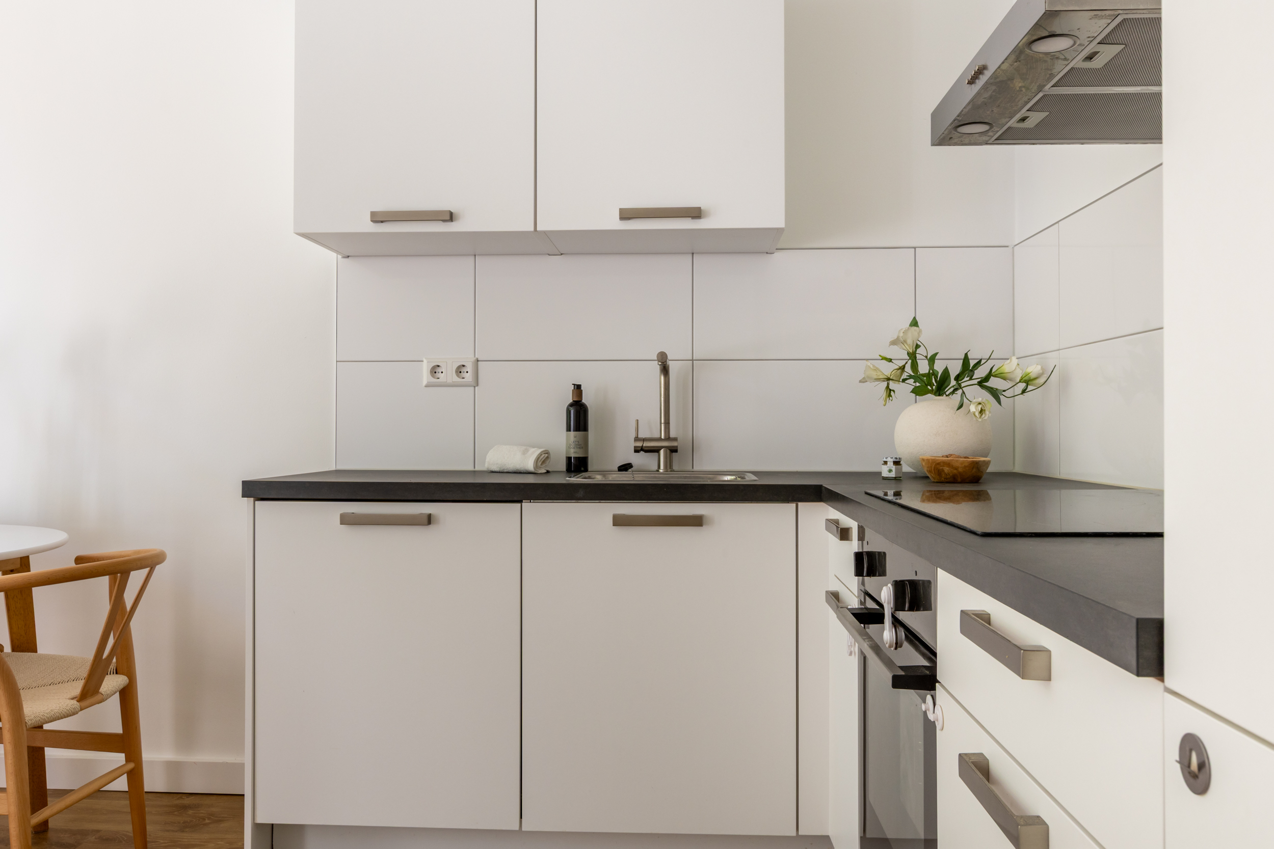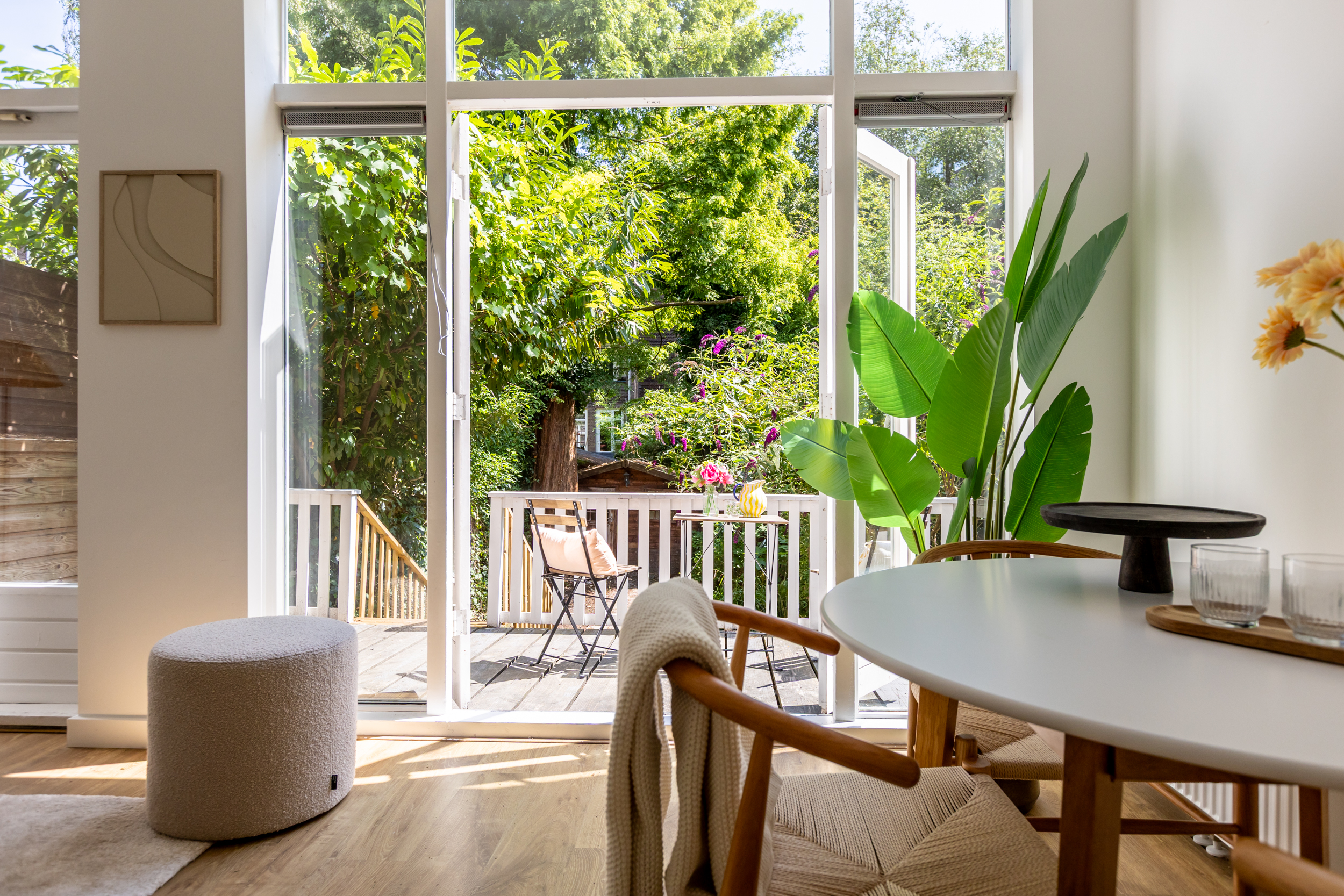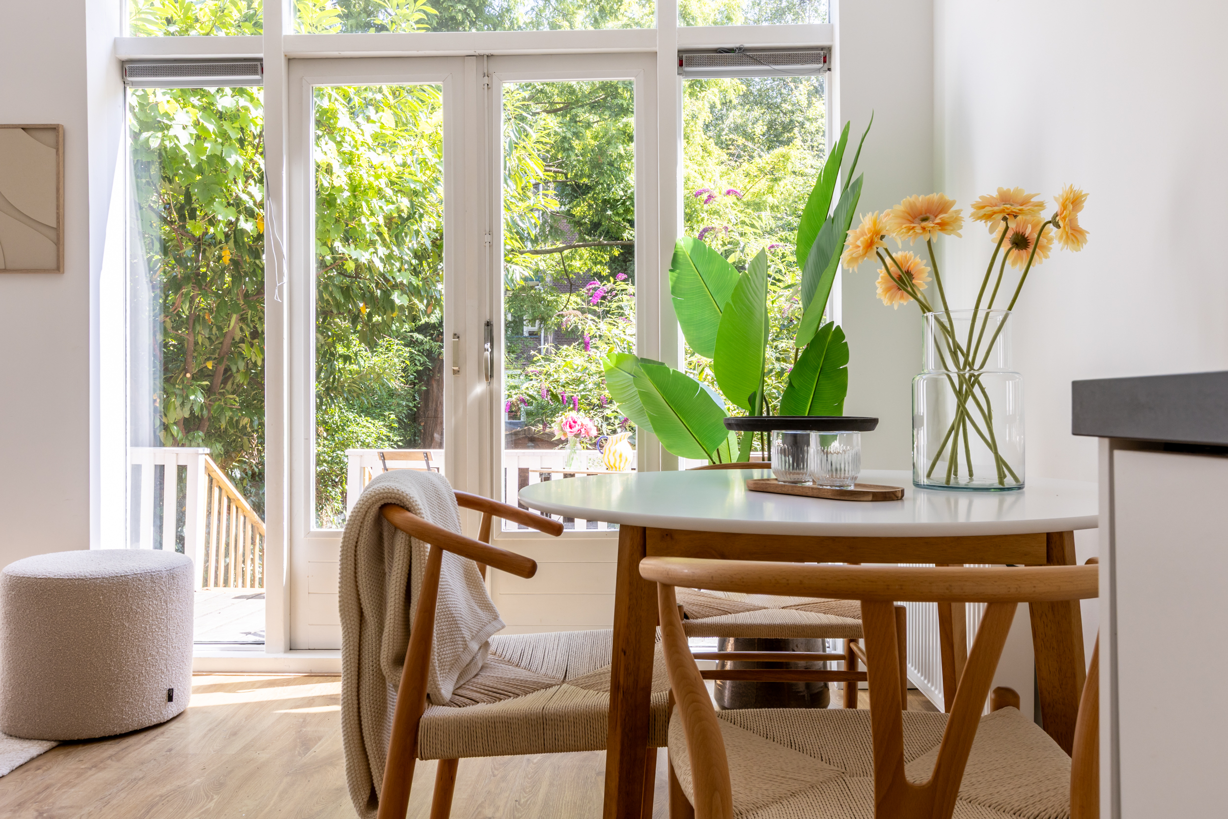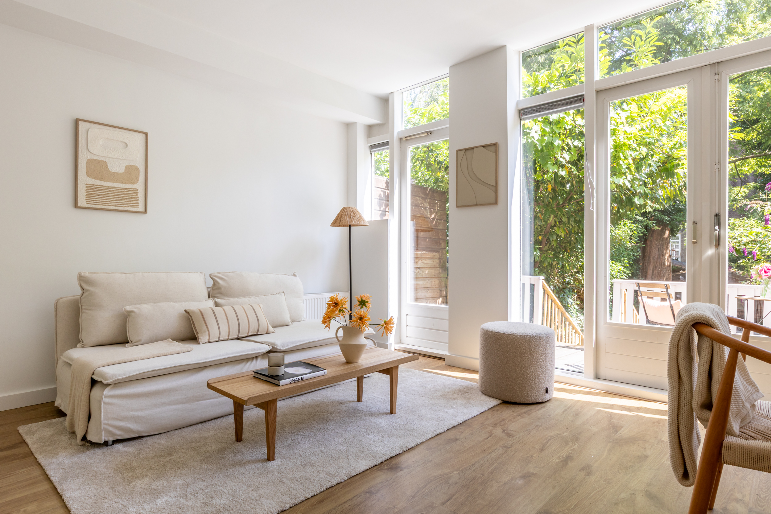 Je komt binnen via je eigen voordeur. De hal vormt het centrale punt in de woning en geeft toegang tot alle vertrekken. Aan de achterzijde vind je de lichte woonkamer met openslaande deuren naar de tuin. De open keuken is strak en modern uitgevoerd en voorzien van diverse inbouwapparatuur, waaronder een inductiekookplaat, afzuigkap, oven, koelkast, vriezer en vaatwasser. Vanuit de woonkamer kijk je uit op het ruime terras en het groen van de tuin—een heerlijk verlengstuk van je leefruimte.