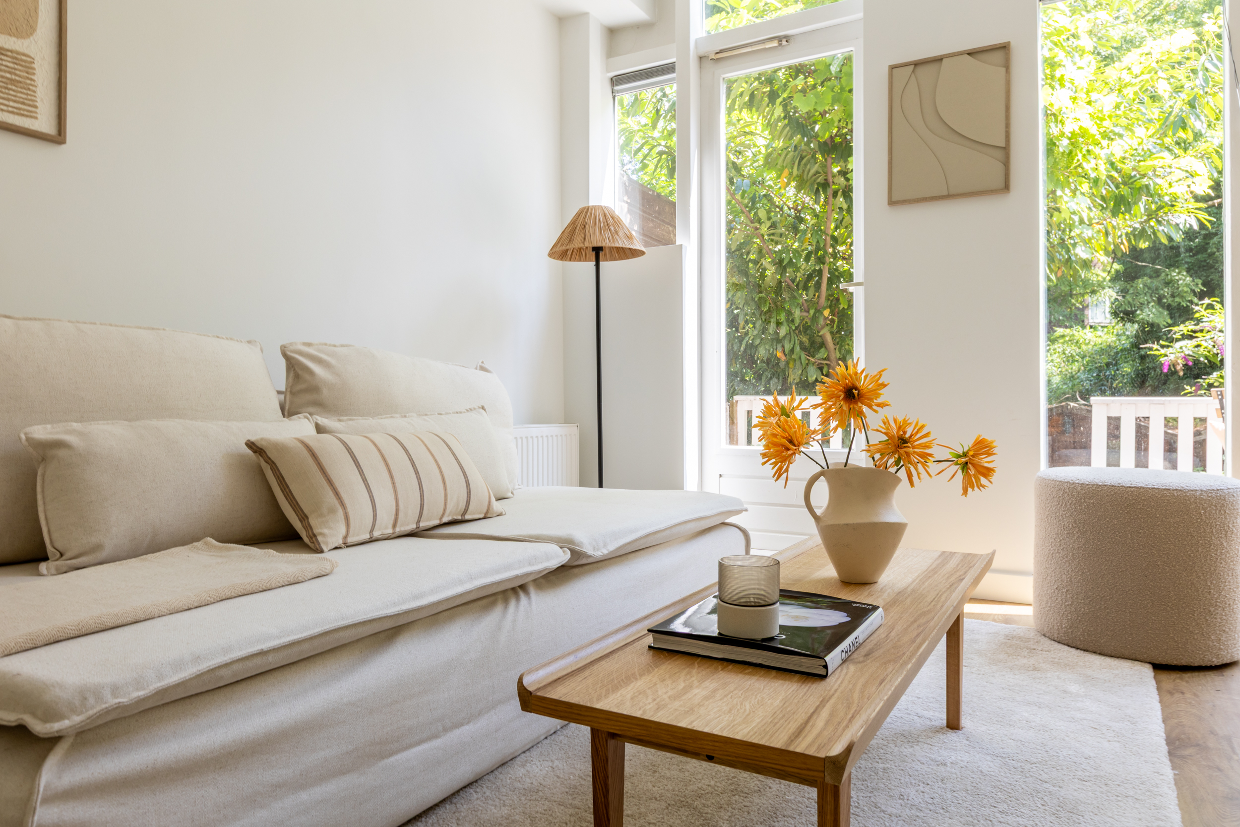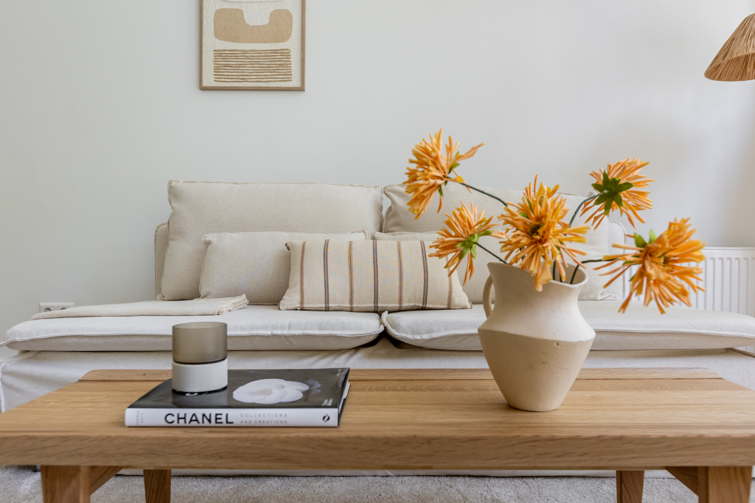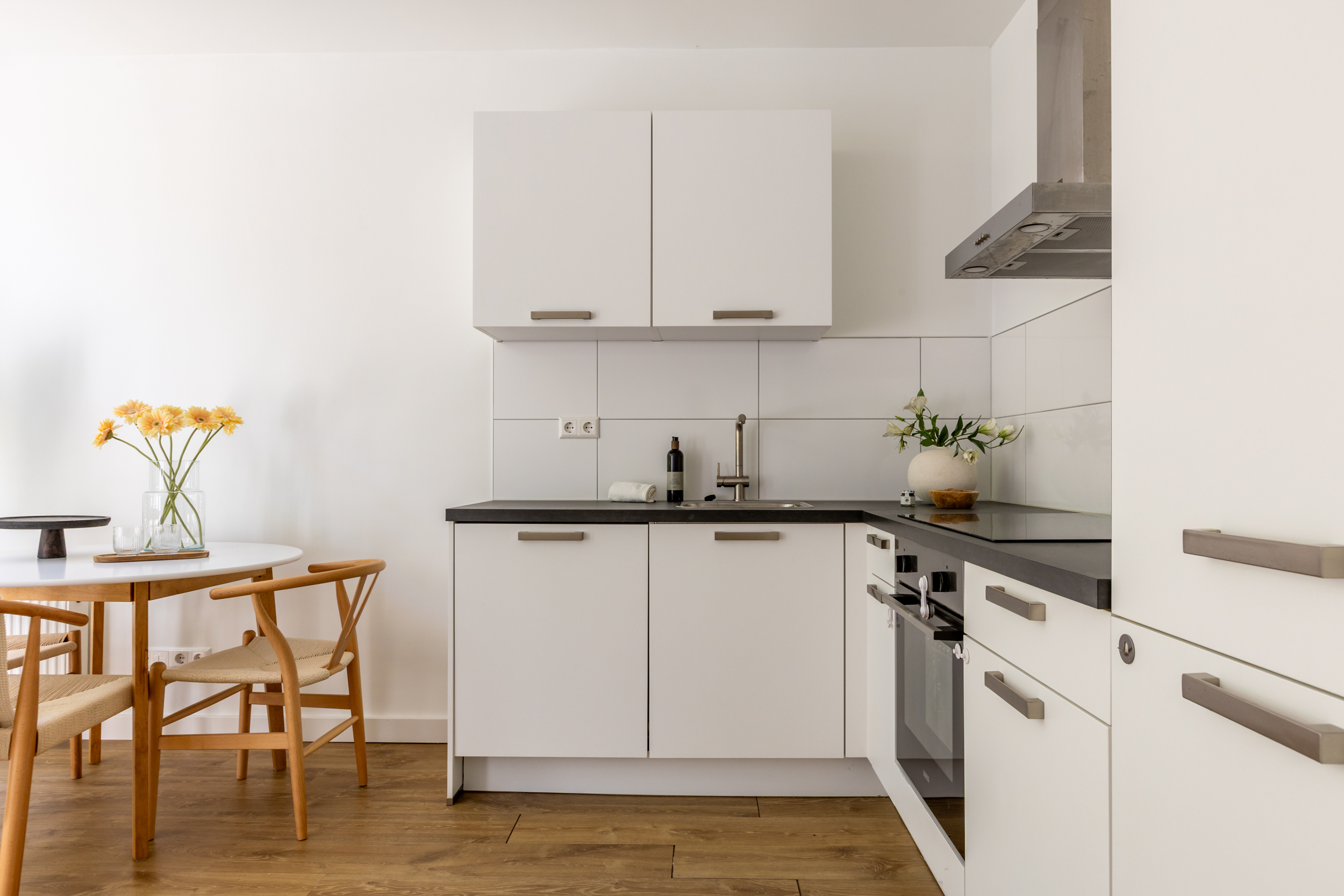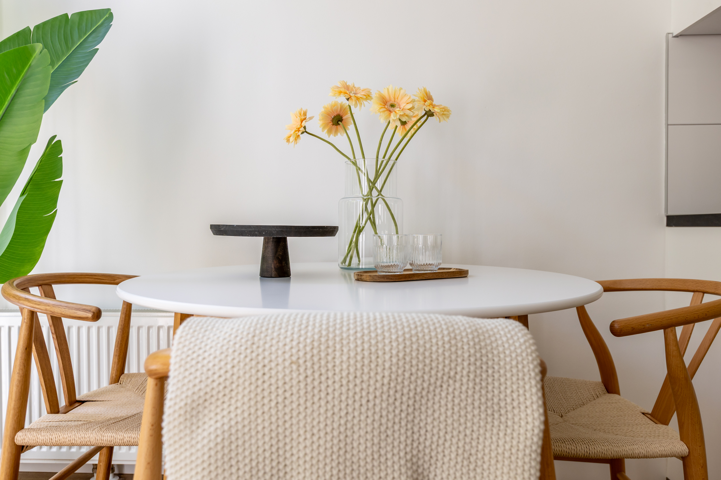 Je komt binnen via je eigen voordeur. De hal vormt het centrale punt in de woning en geeft toegang tot alle vertrekken. Aan de achterzijde vind je de lichte woonkamer met openslaande deuren naar de tuin. De open keuken is strak en modern uitgevoerd en voorzien van diverse inbouwapparatuur, waaronder een inductiekookplaat, afzuigkap, oven, koelkast, vriezer en vaatwasser. Vanuit de woonkamer kijk je uit op het ruime terras en het groen van de tuin—een heerlijk verlengstuk van je leefruimte.
