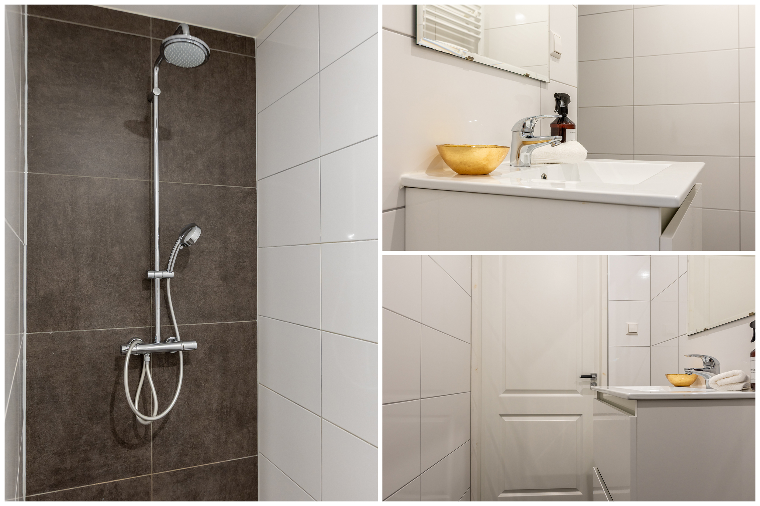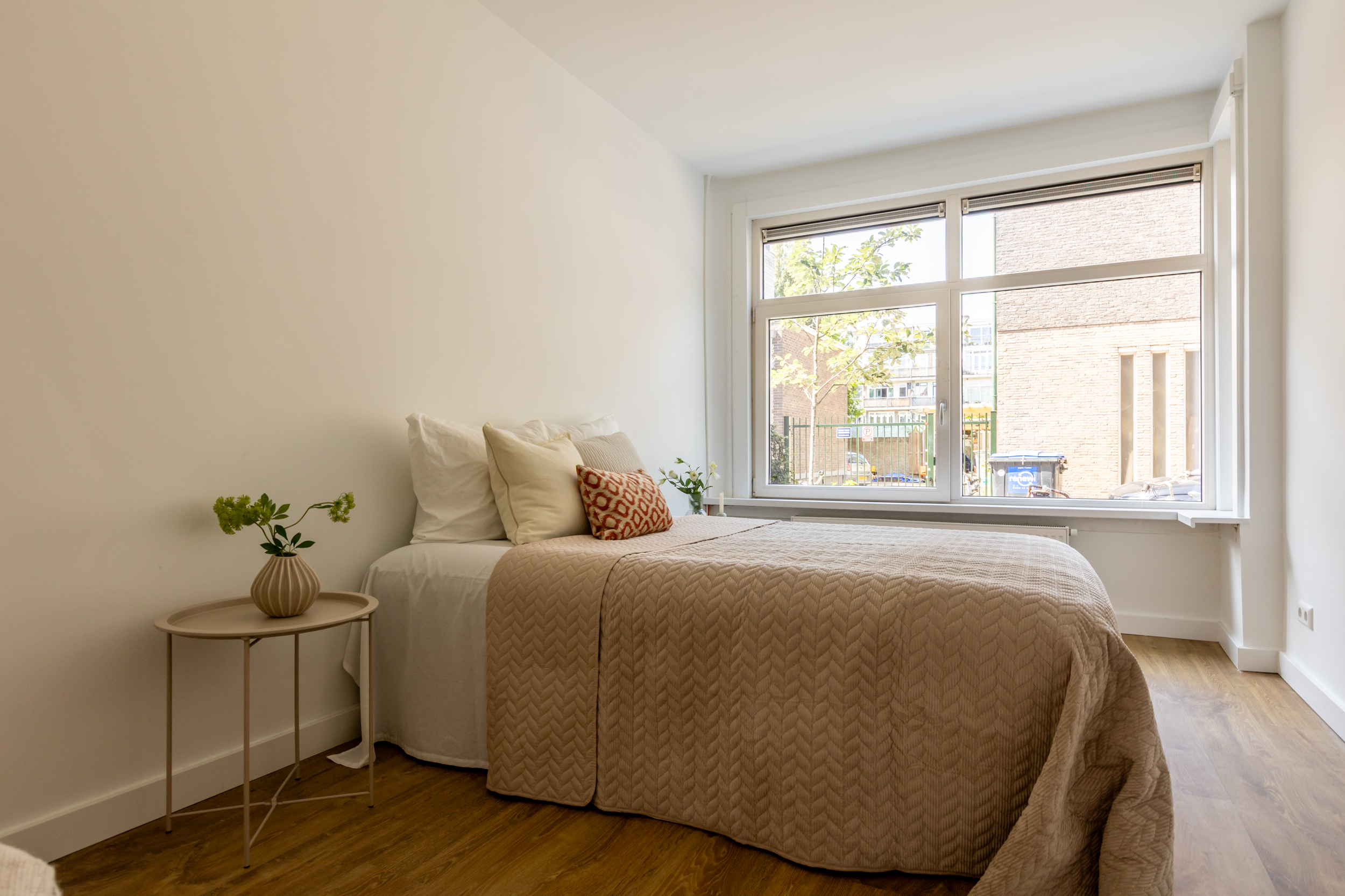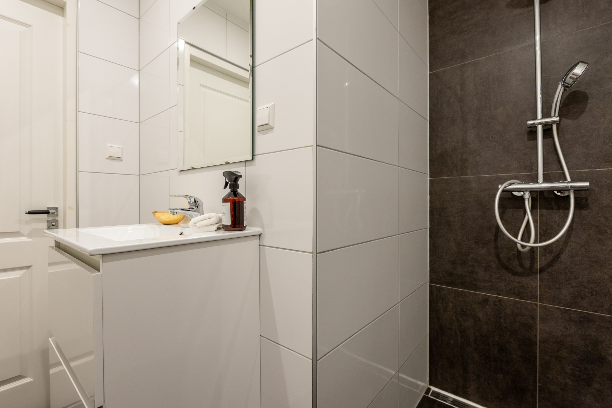 Aan de voorzijde ligt de ruime slaapkamer met groot raam, wat zorgt voor veel daglicht. De badkamer is keurig afgewerkt en voorzien van een douche en wastafel. Daarnaast is er een apart toilet en een aparte wasruimte met plek voor de wasmachine en droger.