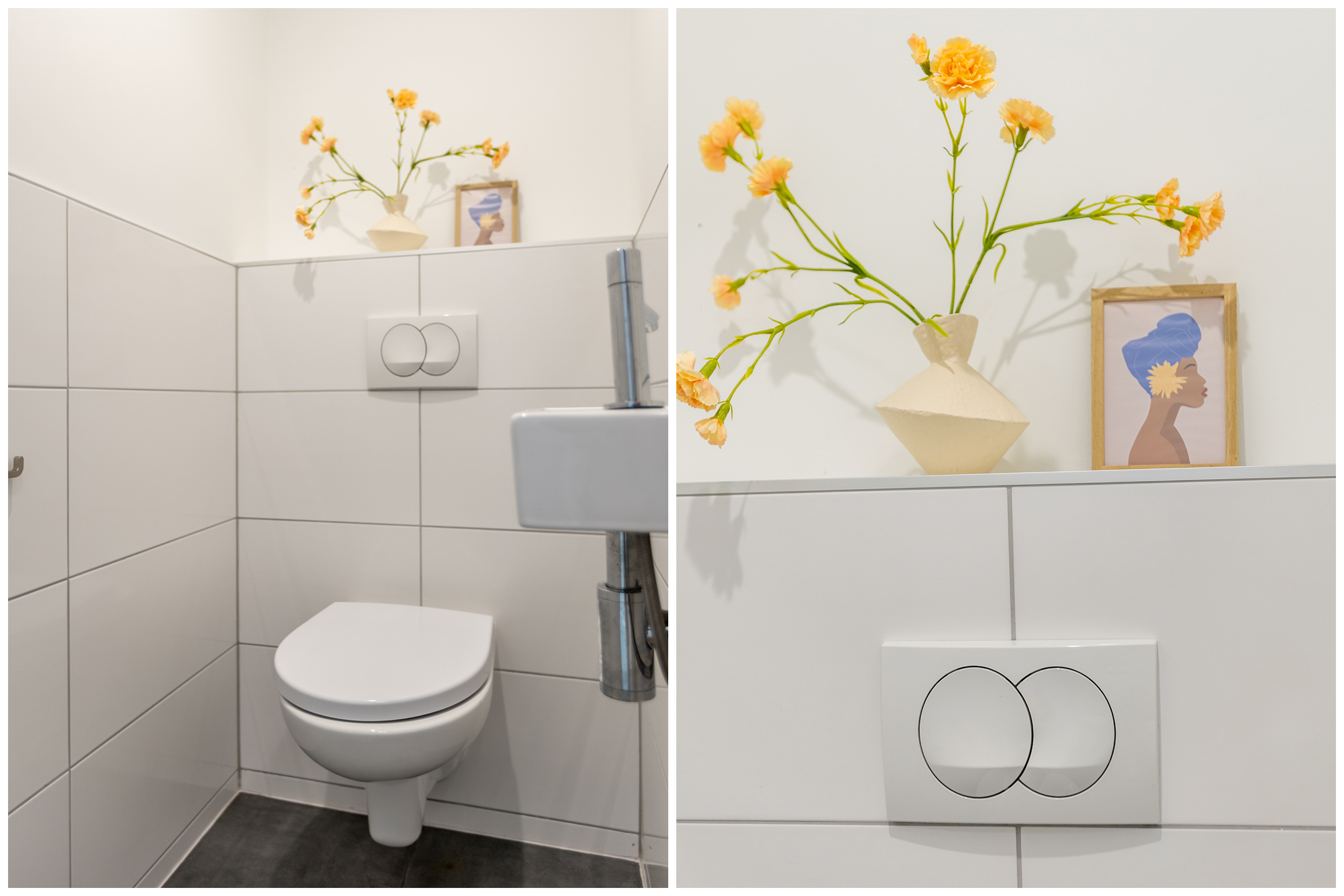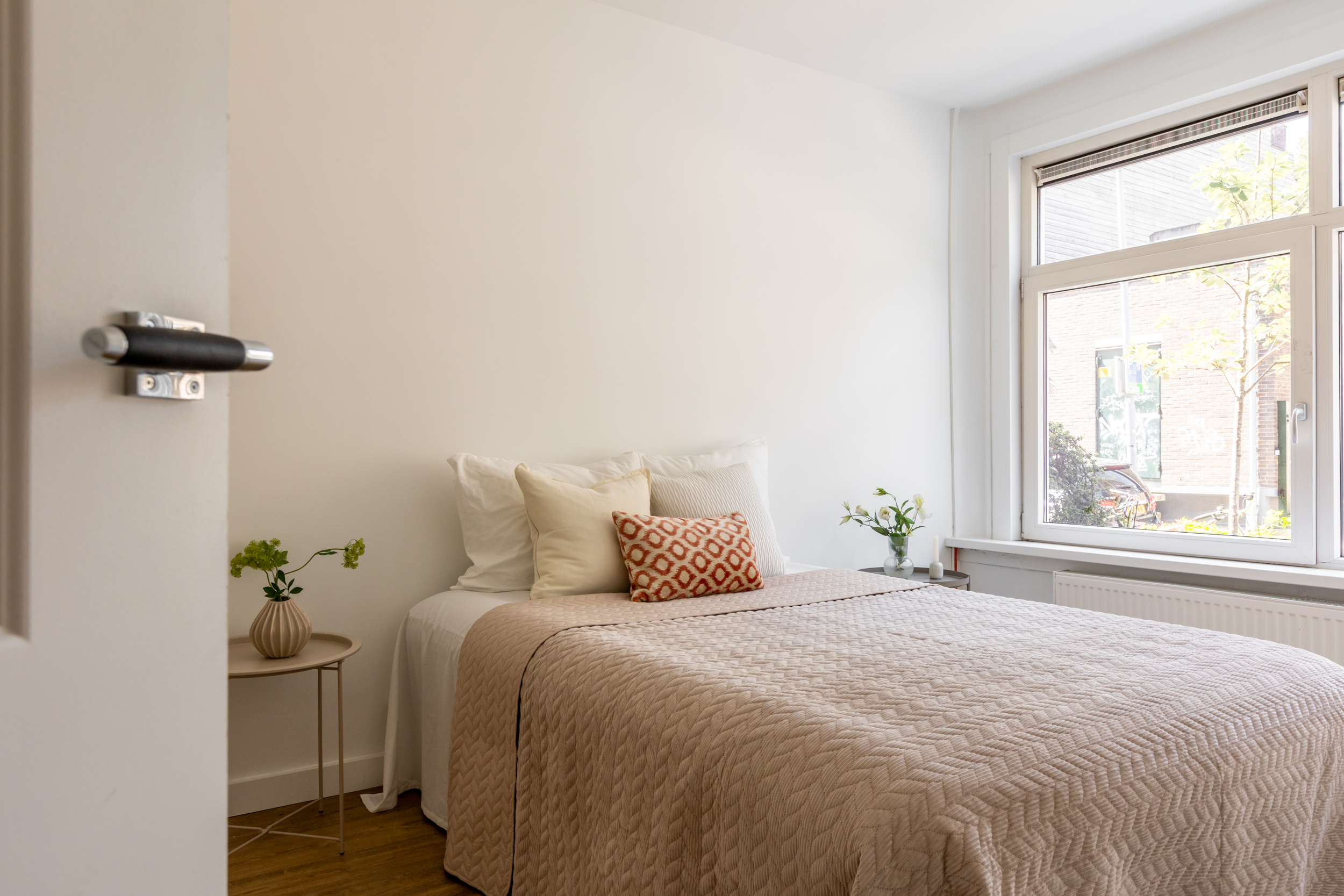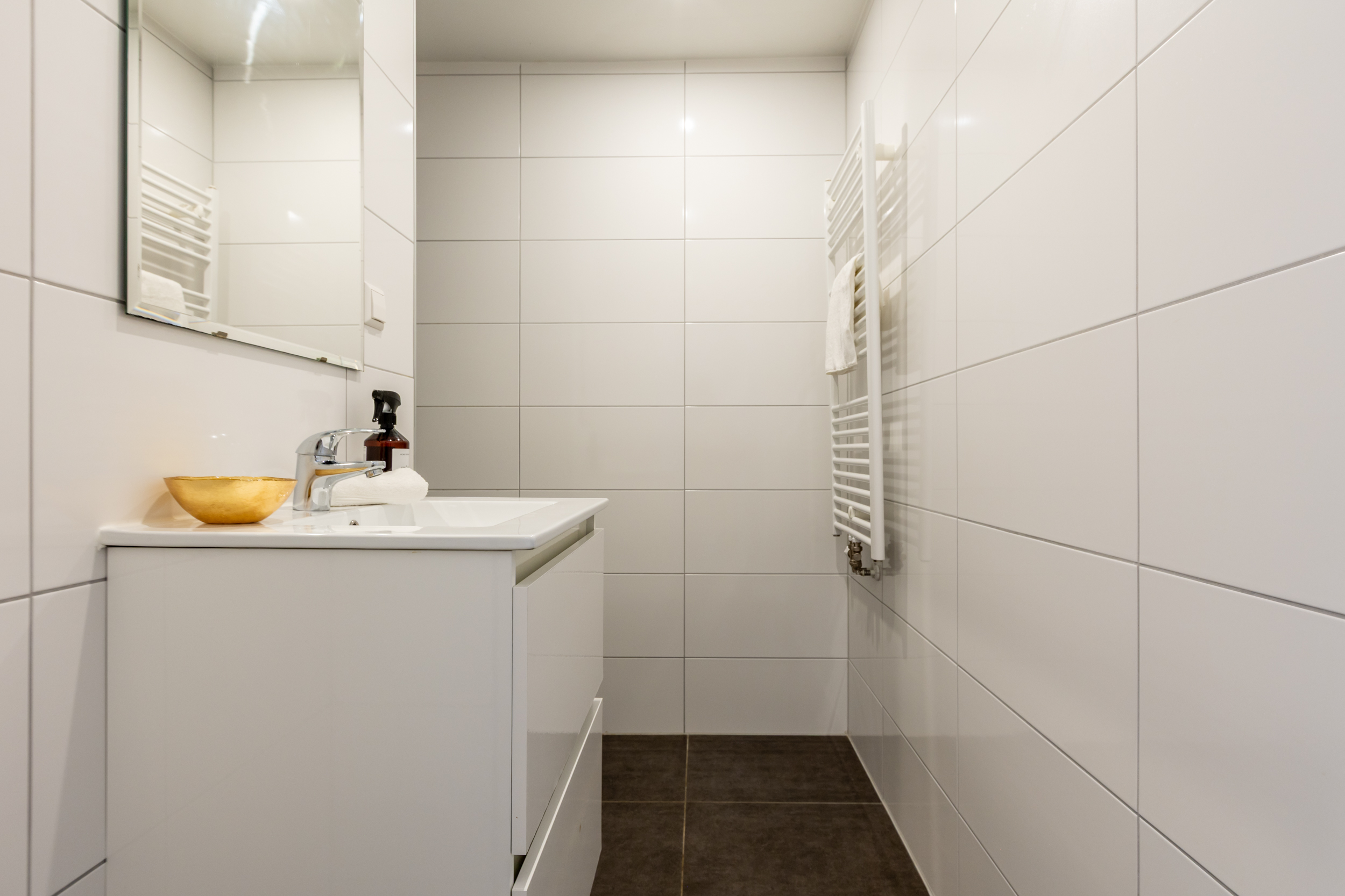 Aan de voorzijde ligt de ruime slaapkamer met groot raam, wat zorgt voor veel daglicht. De badkamer is keurig afgewerkt en voorzien van een douche en wastafel. Daarnaast is er een apart toilet en een aparte wasruimte met plek voor de wasmachine en droger.