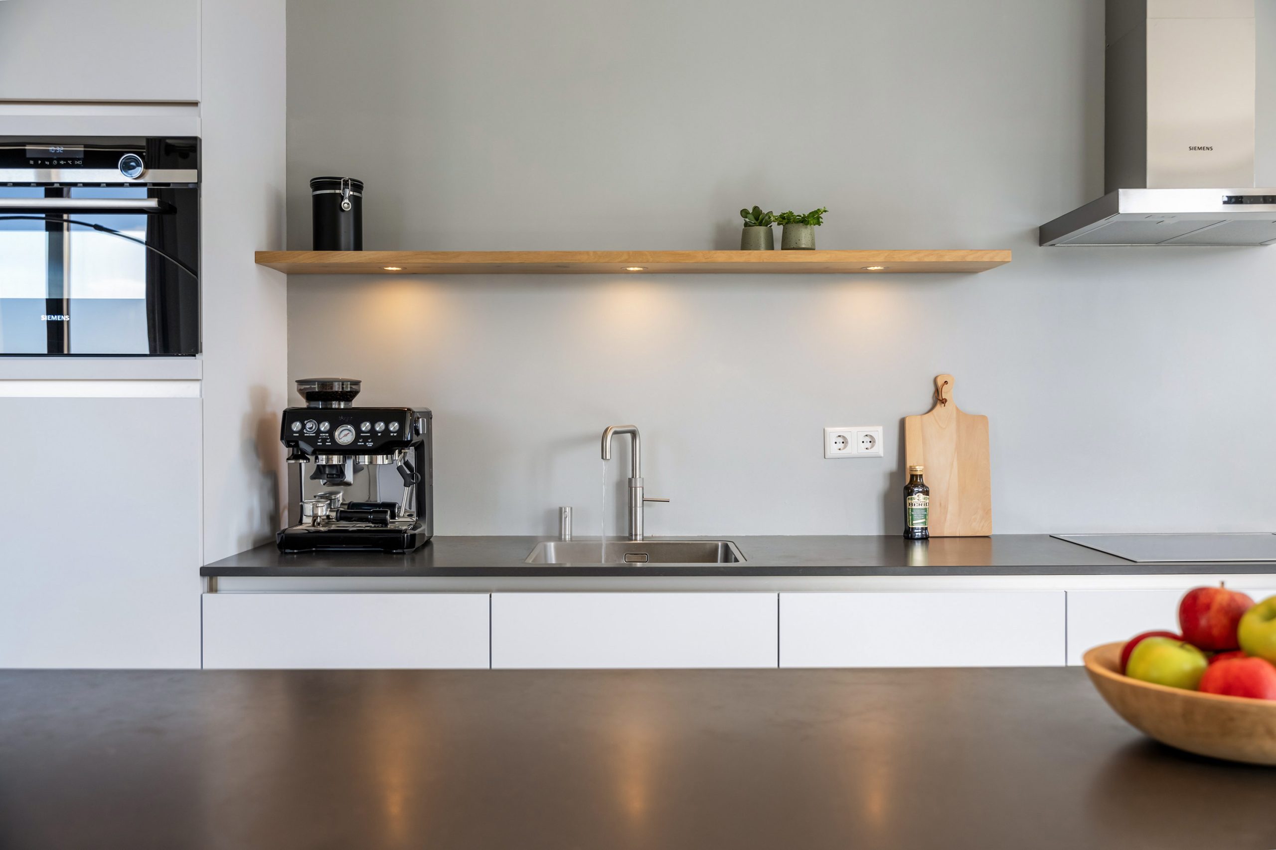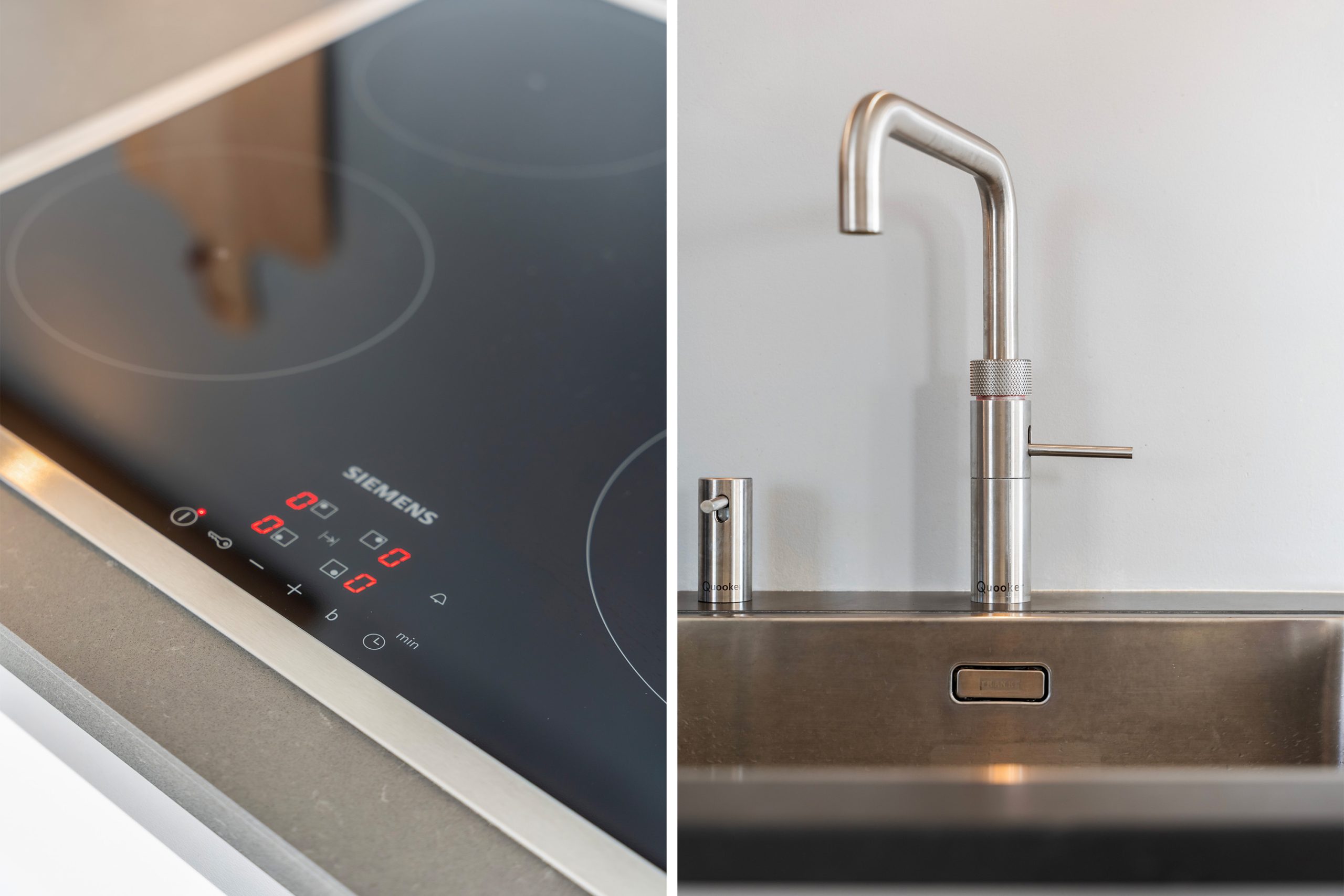 De open keuken met kookeiland vormt het hart van de woning. Deze is uitgerust met Quooker en diverse inbouwapparatuur, waaronder een Siemens inductiekookplaat, combimagnetron, afzuigkap, koelkast en een vaatwasser. De keuken is niet alleen functioneel; het is een plek waar je kookt én leeft. Aan het eiland kun je gezellig zitten, en er is ruimte genoeg voor een grote eettafel waar je heerlijk kunt tafelen met vrienden of familie.