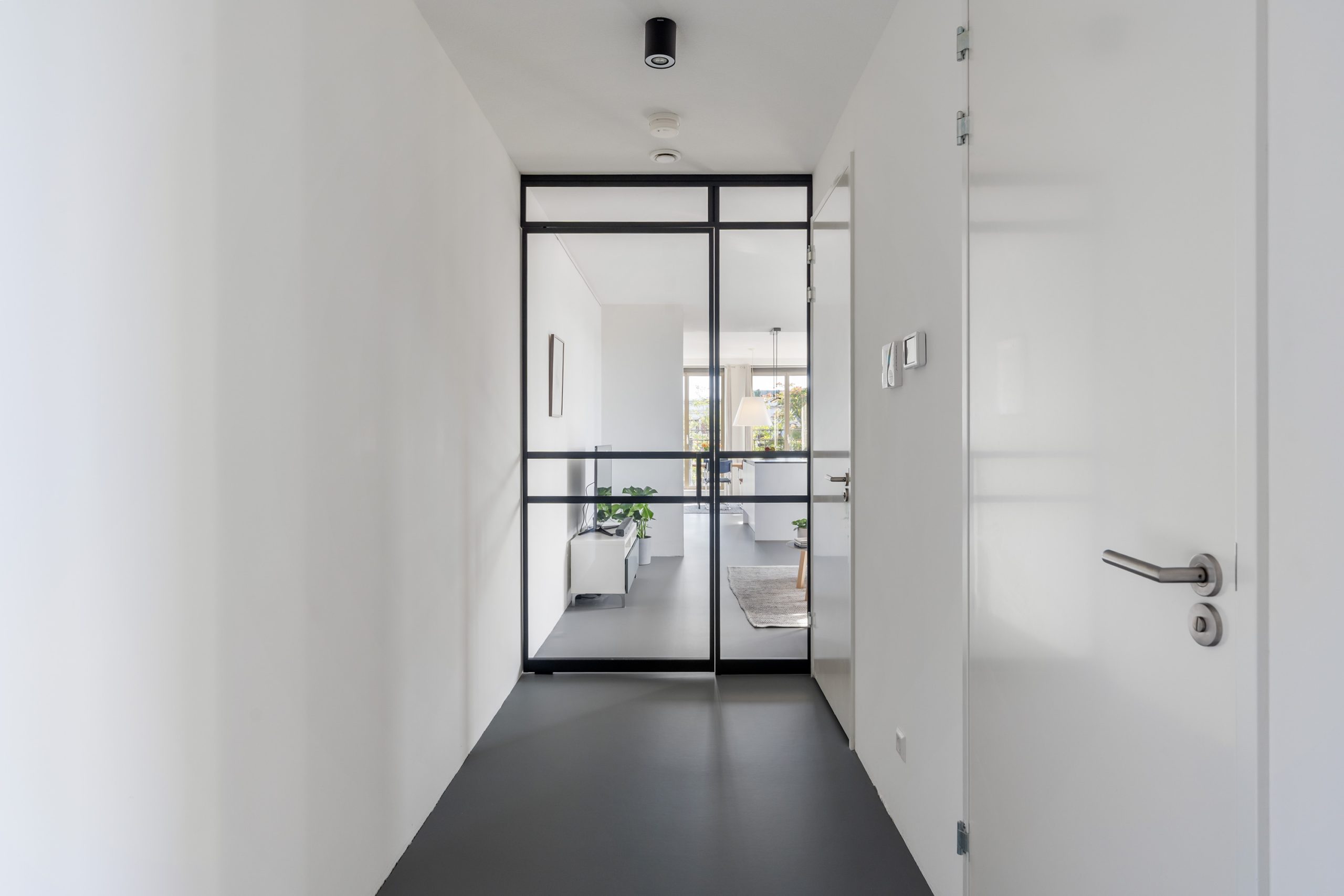 You enter through a long, open hallway with a modern design that leads you to the spacious living area, where the light and high-quality finish immediately stand out. The sleek flooring, large windows and white walls create a calm and modern foundation that complements any interior style.