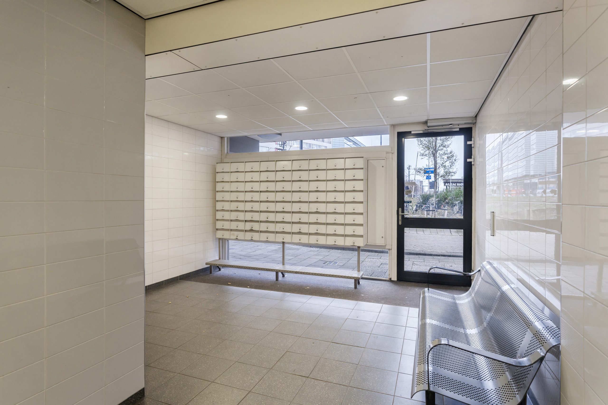 Afgesloten entree met bellentableau, brievenbussen, lift en trapopgang. Â
