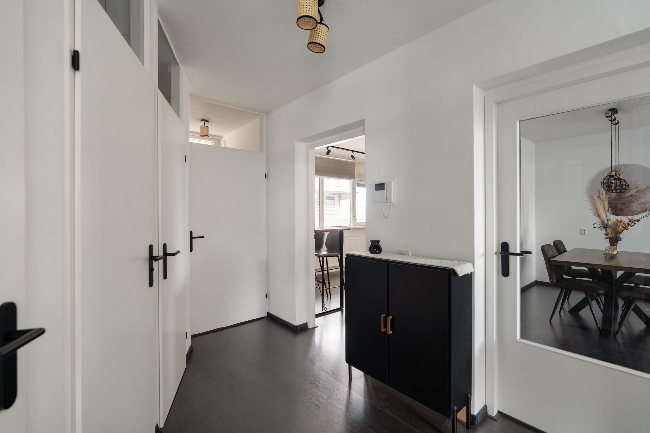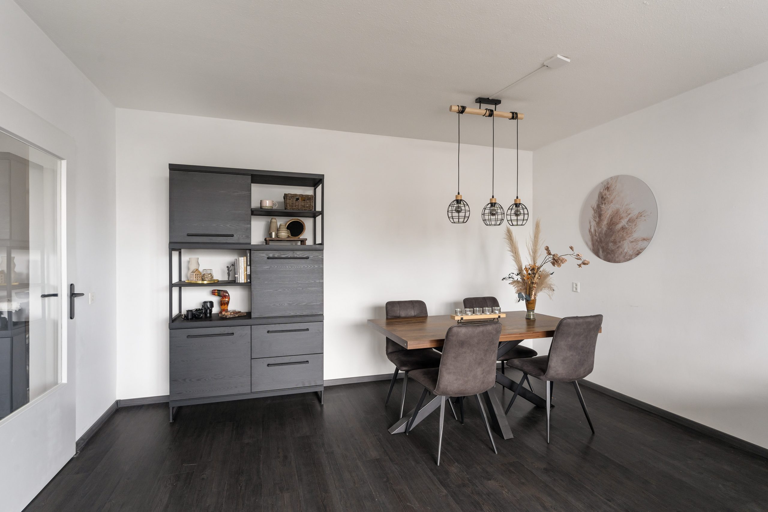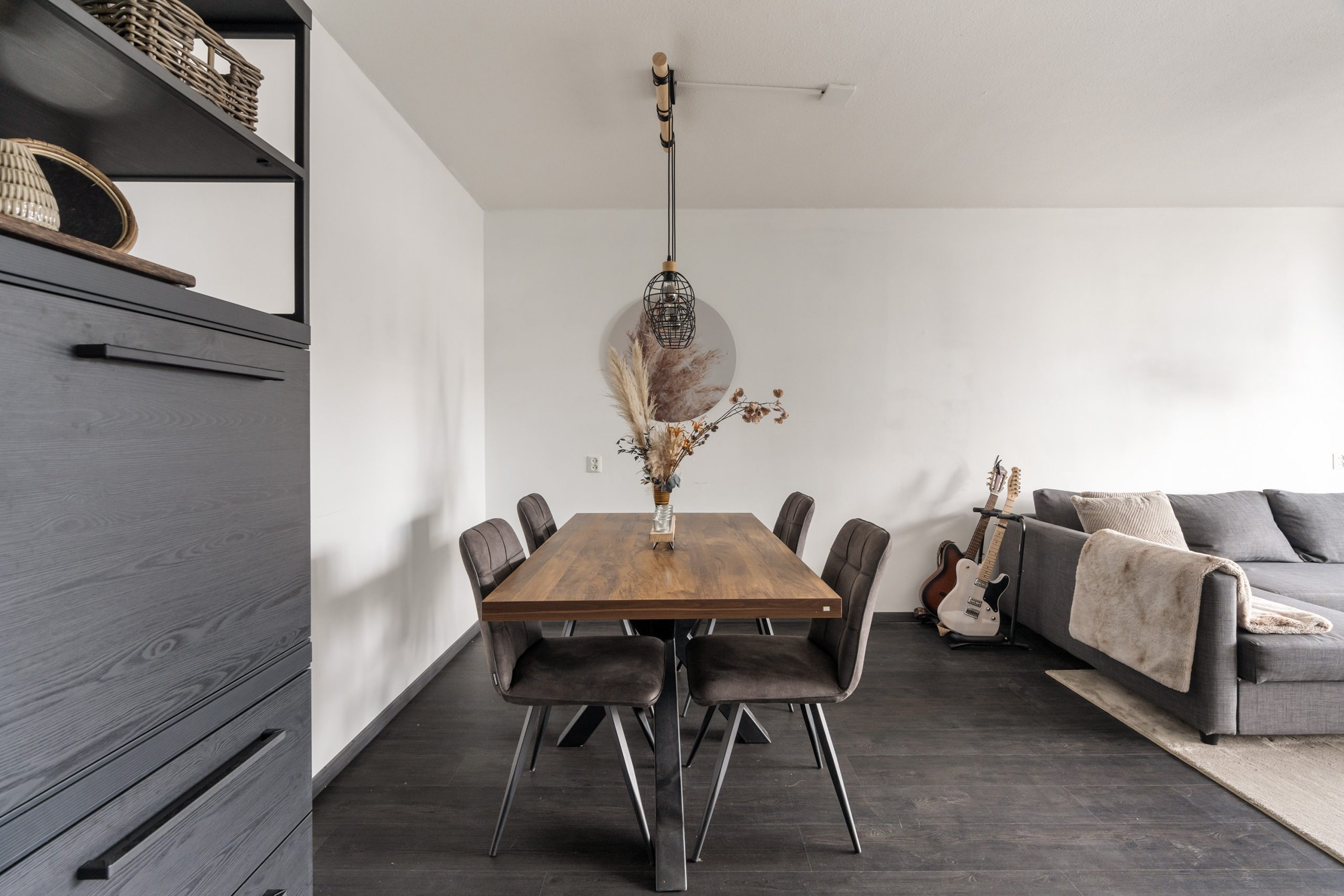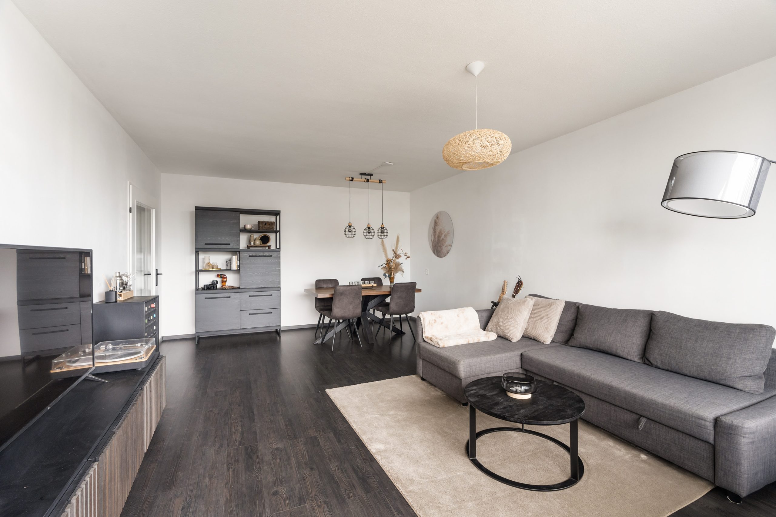 Hier betreed je het appartement via een ruime hal die toegang biedt tot alle vertrekken. De woonkamer vormt het hart van de woning. Een royale, lichte leefruimte waar de strakke wanden en donkere laminaatvloer een modern en stijlvol geheel vormen. Dankzij de grote raampartijen stroomt het daglicht rijkelijk naar binnen en ervaar je een gevoel van vrijheid en openheid. Er is volop ruimte voor zowel een comfortabele zithoek als een uitnodigende eettafel om avonden lang te tafelen met vrienden of familie.