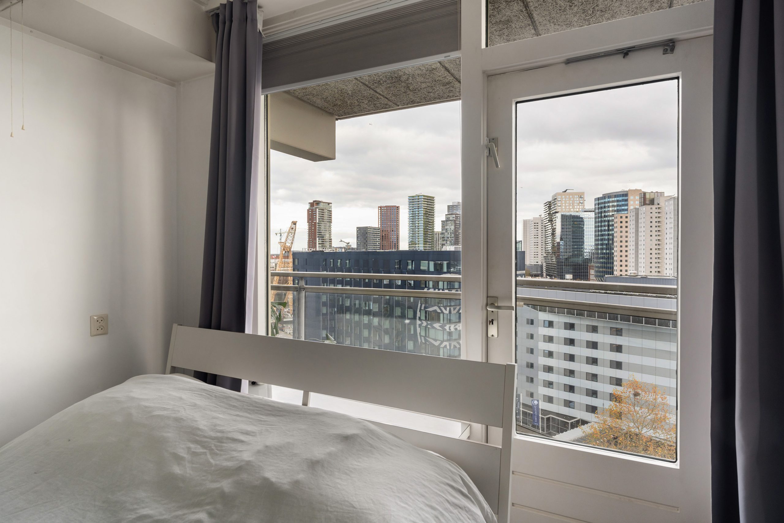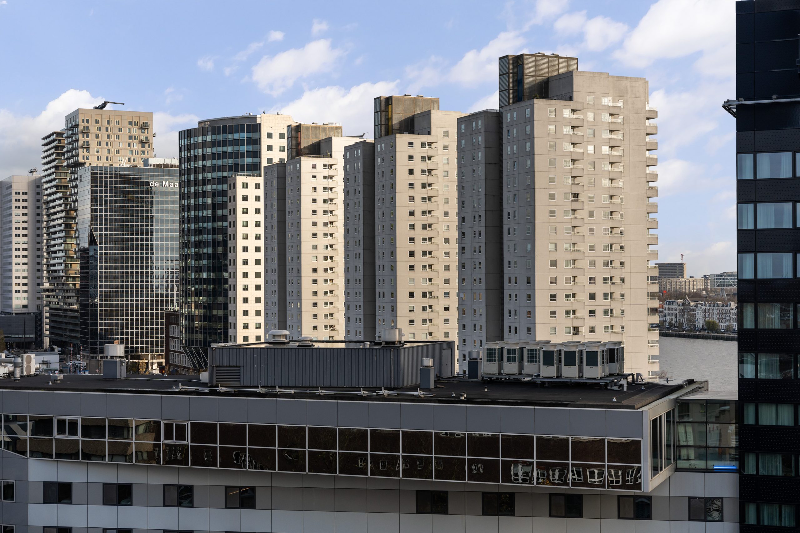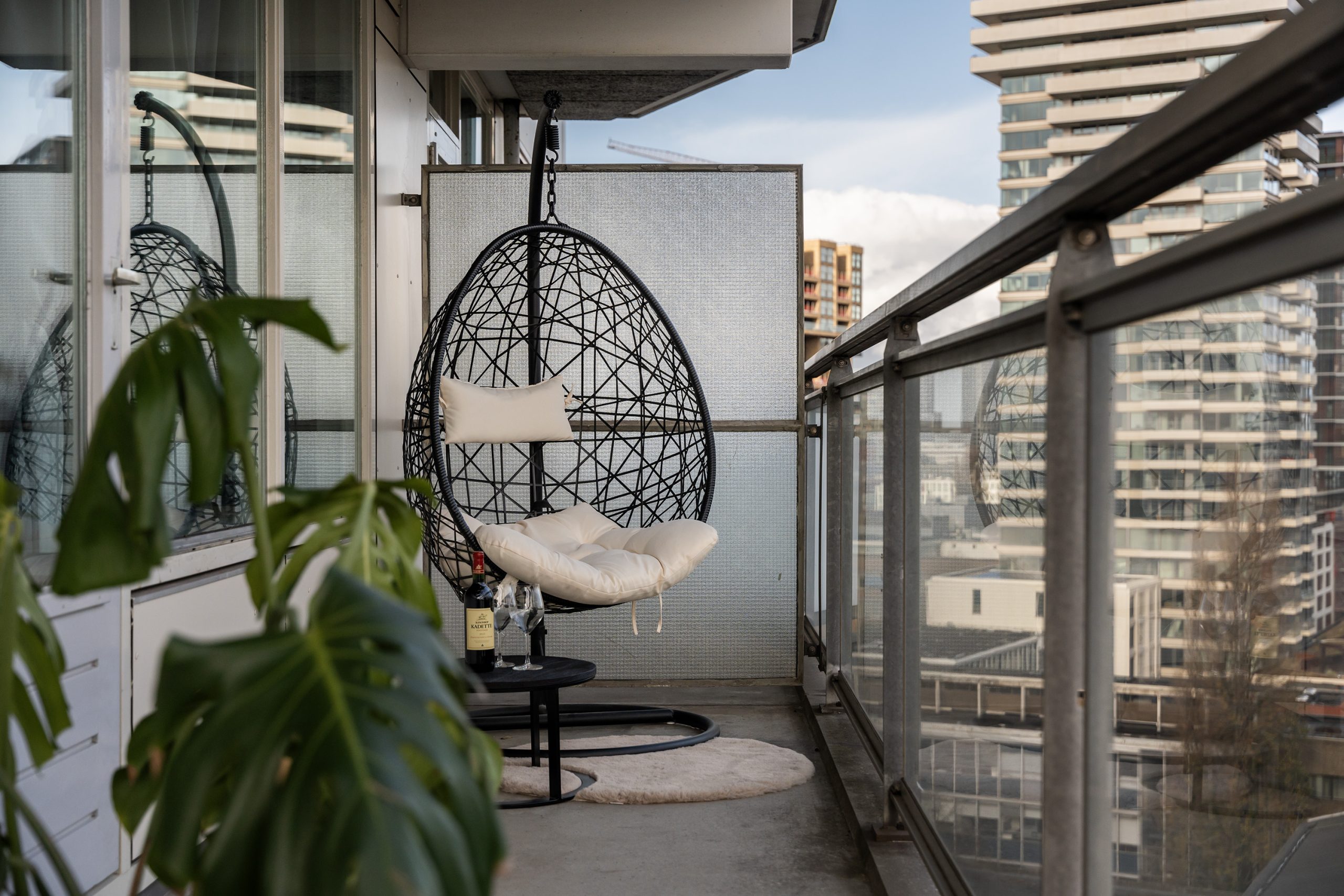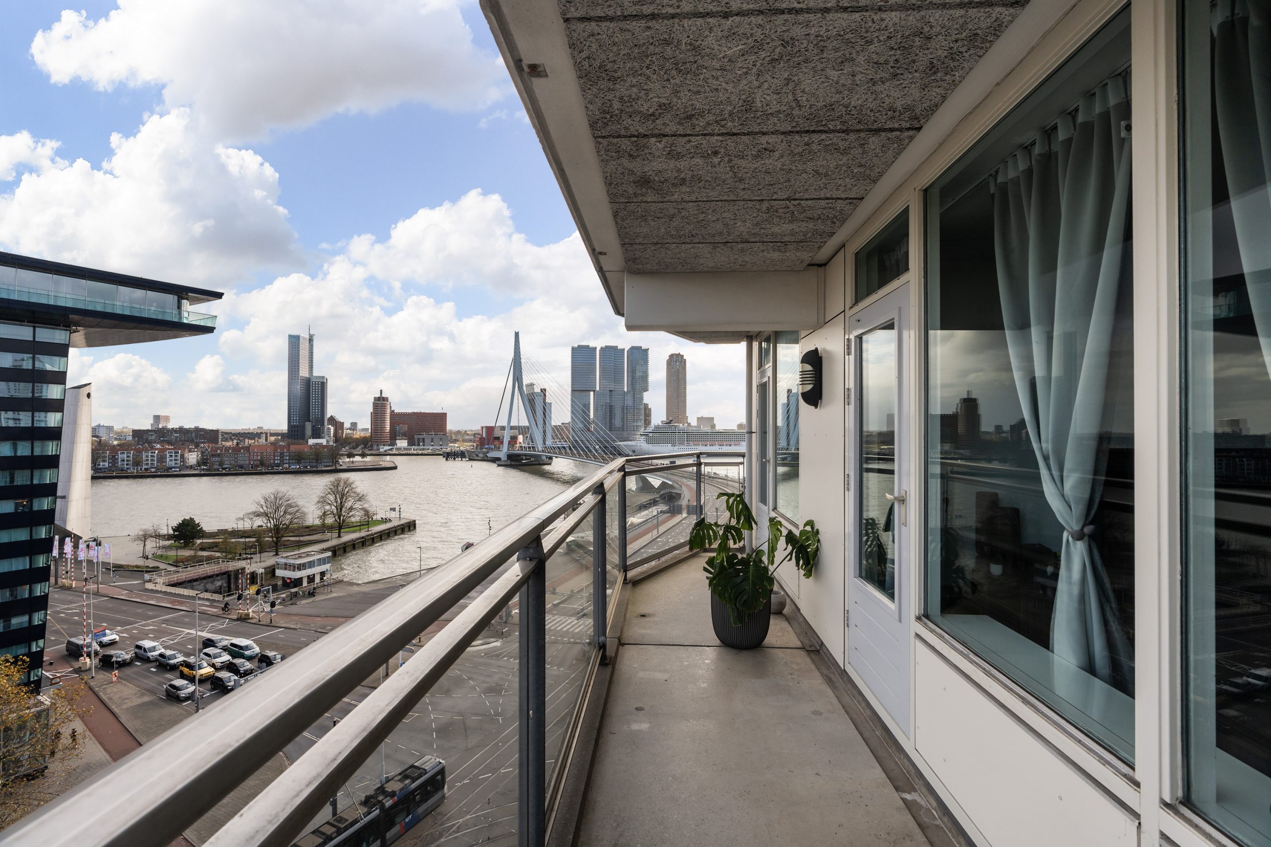 Aan de achterzijde van het appartement bevindt zich het balkon. Een waar verlengstuk van de woonkamer. Hier kijk je uit over het indrukwekkende Rotterdamse stadslandschap met zicht op diverse iconische gebouwen. Gelegen op het noordoosten geniet je hier van de middagzon. Een glas wijn, de skyline als decor. Het stadse leven op zijn best.