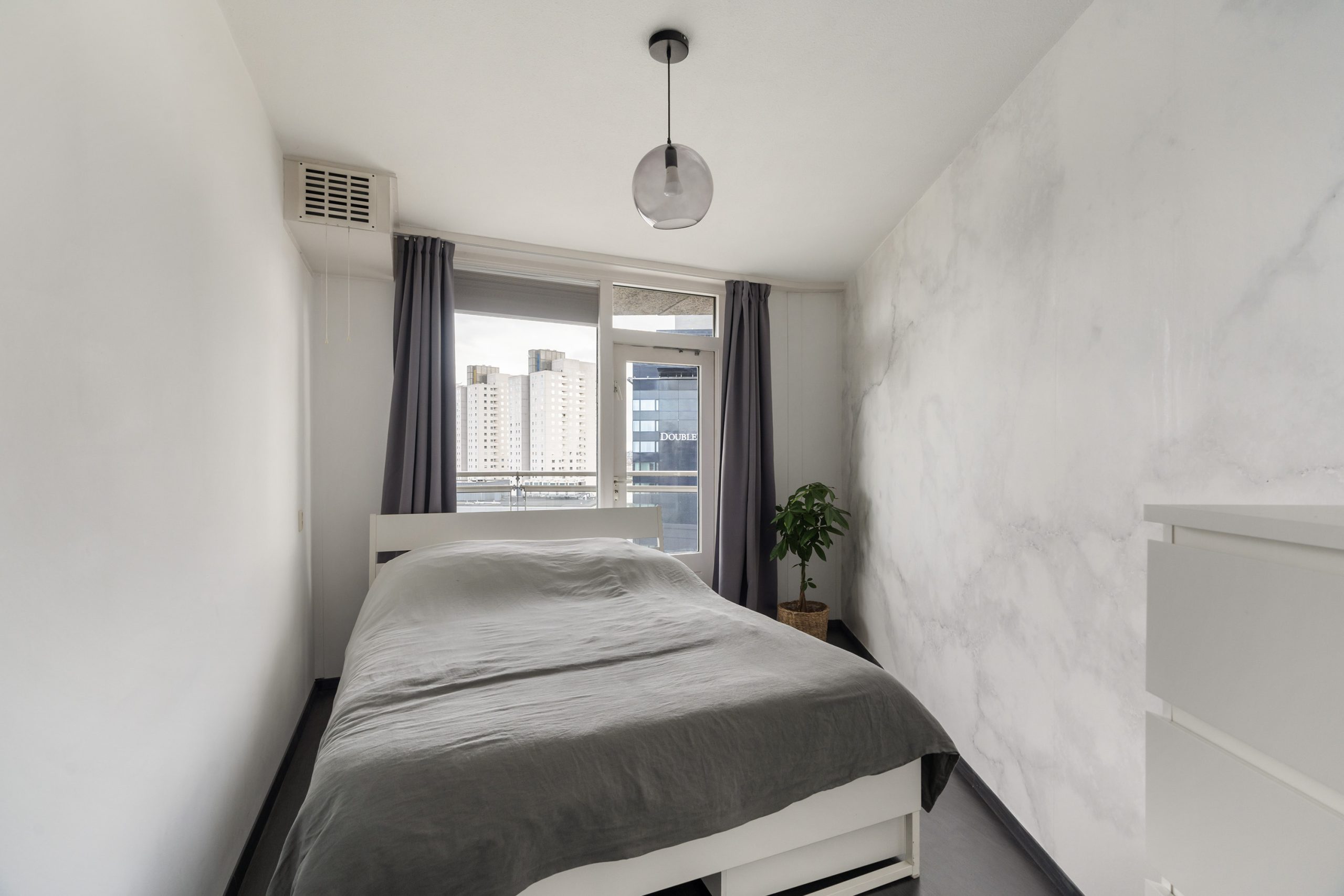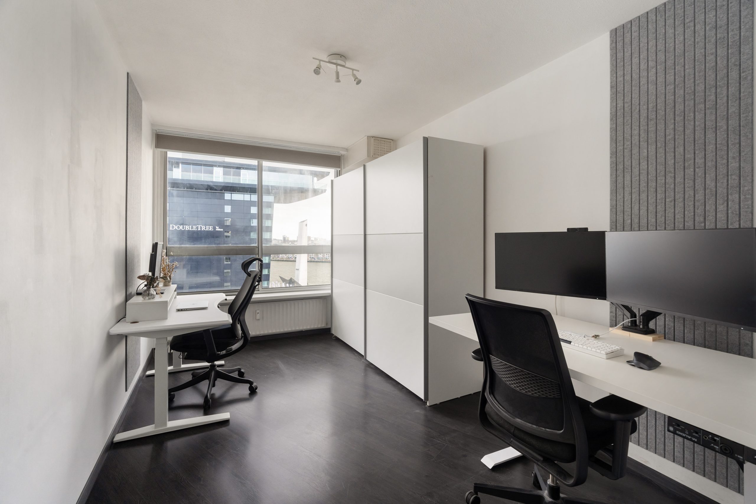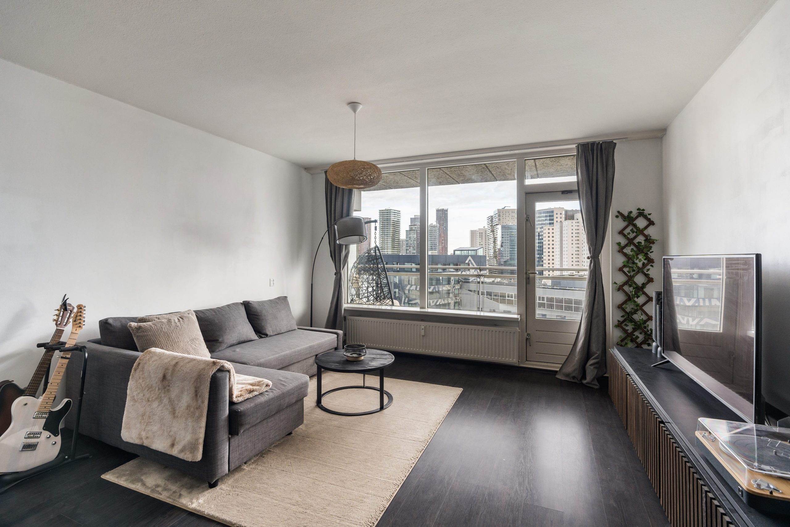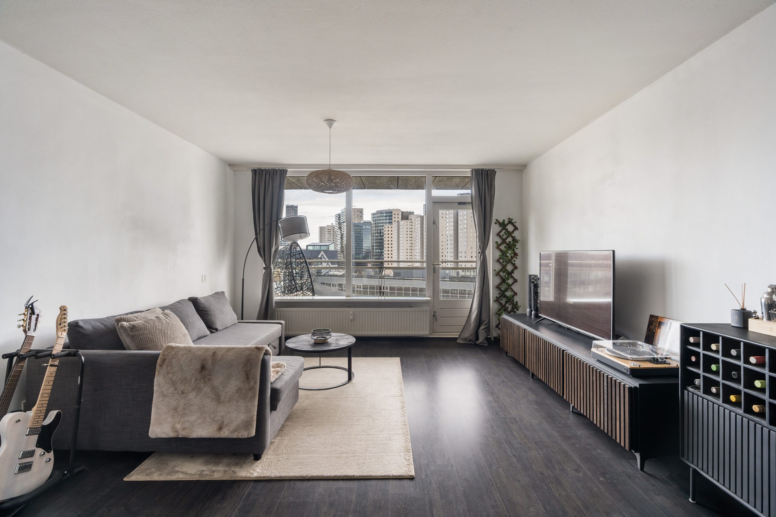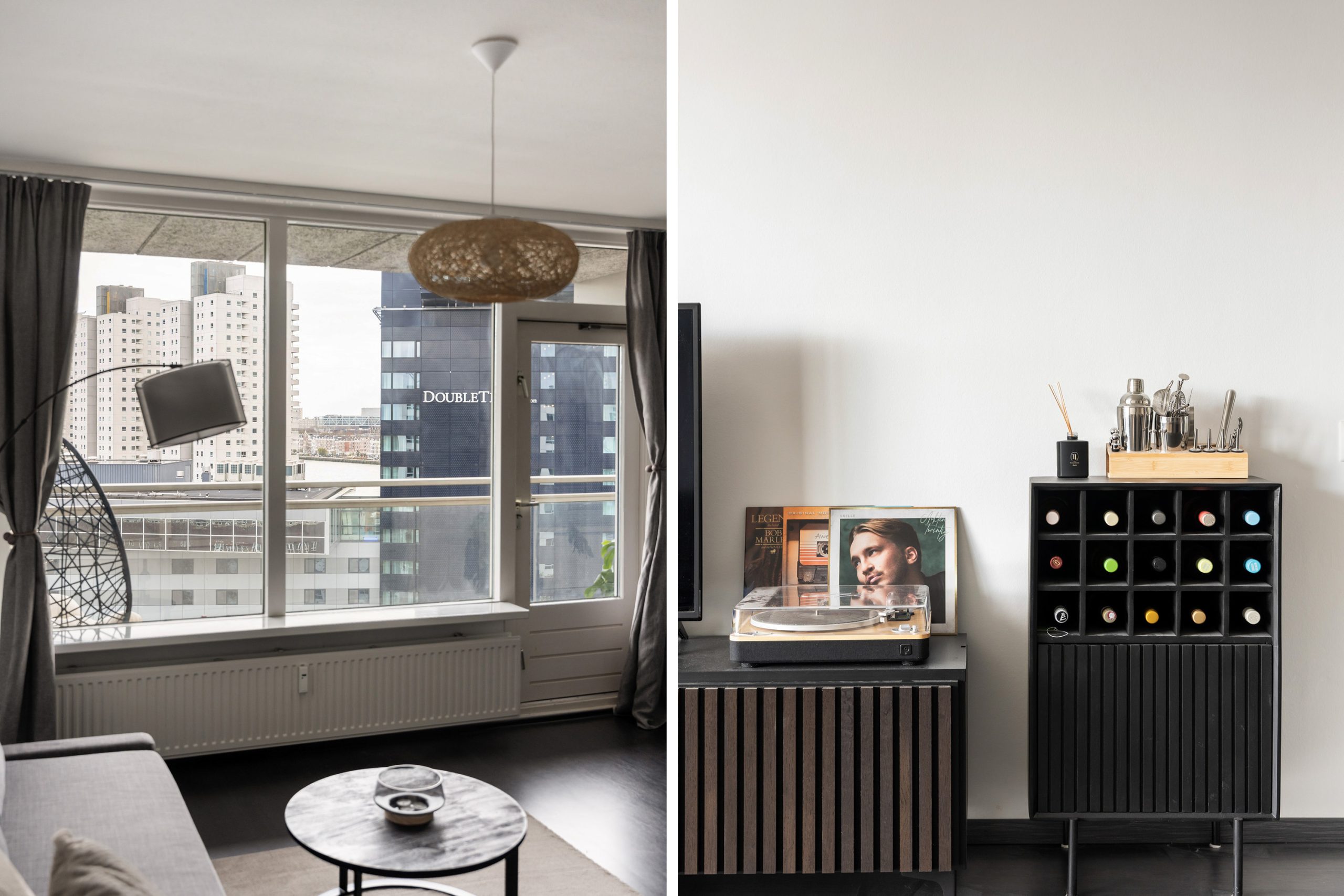 Aan de achterzijde van het appartement bevindt zich het balkon. Een waar verlengstuk van de woonkamer. Hier kijk je uit over het indrukwekkende Rotterdamse stadslandschap met zicht op diverse iconische gebouwen. Gelegen op het noordoosten geniet je hier van de middagzon. Een glas wijn, de skyline als decor. Het stadse leven op zijn best.